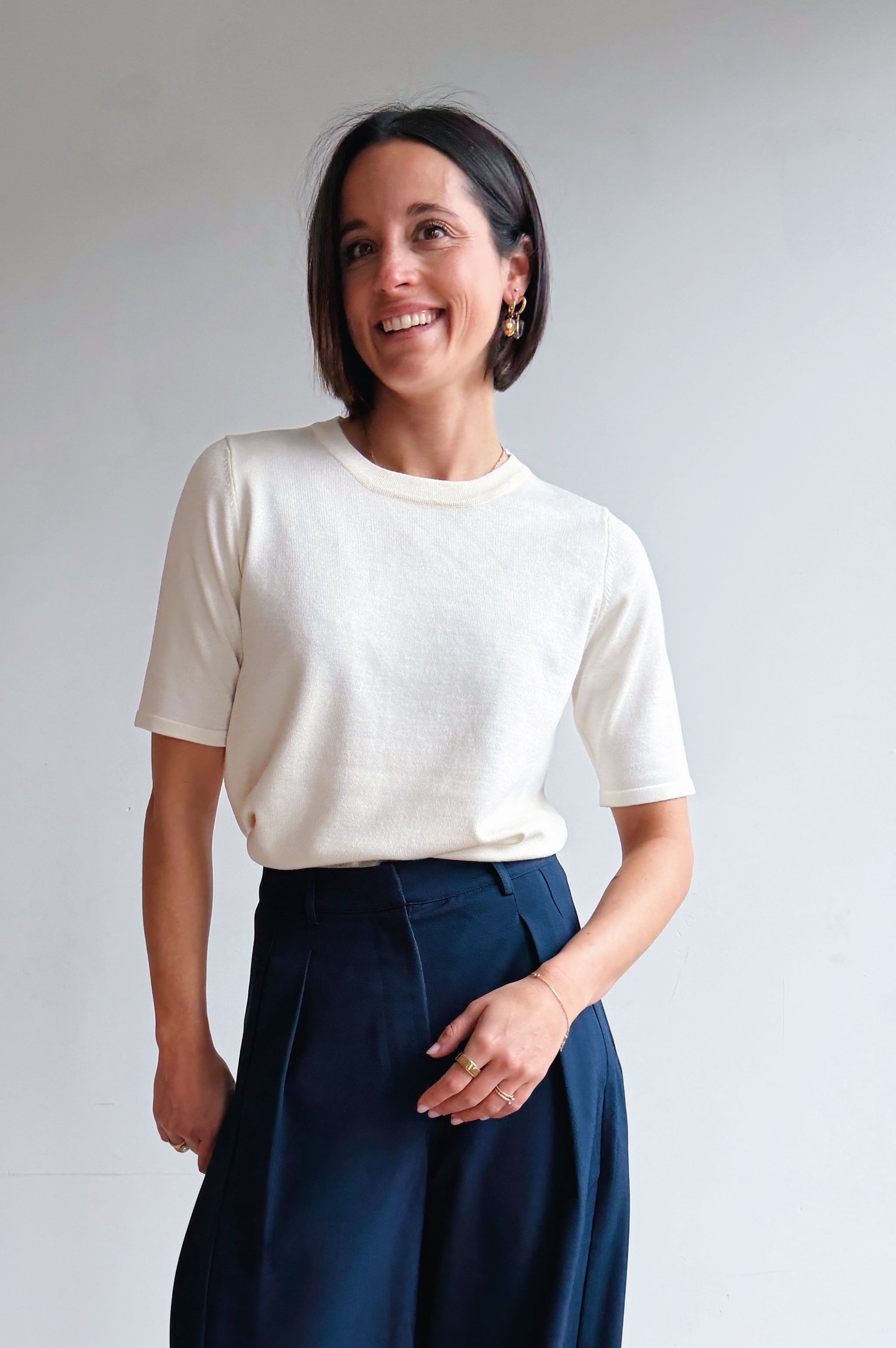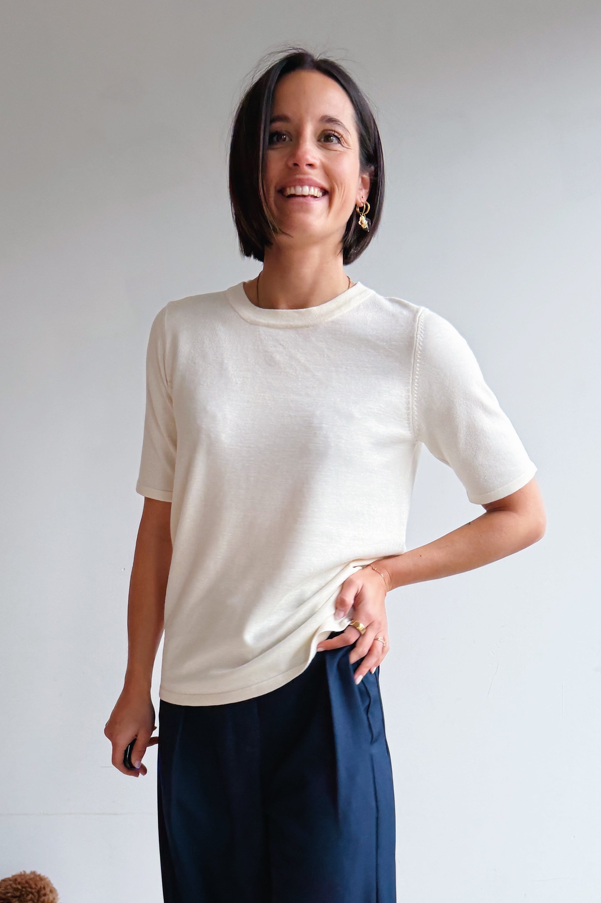 Dit ecru fijngebreide top is een tijdloze basic met een verfijnde uitstraling. De fijne, elastische ribstof zorgt voor een comfortabele pasvorm die mooi aansluit zonder strak te zitten. De ronde hals en korte mouwen geven deze top een klassieke look, terwijl de zachte, gebreide kwaliteit zorgt voor extra draagcomfort en een luxueuze gevoel. Perfect om solo te dragen of als fijne layering piece onder een blazer, vest of jasje. Een veelzijdige essential die je moeiteloos combineert met al je favoriete items