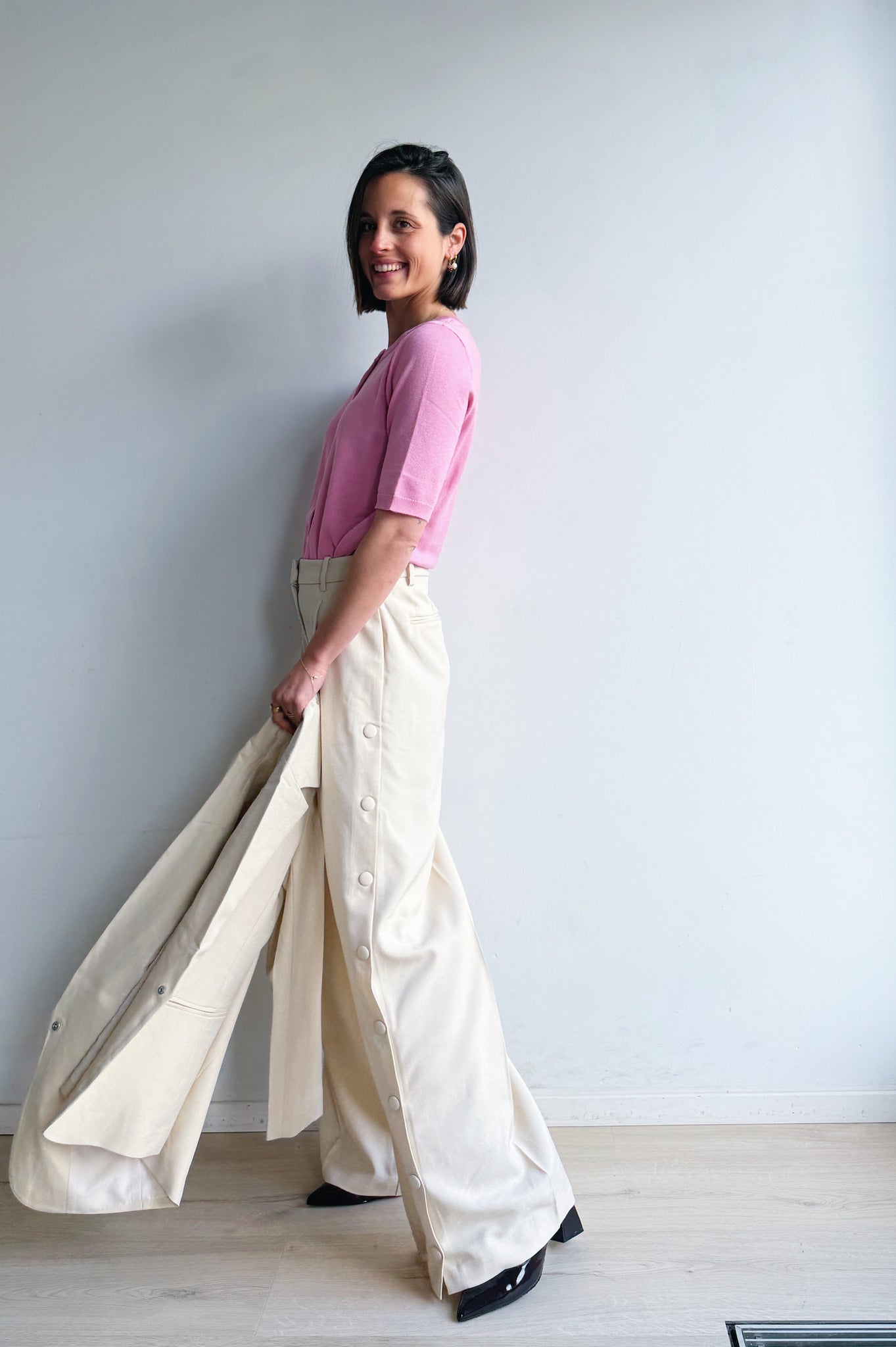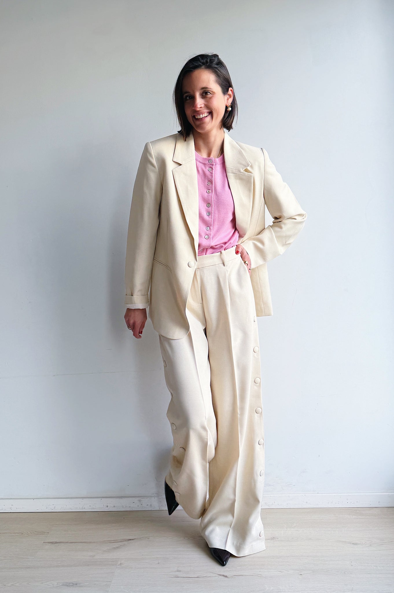 Dit elegant kostuum in warm beige vormen samen een stijlvol en eigentijds pak met een verfijnde uitstraling. De blazer heeft een mooie, licht getailleerde pasvorm en is afgewerkt met klassieke revers en subtiele knopen, terwijl de bijzondere knoopsluiting op de rug zorgt voor een verrassend detail. De bijpassende broek valt los en lang, met een flatterende hoge taille en decoratieve knopen langs de zijkant voor een speelse, vrouwelijke touch. De zachte stof draagt comfortabel en geeft het geheel een luxe gevoel. Draag het pak samen voor een krachtige look of combineer de items afzonderlijk voor eindeloos veel stijlvolle outfits.