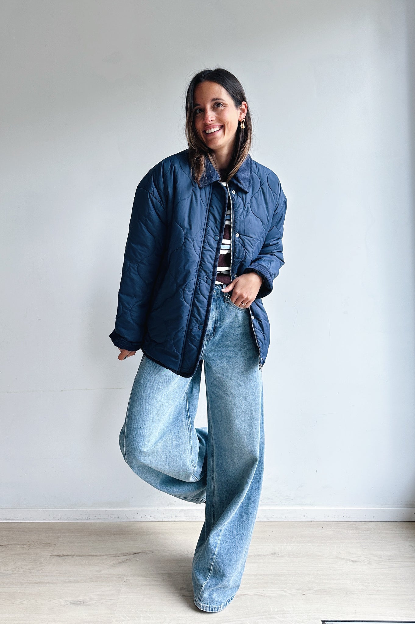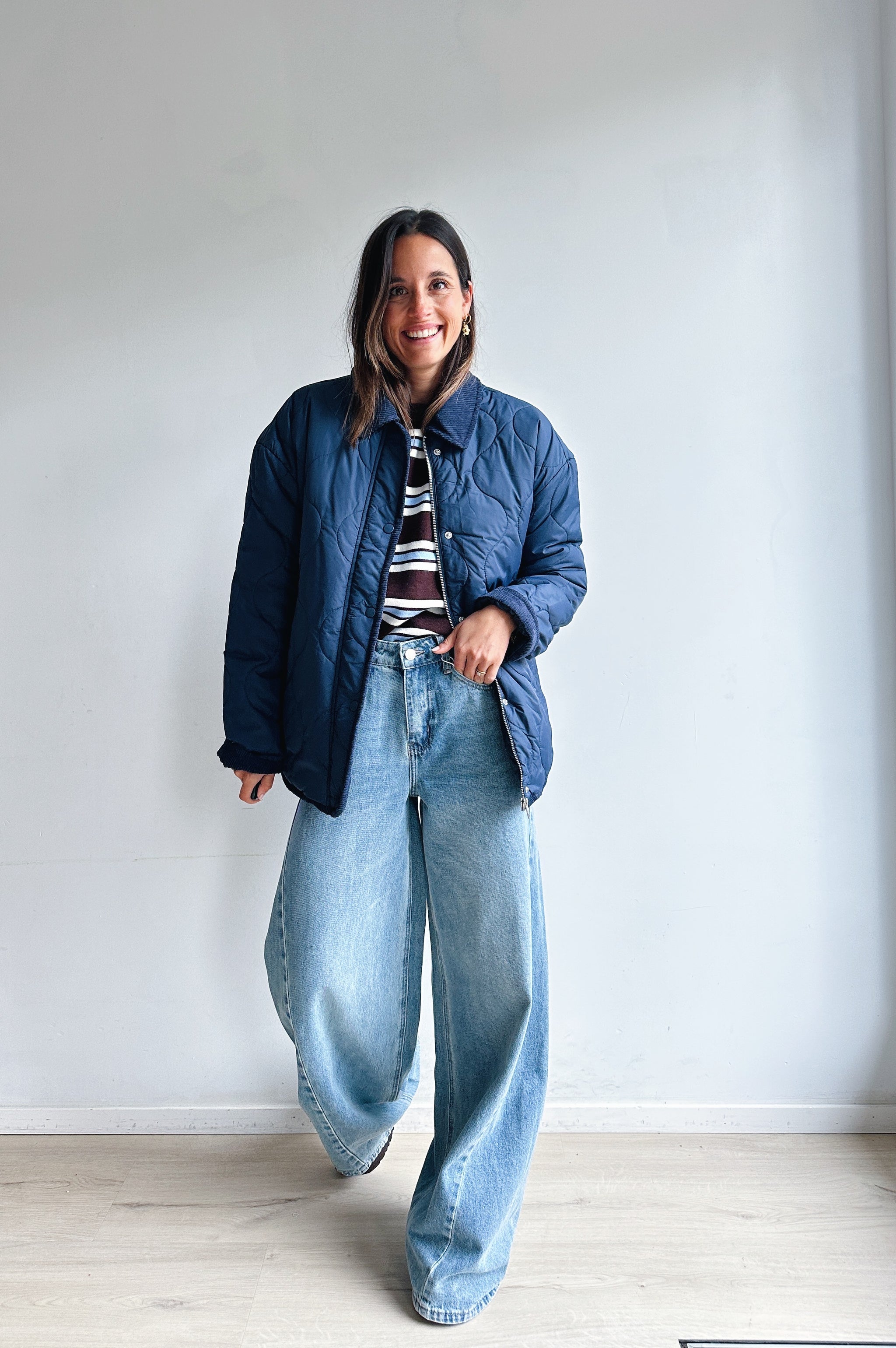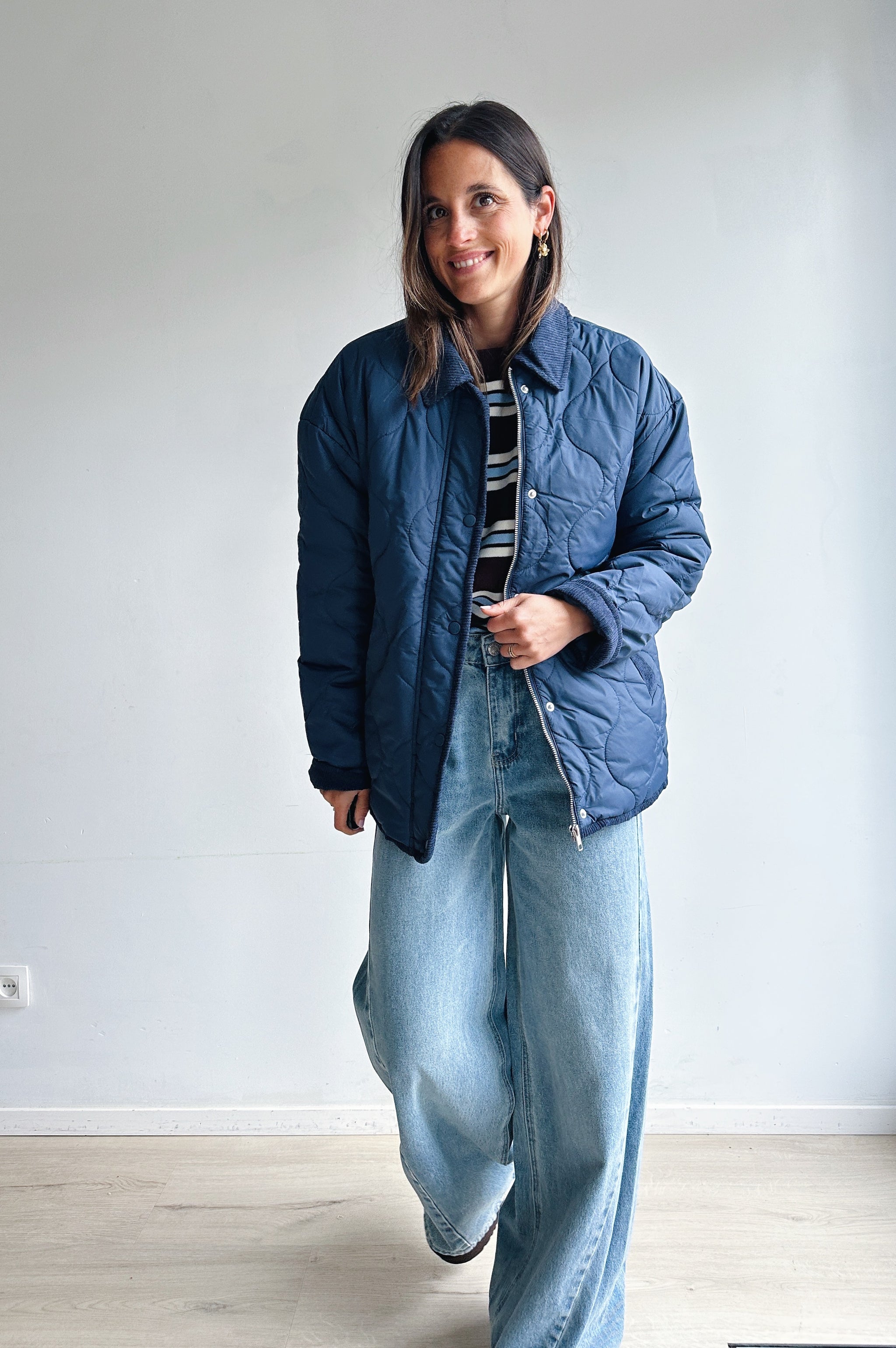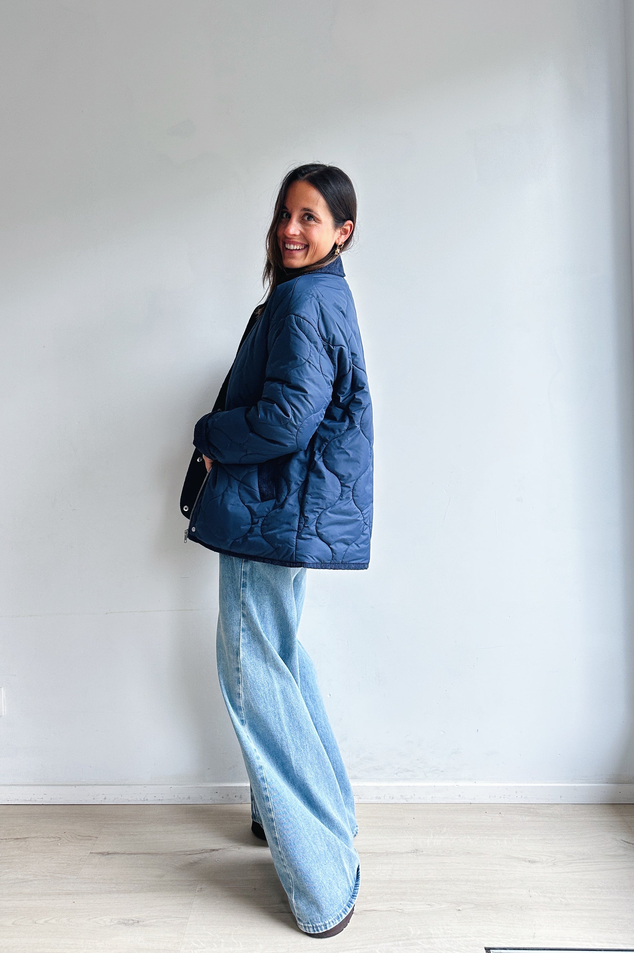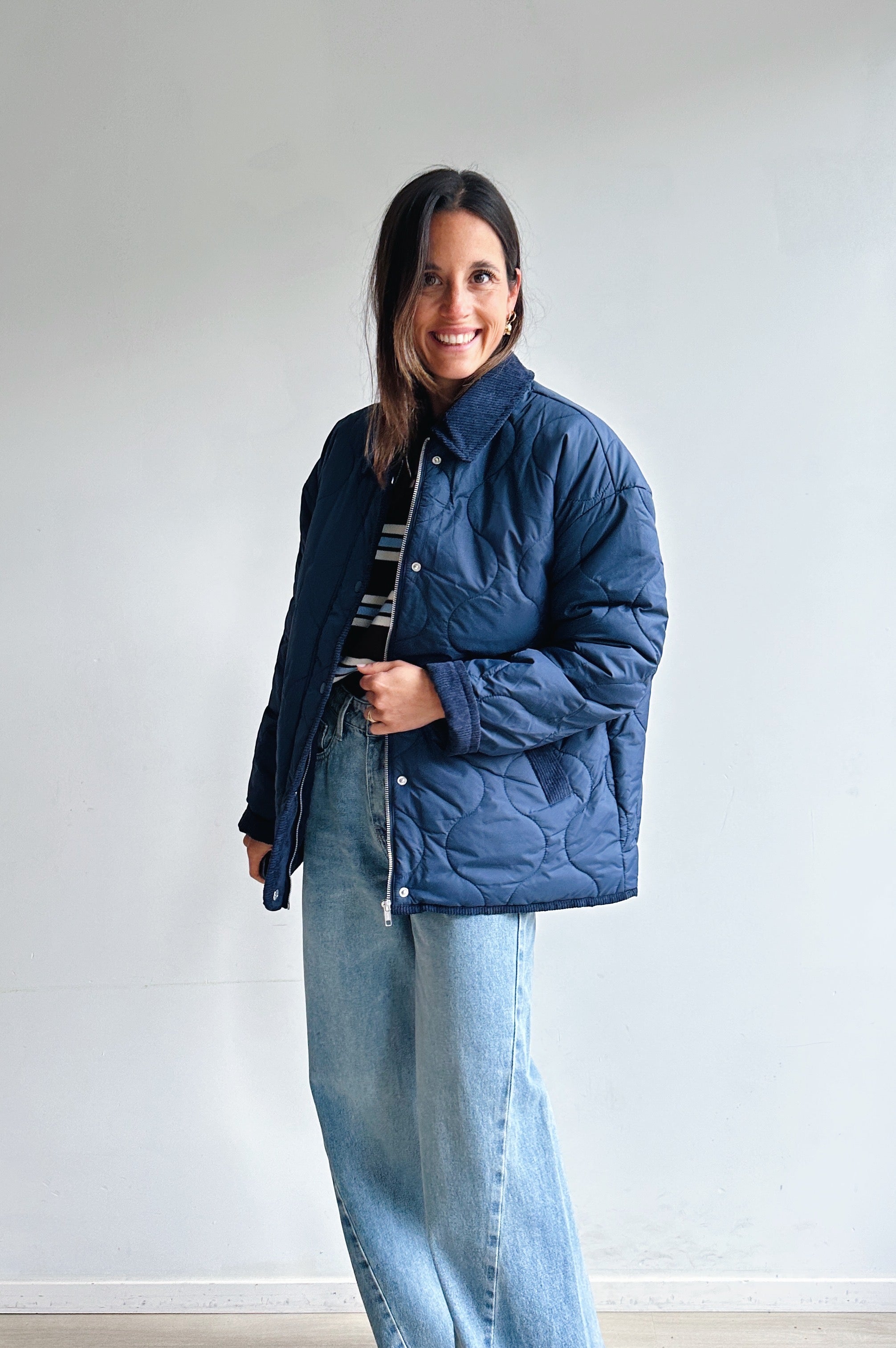 Deze donkerblauwe gewatteerde jas combineert comfort met een tijdloze uitstraling. Het jasje heeft een kraag in corduroy-look, een doorlopende ritssluiting met drukknopen en handige steekzakken. De lichte voering en het quiltpatroon geven het een moderne, casual look. Perfect om te dragen over een blouse of trui voor een veelzijdige en stijlvolle outfit, van dagelijks gebruik tot een ontspannen weekendstijl.