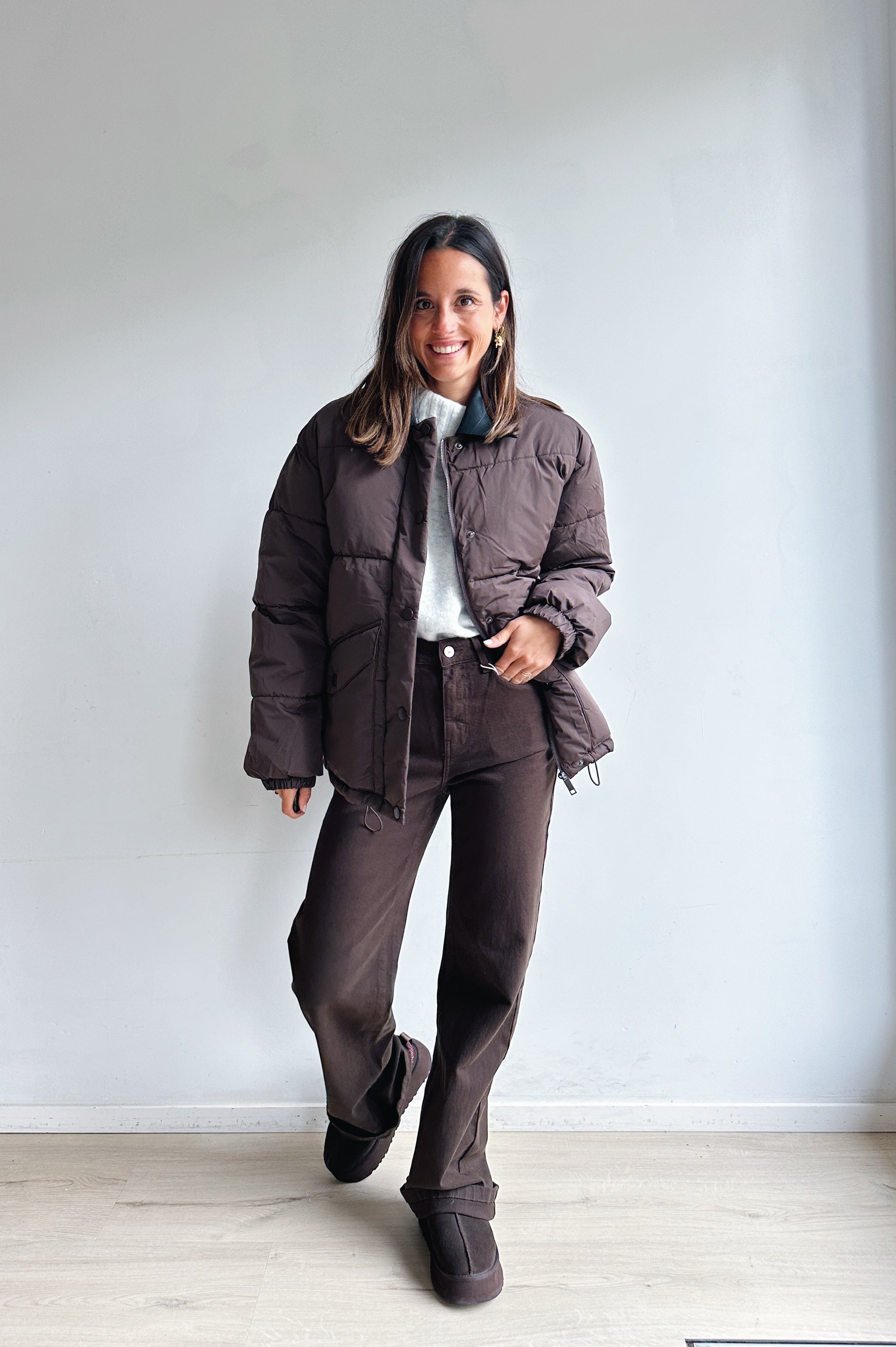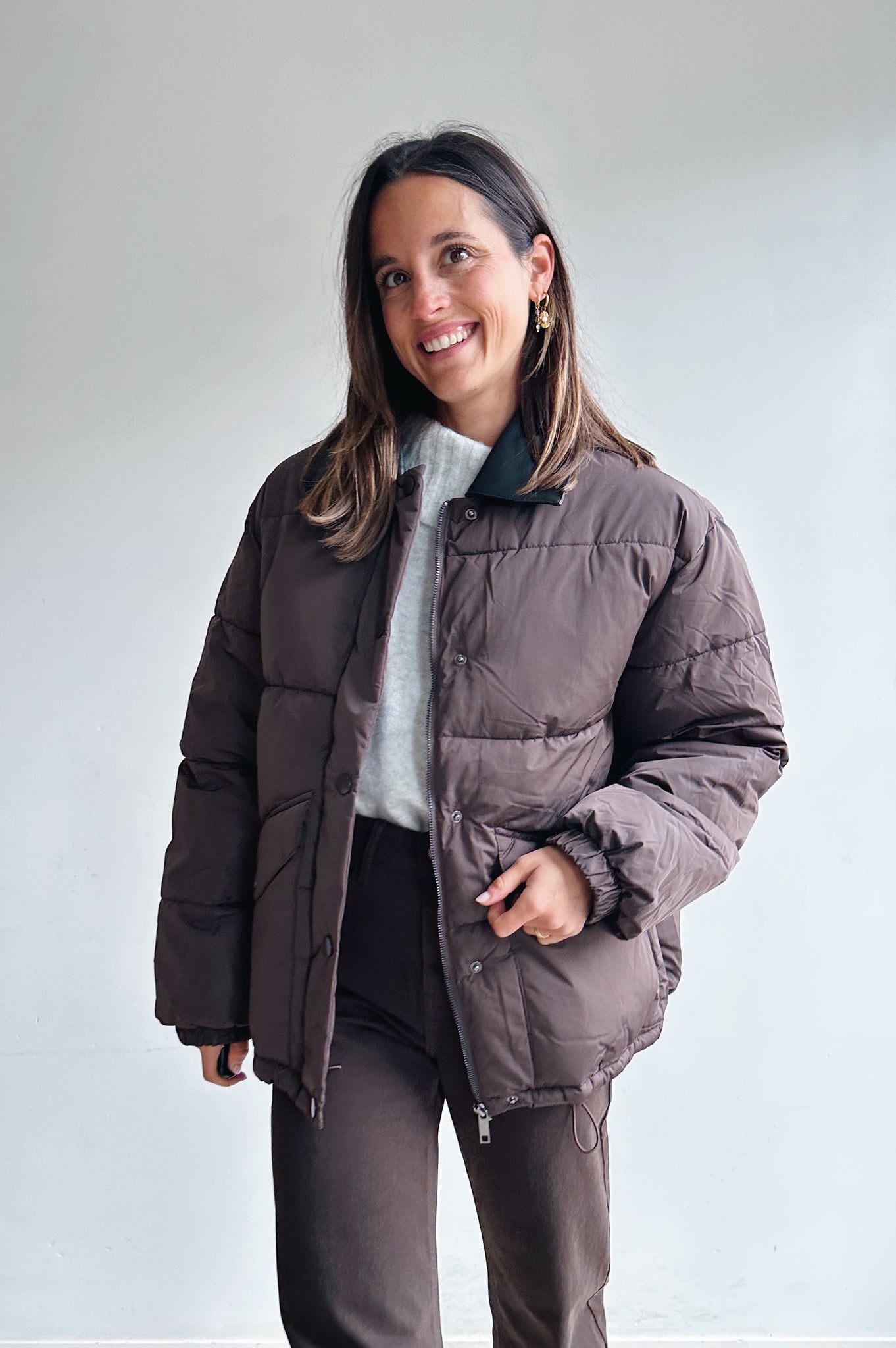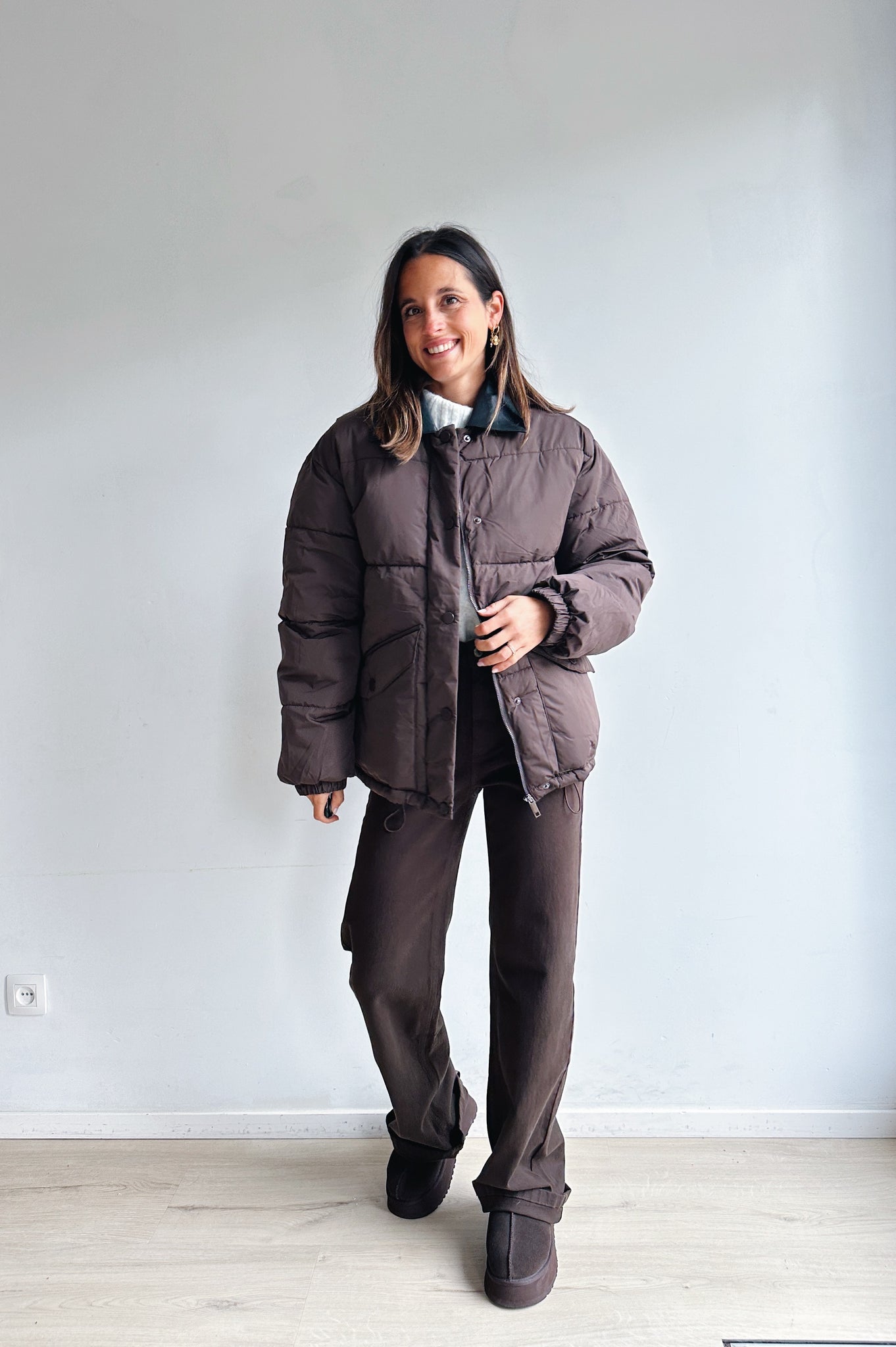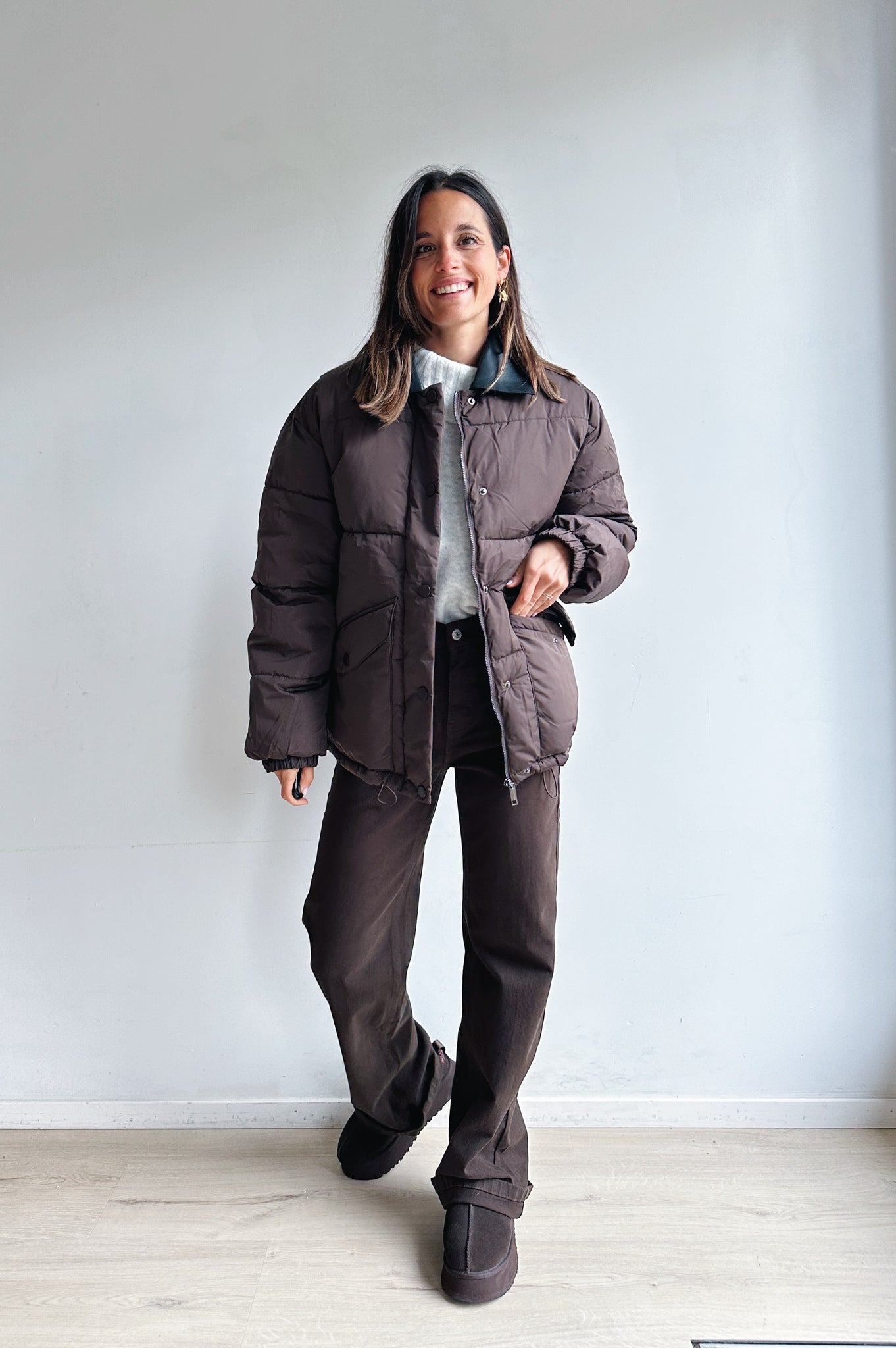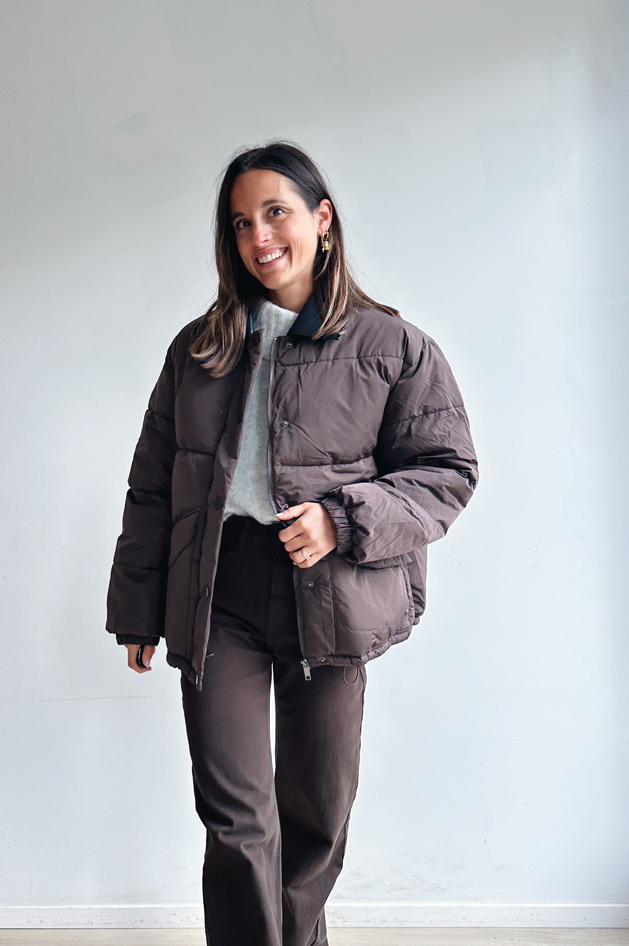 De perfecte mix van comfort en stijl — deze pufferjas houdt je warm zonder in te boeten aan klasse. De diepbruine tint geeft een elegante, tijdloze look, terwijl de contrasterende lederen kraag zorgt voor een subtiel edgy detail. De jas heeft een relaxte, oversized pasvorm die ideaal is om te combineren met je favoriete jeans of een chunky knit.