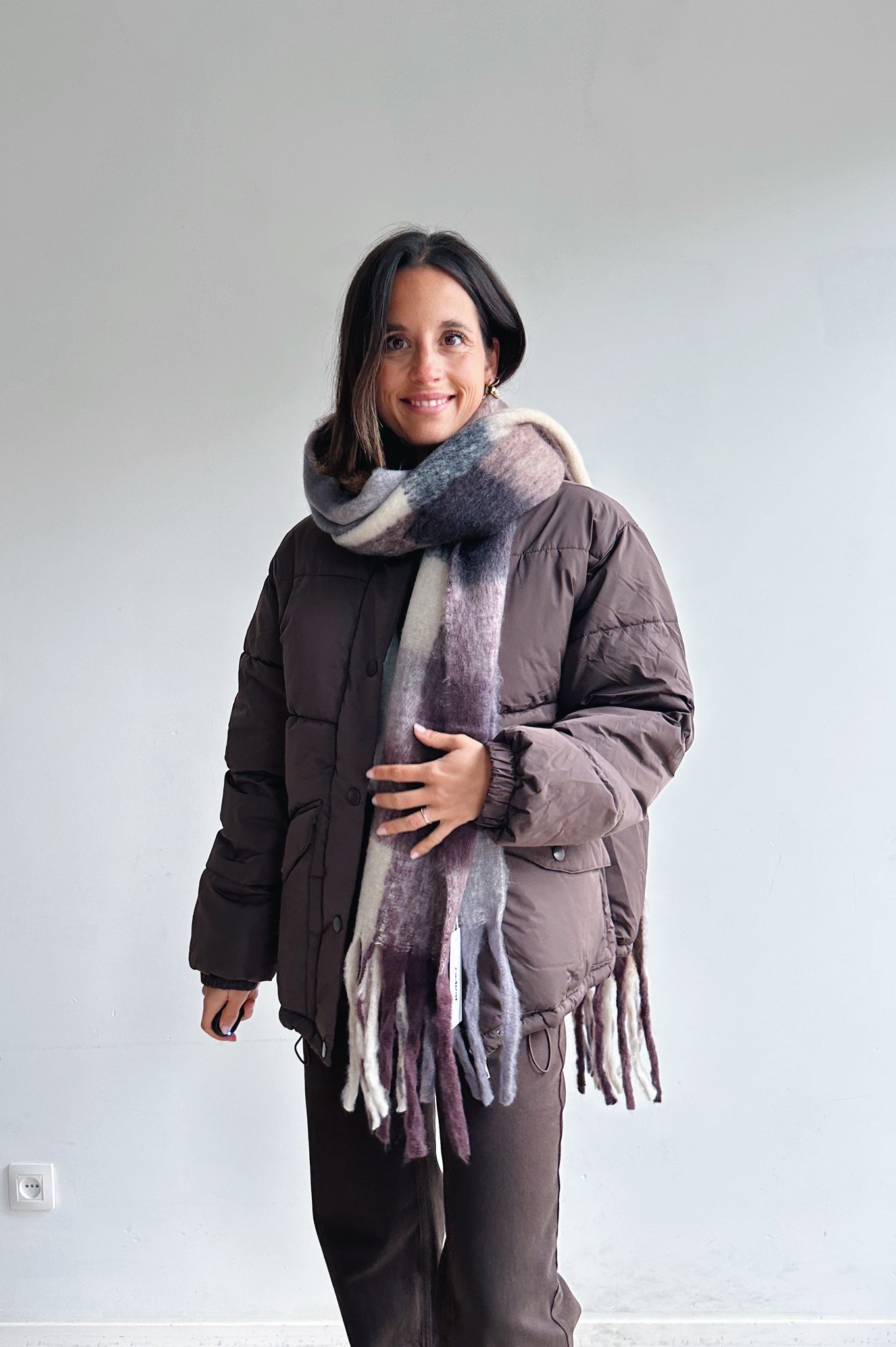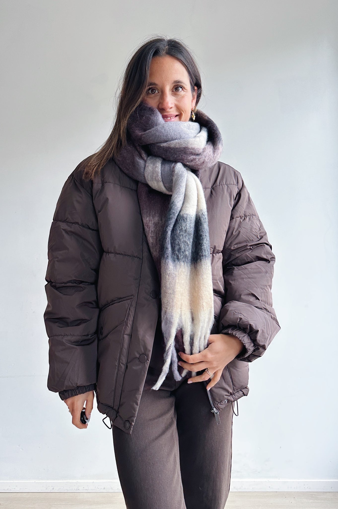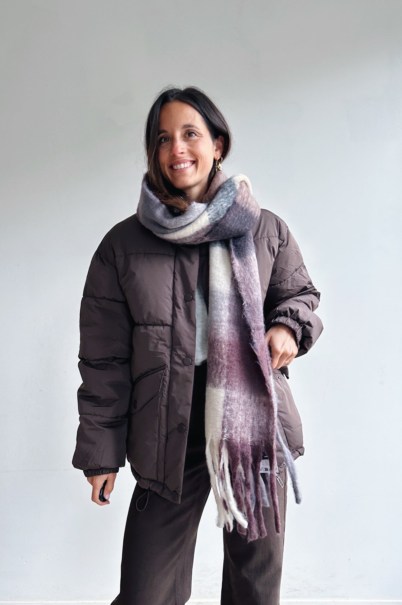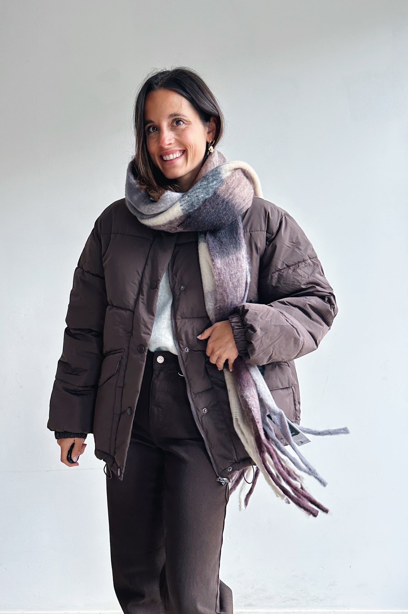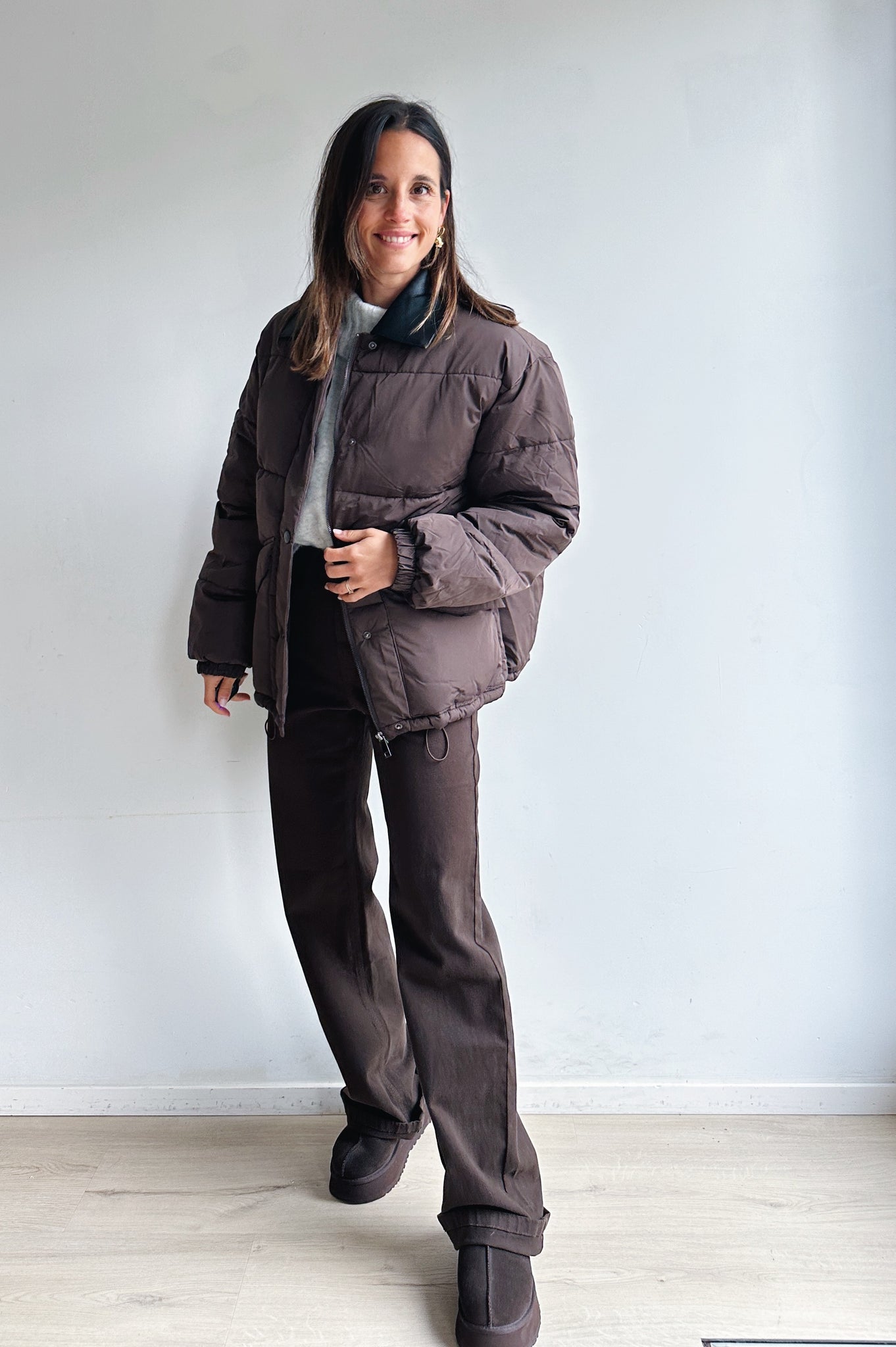 De perfecte mix van comfort en stijl — deze pufferjas houdt je warm zonder in te boeten aan klasse. De diepbruine tint geeft een elegante, tijdloze look, terwijl de contrasterende lederen kraag zorgt voor een subtiel edgy detail. De jas heeft een relaxte, oversized pasvorm die ideaal is om te combineren met je favoriete jeans of een chunky knit.