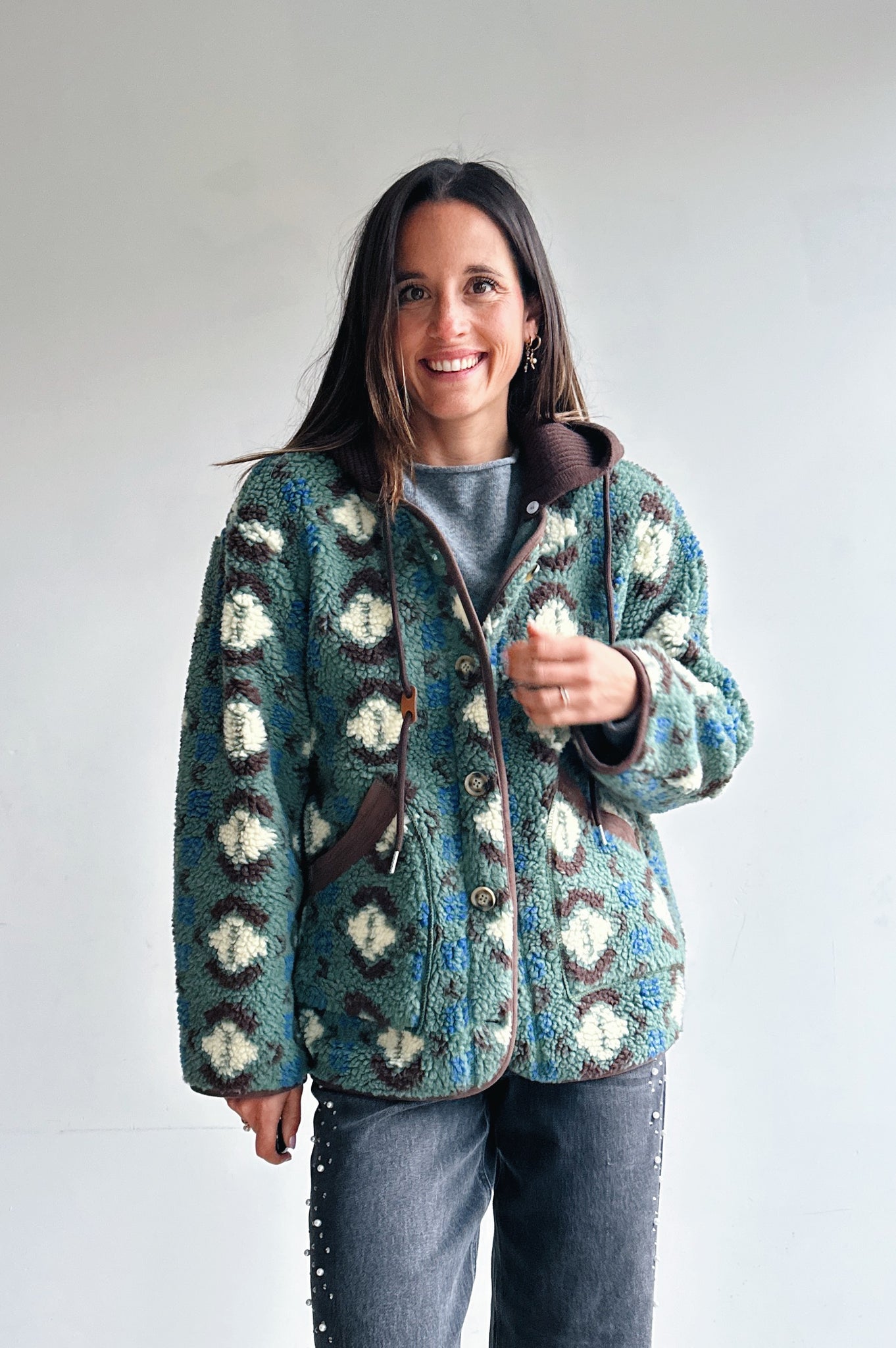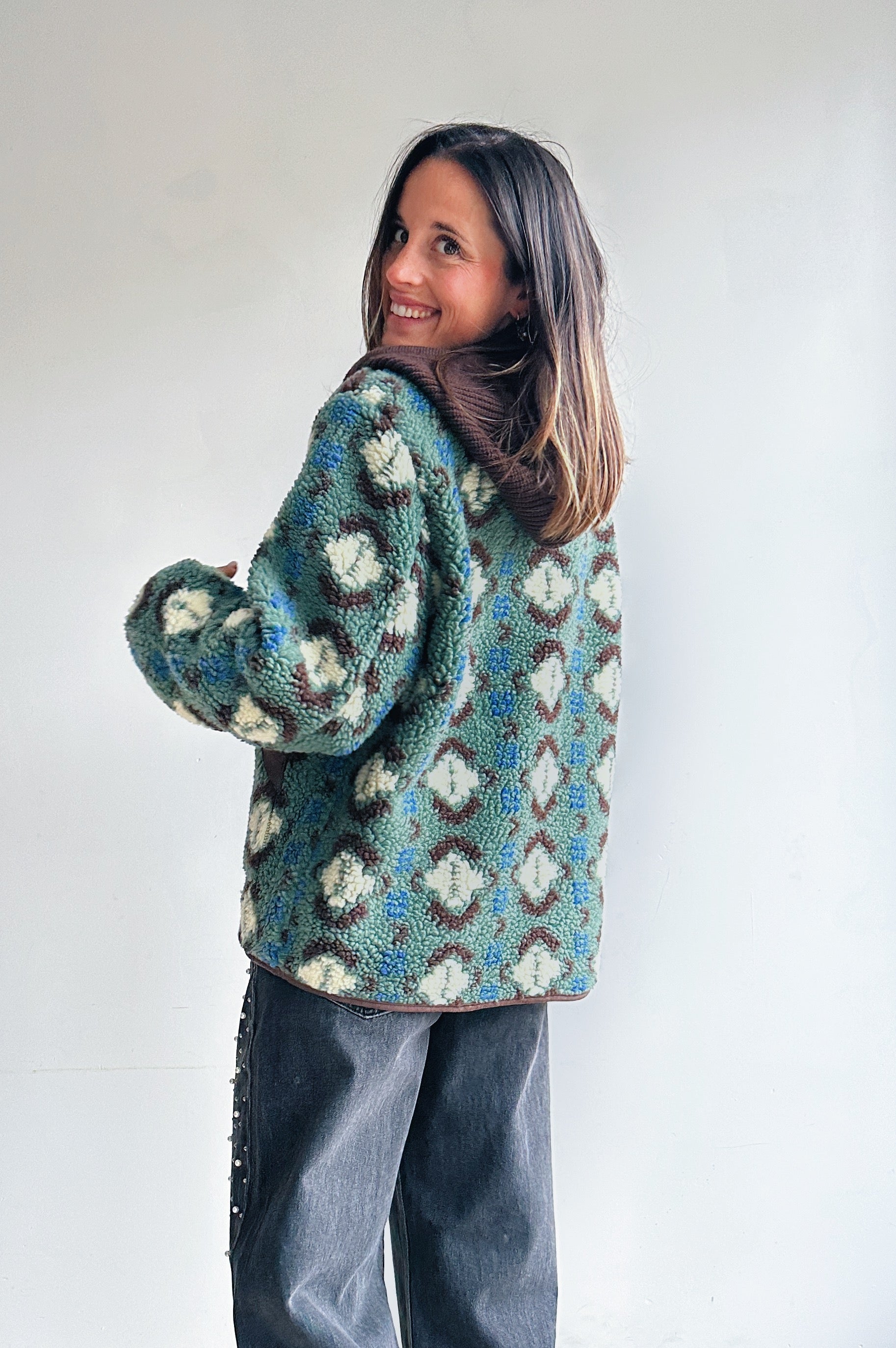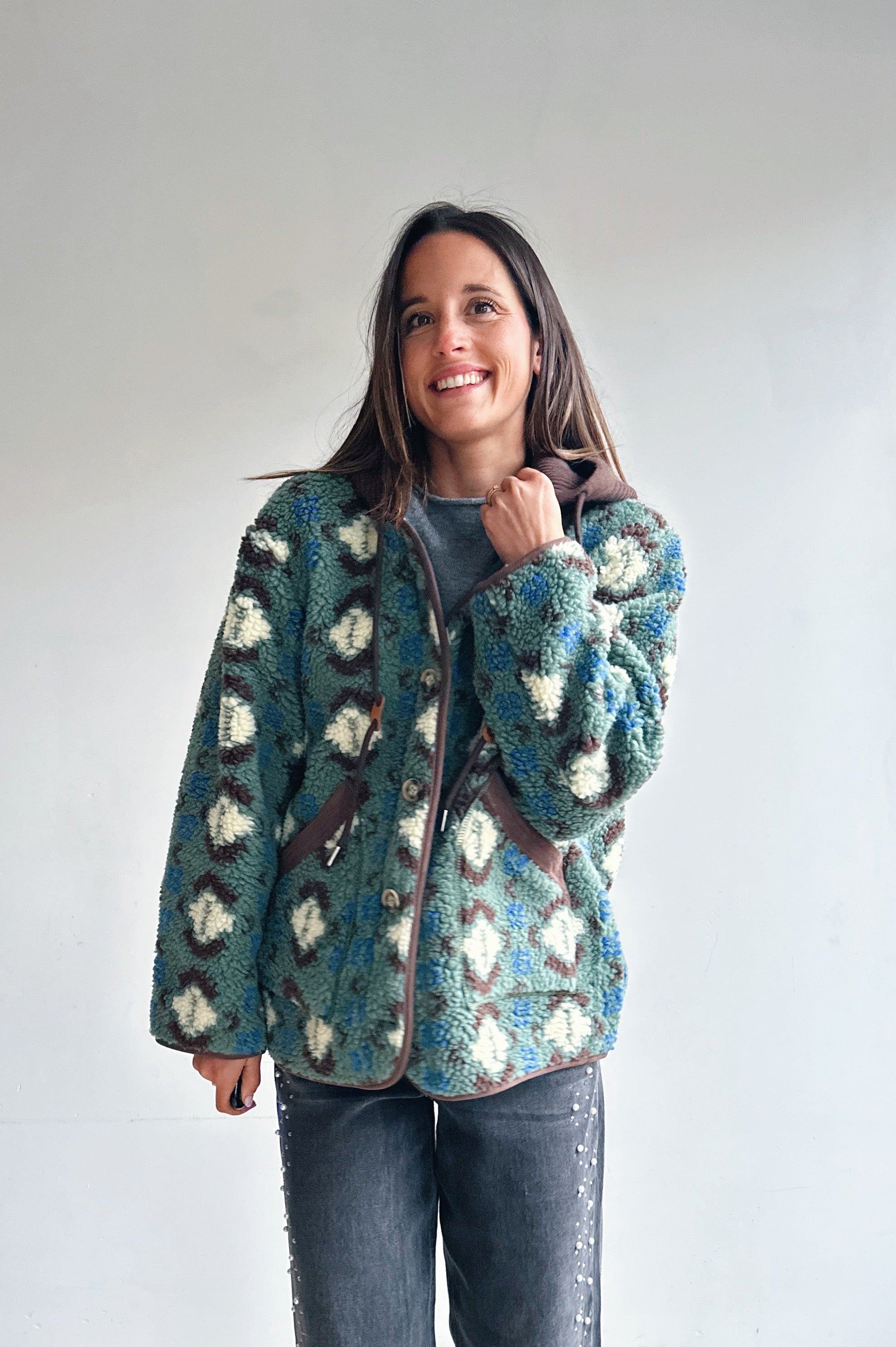 Teddy vest met grafische print in groen-, bruin- en crème tinten. De vest sluit met knopen en heeft twee zakken aan de voorkant. De kap is afneembaar, waardoor je het vest zowel sportief als casual kan dragen.
