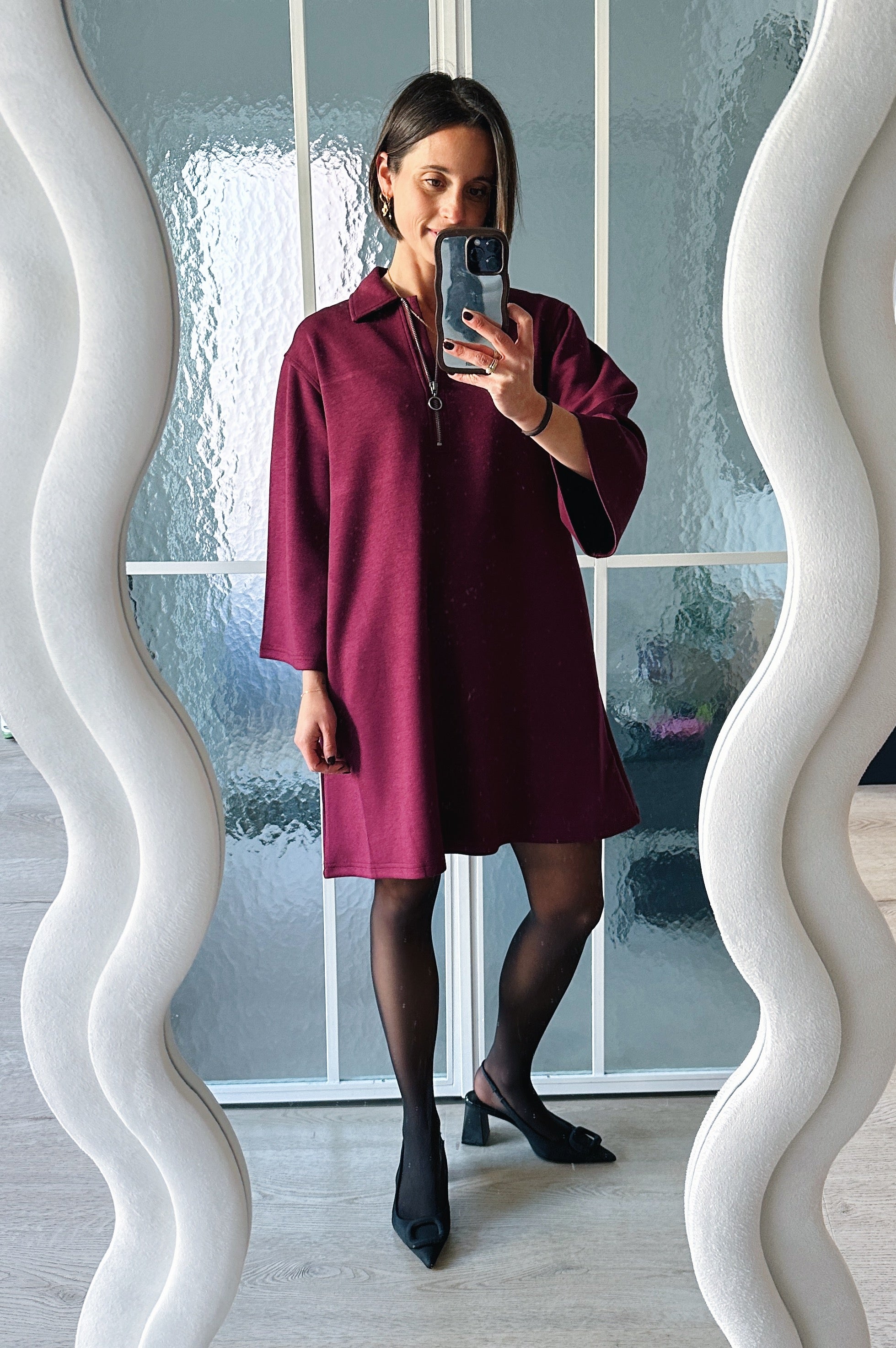 Een opvallend detail is de korte ritssluiting met ronde ringtrekker aan de voorkant, waarmee je de halslijn kunt aanpassen van casual open tot hoog gesloten. De jurk is uitgevoerd in een mega zachte stof die mooi in vorm blijft.