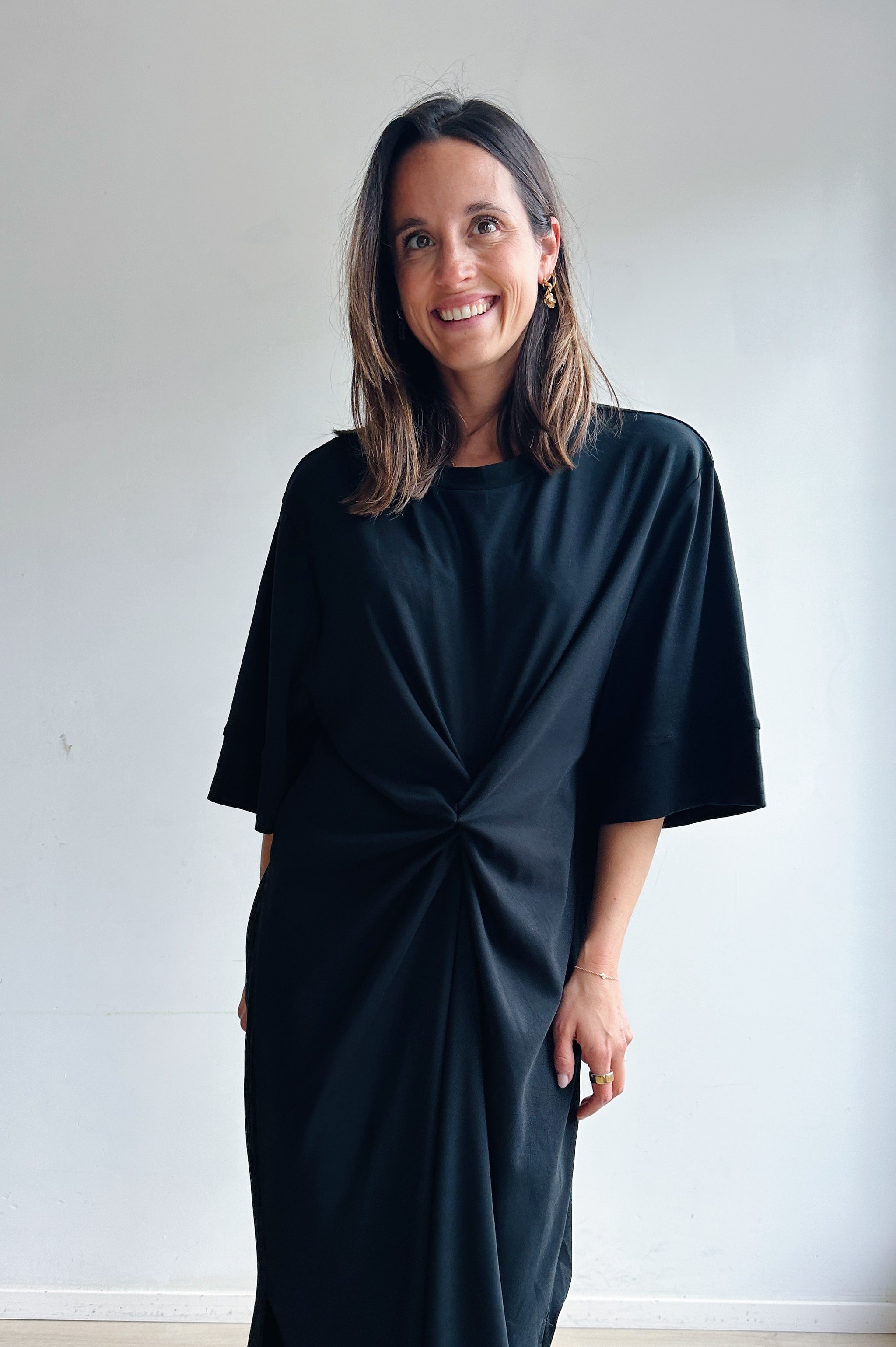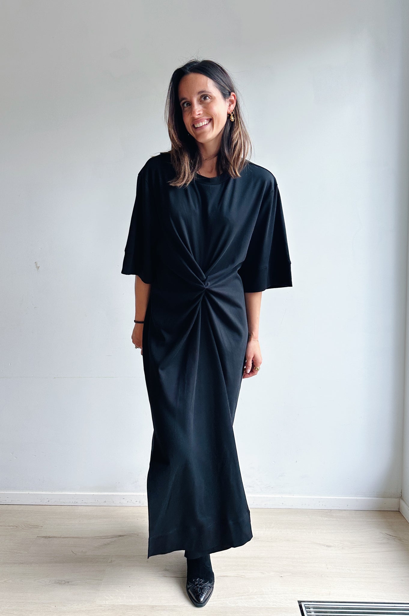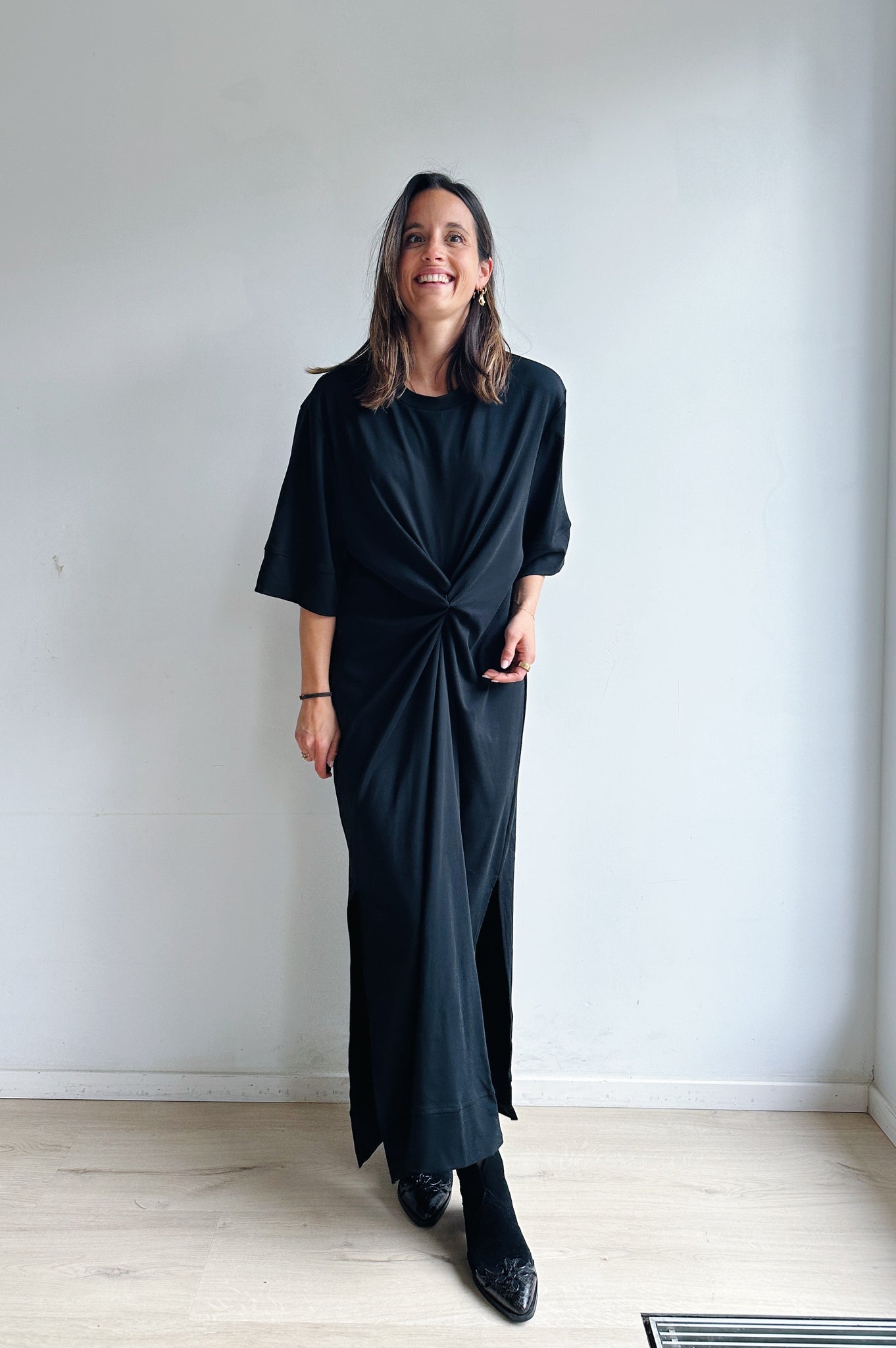 Deze zwarte maxi-jurk is een stijlvolle combinatie van eenvoud en elegantie. De soepele stof valt mooi langs het lichaam, terwijl het twistdetail aan de voorkant zorgt voor een speels en flatterend effect. De halflange, wijde mouwen geven de jurk een nonchalante uitstraling en maken hem extra comfortabel om te dragen. Dankzij de split aan de zijkant beweeg je er moeiteloos in en krijgt de jurk een subtiele vrouwelijke touch. Perfect om te dragen met laarsjes voor een casual look of met hakken en sieraden voor een meer geklede gelegenheid.