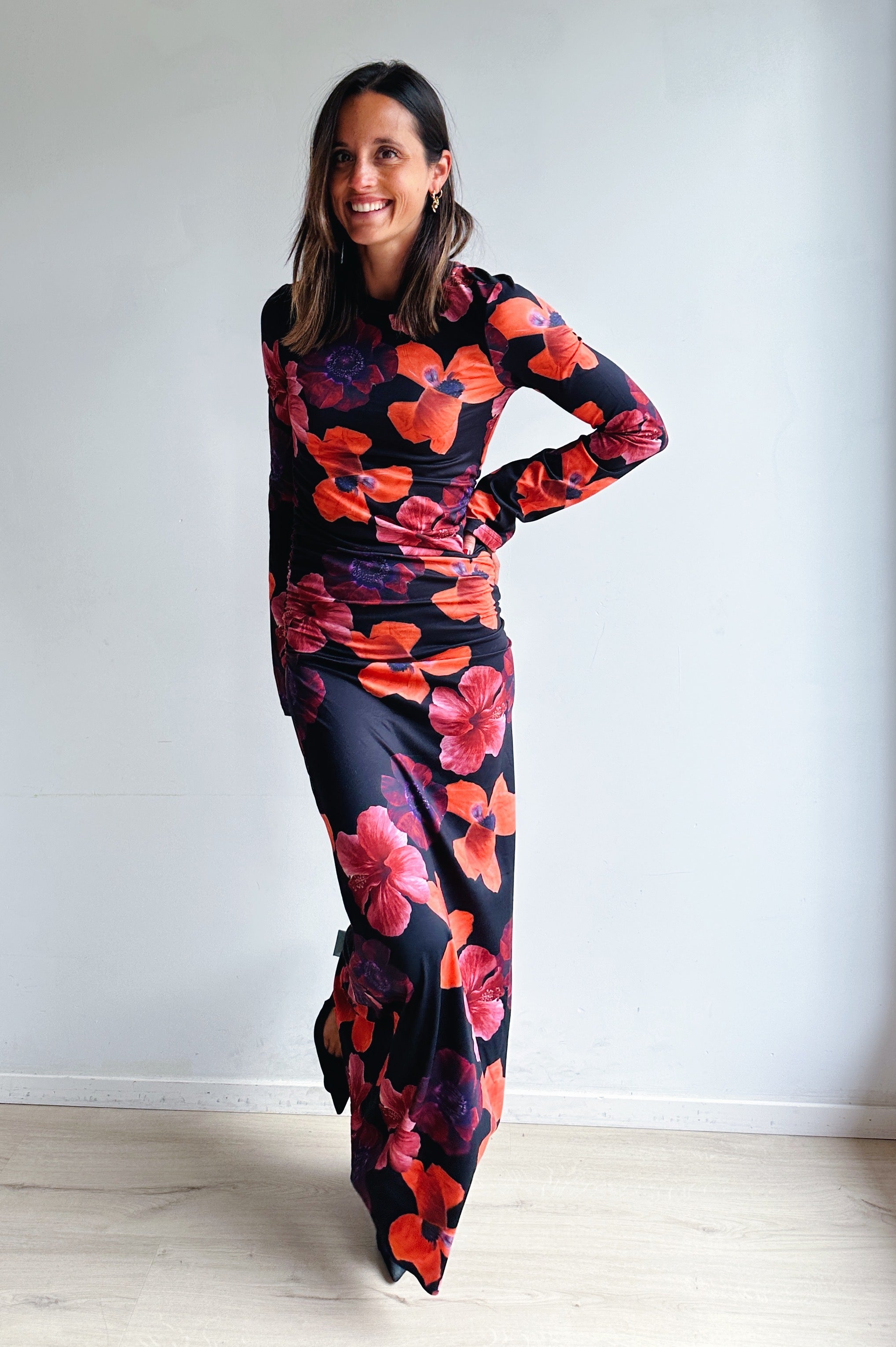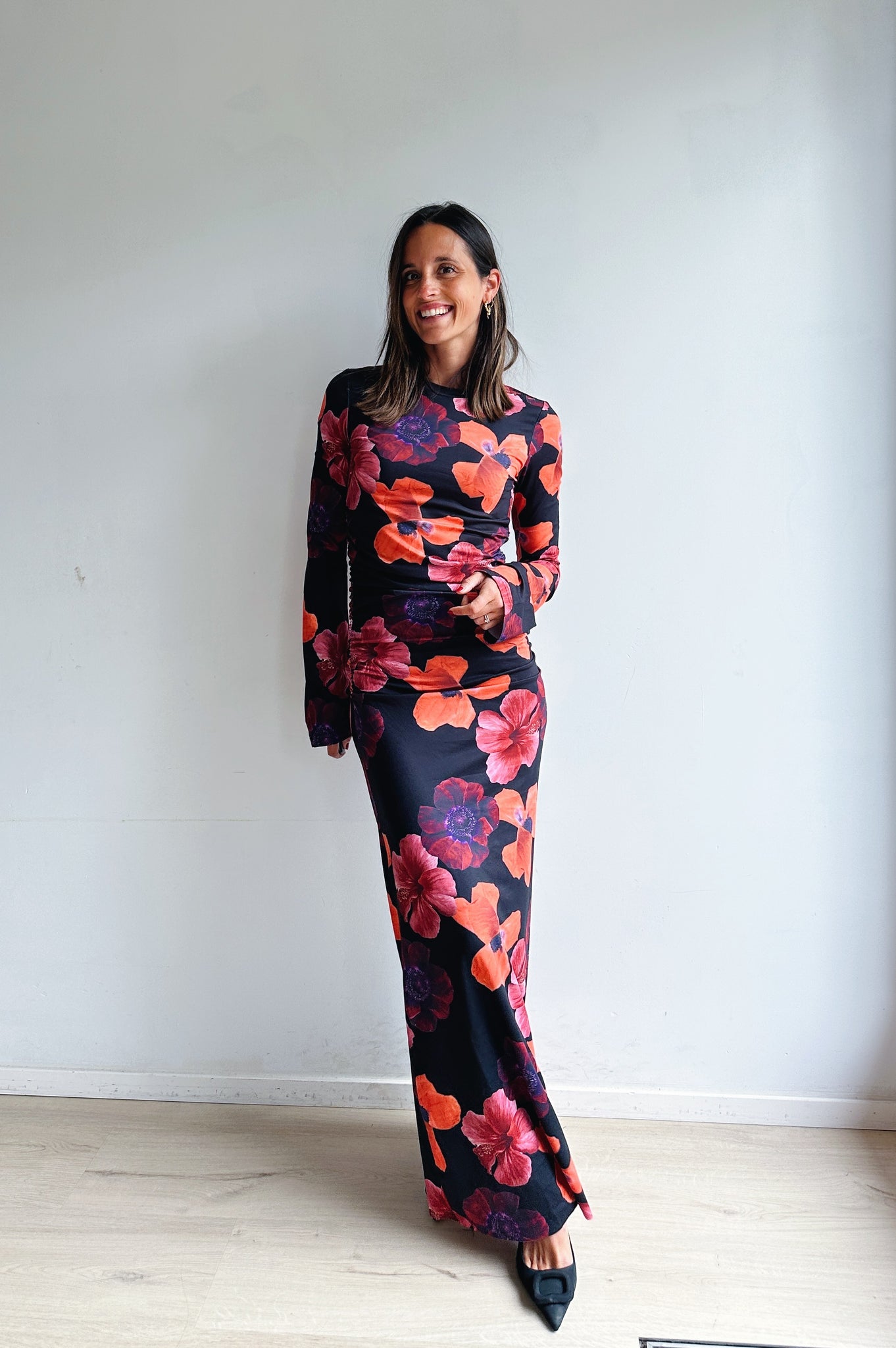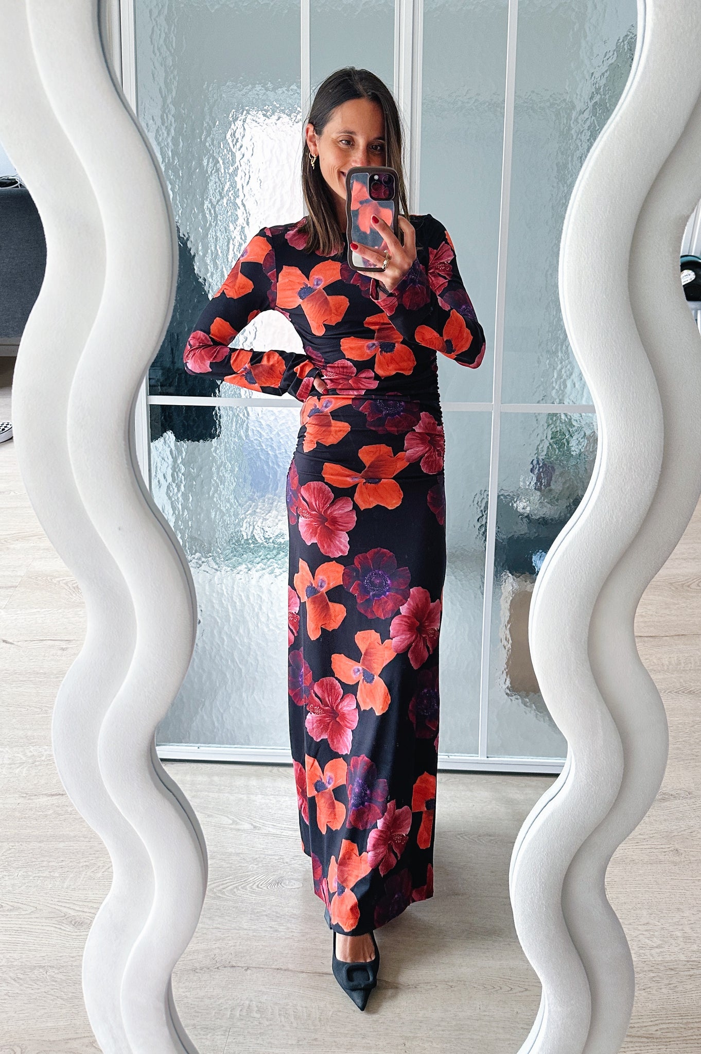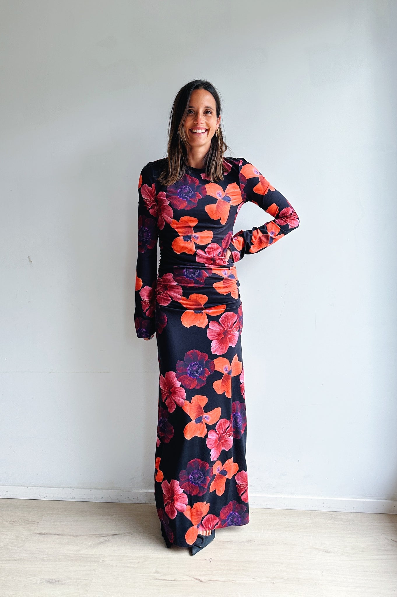 Deze maxi-jurk is een echte eyecatcher die je kleerkast meteen naar een hoger niveau tilt. De zwarte basis wordt overspoeld door een speels en toch elegant bloemenpatroon in warme tinten rood, oranje en paars. Het aansluitende model met lange mouwen en subtiele plooien rond de taille zorgt voor een flatterend silhouet, terwijl de vloeiende stof elegant langs je lichaam valt.