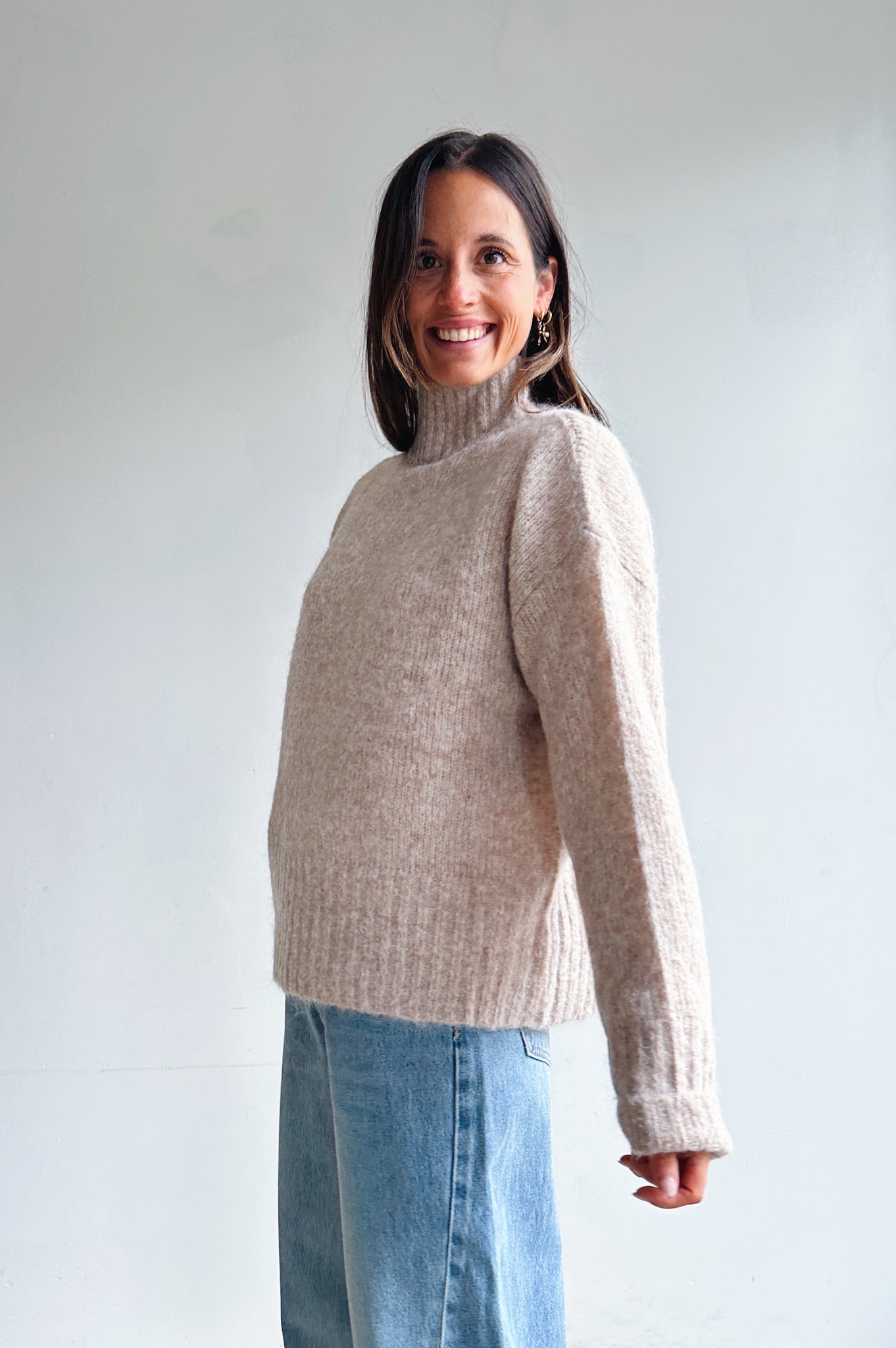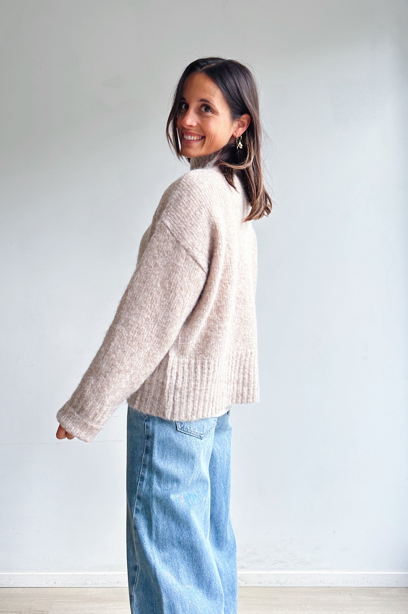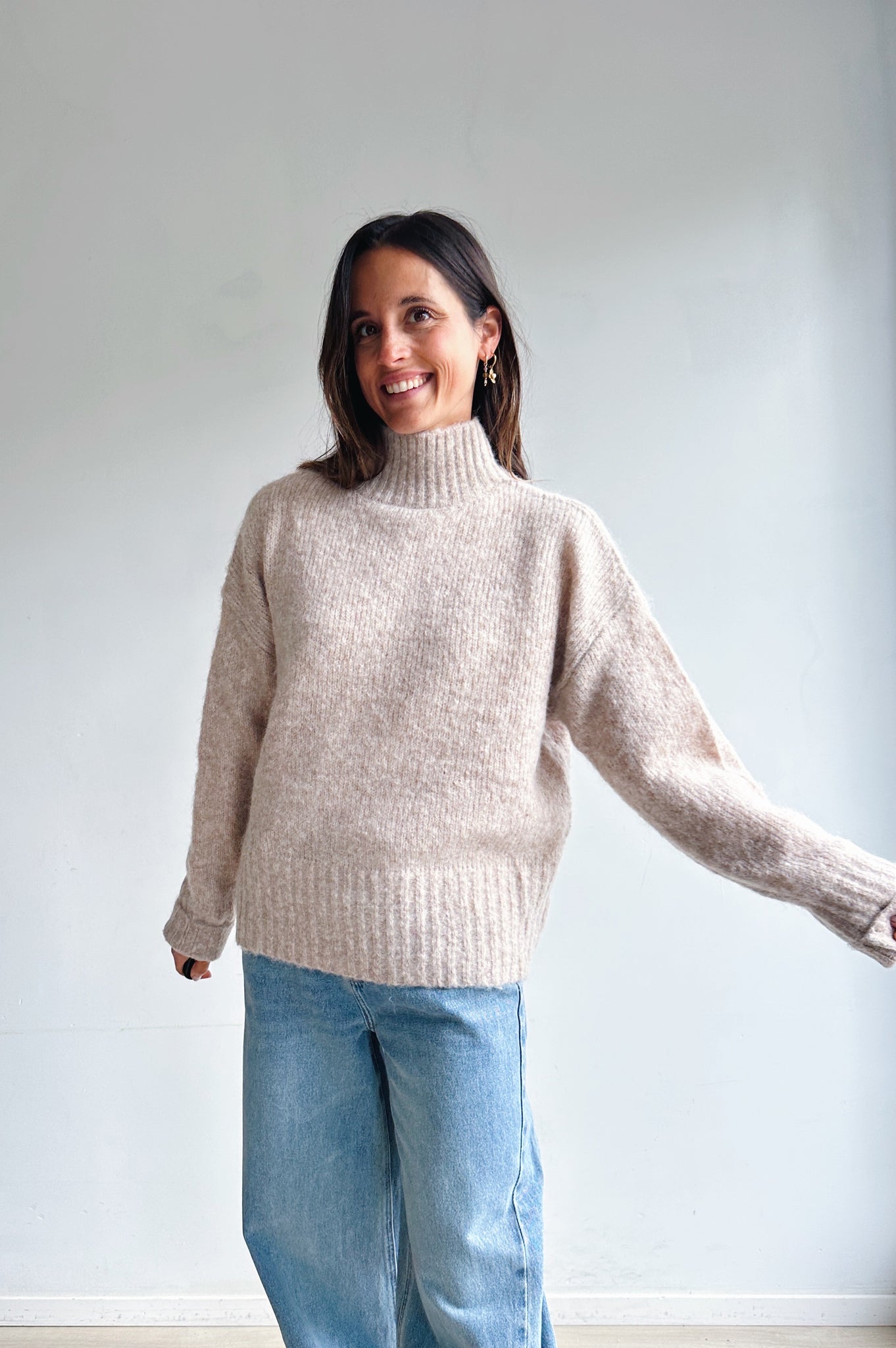 Deze heerlijk zachte coltrui in een warme beige tint is het ultieme cosy item voor koude dagen. De trui heeft een rechte, iets losse pasvorm met een hoge col en brede ribboord aan de onderzijde en mouwen voor een stijlvolle, tijdloze look. Gemaakt van een zachte stof die niet prikt en comfortabel aanvoelt op de huid.