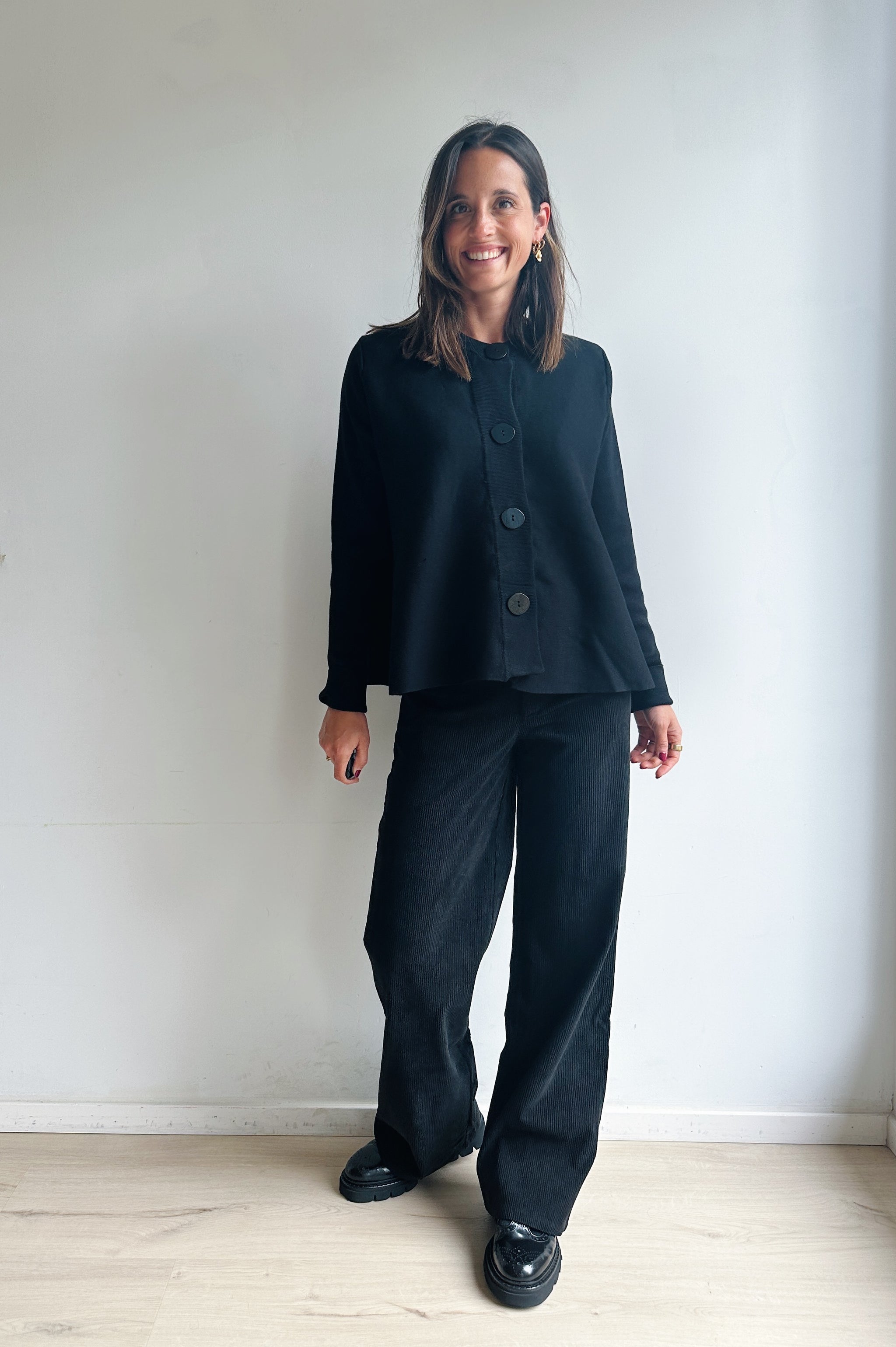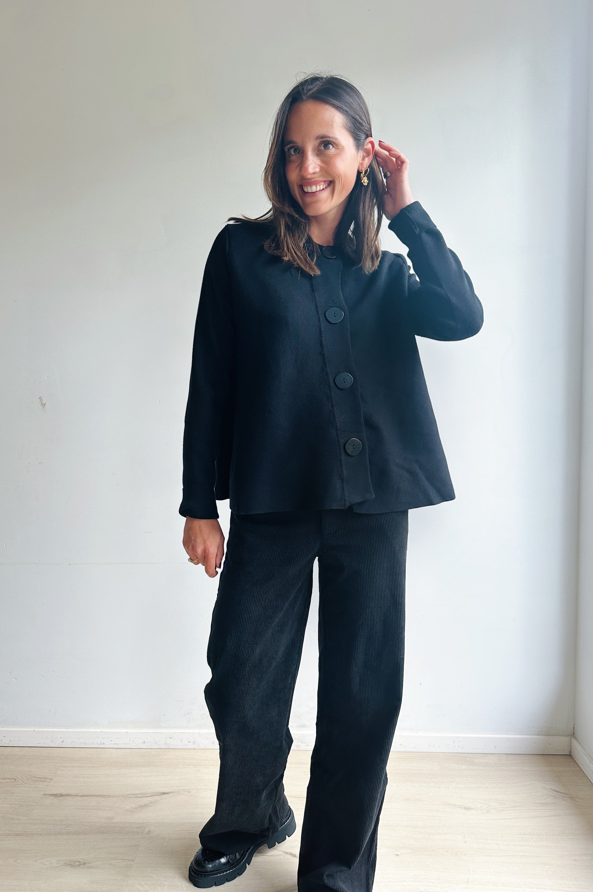 Deze tijdloze zwarte gilet is een echte klassieker met een moderne twist. Het licht uitlopende model met 4 grote knopen aan de voorkant zorgt voor een minimalistische en tegelijk speelse uitstraling. Dankzij de rechte iets uitlopende snit en de soepele stof valt het vestje mooi losjes, waardoor het comfortabel zit én makkelijk te combineren is. Draag het casual met een jeans of combineer het stijlvol met een rok voor een tijdloze, elegante look.