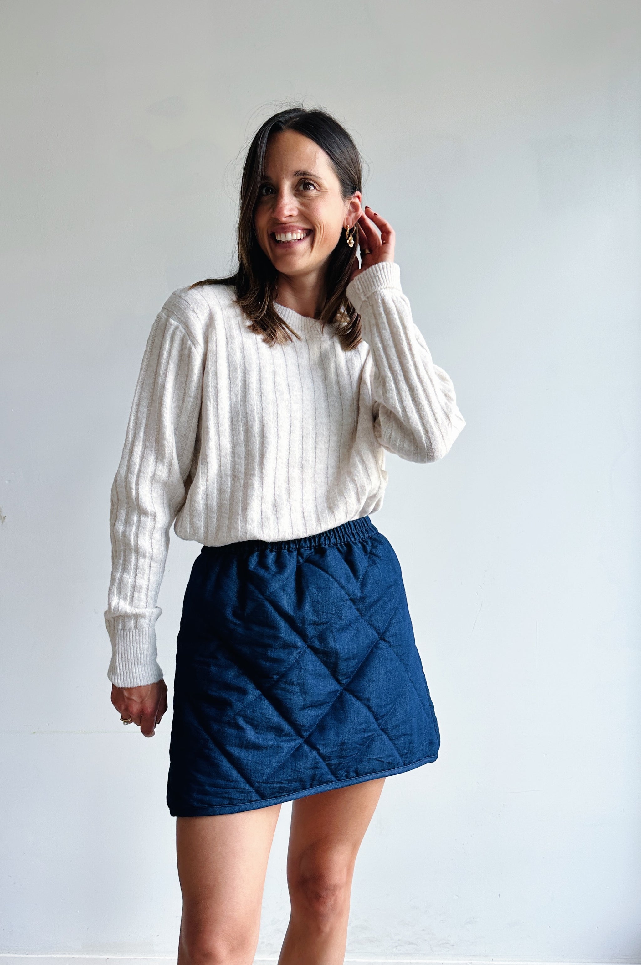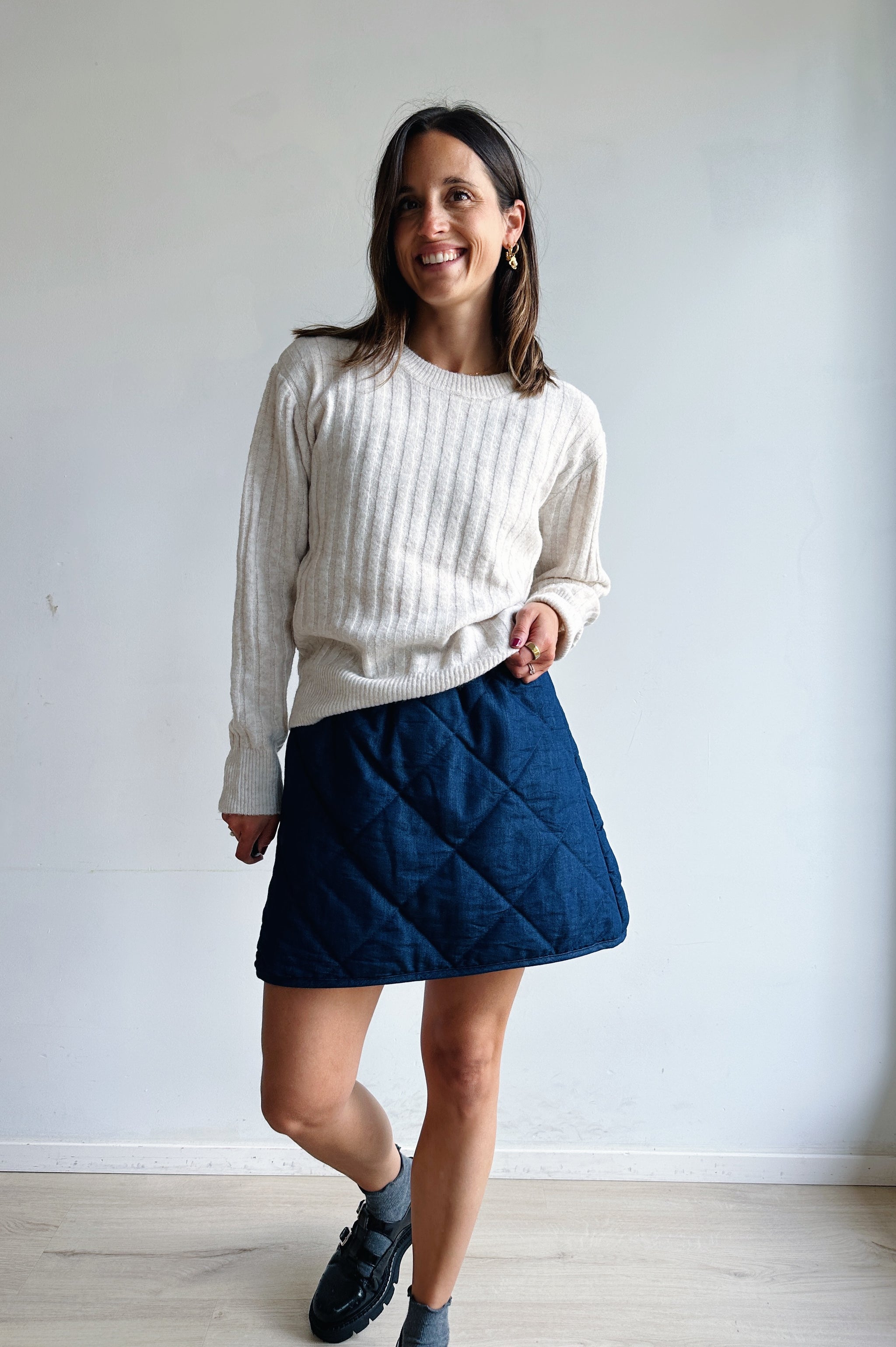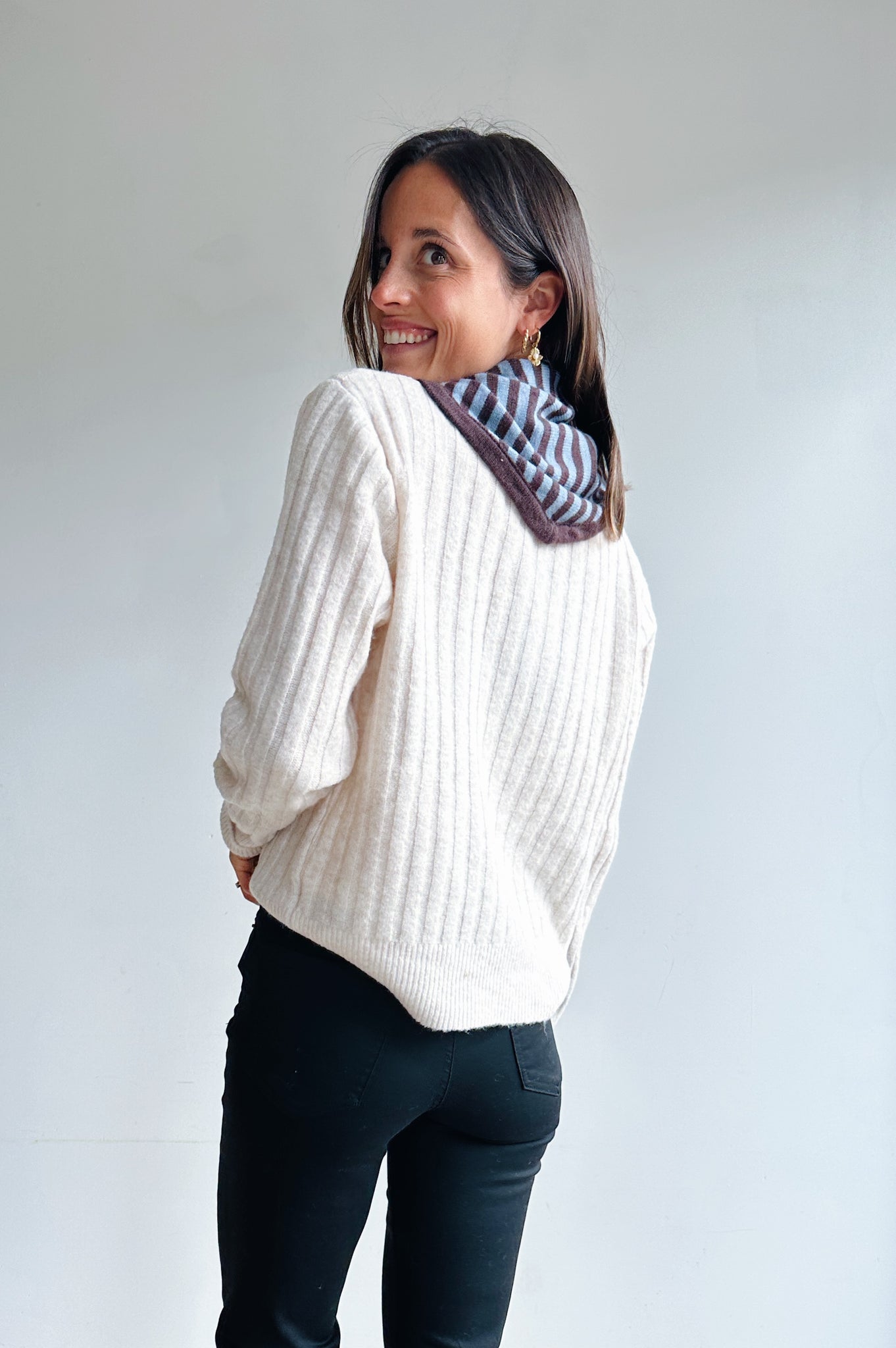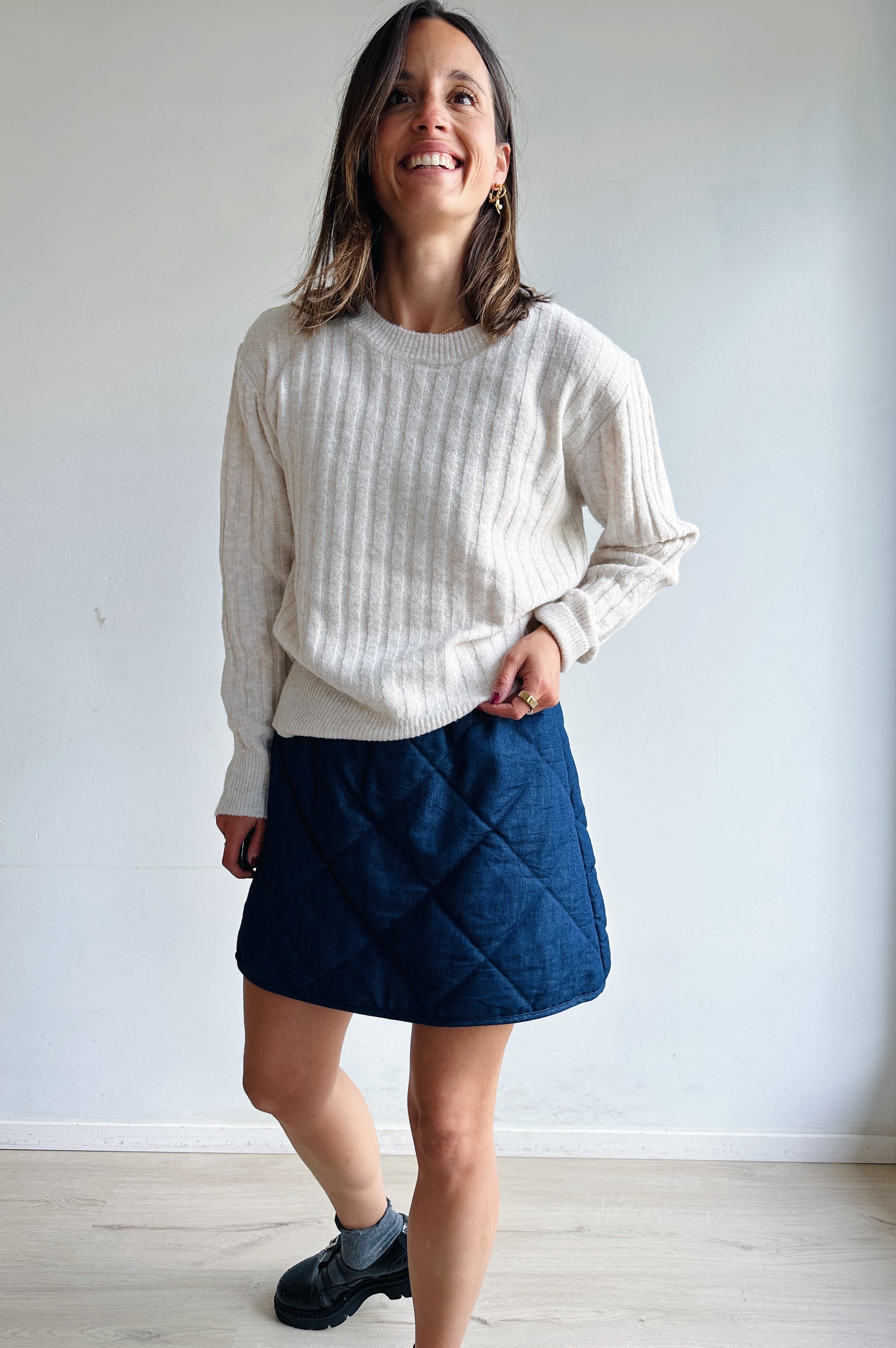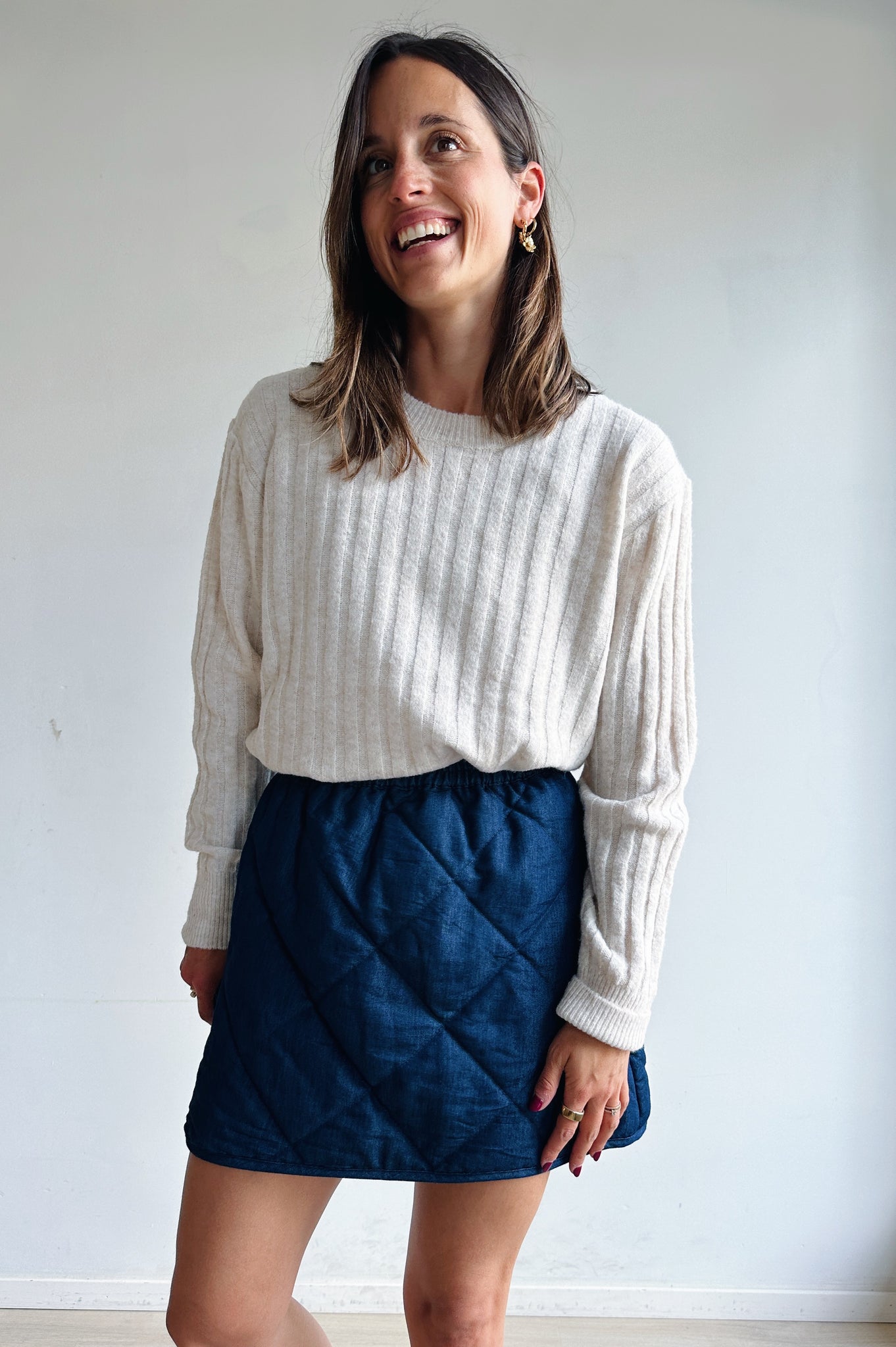 Een ecru gebreide trui met subtiele verticale ribbelstrepen. Voorzien van een ronde hals en lange mouwen met licht verlaagde schouders, afgewerkt met ribboorden voor een tijdloze look. De pasvorm is comfortabel en veelzijdig, ideaal om zowel casual als gekleder te combineren.