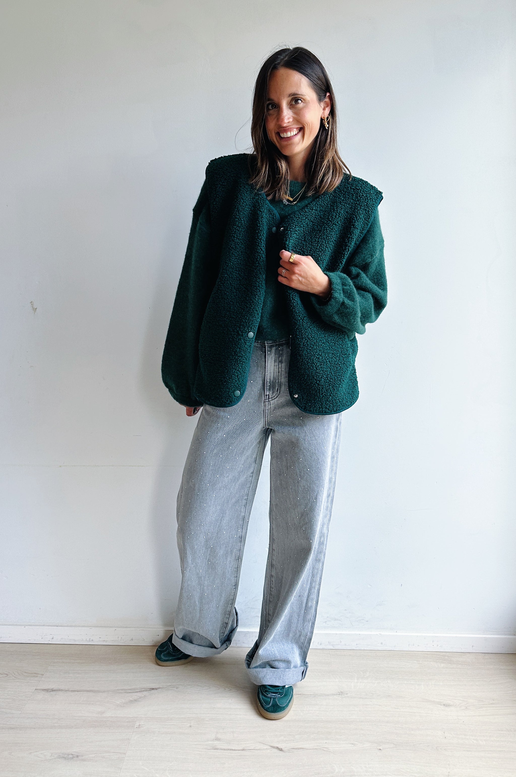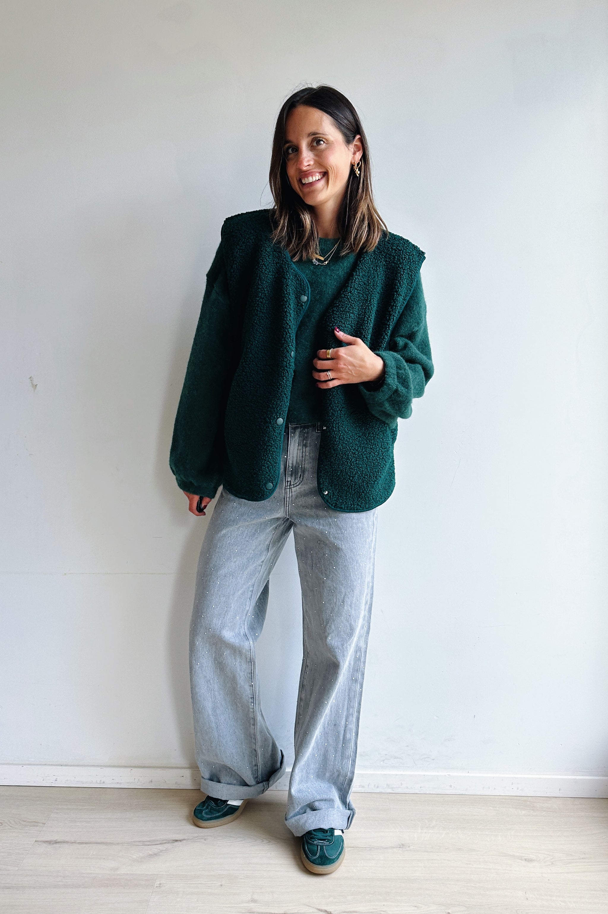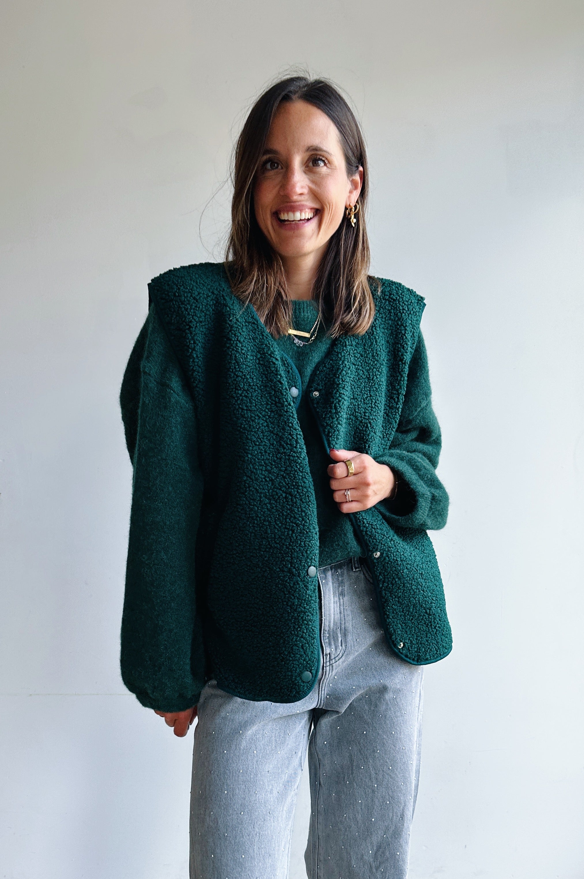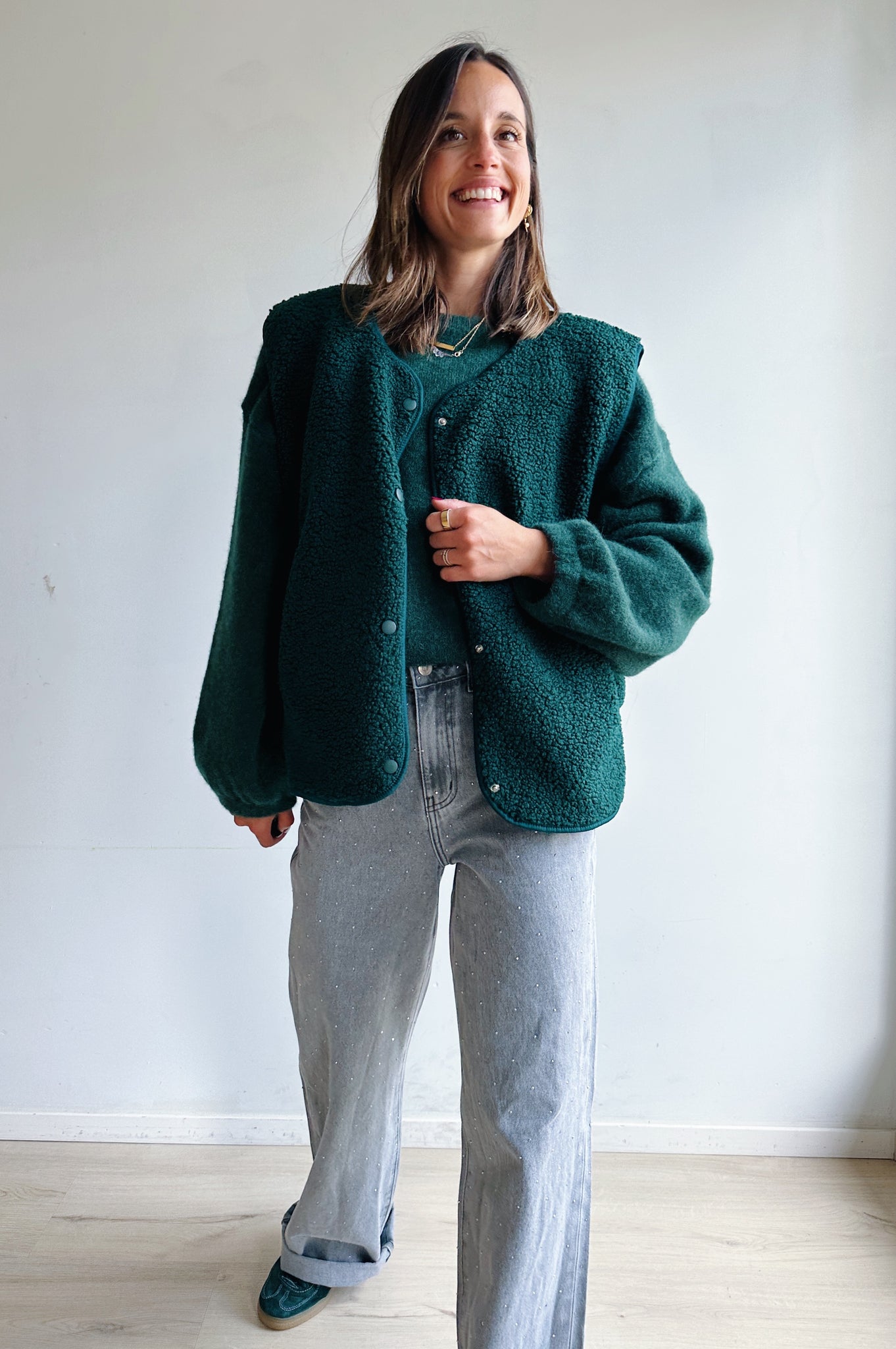 De donkergroene teddy is een heerlijk zacht en cozy item dat meteen warmte en extra laagje toevoegt aan je outfit. De teddy stof geeft een nonchalante maar modieuze uitstraling en de donkergroene tint maakt hem makkelijk te combineren. Met de drukknopen kan je hem open of dicht dragen, afhankelijk van de look die je wil creëren. De rechte, iets boxy pasvorm zorgt ervoor dat hij comfortabel zit en een moderne, casual vibe heeft. Perfect om te dragen over een trui of t-shirt, en ideaal voor frisse dagen waarop je je toch stijlvol wil voelen.