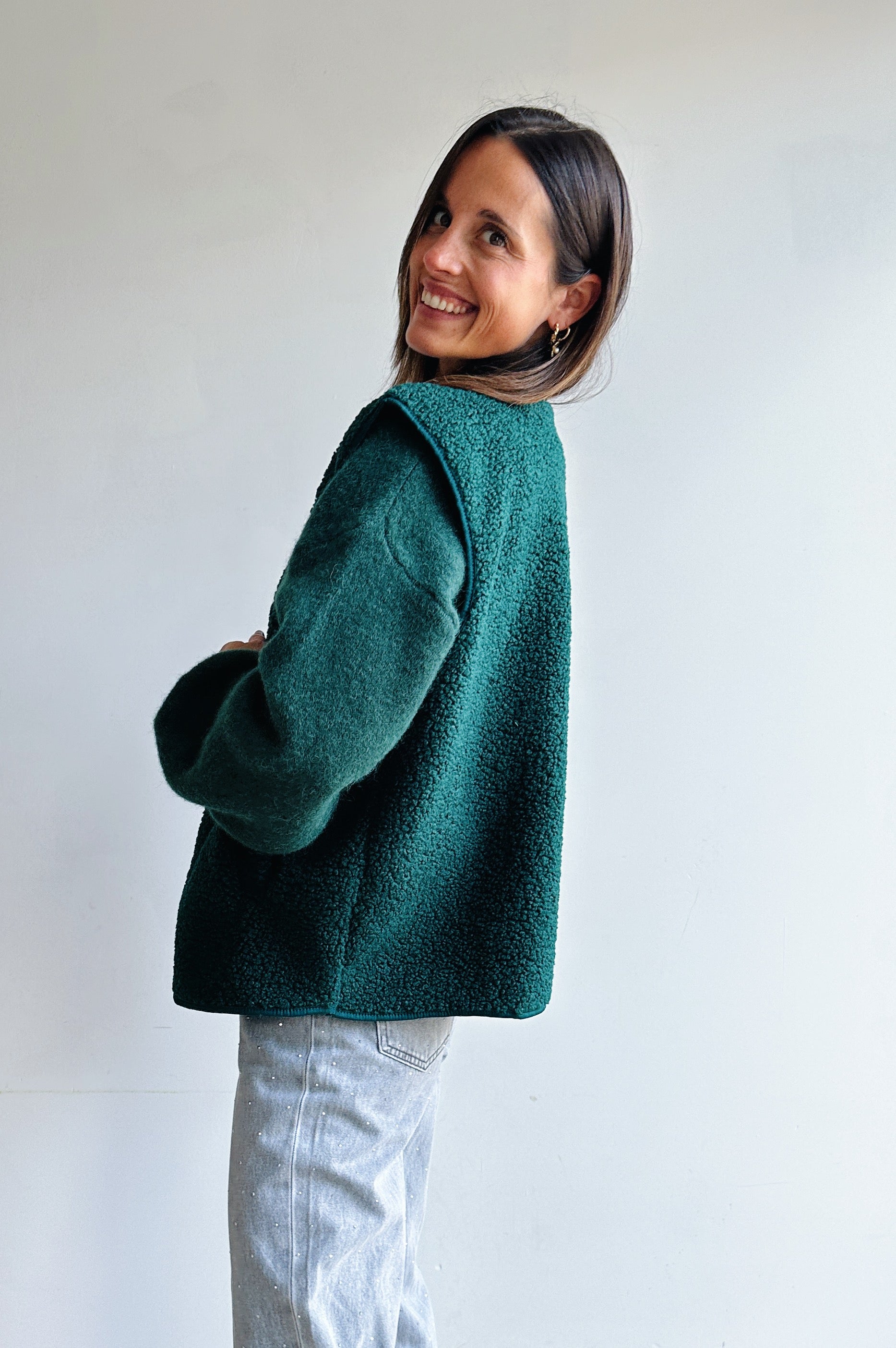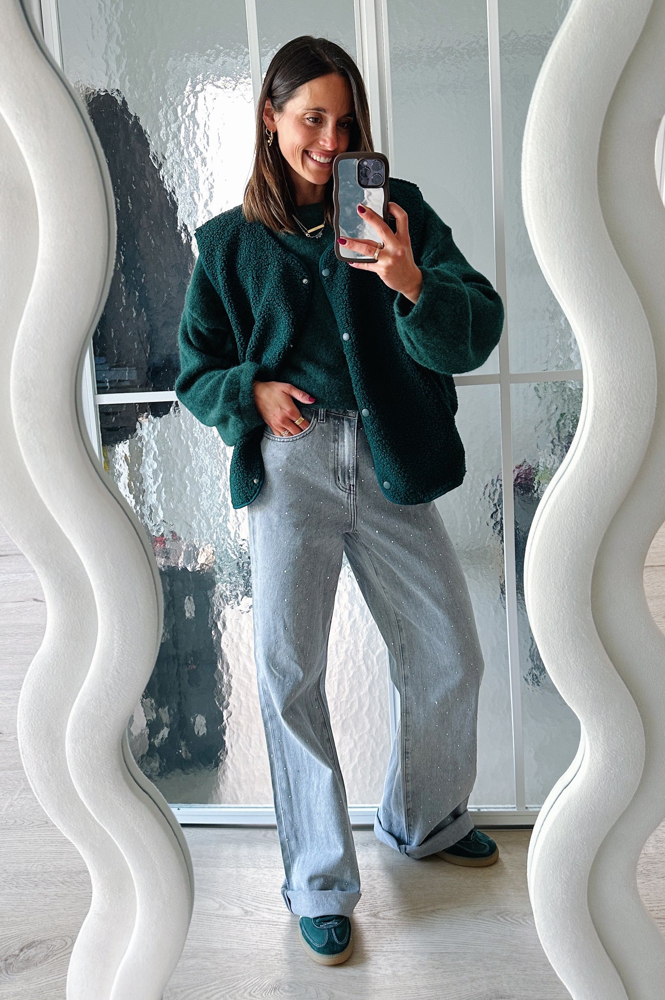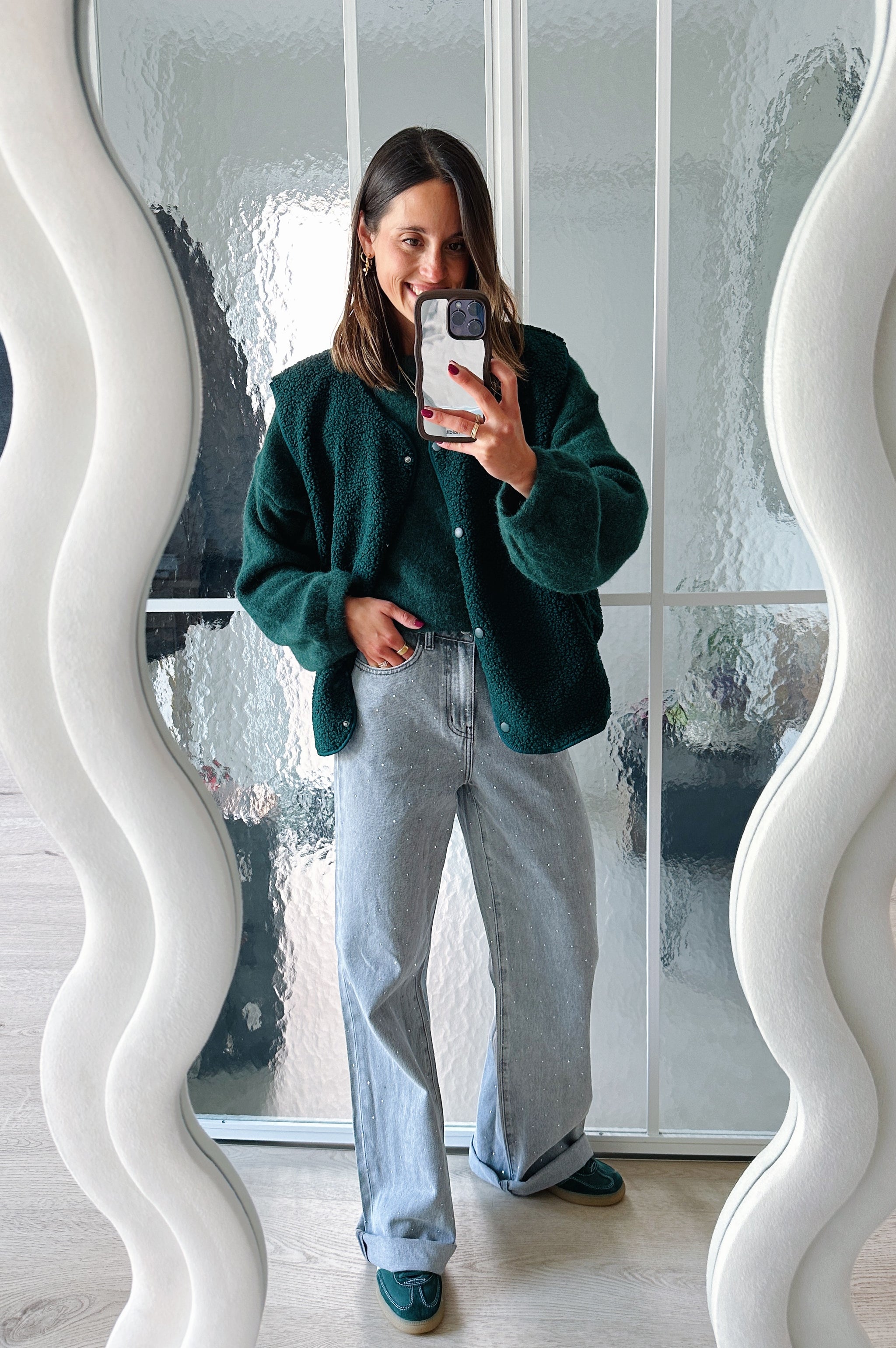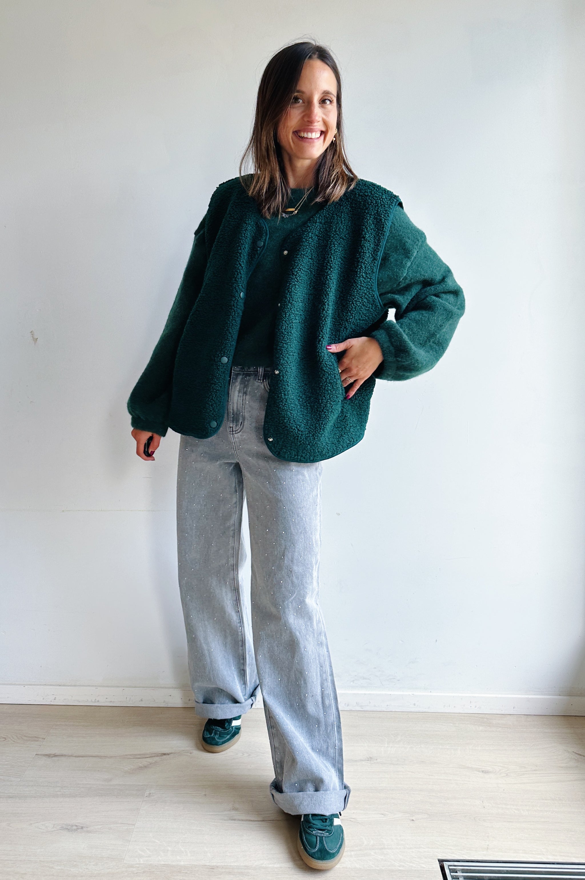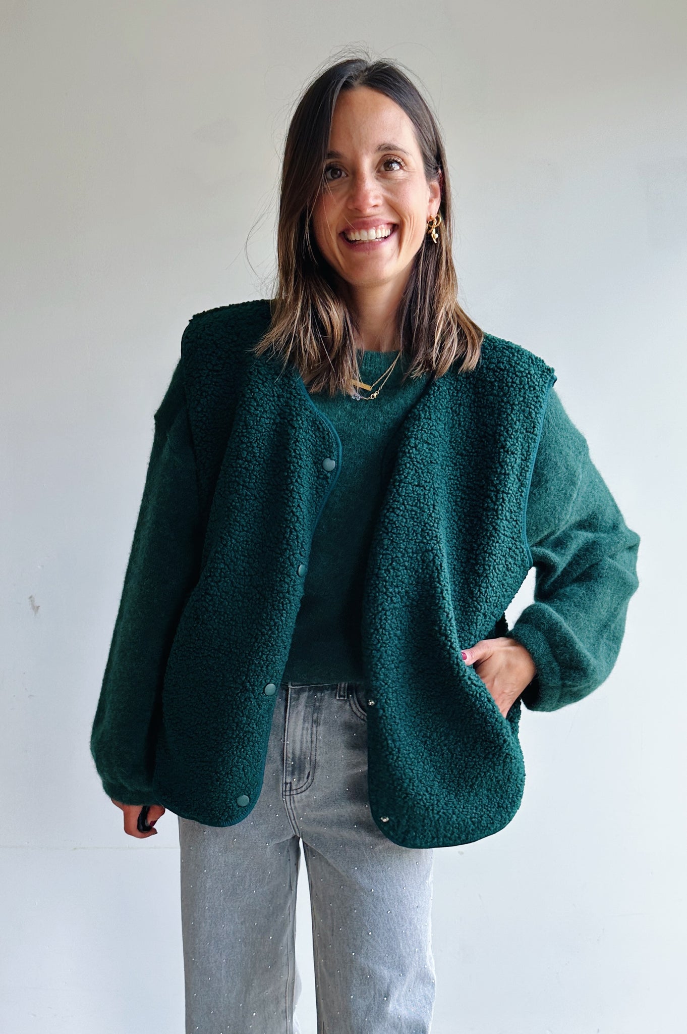 De donkergroene teddy is een heerlijk zacht en cozy item dat meteen warmte en extra laagje toevoegt aan je outfit. De teddy stof geeft een nonchalante maar modieuze uitstraling en de donkergroene tint maakt hem makkelijk te combineren. Met de drukknopen kan je hem open of dicht dragen, afhankelijk van de look die je wil creëren. De rechte, iets boxy pasvorm zorgt ervoor dat hij comfortabel zit en een moderne, casual vibe heeft. Perfect om te dragen over een trui of t-shirt, en ideaal voor frisse dagen waarop je je toch stijlvol wil voelen.