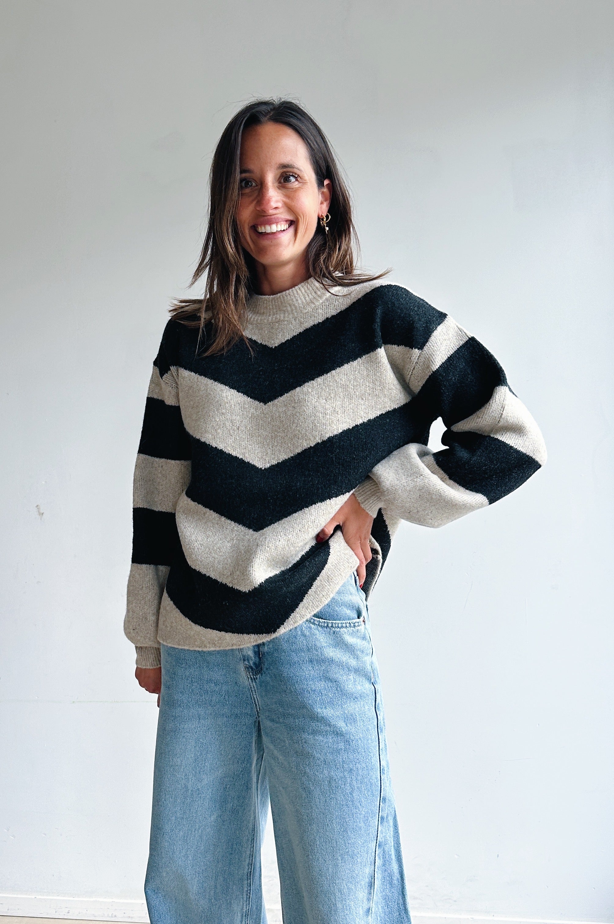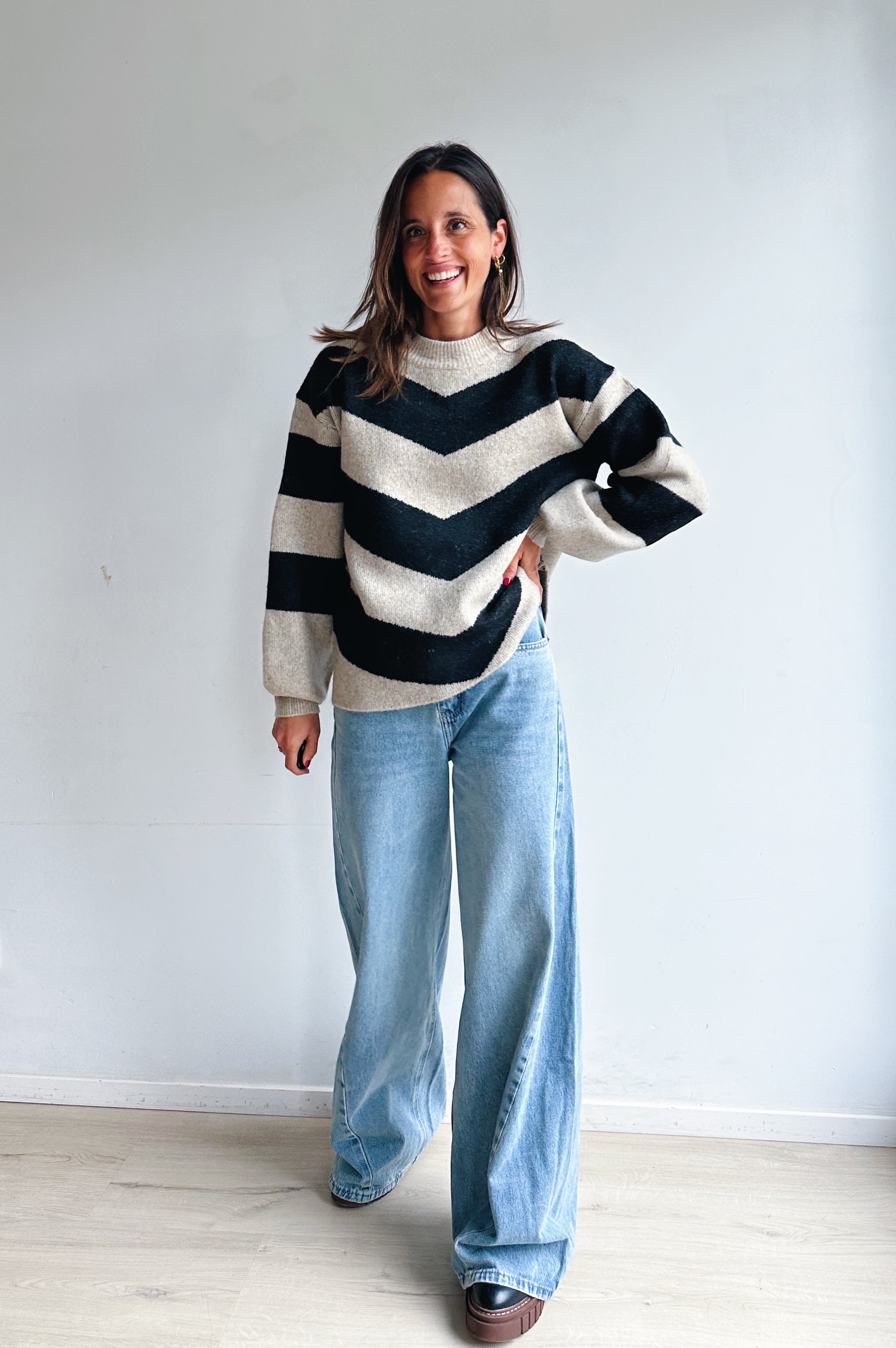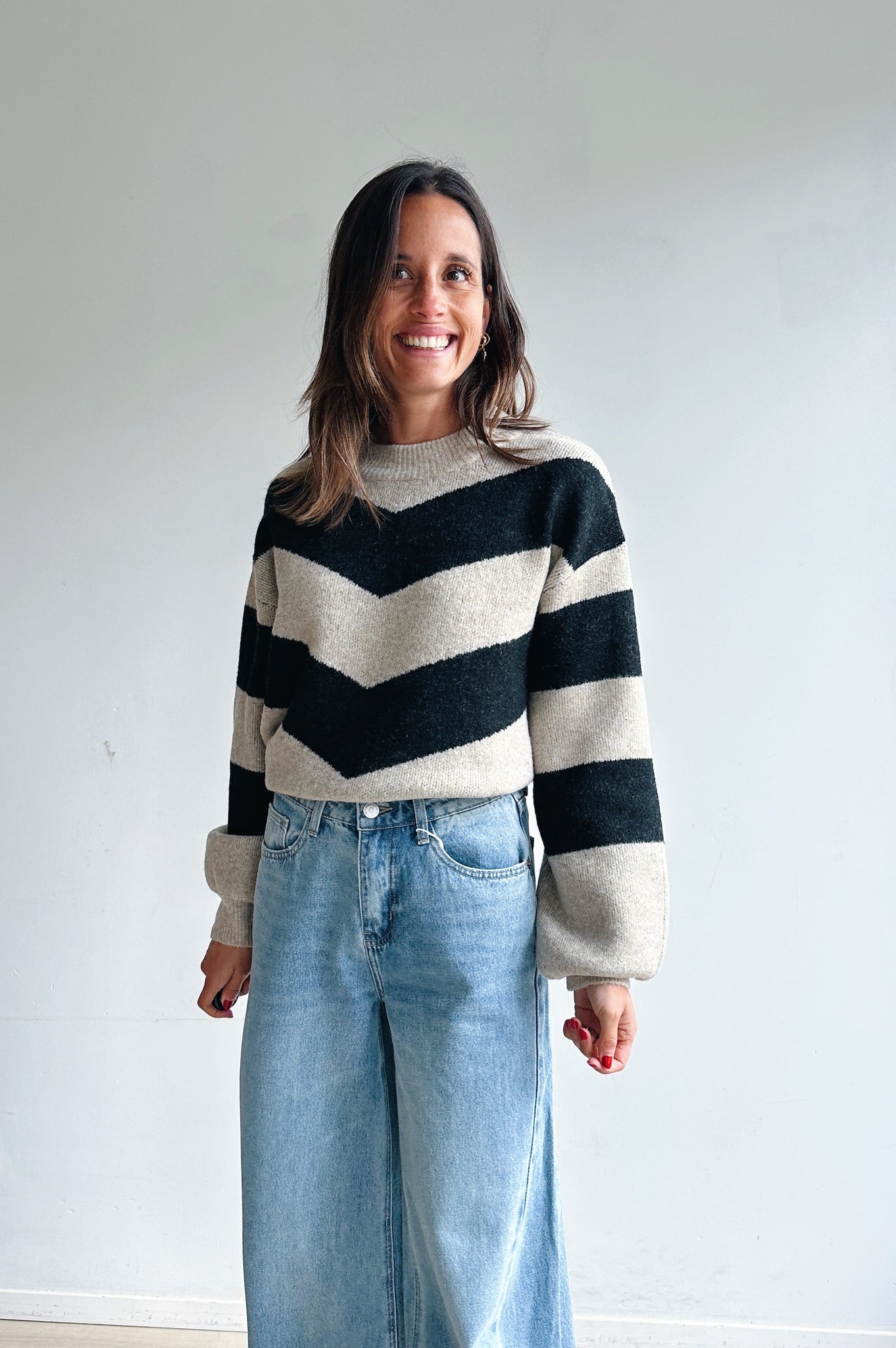 Deze trui heeft een relaxed fit, lange mouwen en een ronde hals. Het grafische streeppatroon geeft een moderne, speelse twist, terwijl de zachte stof zorgt voor draagcomfort. Perfect om casual te combineren met jeans of een rok.