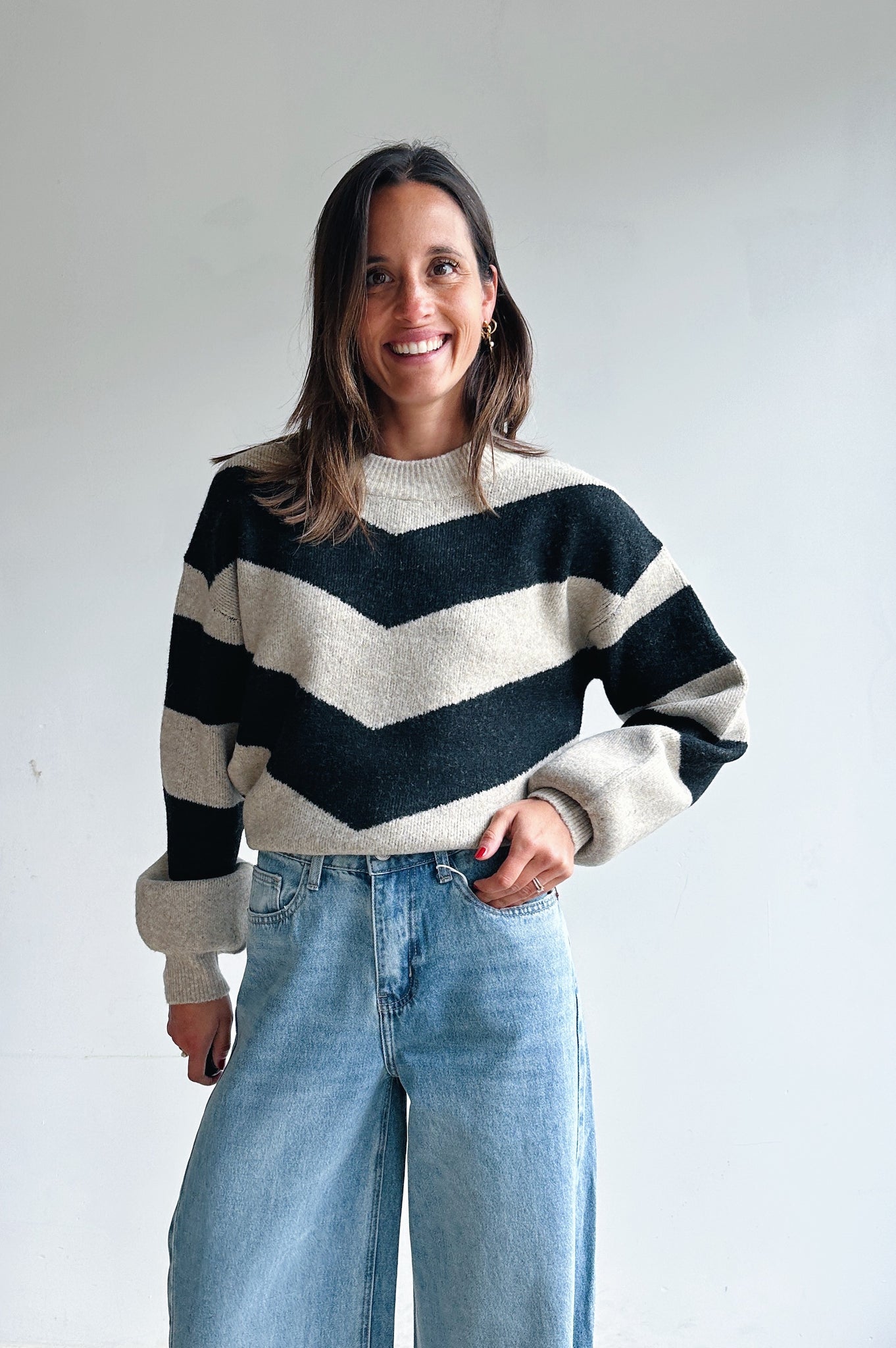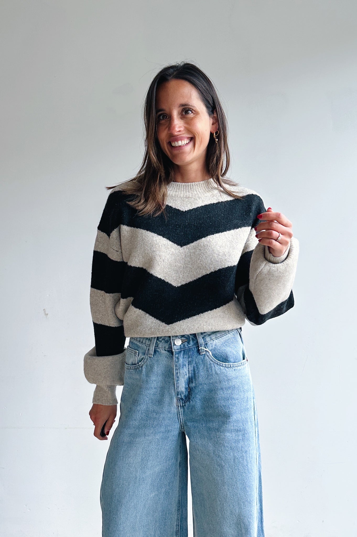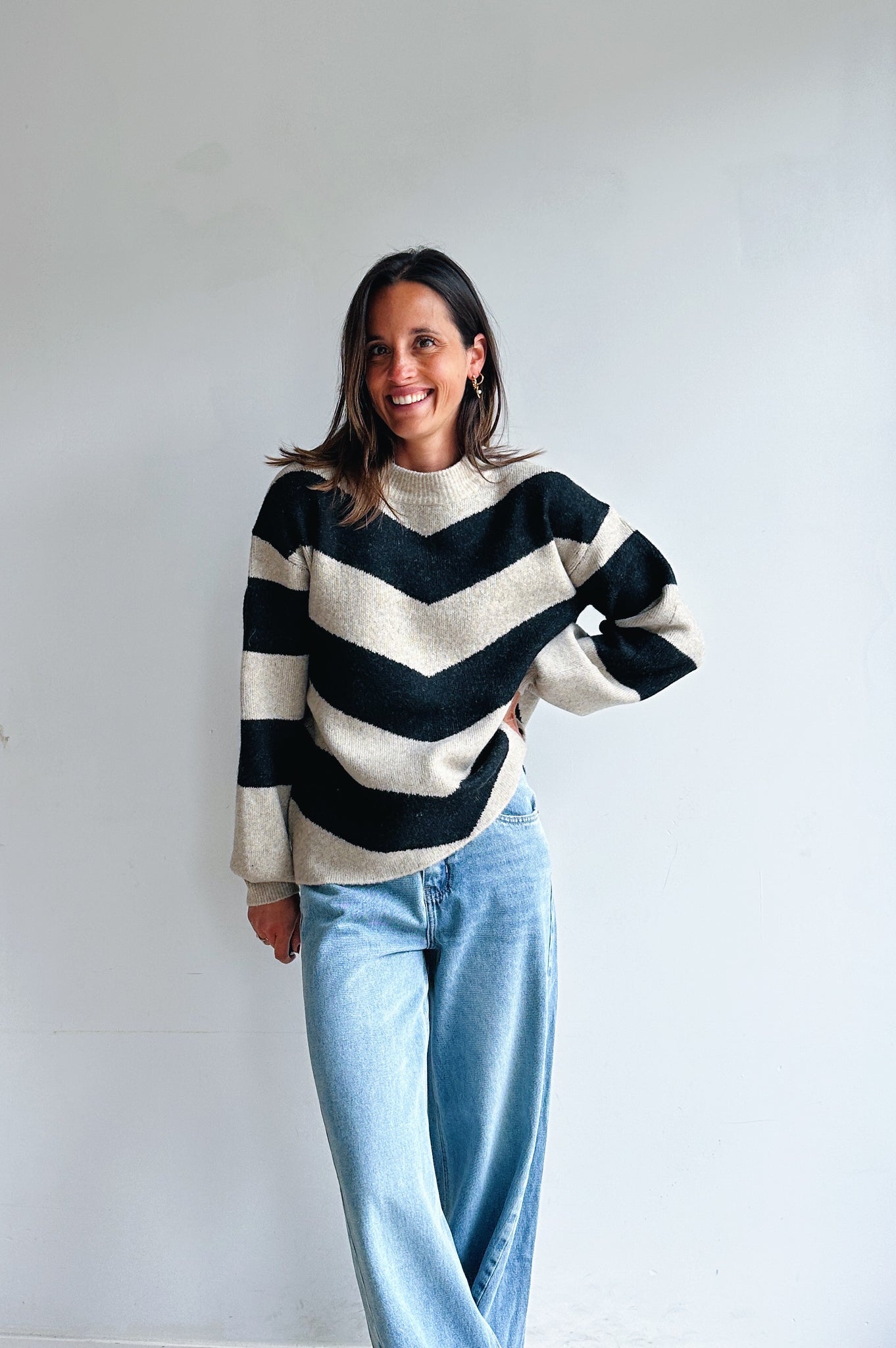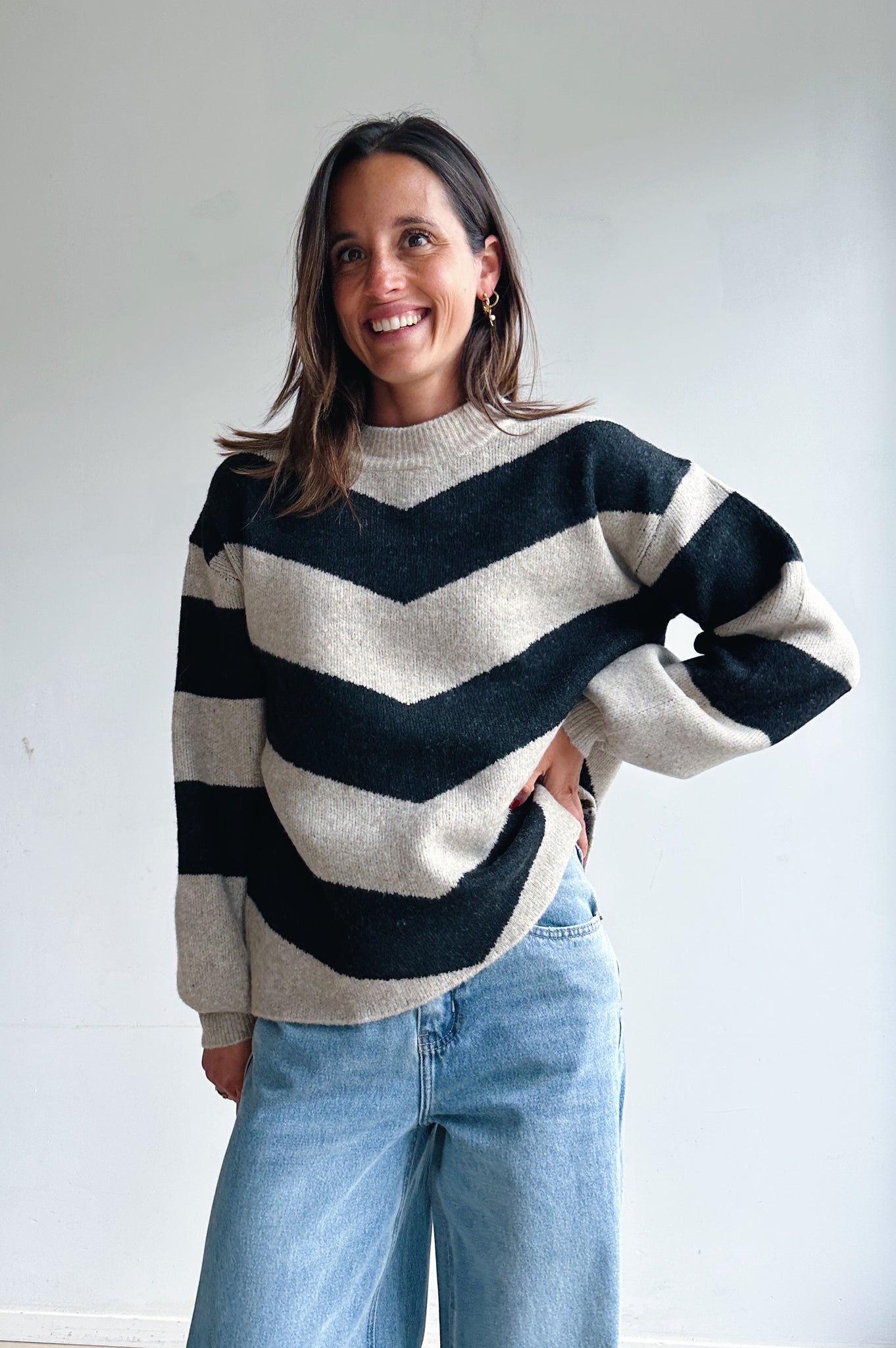 Deze trui heeft een relaxed fit, lange mouwen en een ronde hals. Het grafische streeppatroon geeft een moderne, speelse twist, terwijl de zachte stof zorgt voor draagcomfort. Perfect om casual te combineren met jeans of een rok.