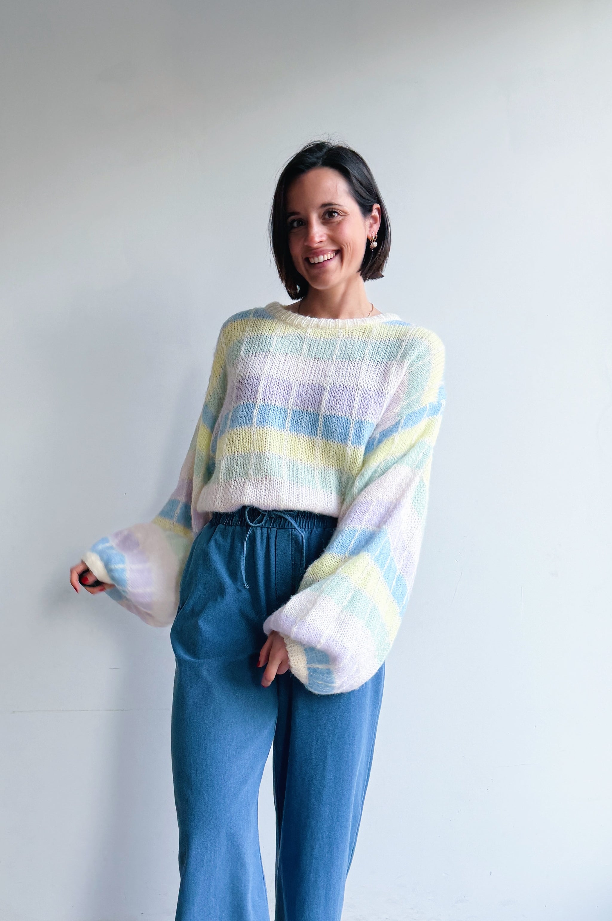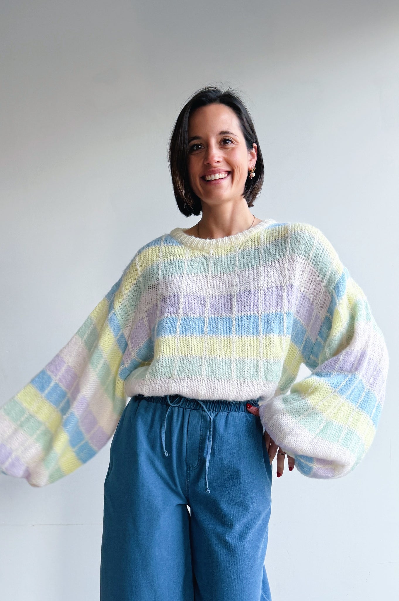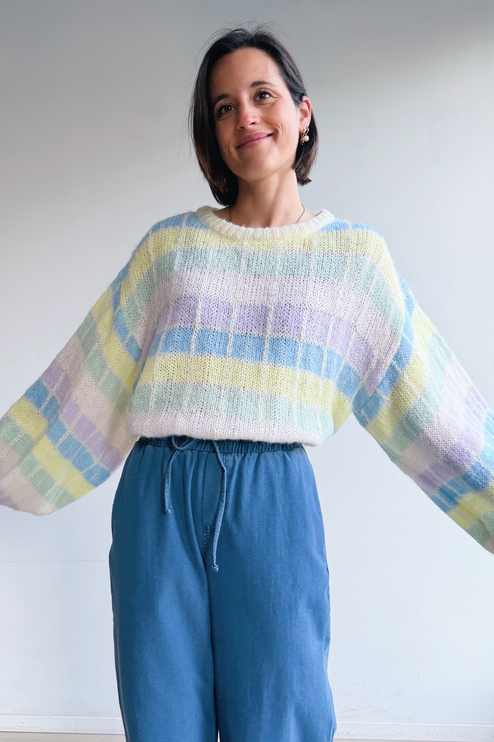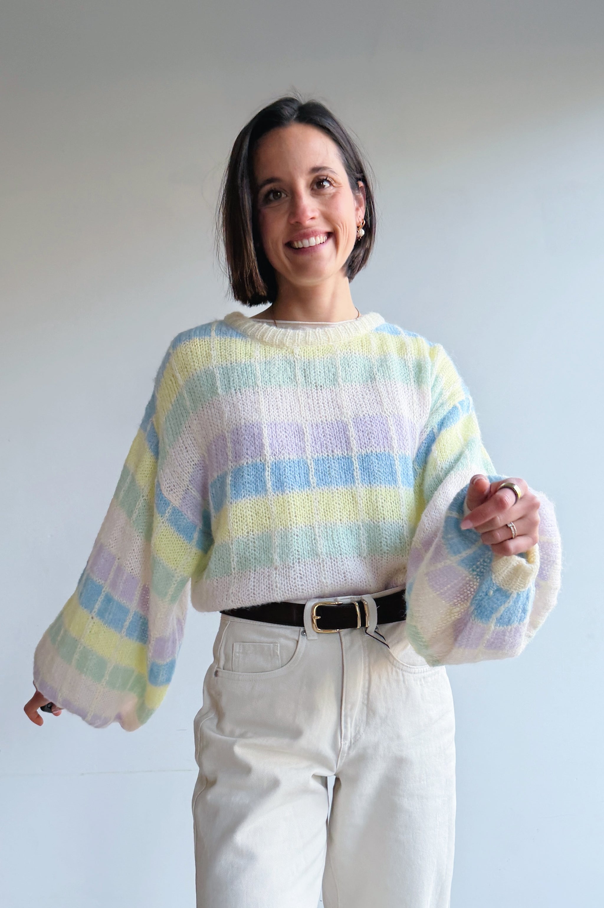 Deze zachte, gebreide trui is een echte eyecatcher dankzij het subtiele ruitpatroon in frisse pasteltinten. De losse, comfortabele pasvorm en grote ballon mouwen geven de trui een nonchalante, moderne uitstraling, terwijl de ronde hals zorgt voor een tijdloze afwerking. Het luchtige breisel voelt aangenaam zacht aan en maakt de trui perfect om het hele jaar door te dragen, zowel op een jeans voor een casual look als gecombineerd met een nette broek voor een meer geklede stijl.