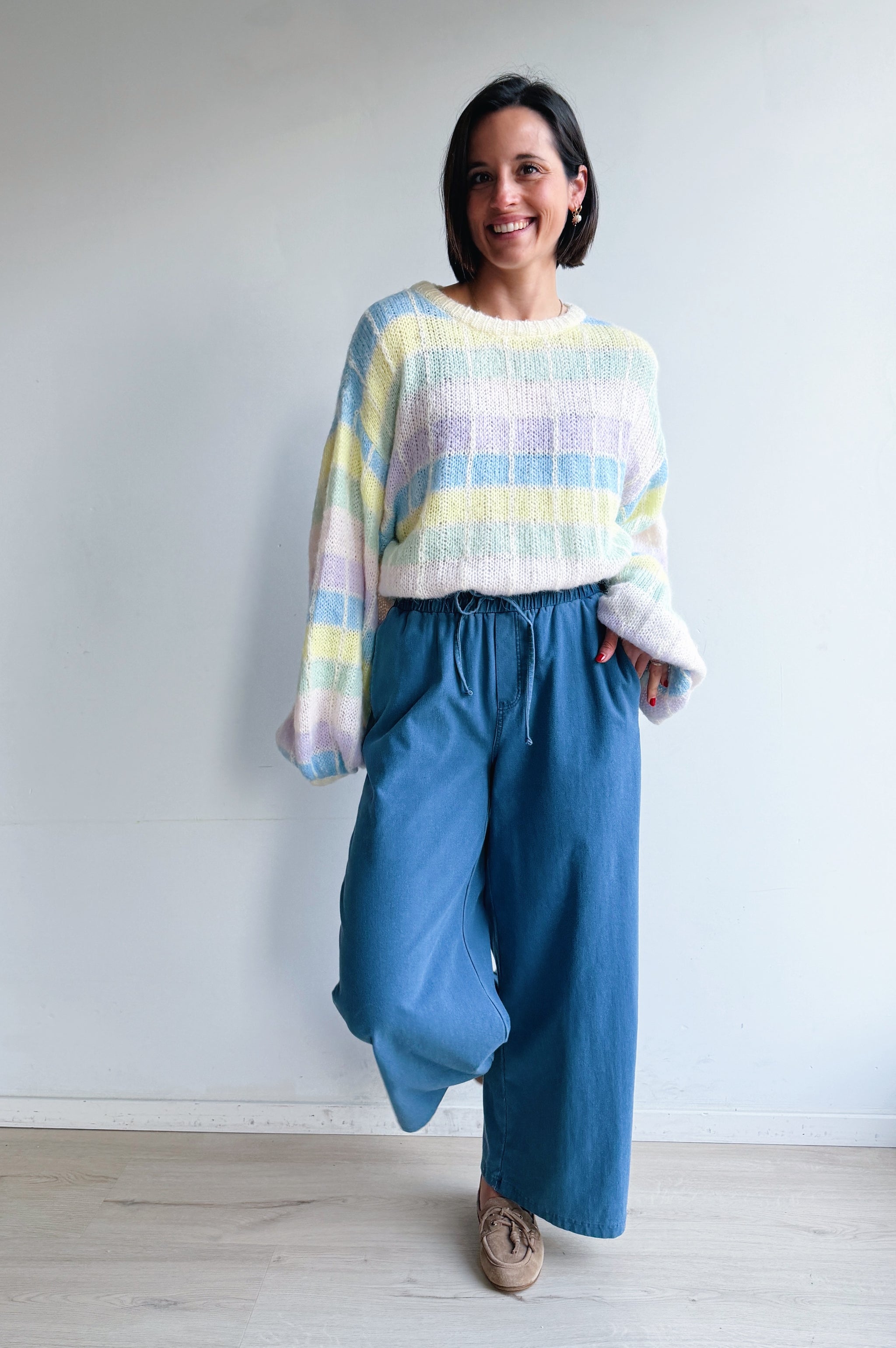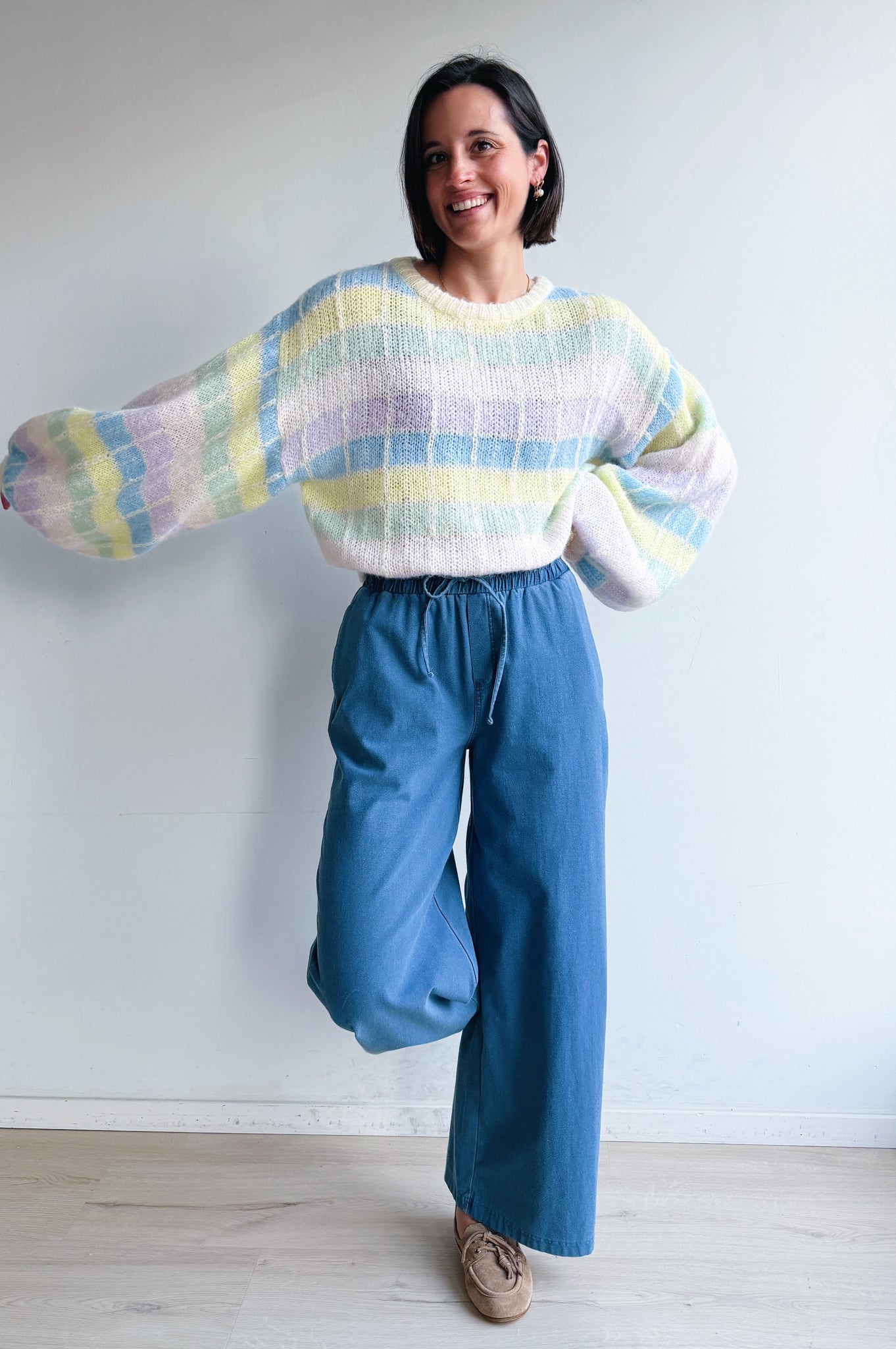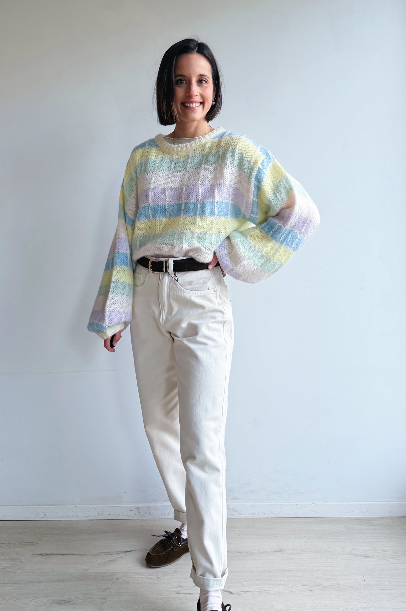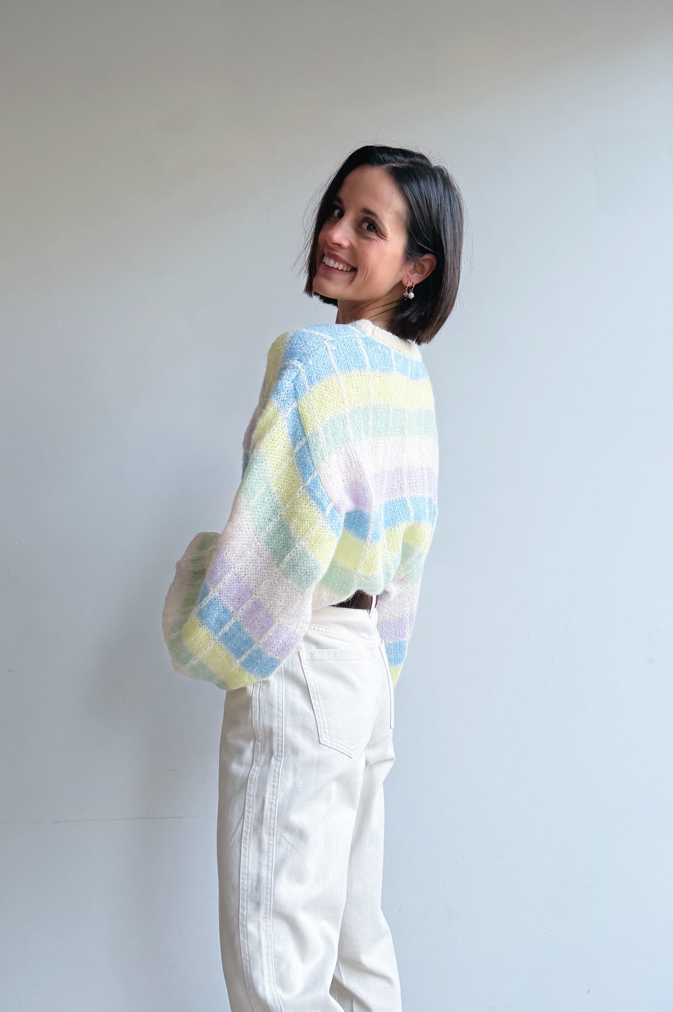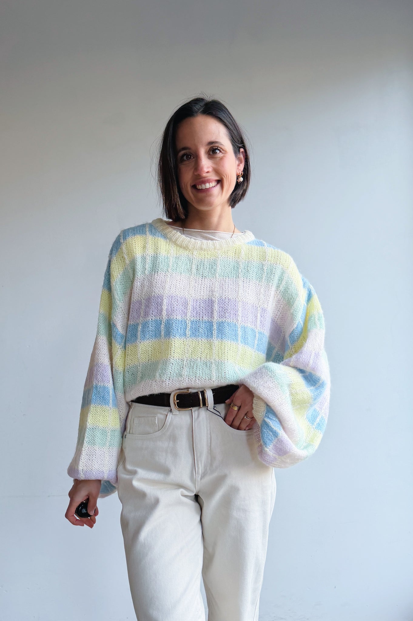 Deze zachte, gebreide trui is een echte eyecatcher dankzij het subtiele ruitpatroon in frisse pasteltinten. De losse, comfortabele pasvorm en grote ballon mouwen geven de trui een nonchalante, moderne uitstraling, terwijl de ronde hals zorgt voor een tijdloze afwerking. Het luchtige breisel voelt aangenaam zacht aan en maakt de trui perfect om het hele jaar door te dragen, zowel op een jeans voor een casual look als gecombineerd met een nette broek voor een meer geklede stijl.