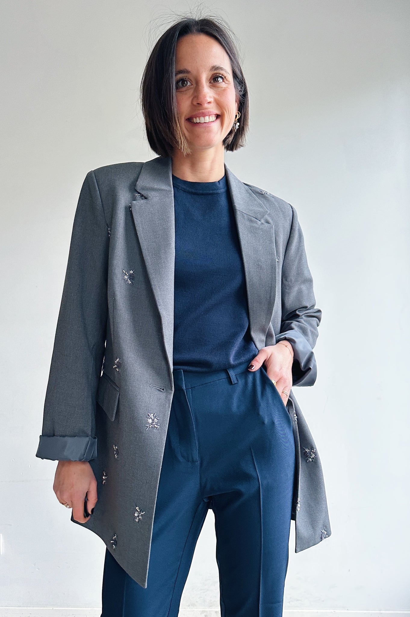 Maak kennis met de blazer die elke outfit naar een hoger niveau tilt. Deze grijze blazer combineert tijdloze klasse met een speelse twist dankzij de subtiele, glinsterende details die over de stof aan de voorzijde verspreid zijn.