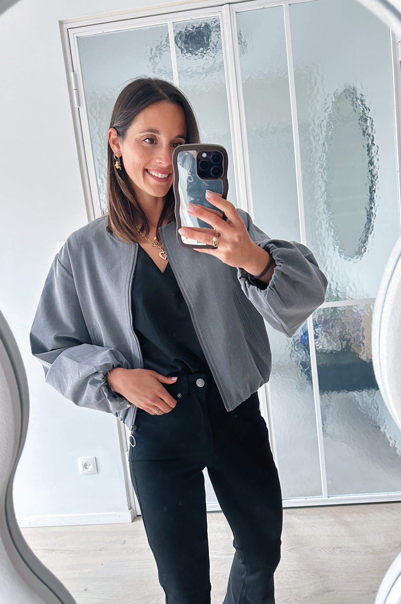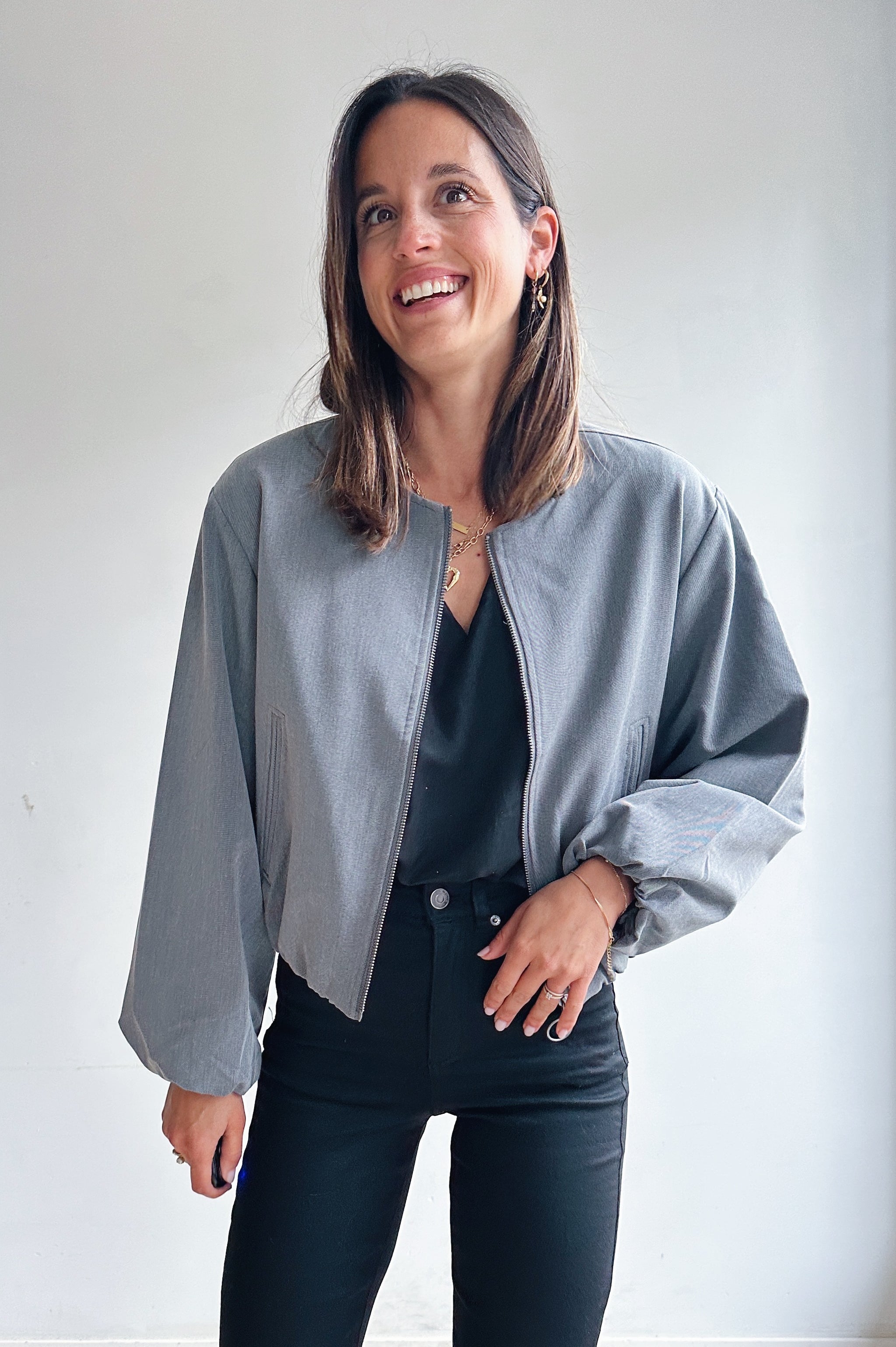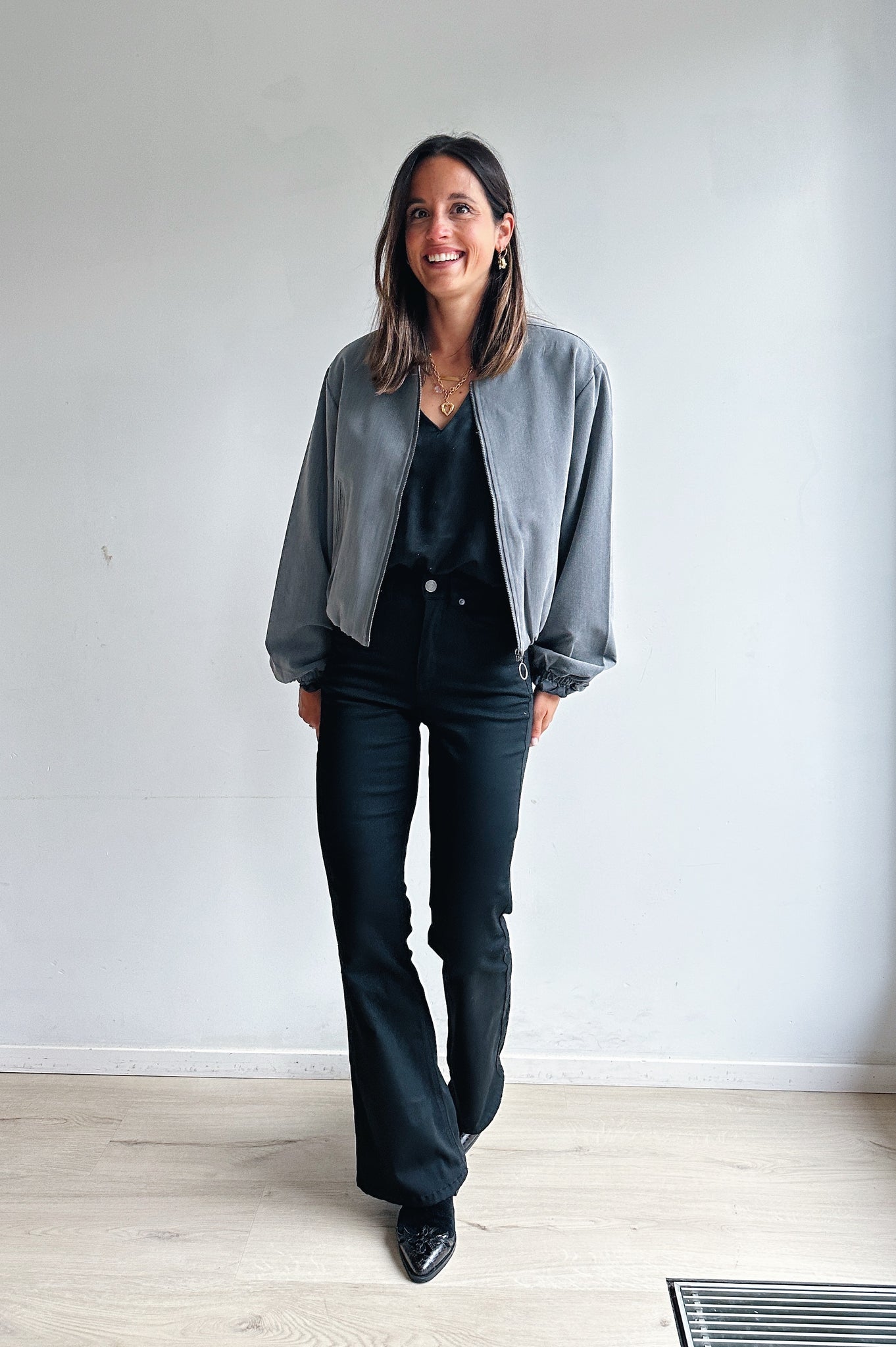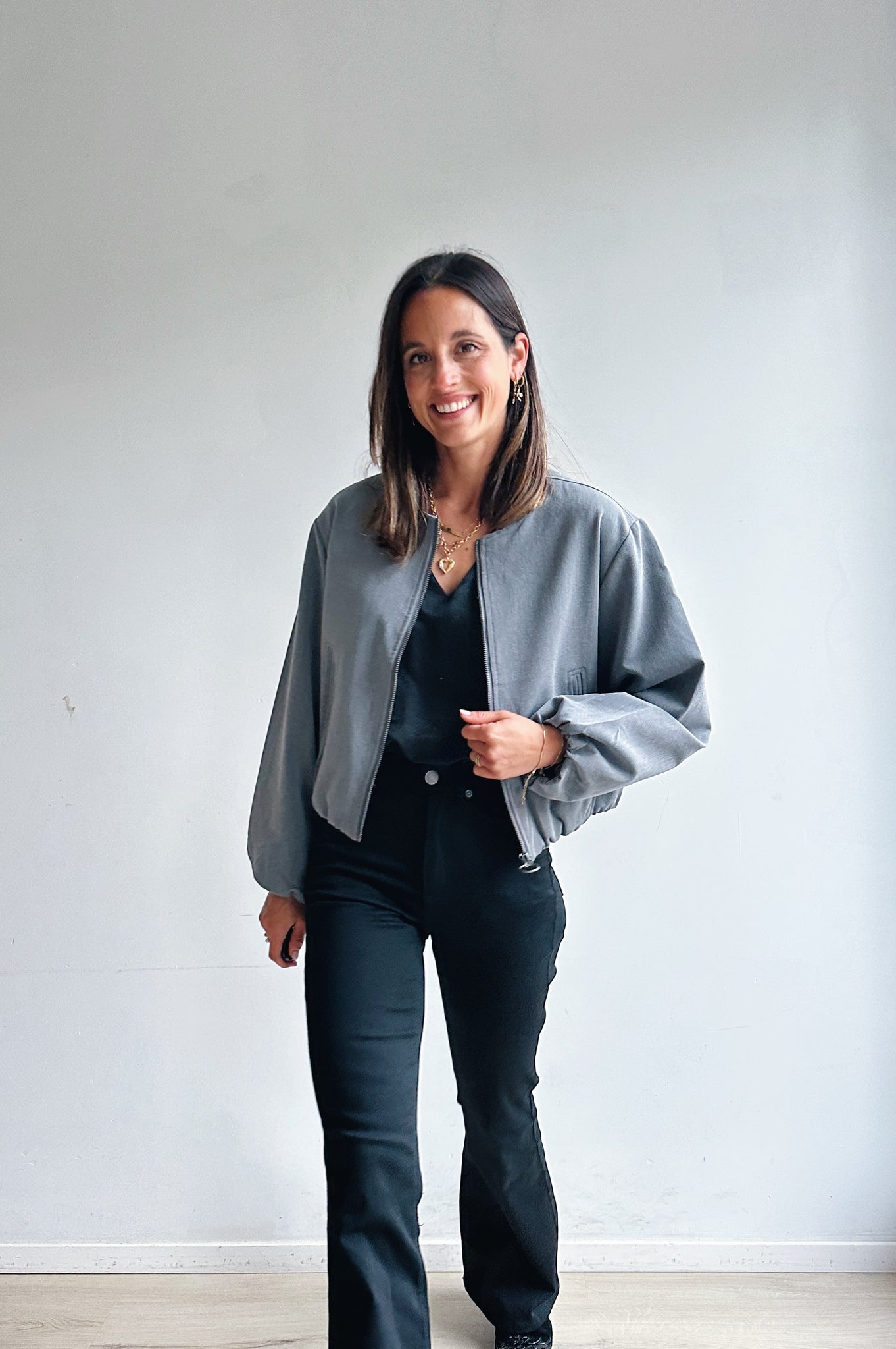 Deze stijlvolle co-ord set bestaat uit een lichtgewicht bomber-style blazerjack en een bijpassende pantalon. Het jack heeft een minimalistisch design met een ronde hals, doorlopende ritssluiting en elastische rekker voor een subtiele ballonmouw. De pantalon heeft een comfortabele elastische tailleband met trekkoord, persplooien aan de voorzijde en een rechte, ontspannen pasvorm.