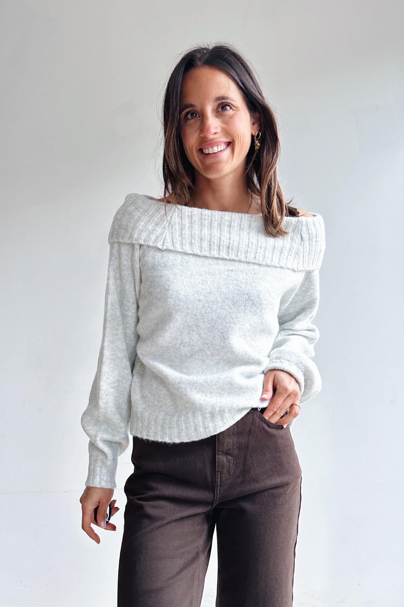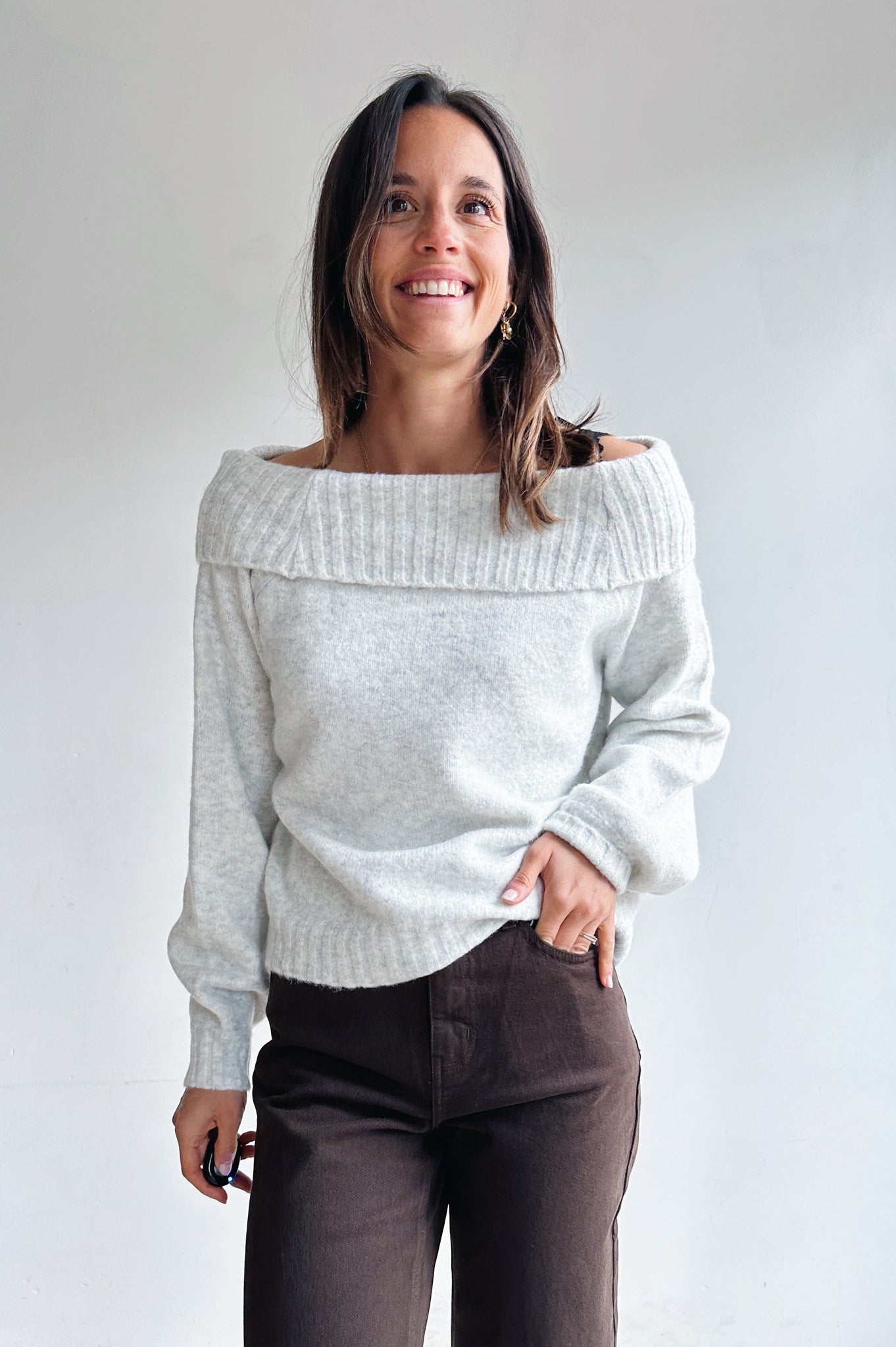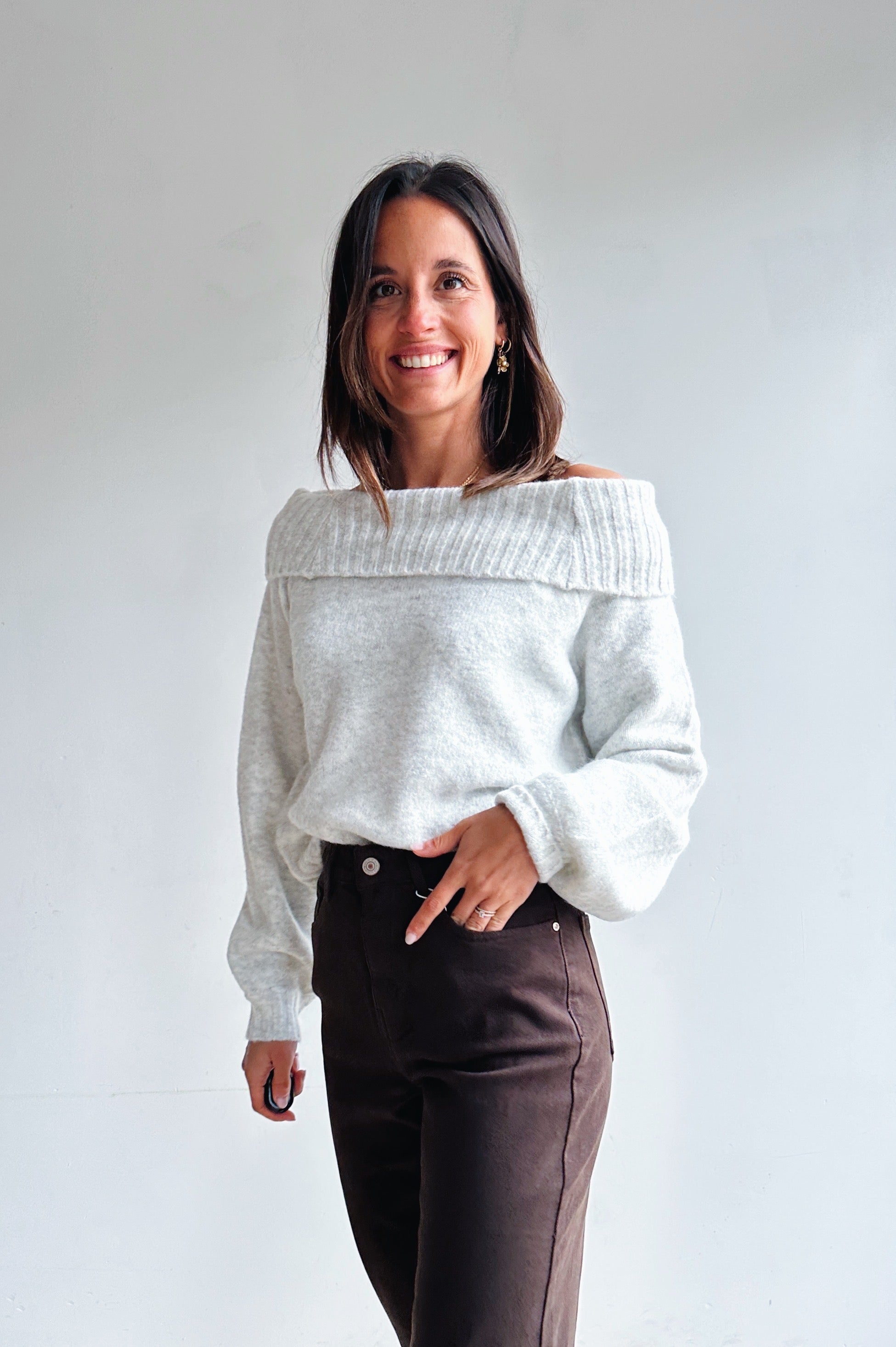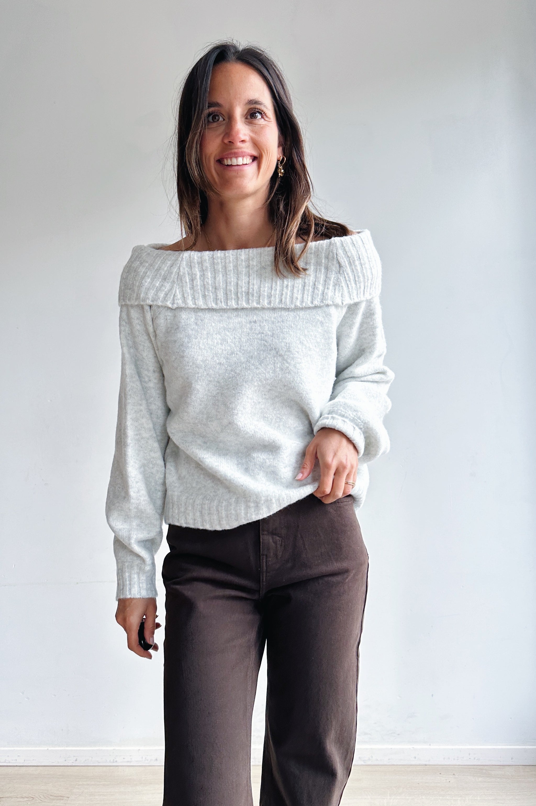 Heerlijk zachte off-shoulder trui met een vrouwelijke, flatterende halslijn. De brede kraag kan elegant over de schouders gedragen worden voor een verfijnde look. De knit heeft een comfortabele pasvorm en voelt warm en cosy aan — ideaal voor frisse dagen.