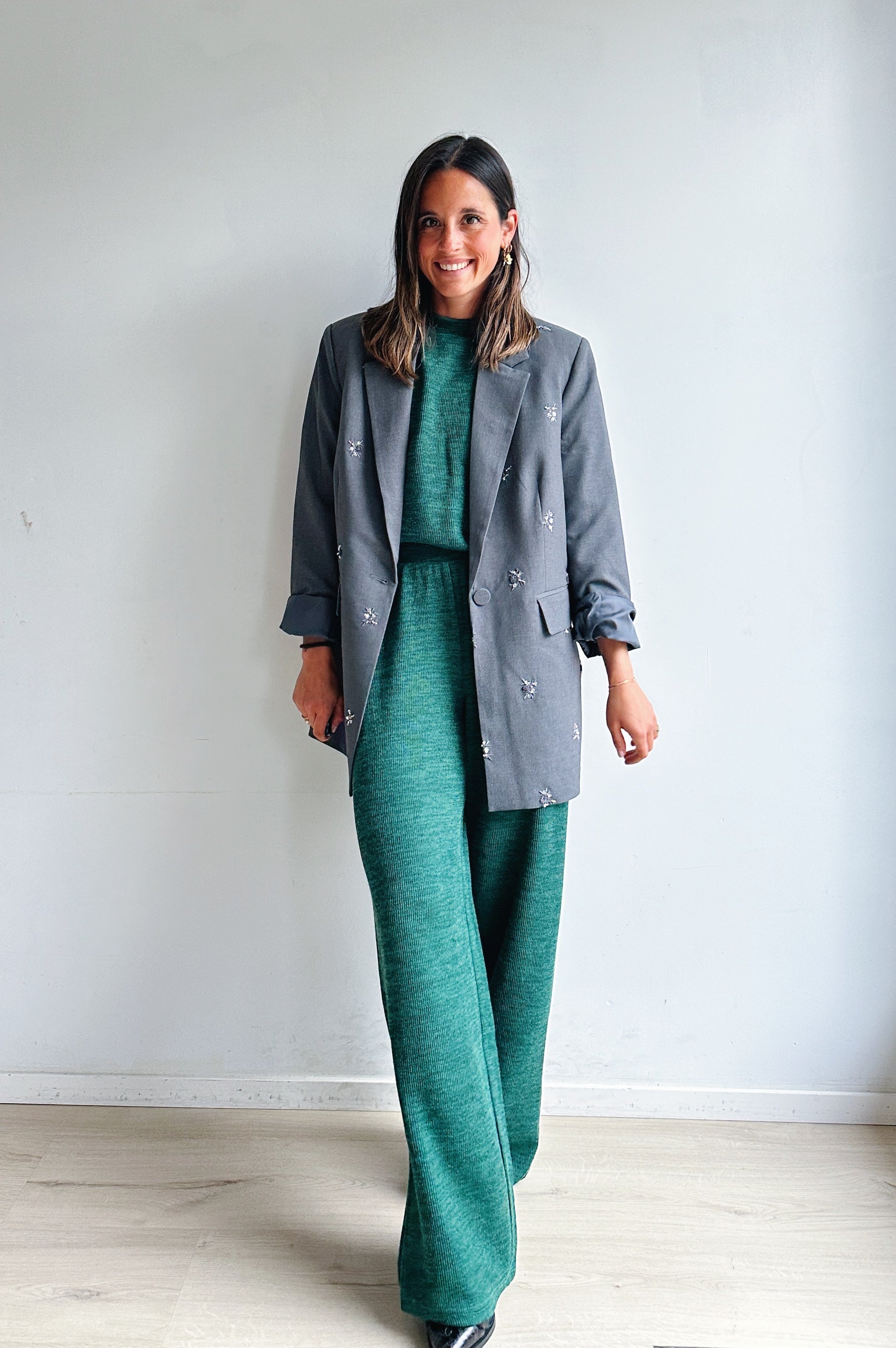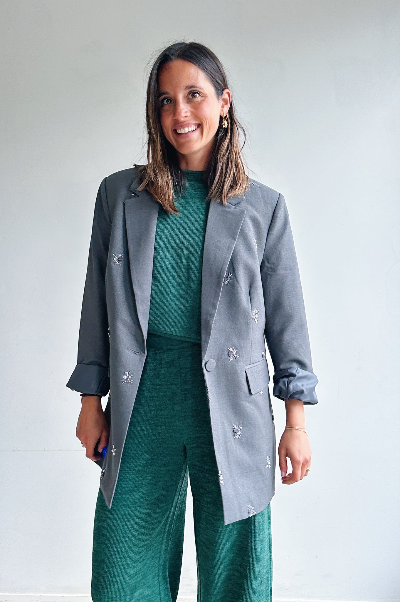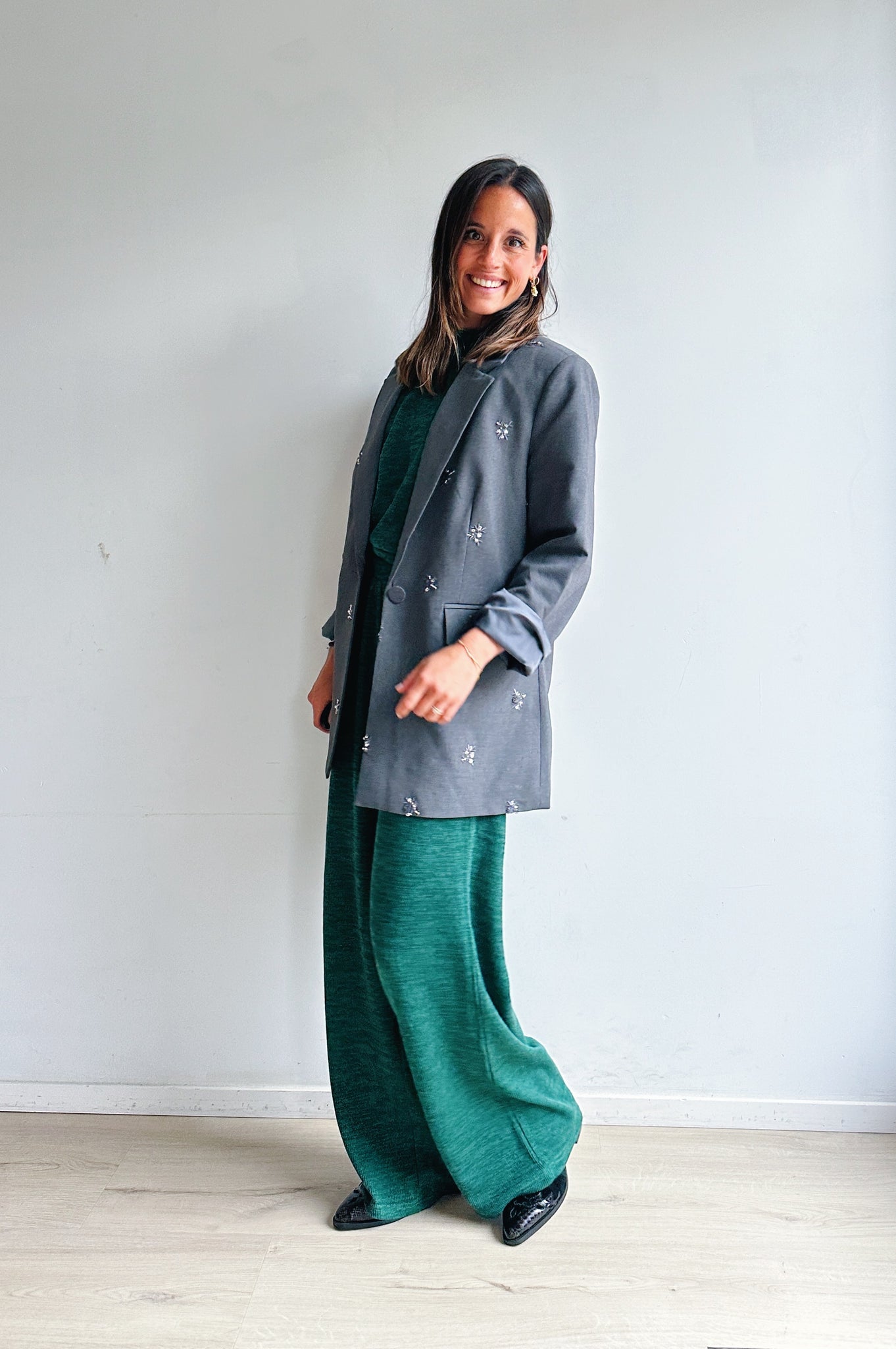 Maak kennis met de blazer die elke outfit naar een hoger niveau tilt. Deze grijze blazer combineert tijdloze klasse met een speelse twist dankzij de subtiele, glinsterende details die over de stof aan de voorzijde verspreid zijn.