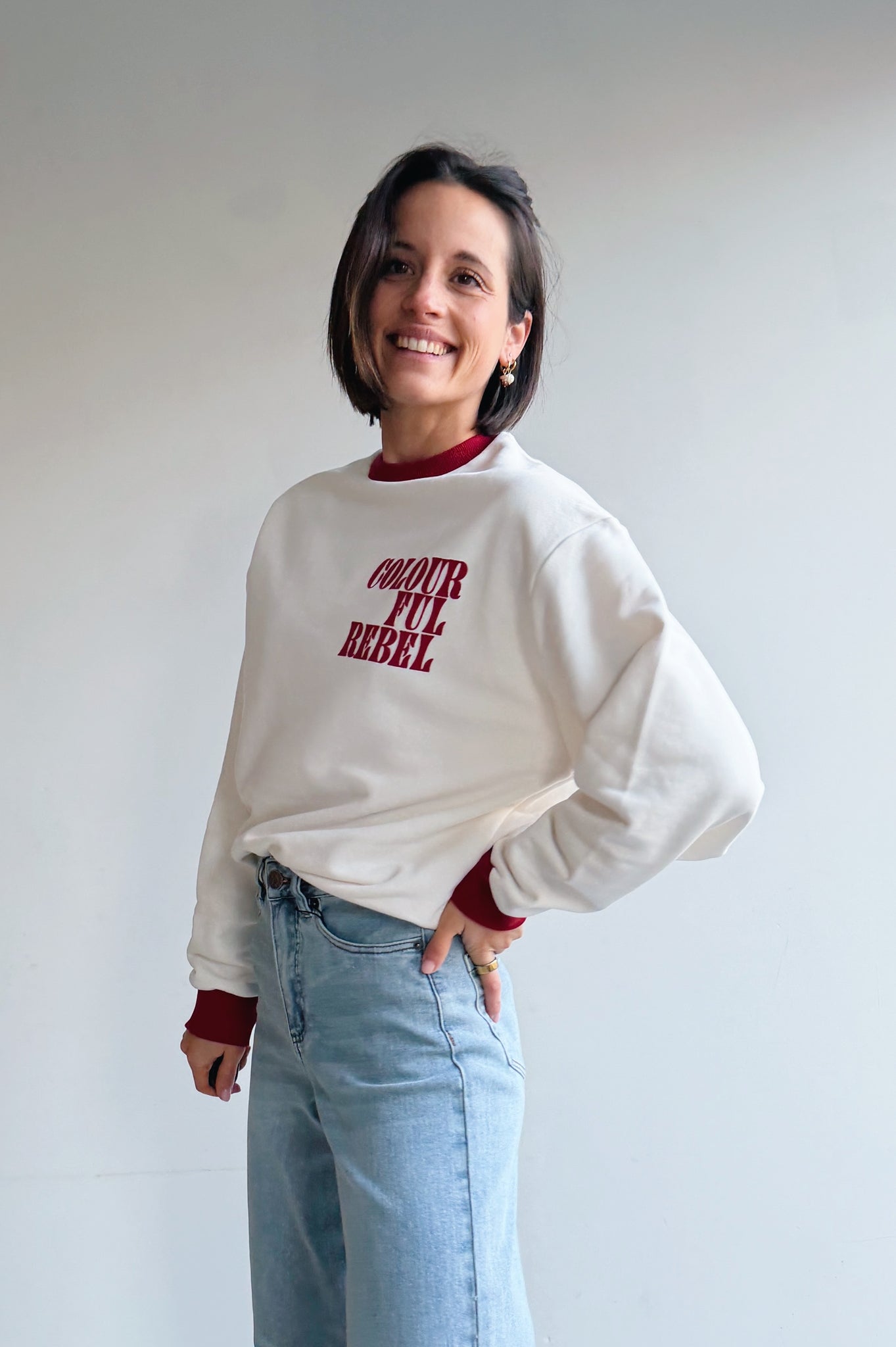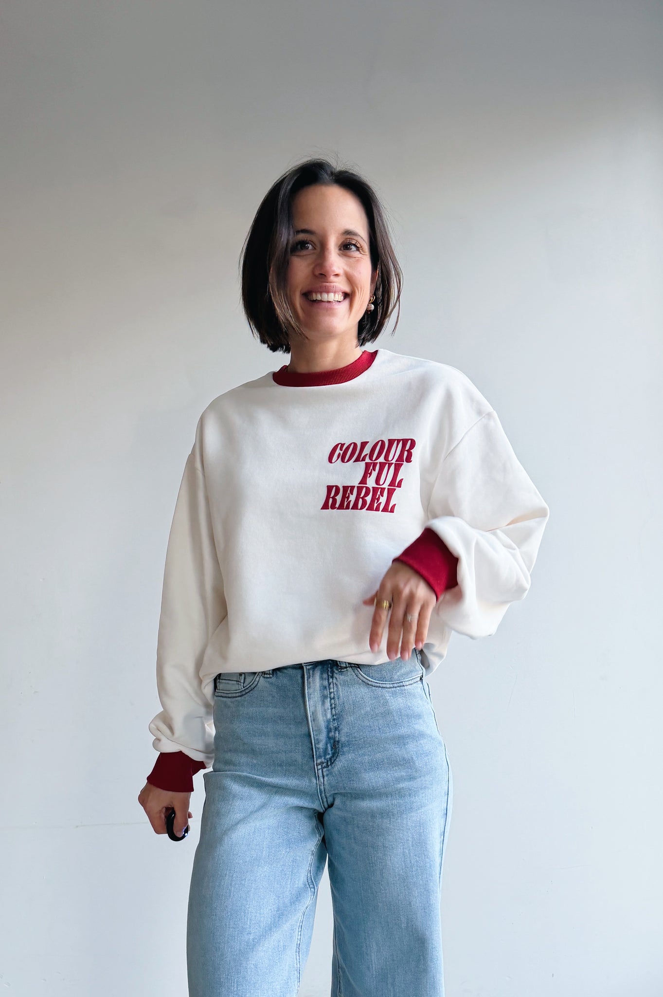 Deze comfortabele sweater combineert een casual fit met een speelse, eigentijdse uitstraling. De off-white basis wordt mooi geaccentueerd door contrasterende rode details aan de hals, manchetten en zoom. Op de borst prijkt het logo “Colourful Rebel”, wat de sweater een stoere en modieuze touch geeft. Dankzij de zachte stof en relaxte pasvorm is dit item ideaal voor dagelijks gebruik. Draag ‘m op een jeans voor een moeiteloze look of combineer met een rok voor een trendy contrast.