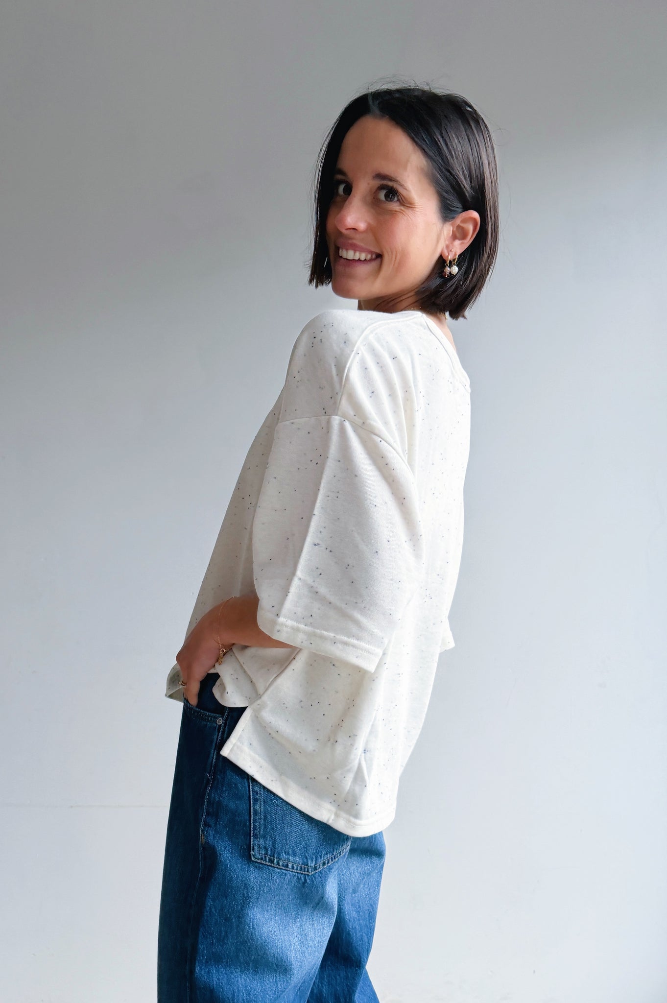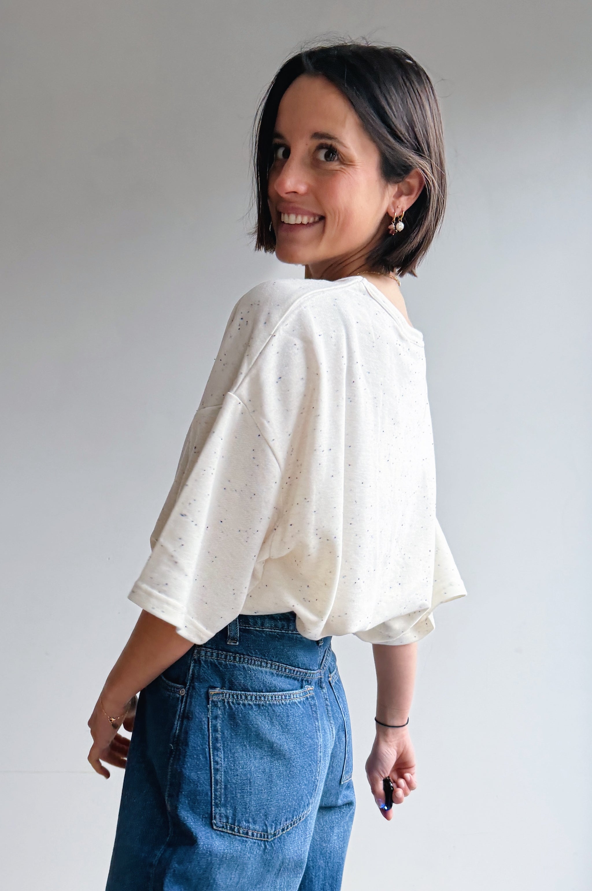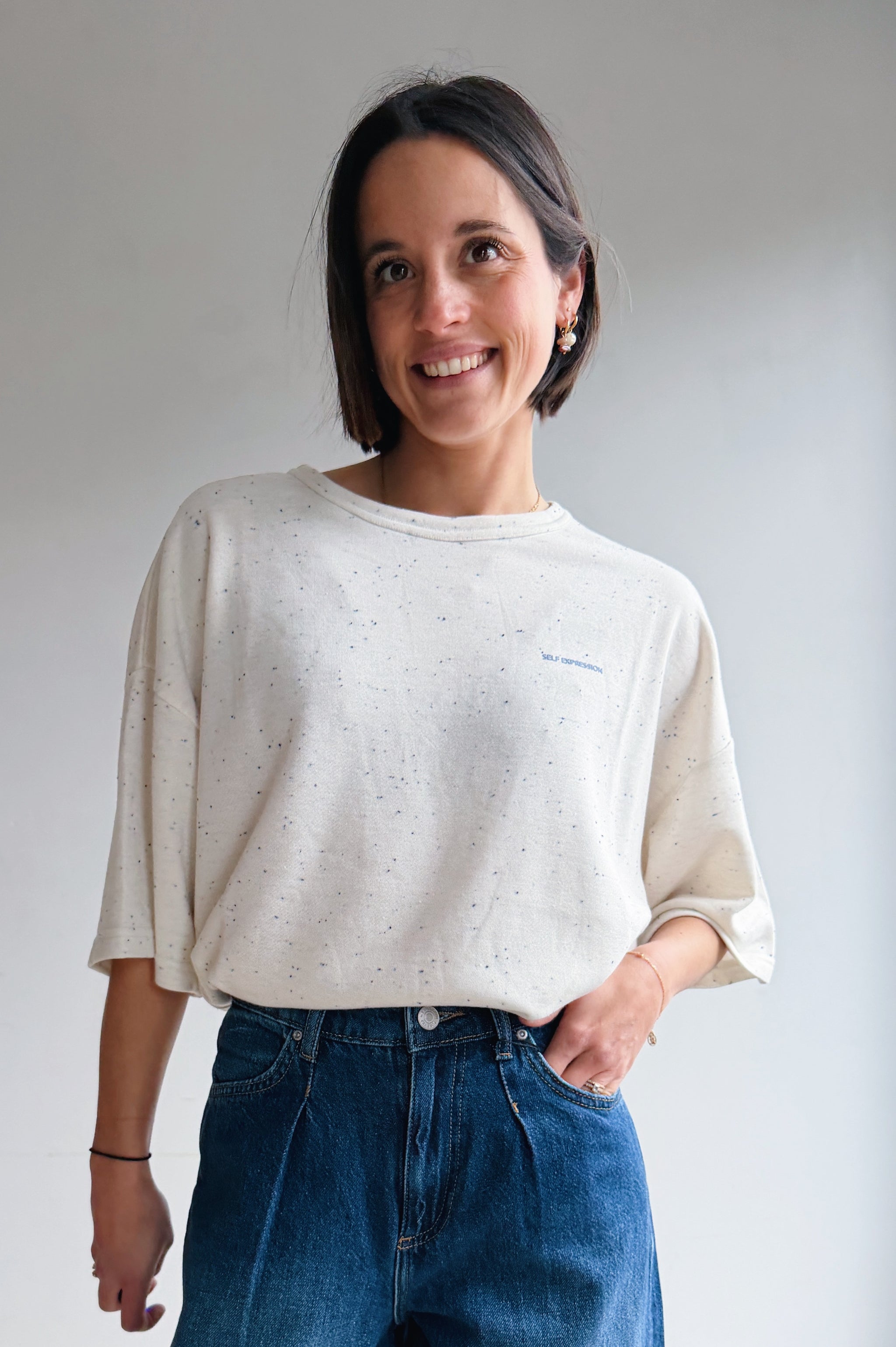deze t-shirt is zo’n fijne basic met nét dat beetje extra. De subtiele blauwe spikkel in de stof geeft ’m een speelse, rustige uitstraling en maakt ’m net interessanter dan een standaard wit shirt. De fit is relaxed en valt mooi los, waardoor hij super comfortabel draagt.