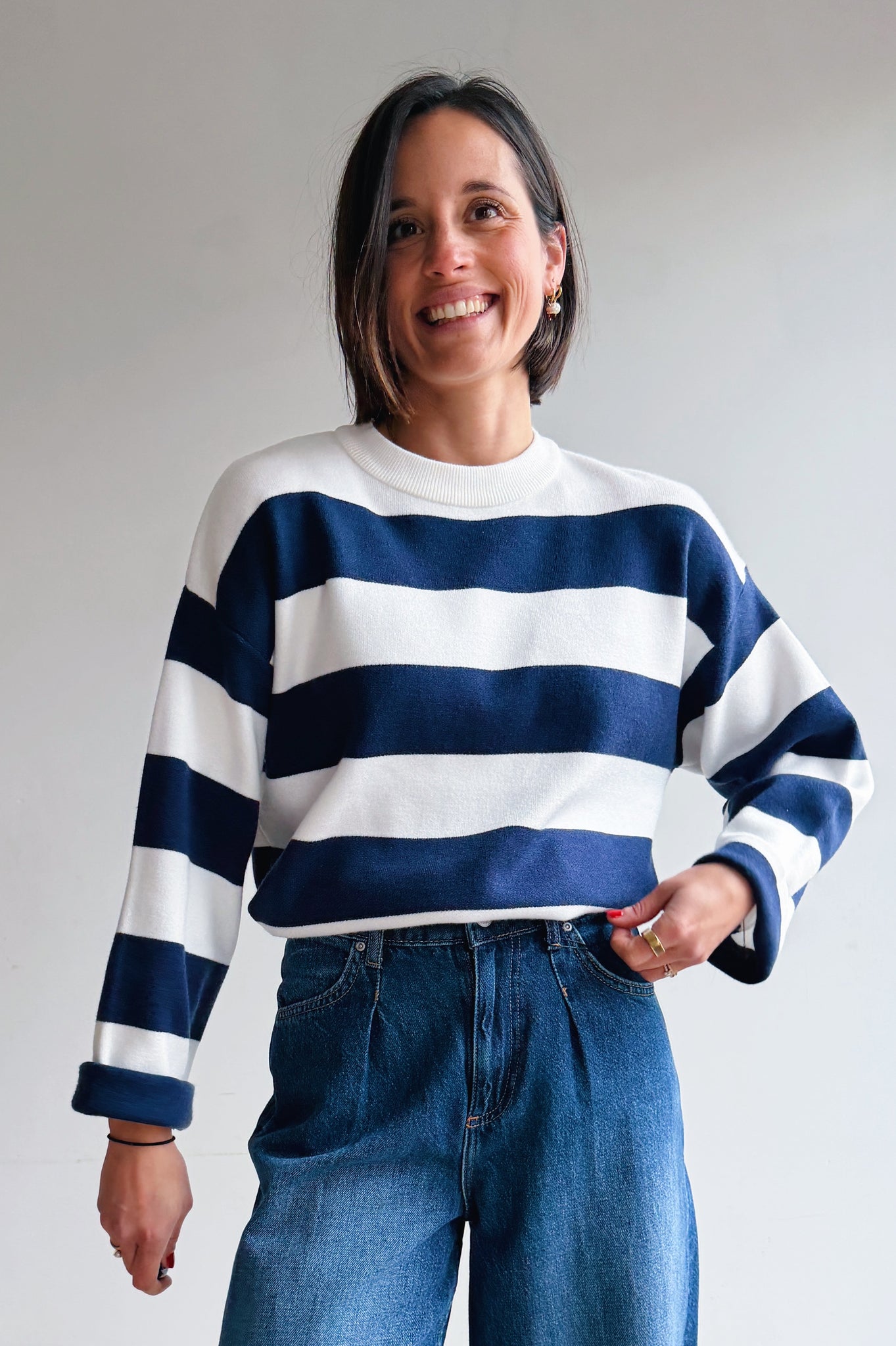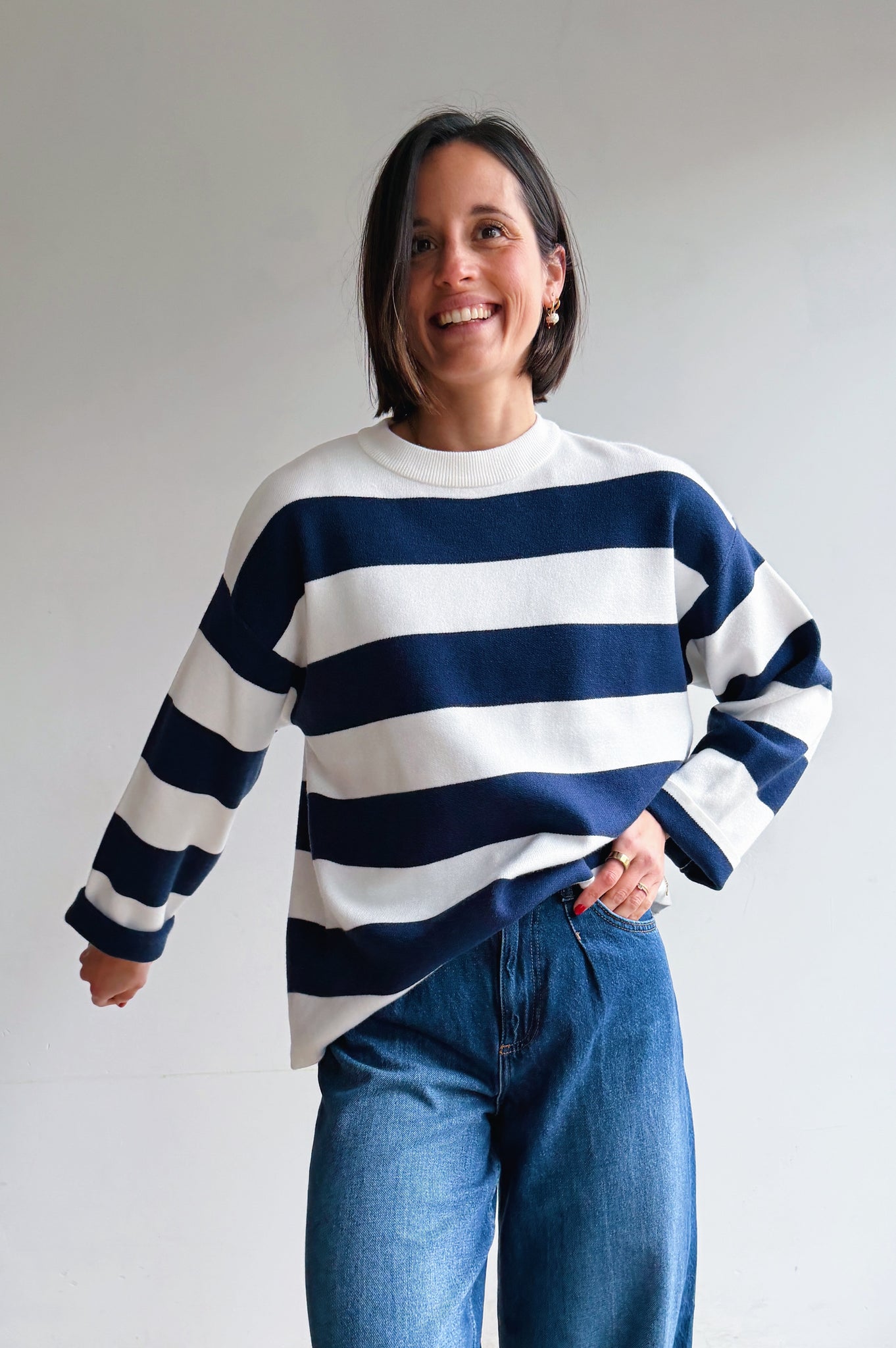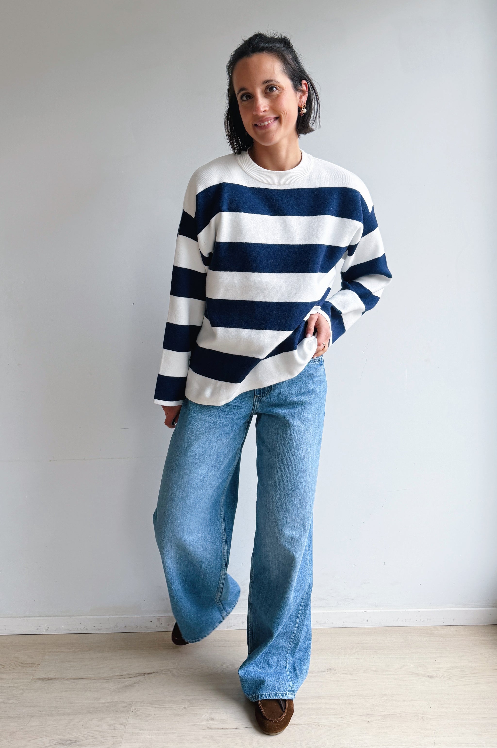 Deze gestreepte pull is een tijdloze essential met een frisse, moderne uitstraling. De brede blauw & witte strepen geven een speels maar elegant contrast, terwijl de rechte, losse pasvorm zorgt voor een ontspannen en comfortabele look. De extreem zachte knit voelt aangenaam aan op de huid en maakt deze trui ideaal voor dagelijks gebruik. Dankzij de ronde hals en iets langere mouwen is hij makkelijk te combineren met een jeans voor een casual outfit of met een geklede broek voor een meer verfijnde uitstraling. Een veelzijdig stuk dat moeiteloos past in elk seizoen en elke garderobe.