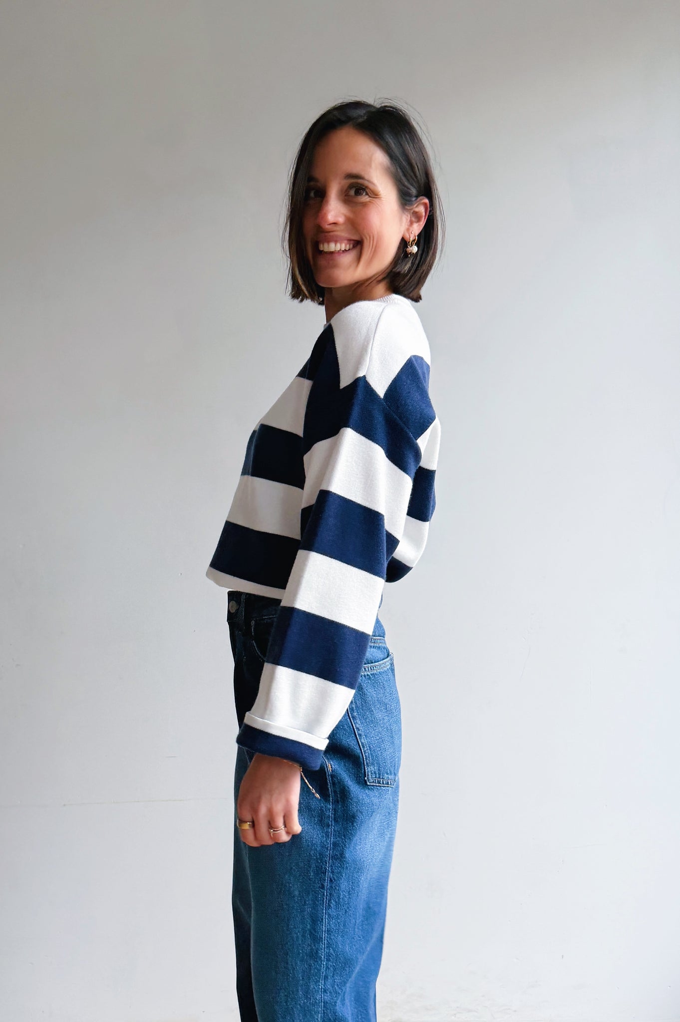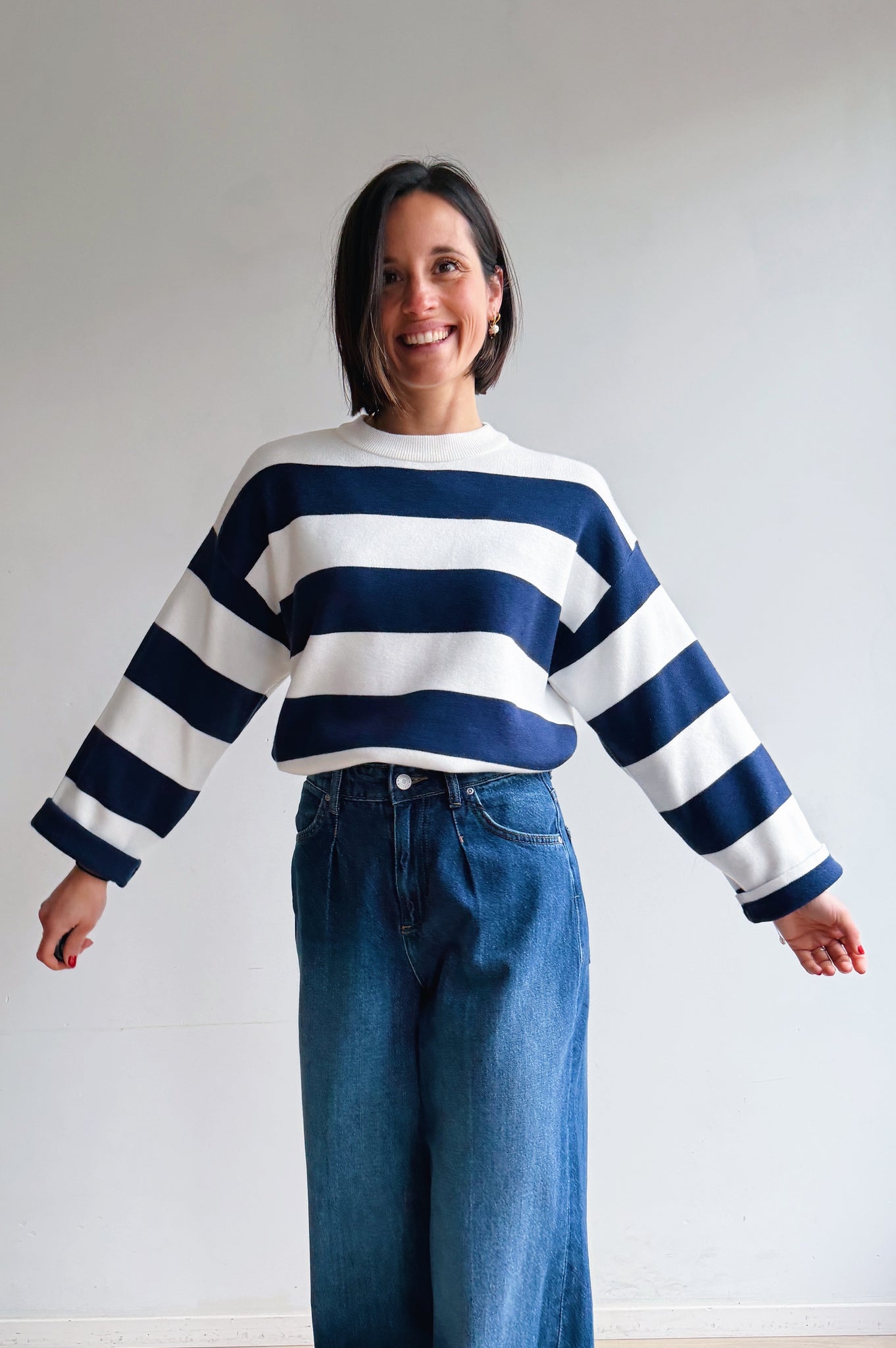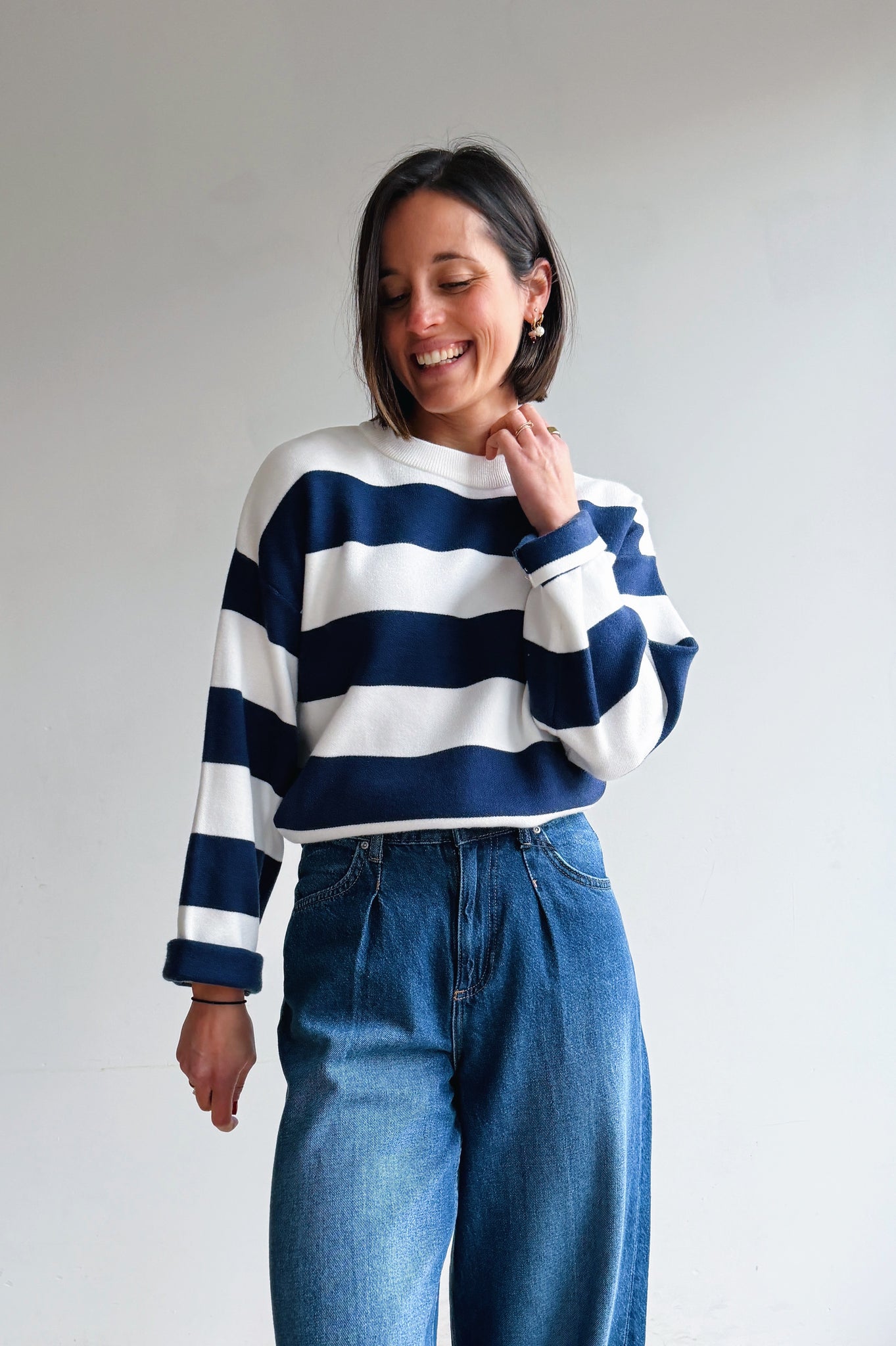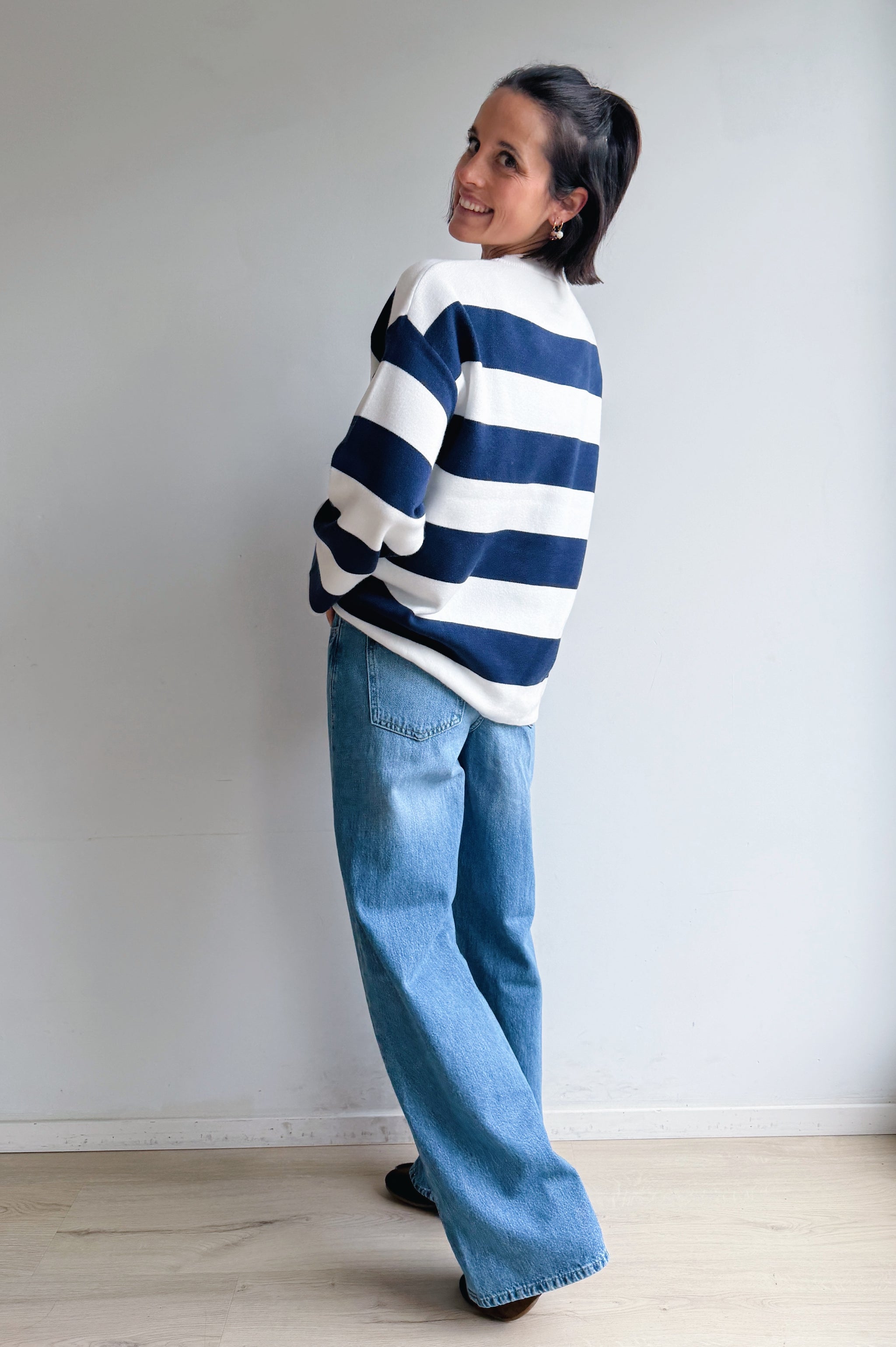 Deze gestreepte pull is een tijdloze essential met een frisse, moderne uitstraling. De brede blauw & witte strepen geven een speels maar elegant contrast, terwijl de rechte, losse pasvorm zorgt voor een ontspannen en comfortabele look. De extreem zachte knit voelt aangenaam aan op de huid en maakt deze trui ideaal voor dagelijks gebruik. Dankzij de ronde hals en iets langere mouwen is hij makkelijk te combineren met een jeans voor een casual outfit of met een geklede broek voor een meer verfijnde uitstraling. Een veelzijdig stuk dat moeiteloos past in elk seizoen en elke garderobe.