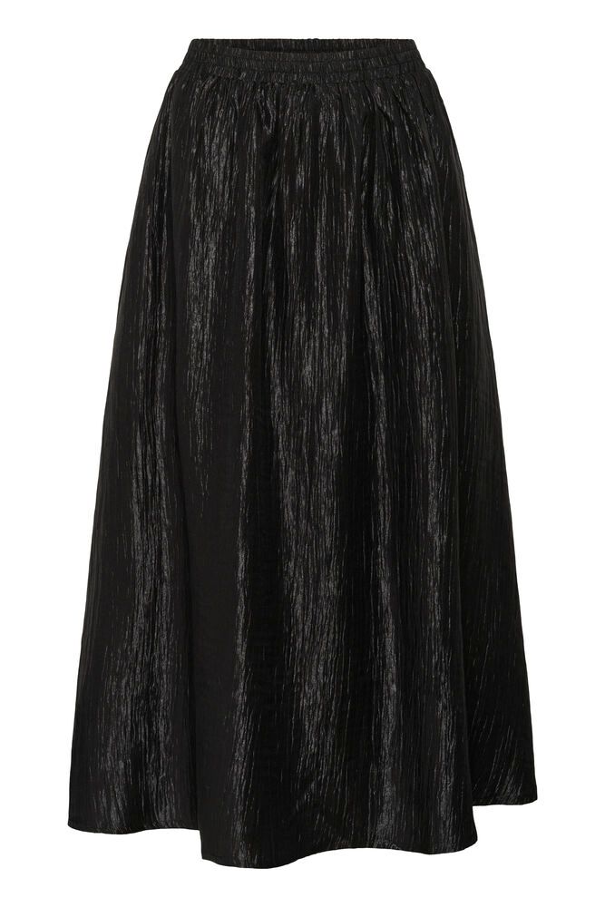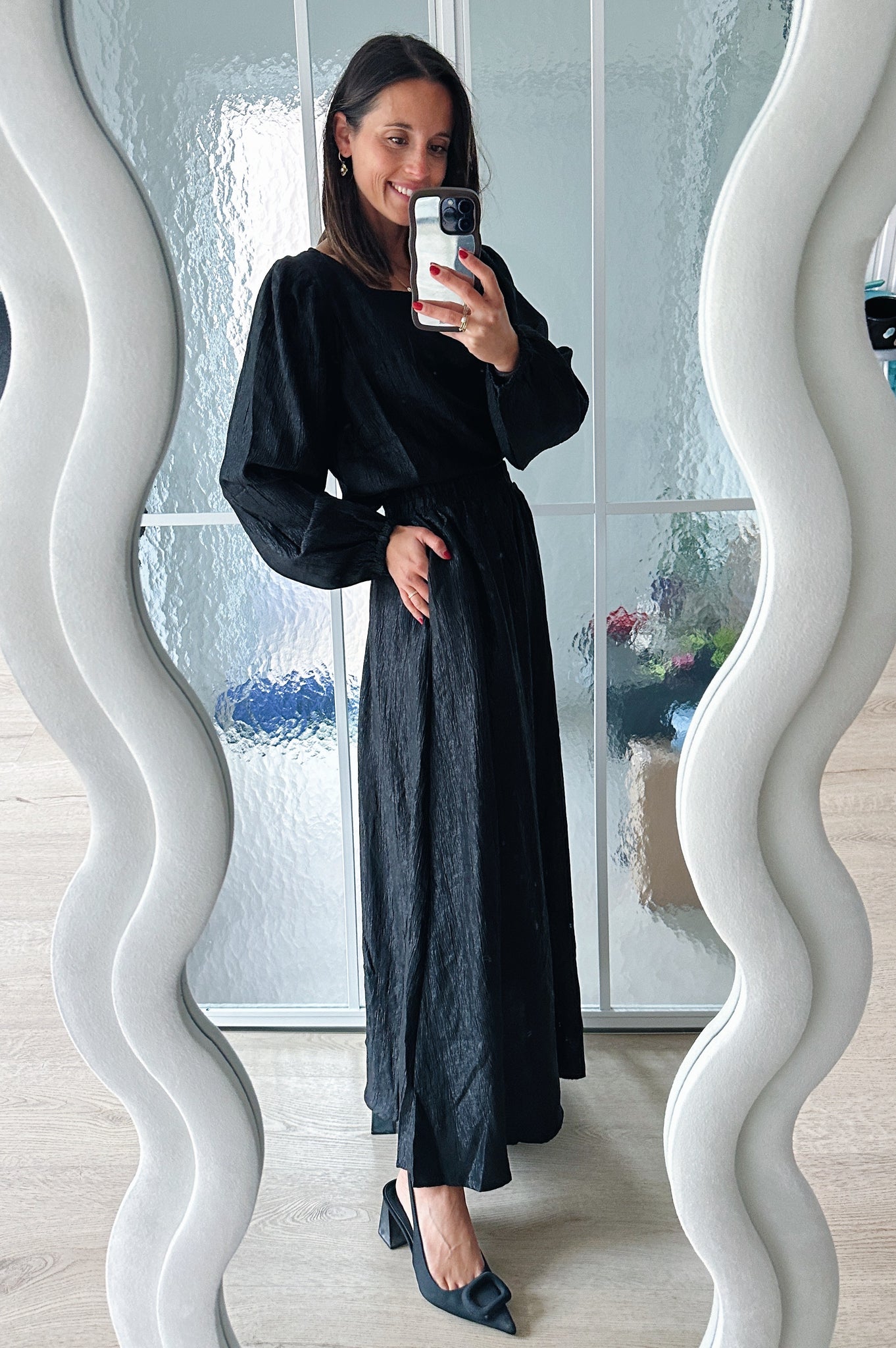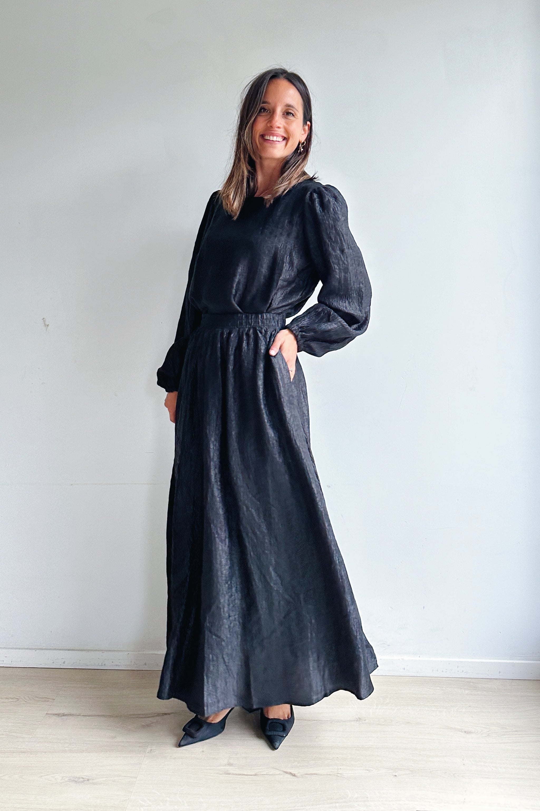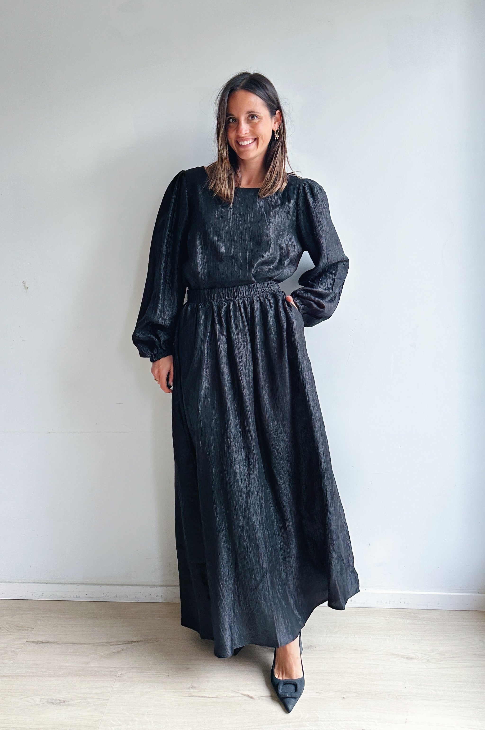 Deze zwarte set bestaat uit een luchtige top en een vloeiende maxi-rok — samen vormen ze een elegante, tijdloze combinatie met een moderne twist. De subtiele glans in de stof geeft de set een verfijnde uitstraling, terwijl de lichte structuur zorgt voor een mooie, natuurlijke beweging bij elke stap.