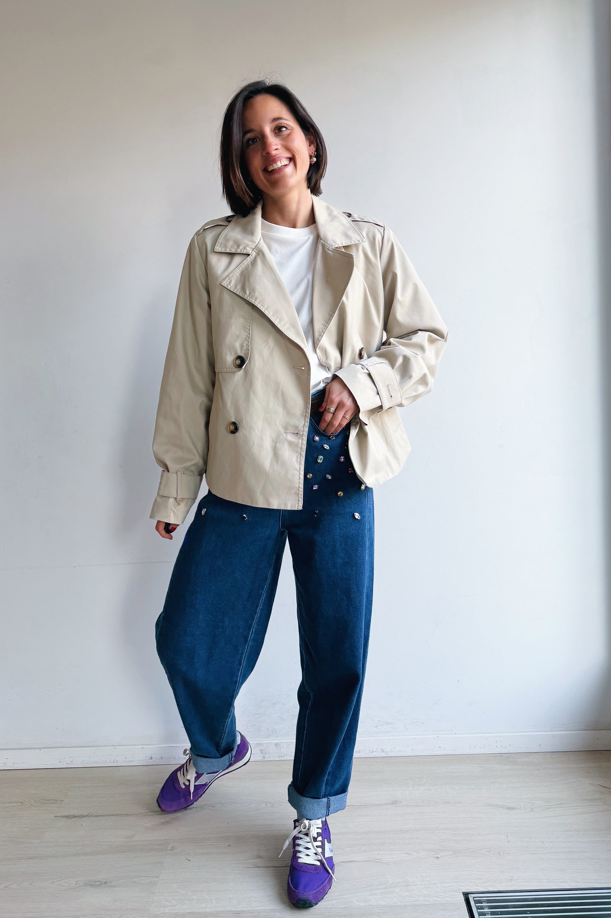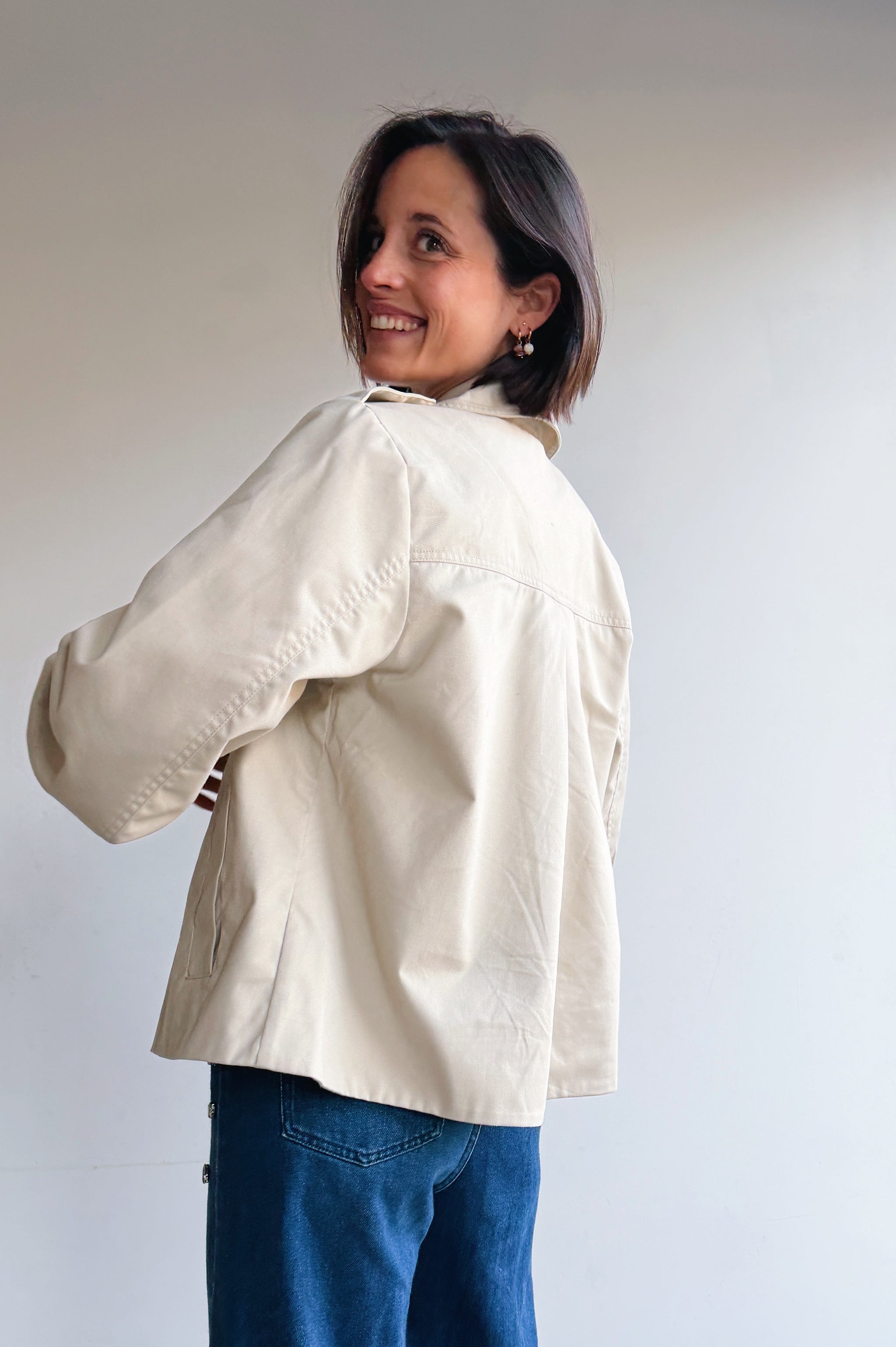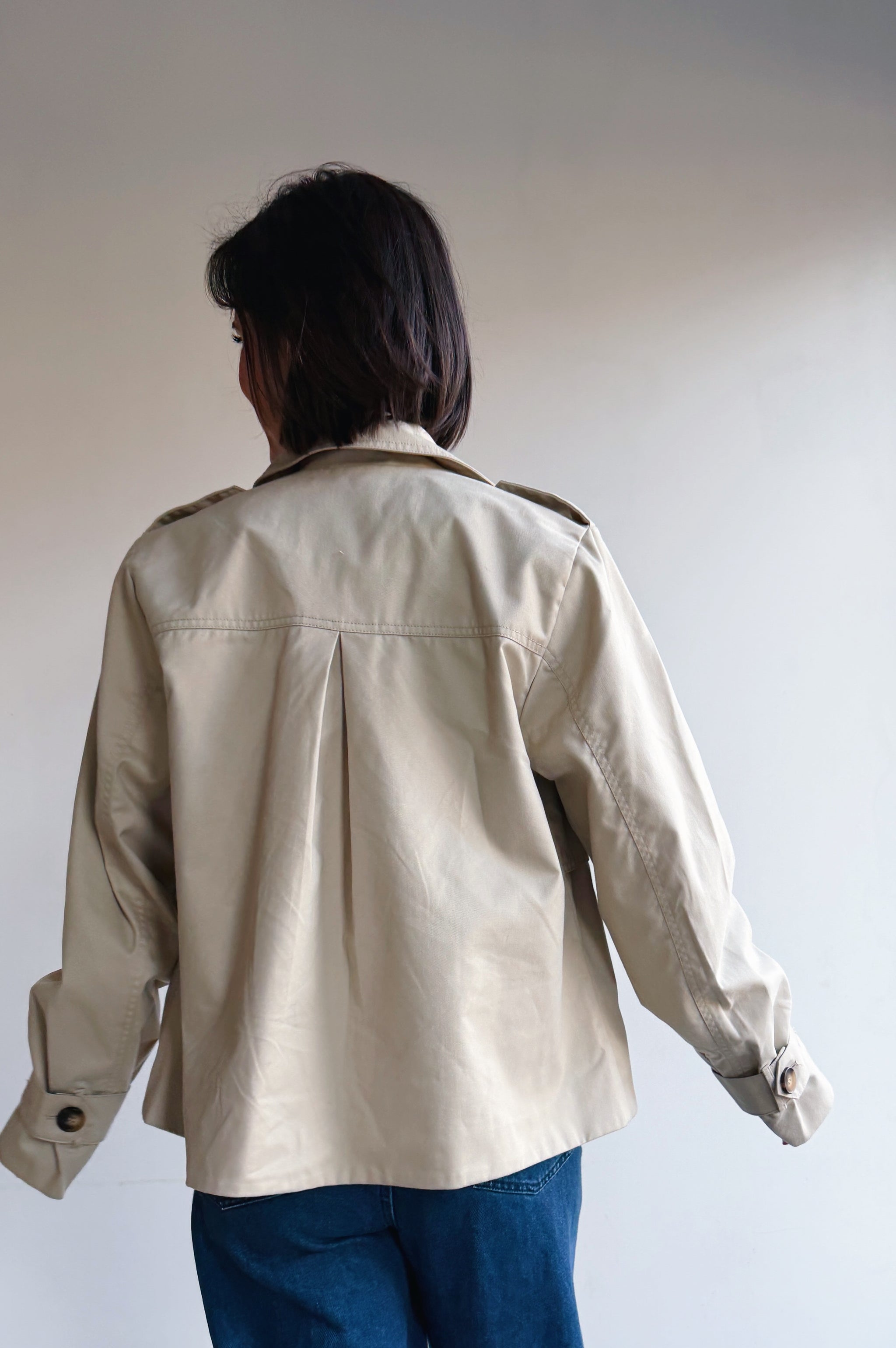 De korte trenchcoat is écht mijn favorietje! Korte dubbelrijige jas met een oversized silhouet, brede revers en knoopdetails op de schouders en manchetten. Voorzien van een gladde, gestructureerde uitstraling en verlaagde schoudernaden voor een moderne, eigentijdse look.