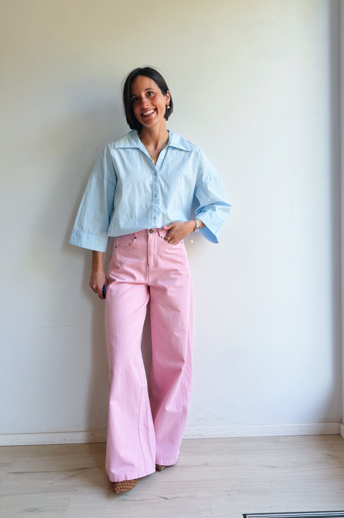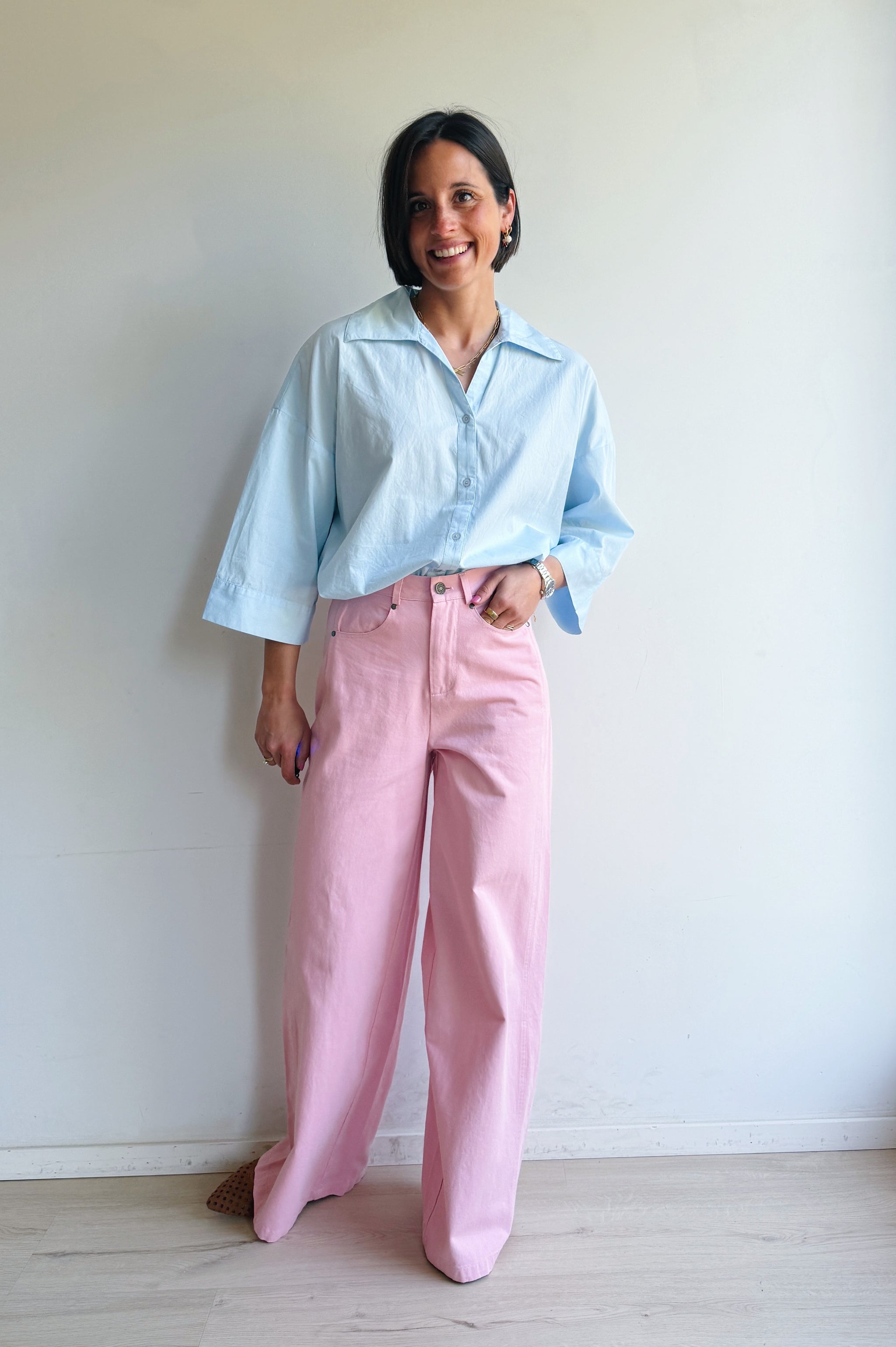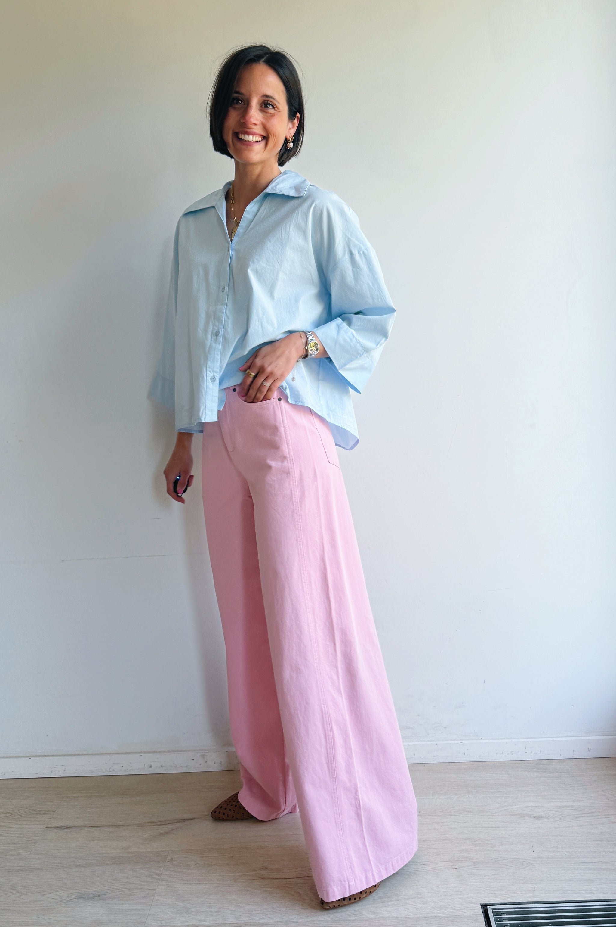 Deze wide leg jeans combineert een tijdloze denimstijl met een frisse, zomerse kleur. De hoge taille en wijde pijpen creëren een flatterend silhouet dat zowel comfortabel als stijlvol aanvoelt.