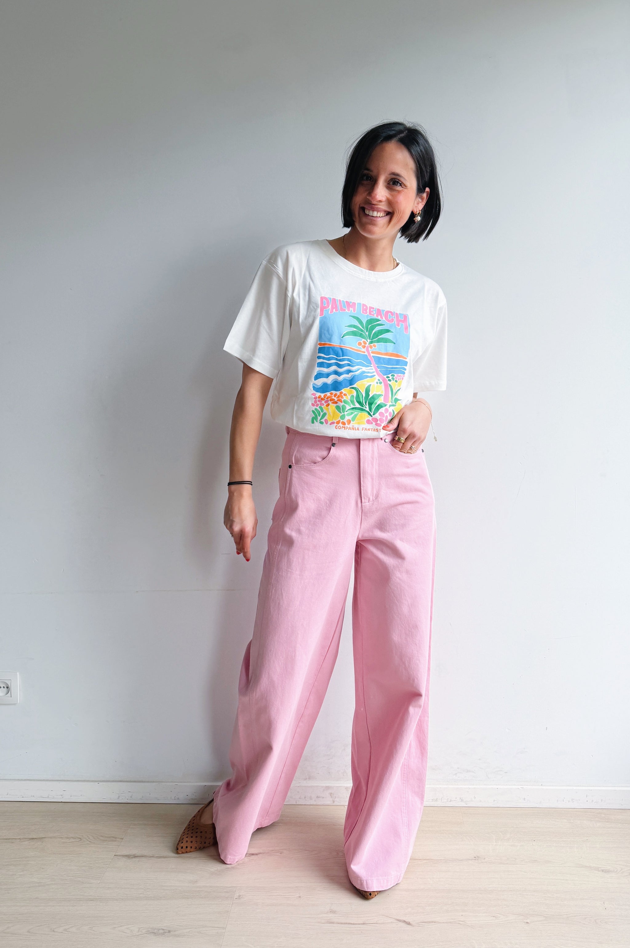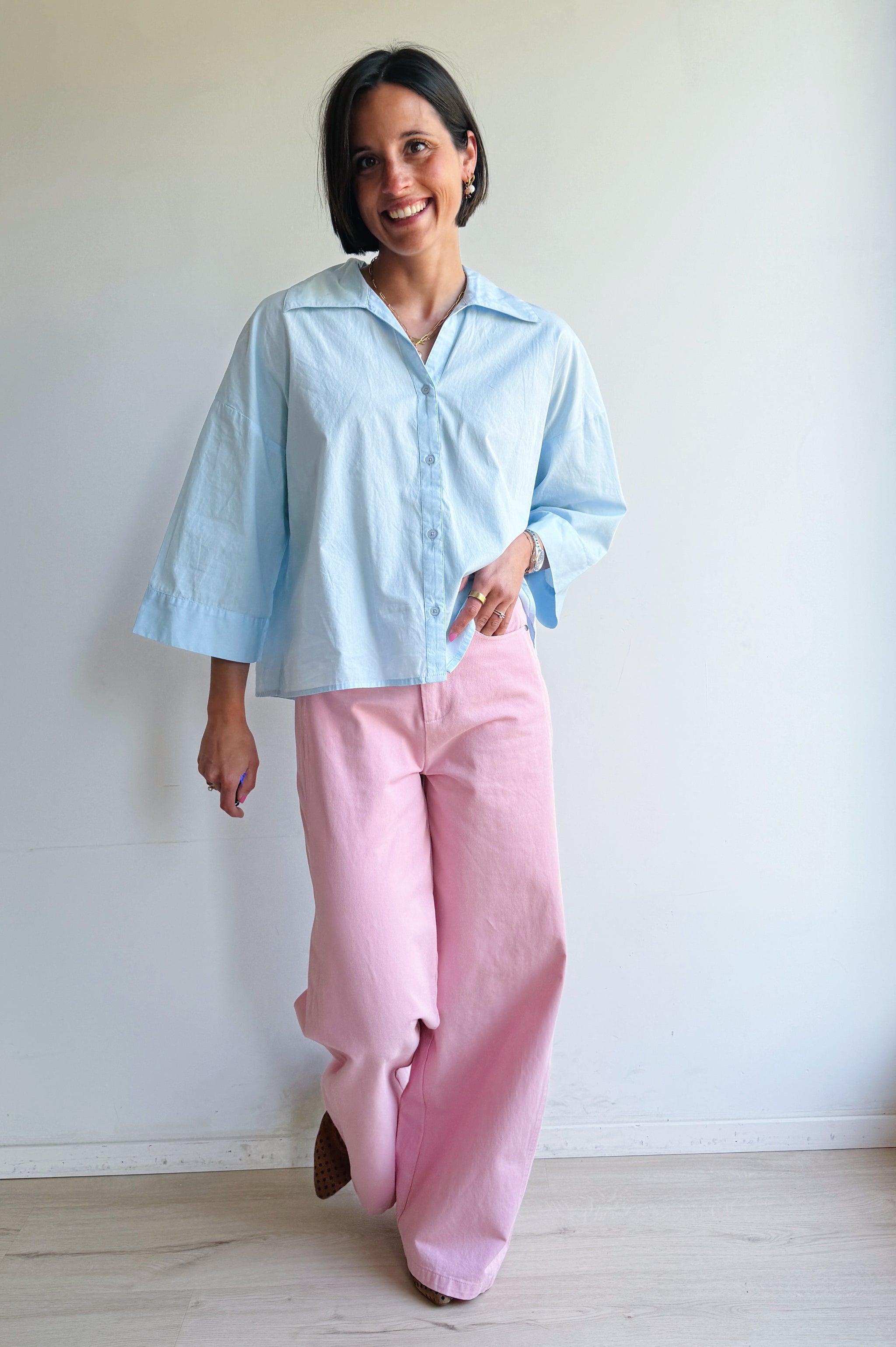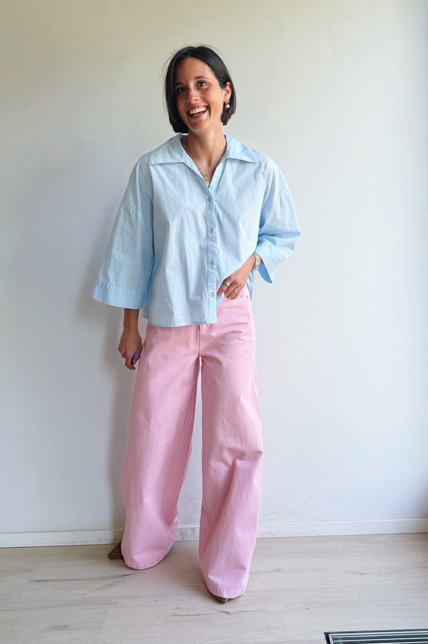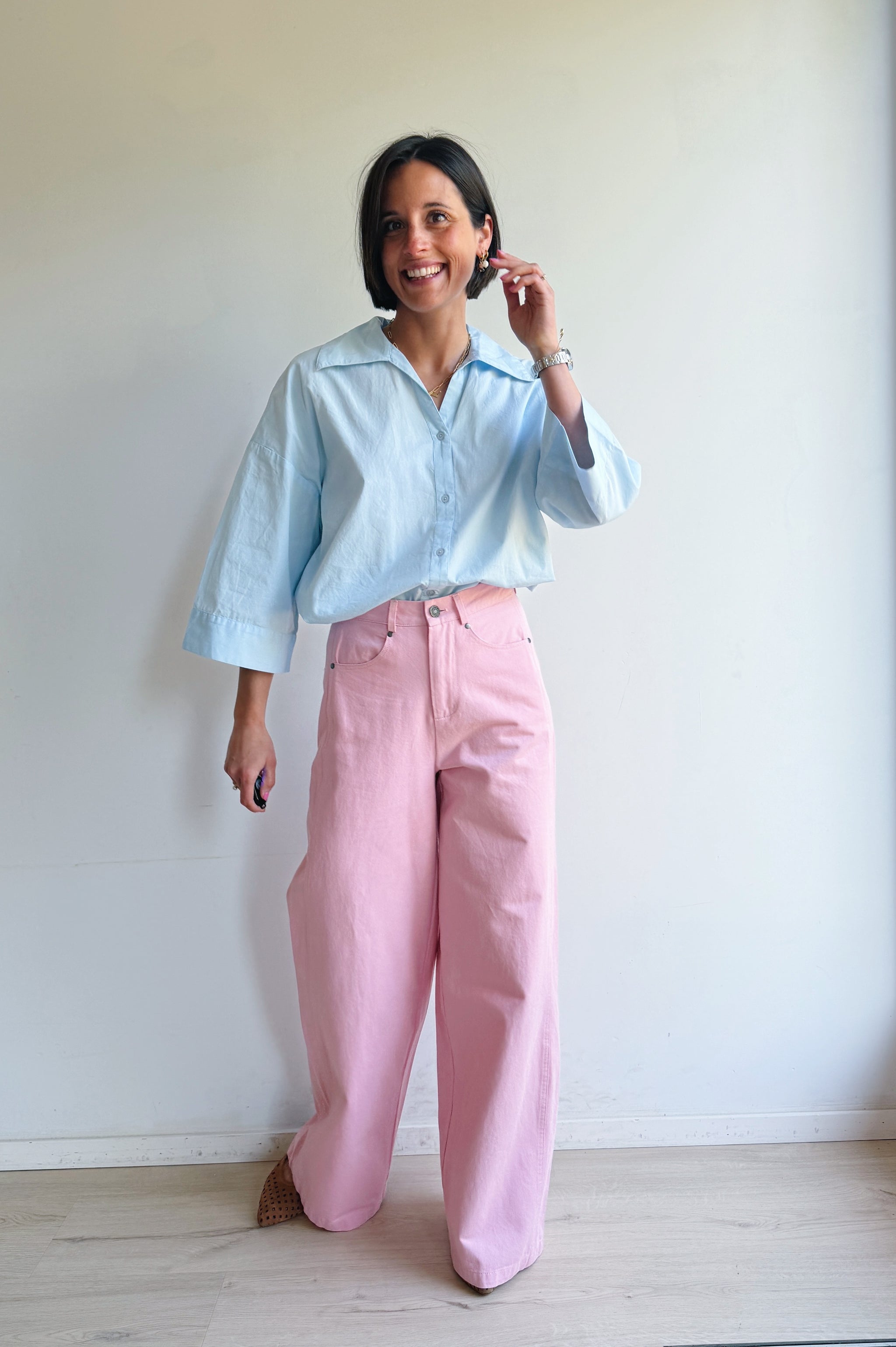 Deze wide leg jeans combineert een tijdloze denimstijl met een frisse, zomerse kleur. De hoge taille en wijde pijpen creëren een flatterend silhouet dat zowel comfortabel als stijlvol aanvoelt.