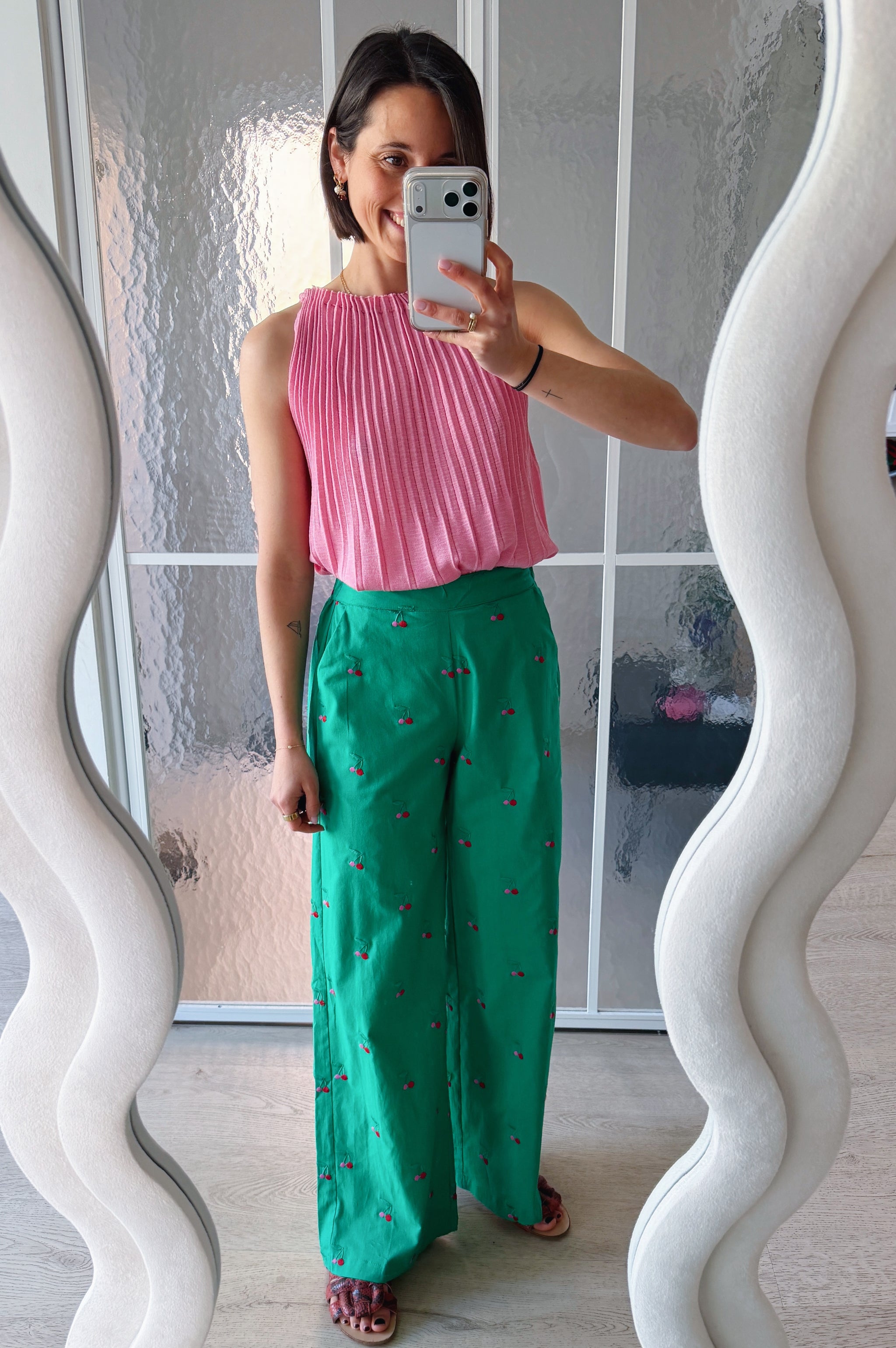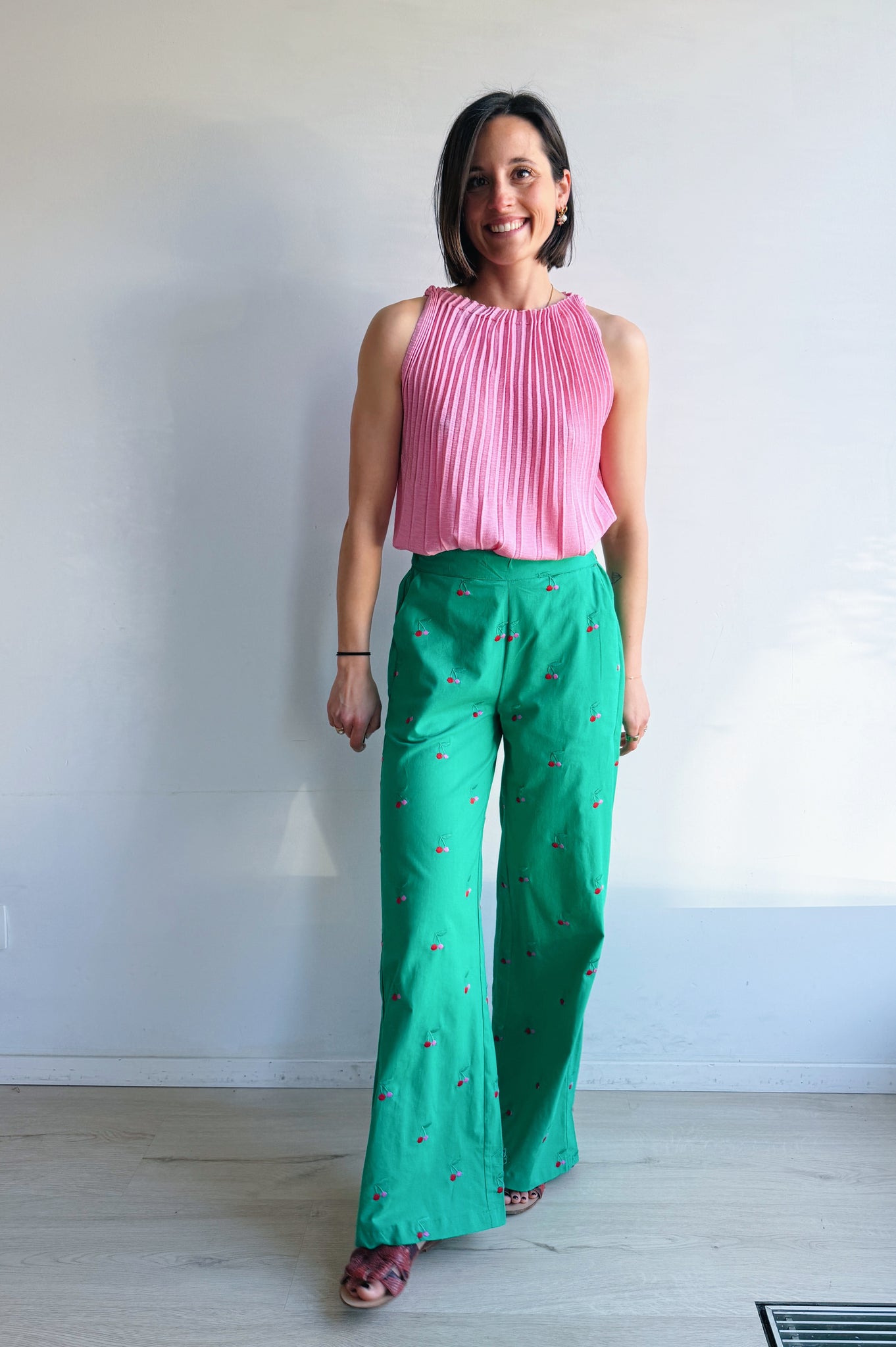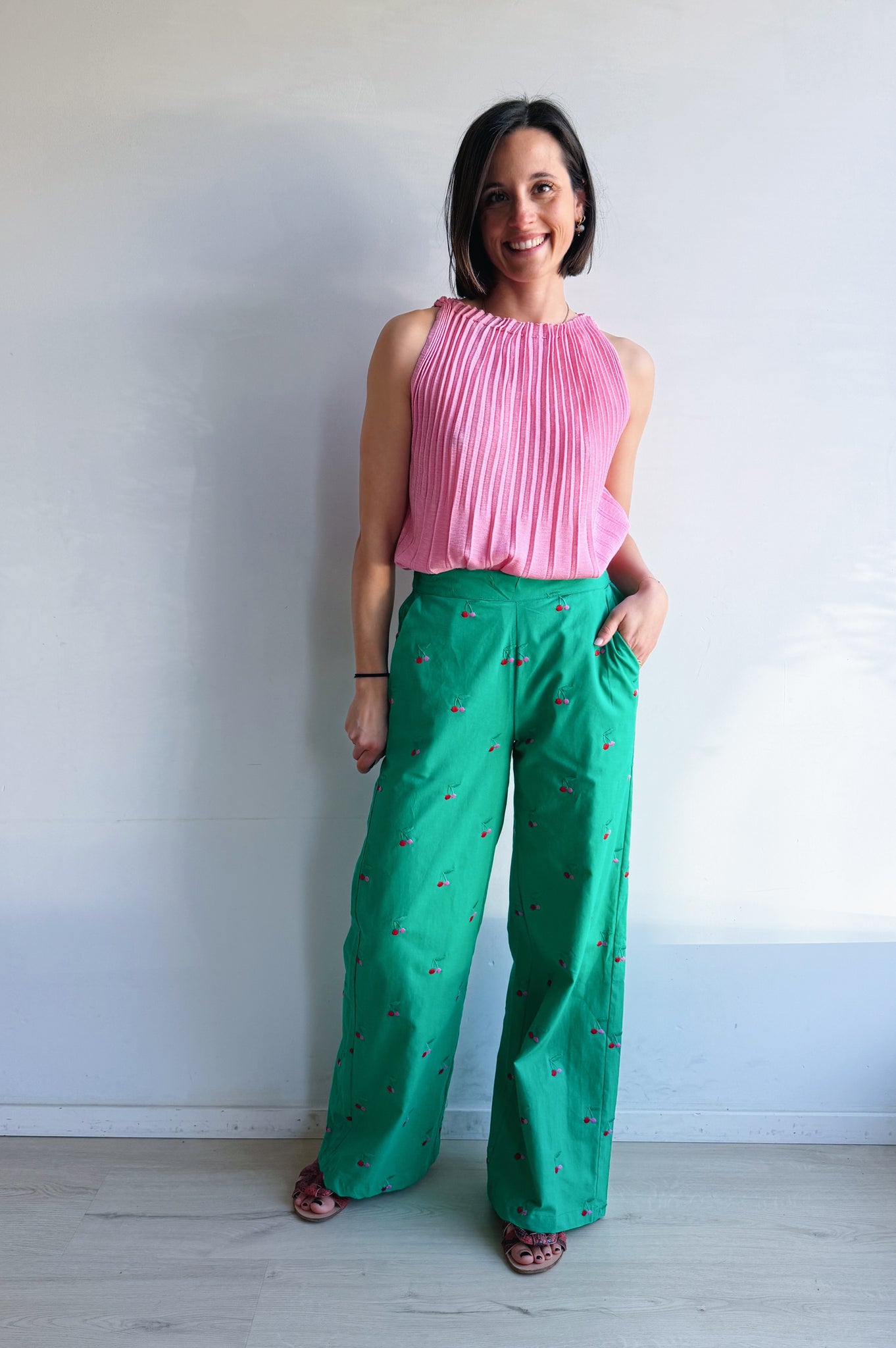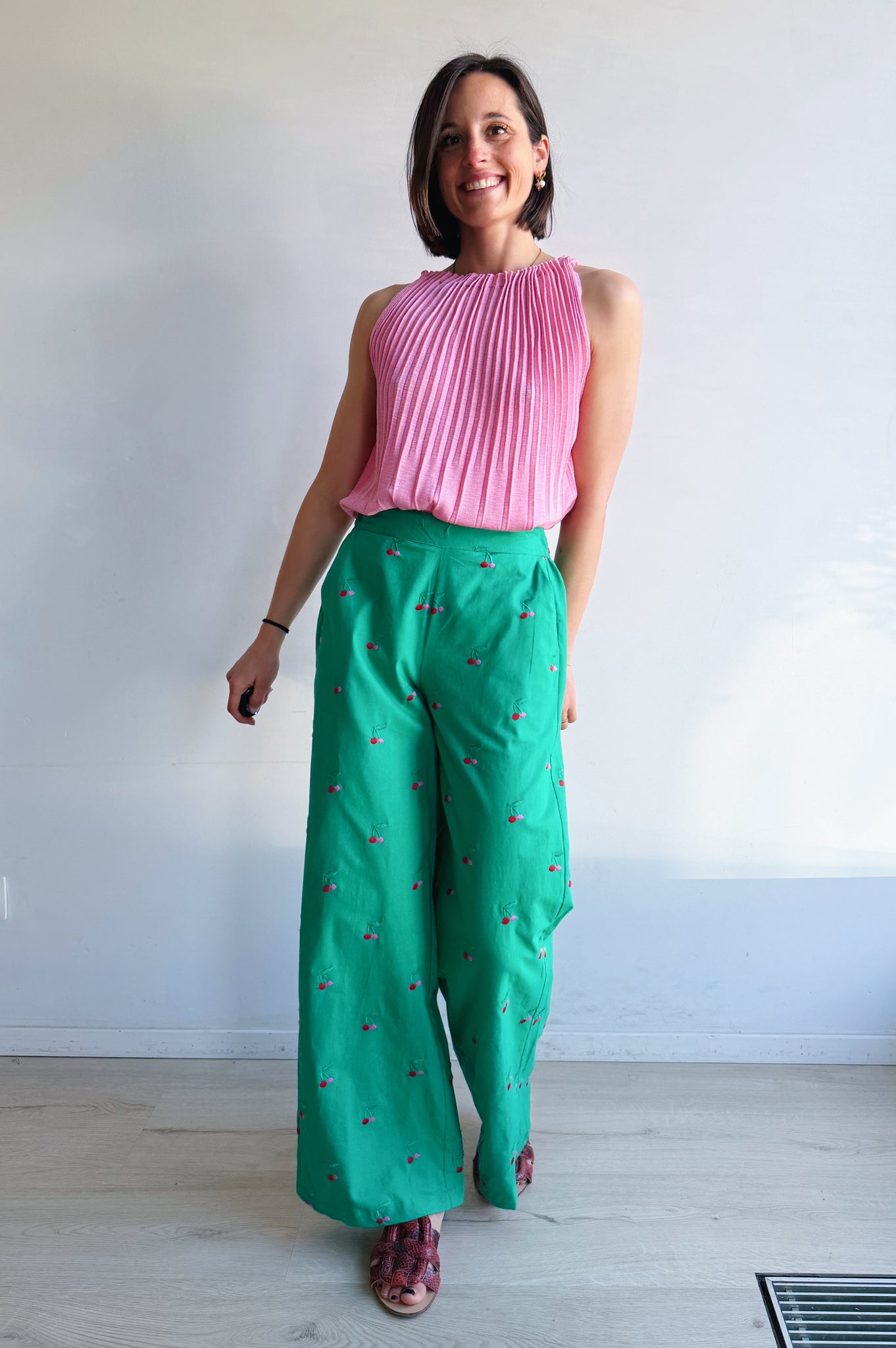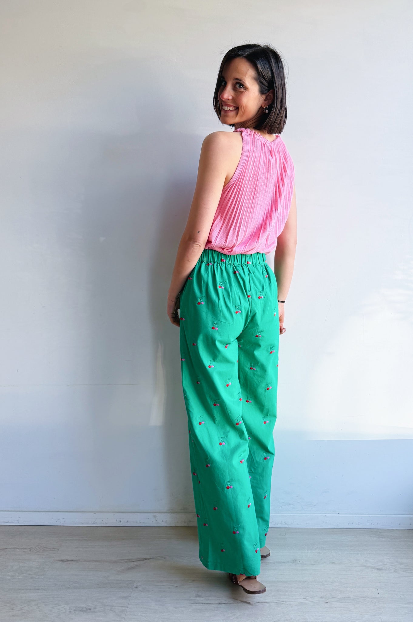 These trousers bring instant cheer to your outfit. The fresh green color combined with small embroidered cherries creates a playful yet sophisticated look.