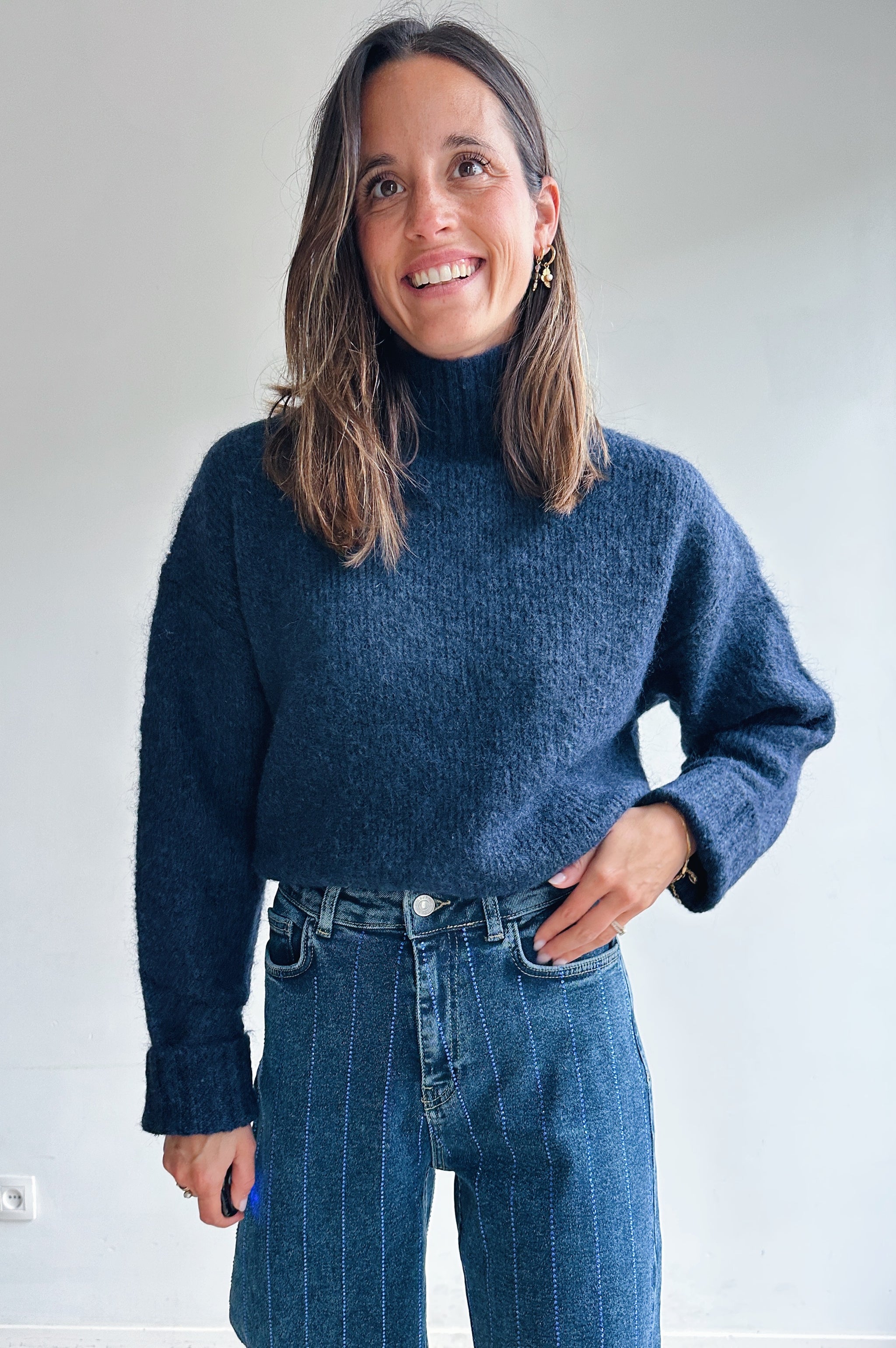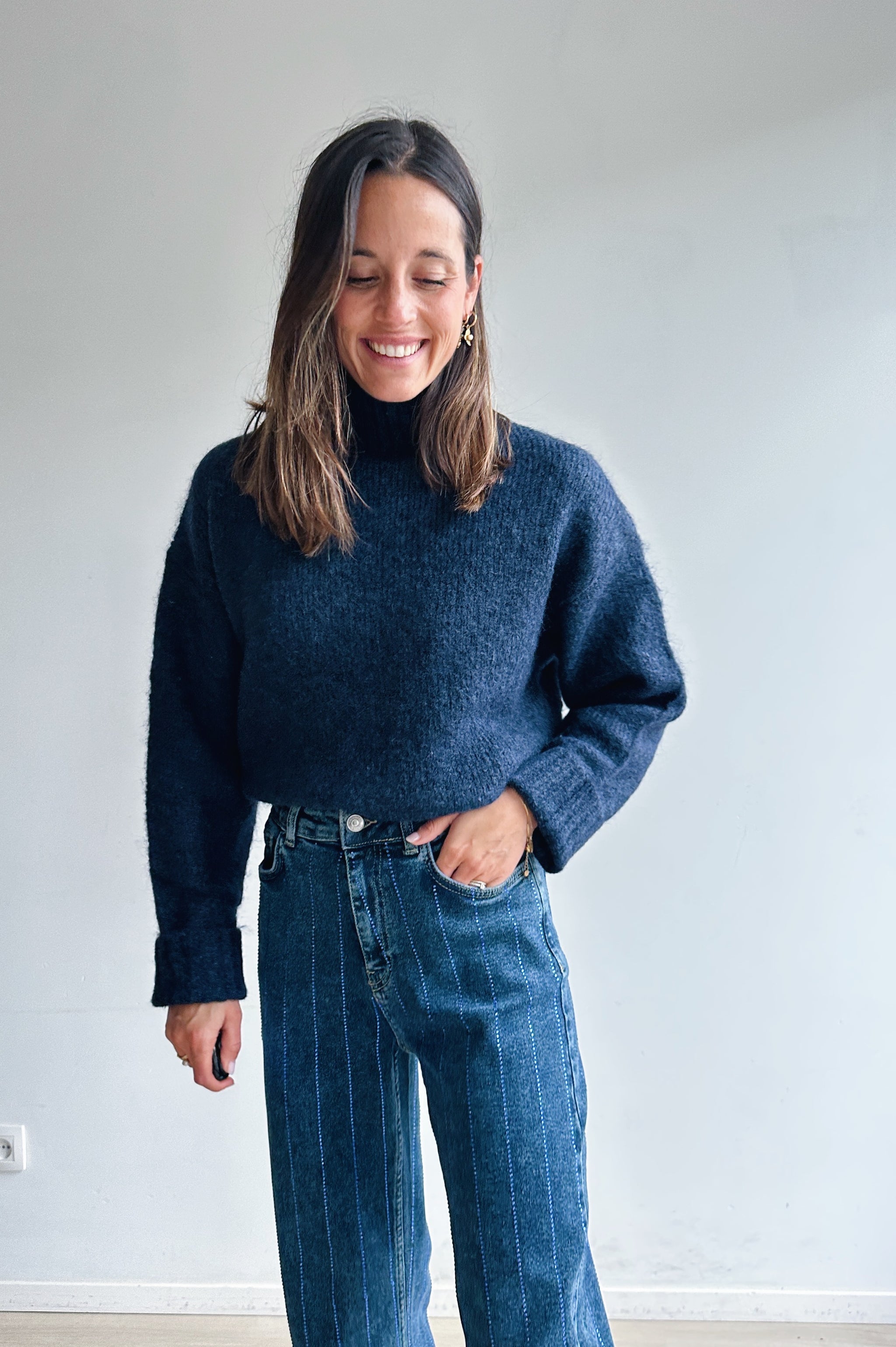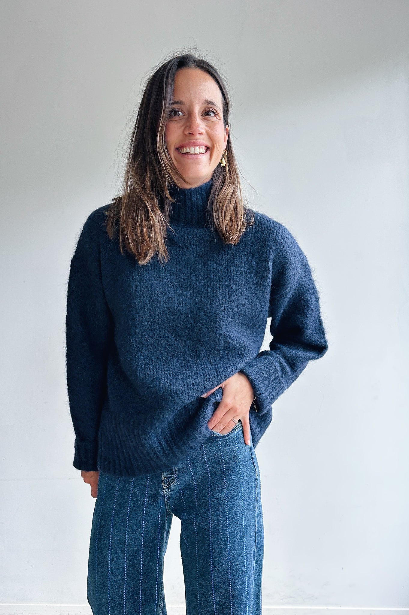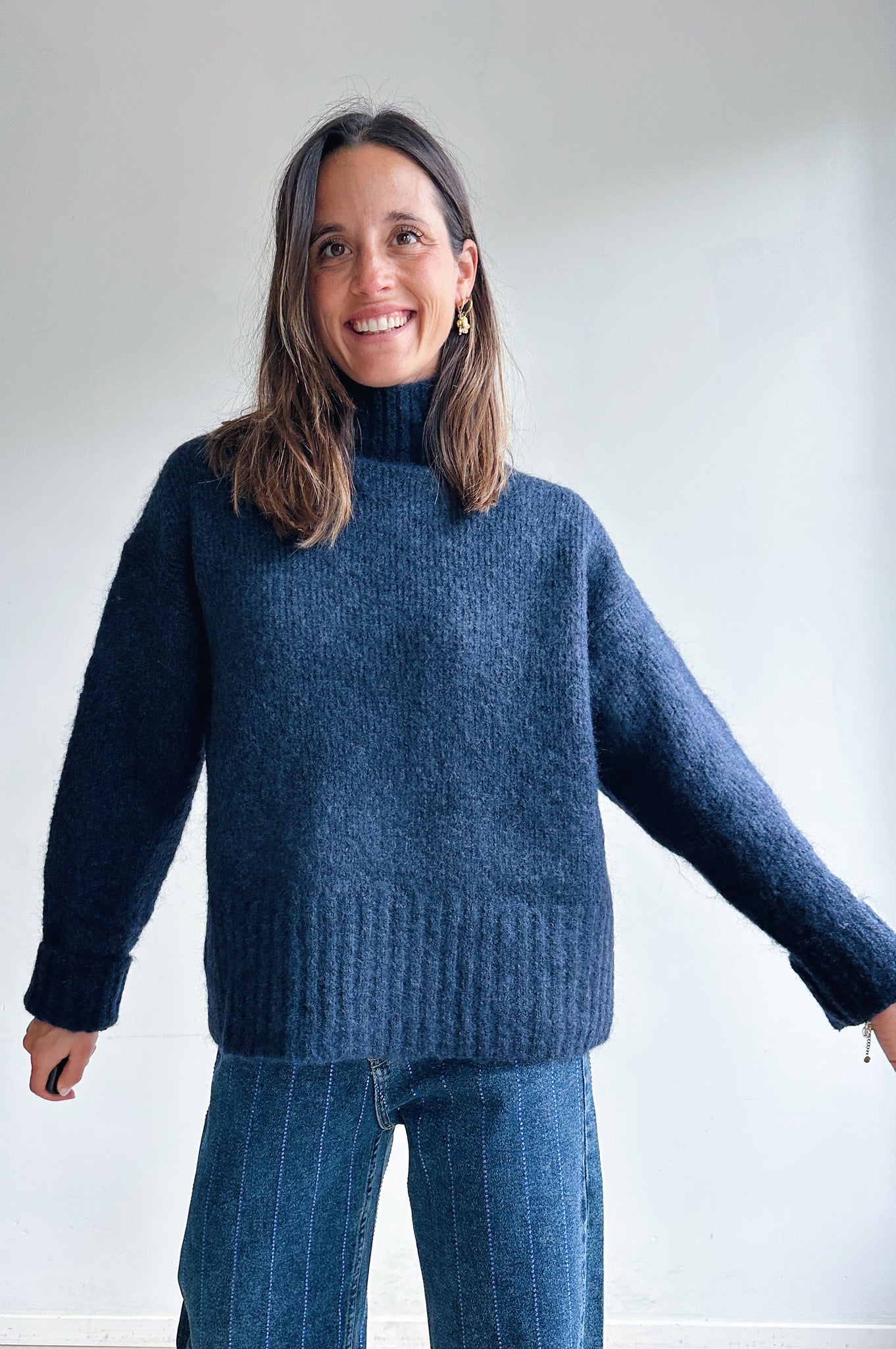 Deze heerlijk coltrui in een warme blauwe tint is het ultieme cosy item voor koude dagen. De trui heeft een rechte, iets losse pasvorm met een hoge col en brede ribboord aan de onderzijde en mouwen voor een stijlvolle, tijdloze look.