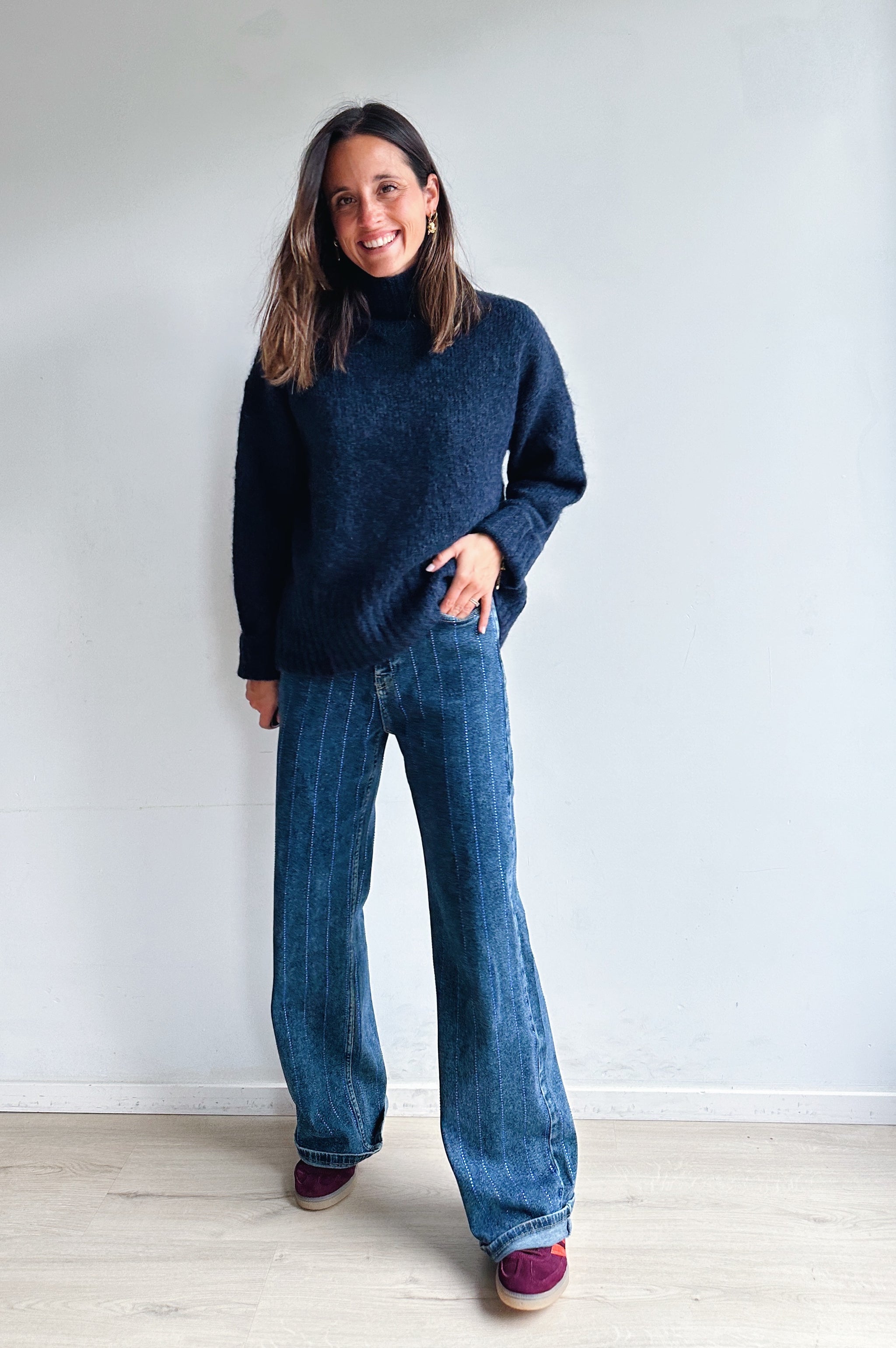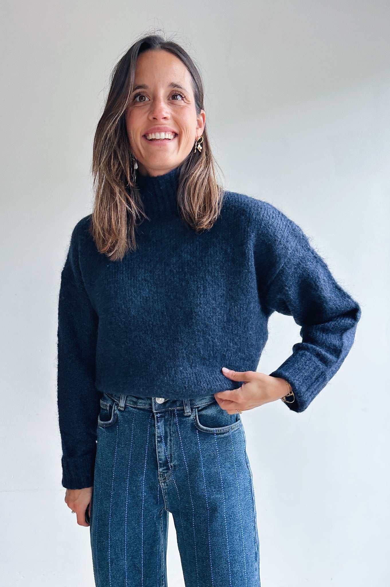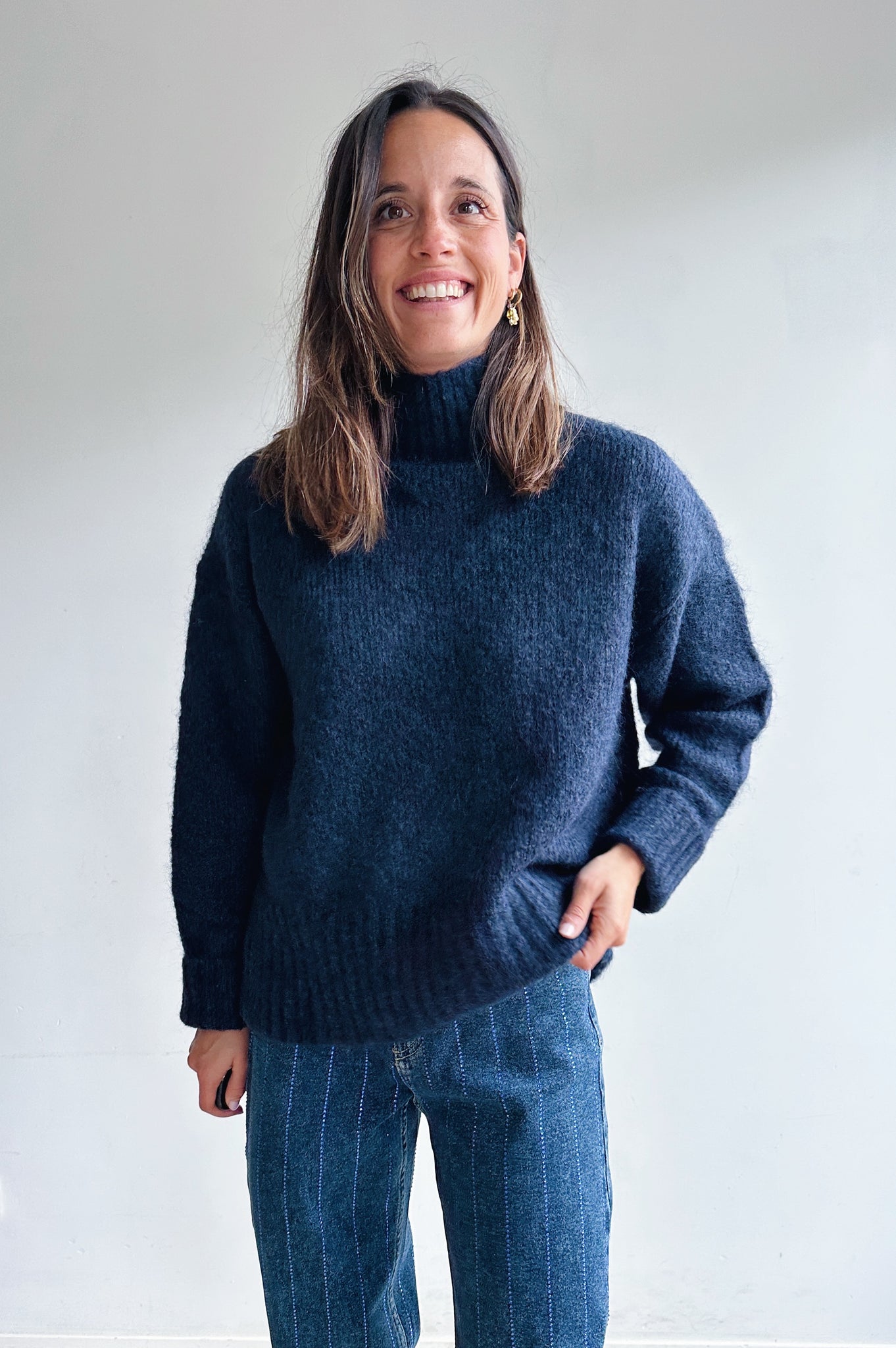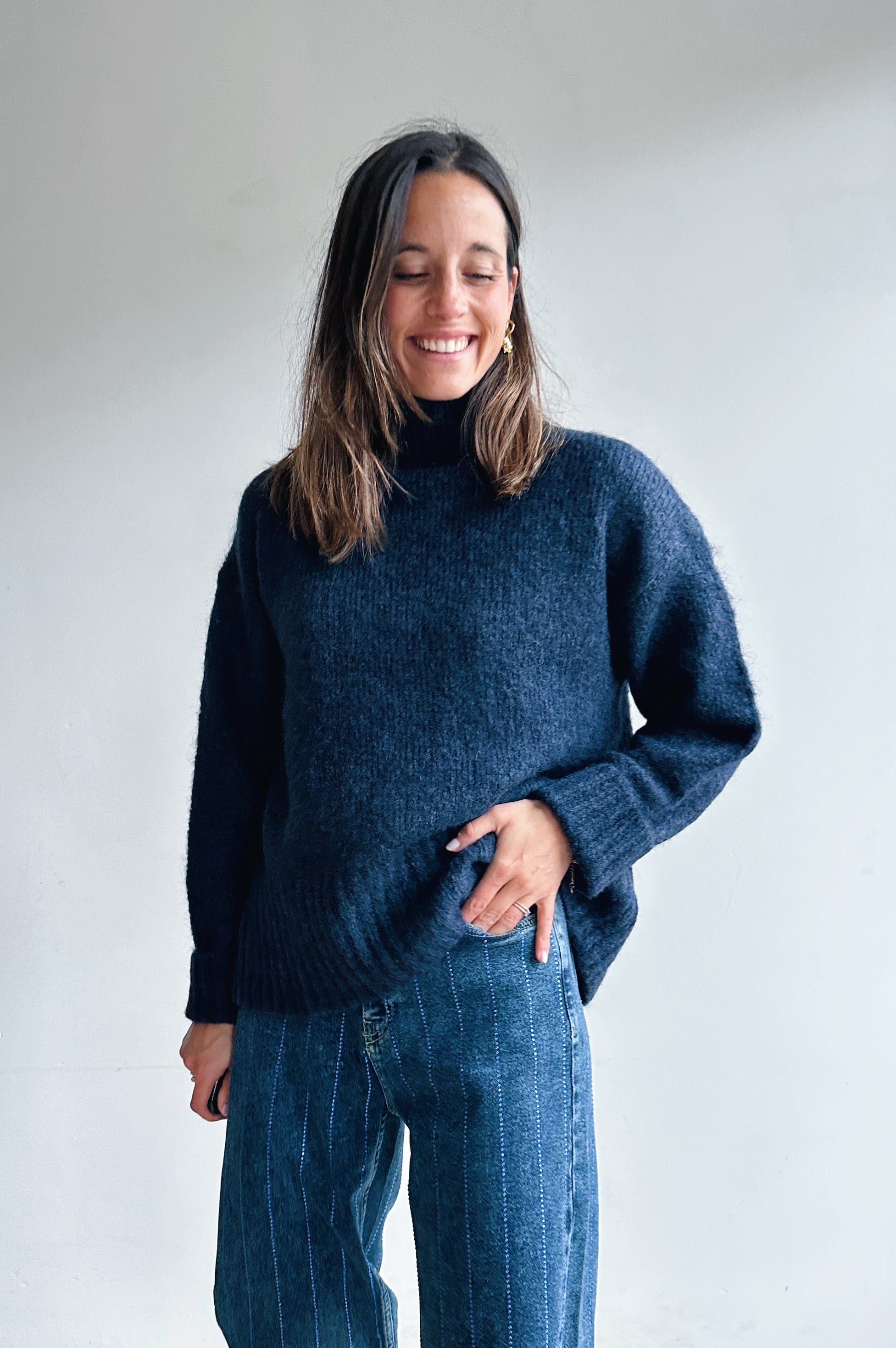 Deze heerlijk coltrui in een warme blauwe tint is het ultieme cosy item voor koude dagen. De trui heeft een rechte, iets losse pasvorm met een hoge col en brede ribboord aan de onderzijde en mouwen voor een stijlvolle, tijdloze look.