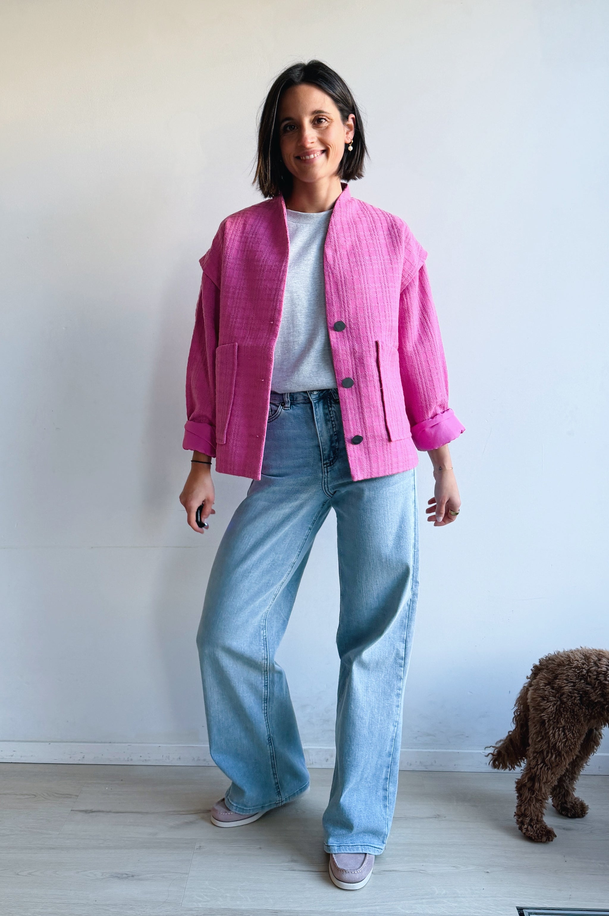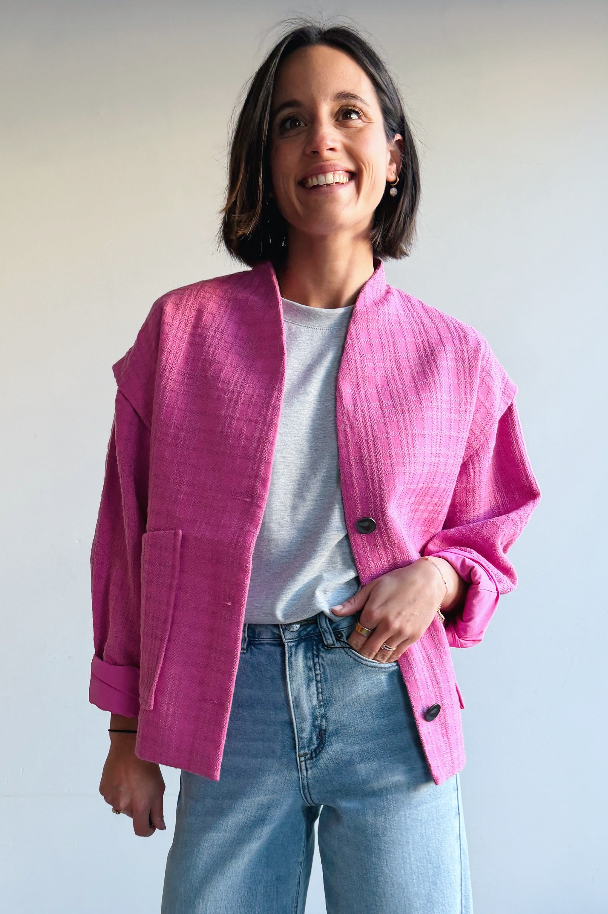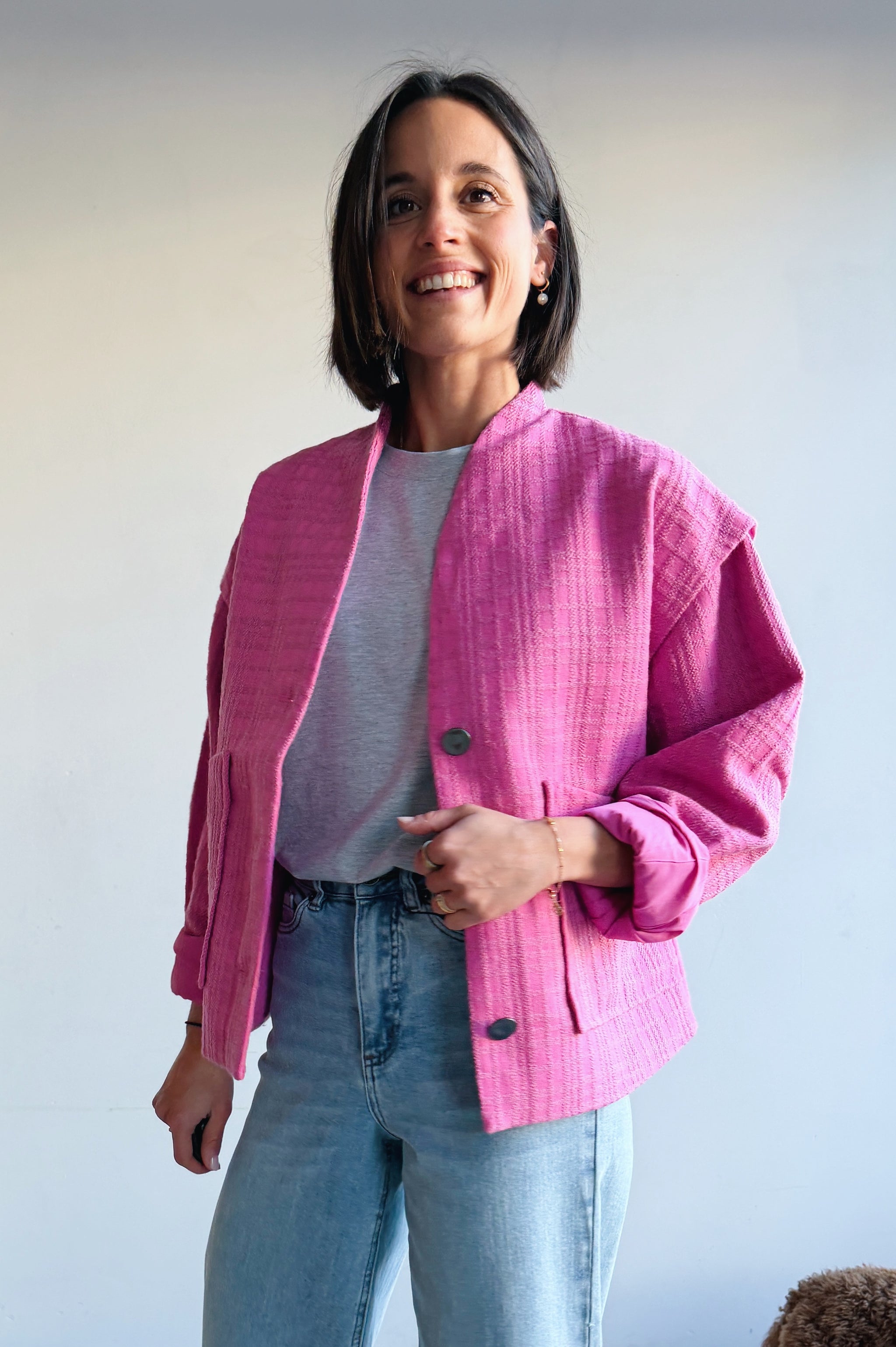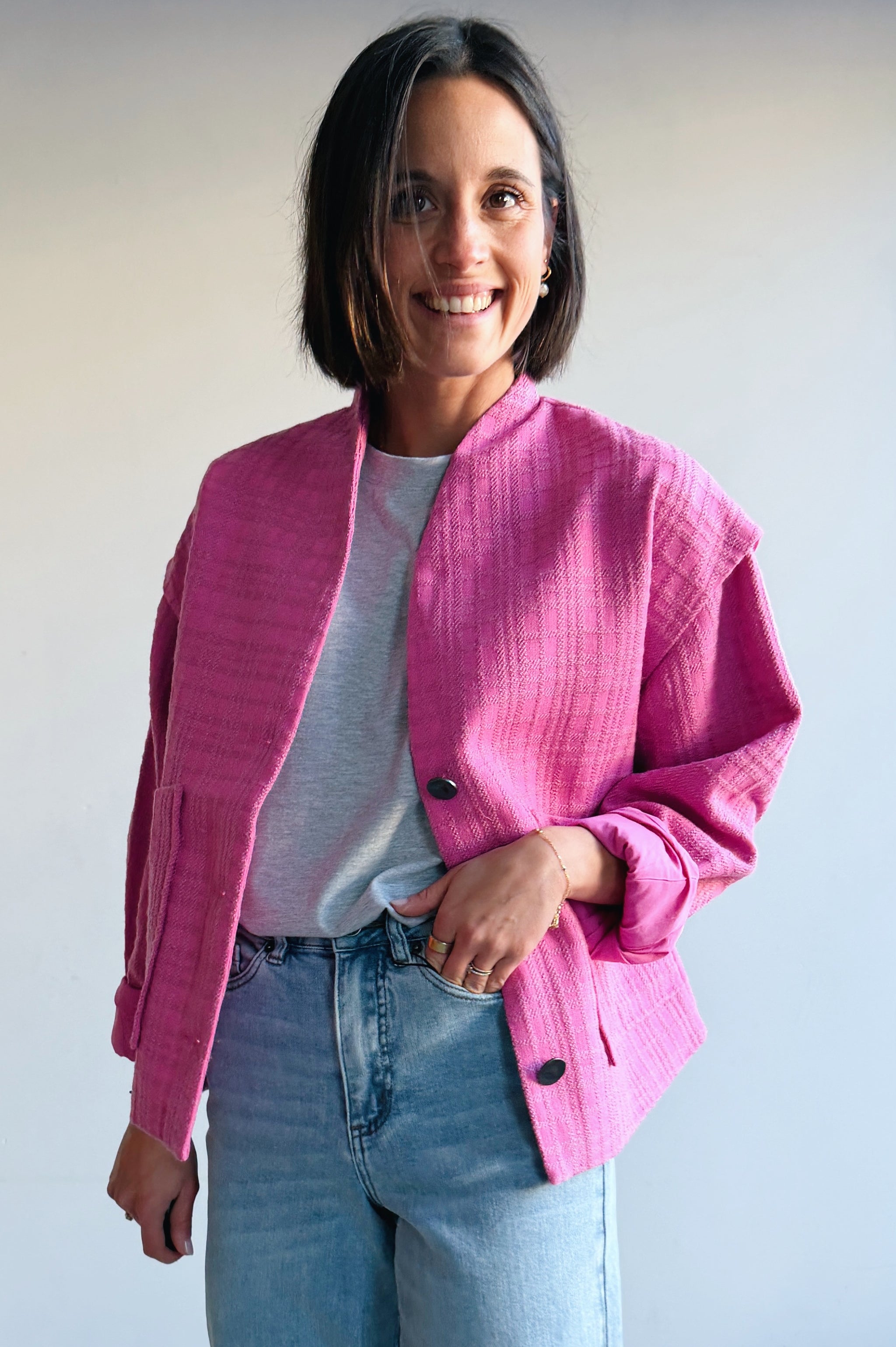 Dit fel roze jasje combineert een eigentijdse uitstraling met een comfortabele, relaxte fit. Het model heeft een rechte snit met een open voorkant en grote opgestikte zakken, wat zorgt voor een casual maar verzorgde look. De stof voelt zacht aan en heeft een subtiele structuur die extra karakter geeft. De jas is licht en ideaal om te dragen als tussenlaag, perfect voor het voorjaar of frisse dagen. Makkelijk te combineren met een jeans en T-shirt voor een nonchalante outfit, maar ook stijlvol over een jurk of blouse.