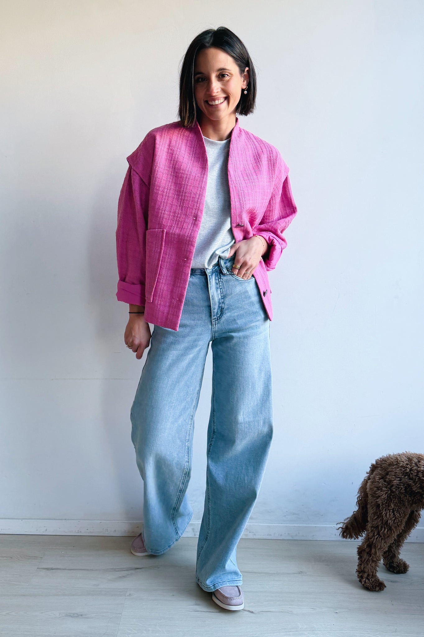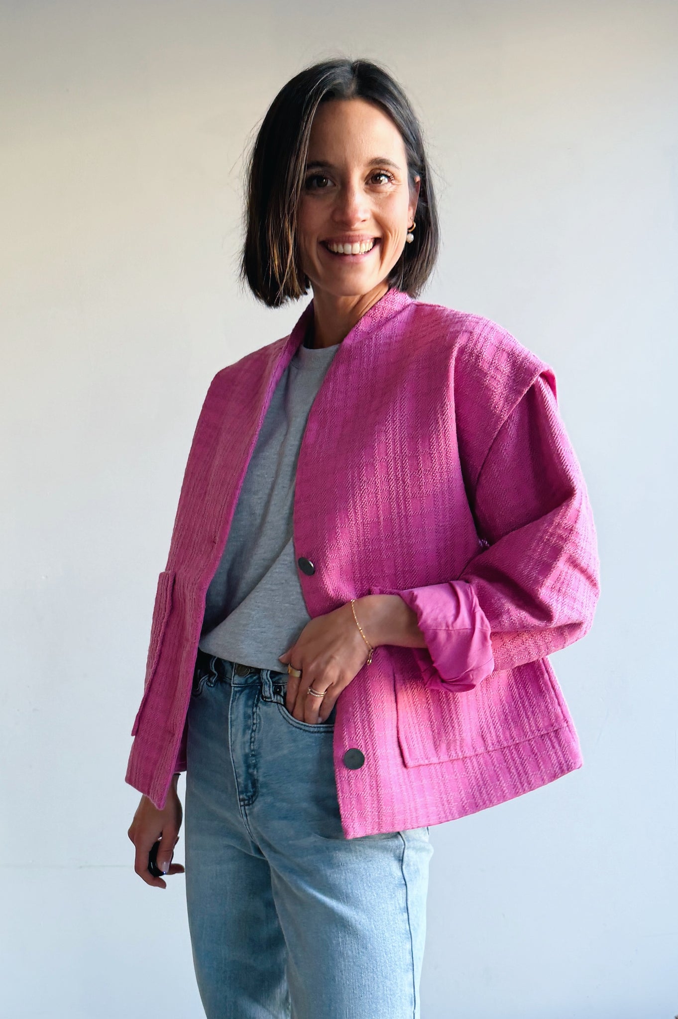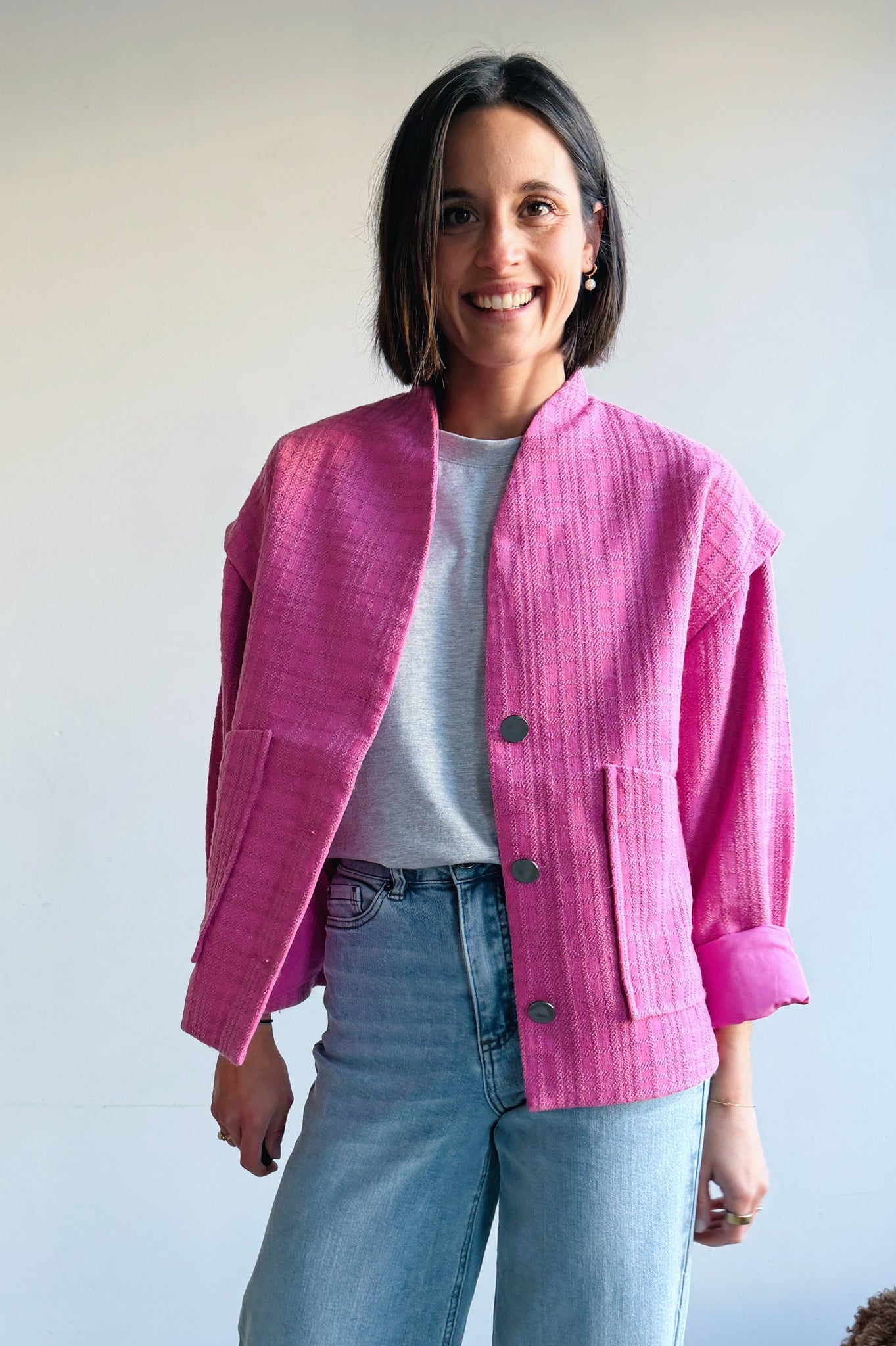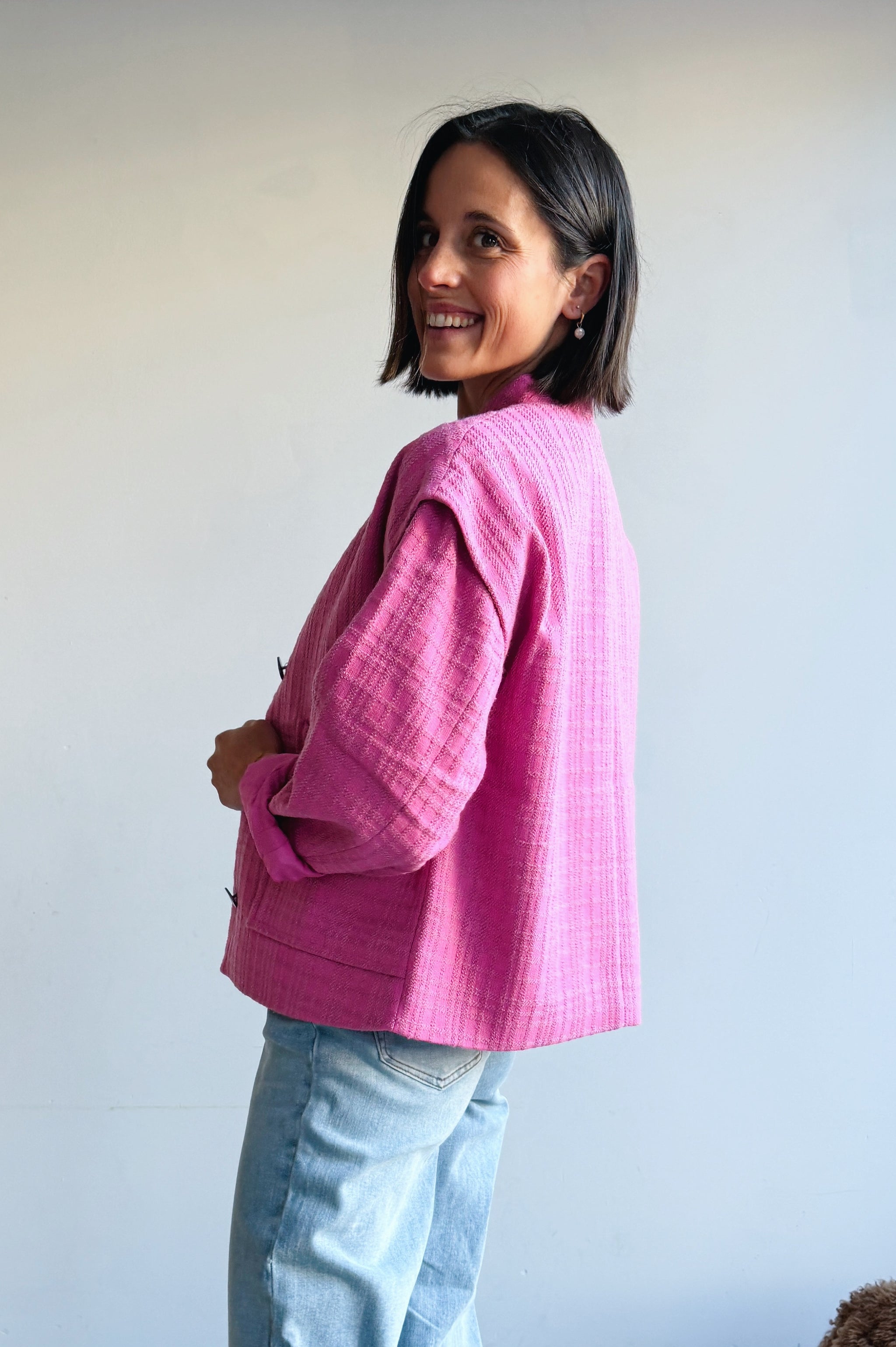 Dit fel roze jasje combineert een eigentijdse uitstraling met een comfortabele, relaxte fit. Het model heeft een rechte snit met een open voorkant en grote opgestikte zakken, wat zorgt voor een casual maar verzorgde look. De stof voelt zacht aan en heeft een subtiele structuur die extra karakter geeft. De jas is licht en ideaal om te dragen als tussenlaag, perfect voor het voorjaar of frisse dagen. Makkelijk te combineren met een jeans en T-shirt voor een nonchalante outfit, maar ook stijlvol over een jurk of blouse.