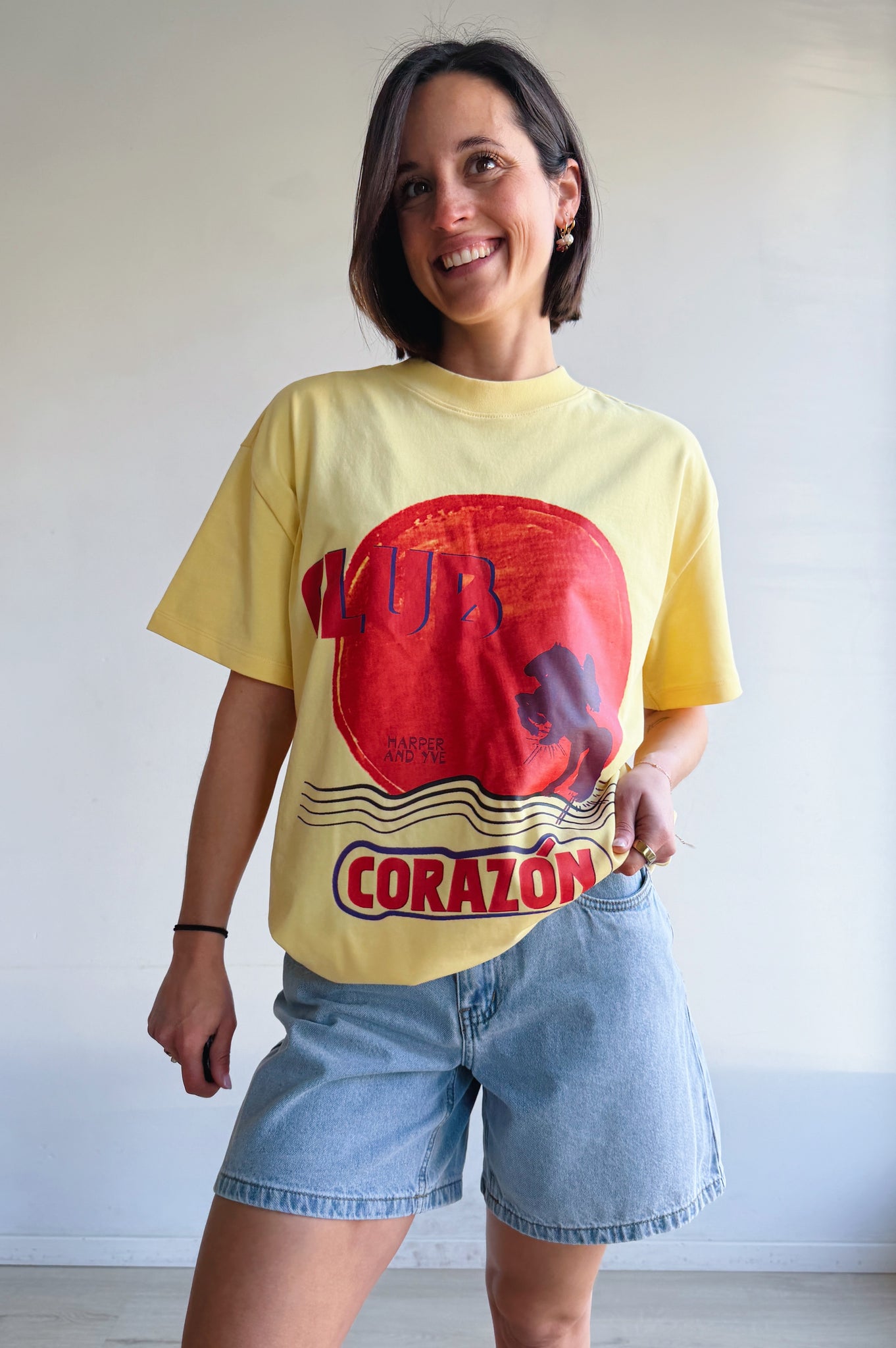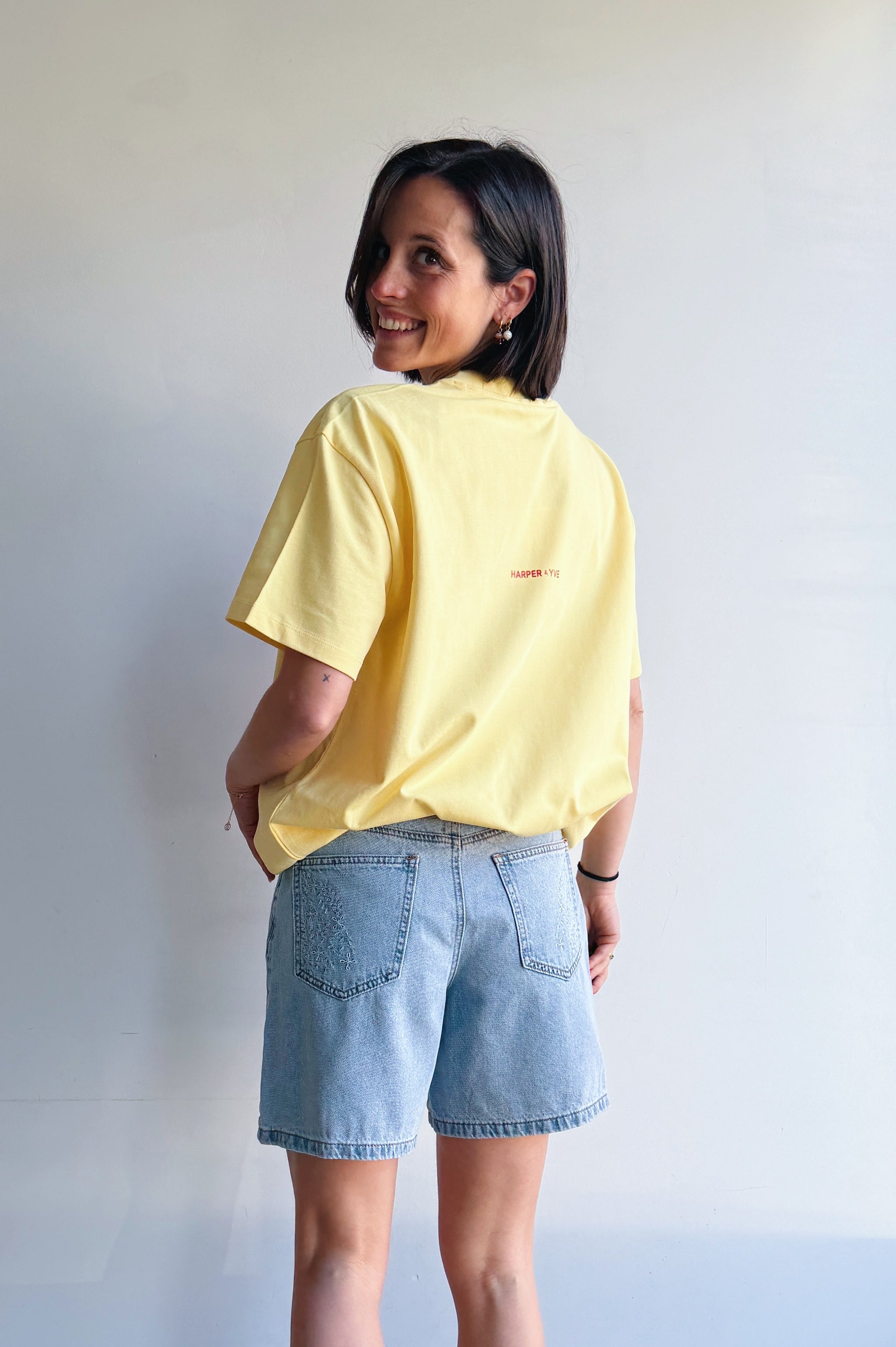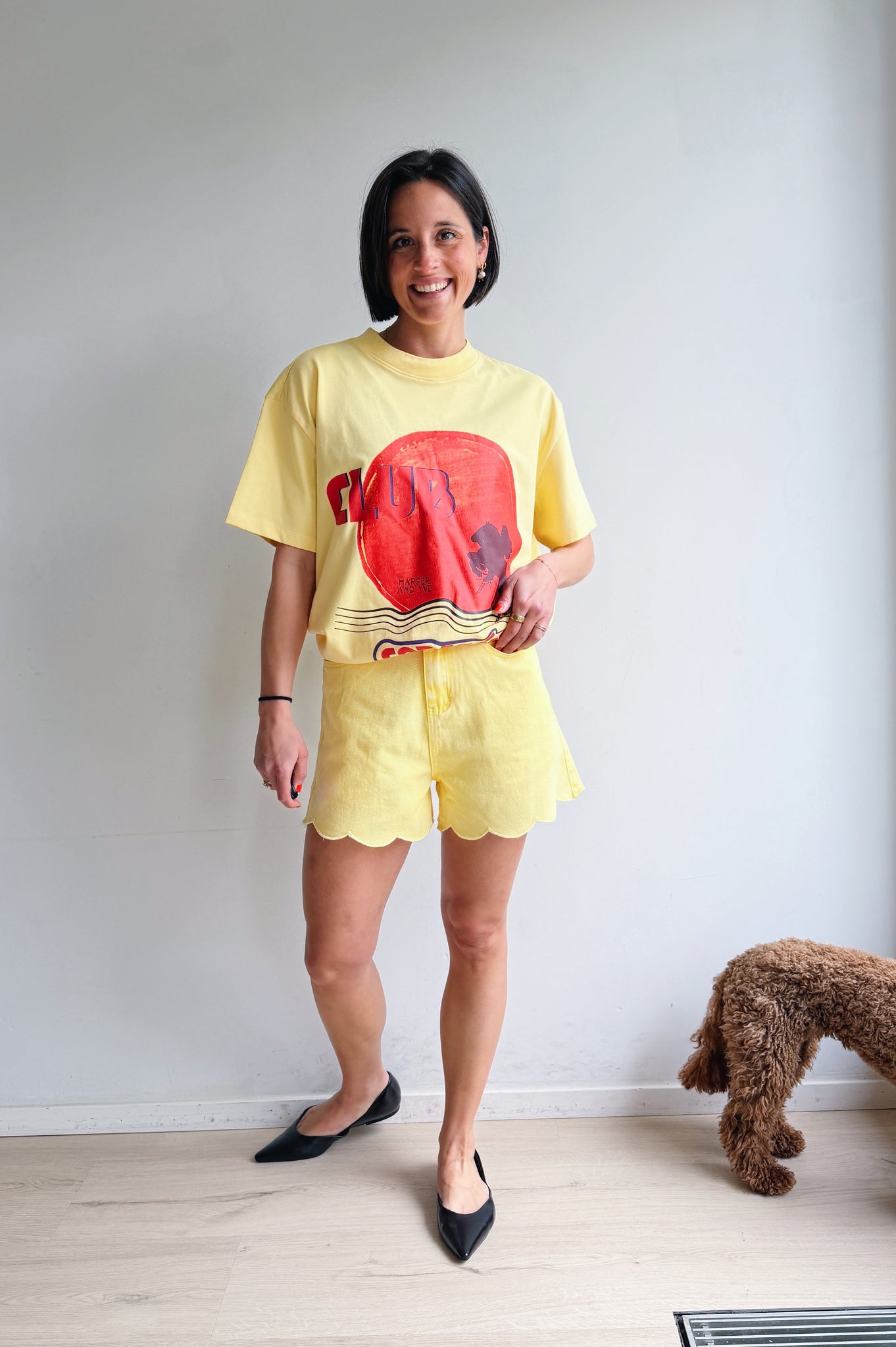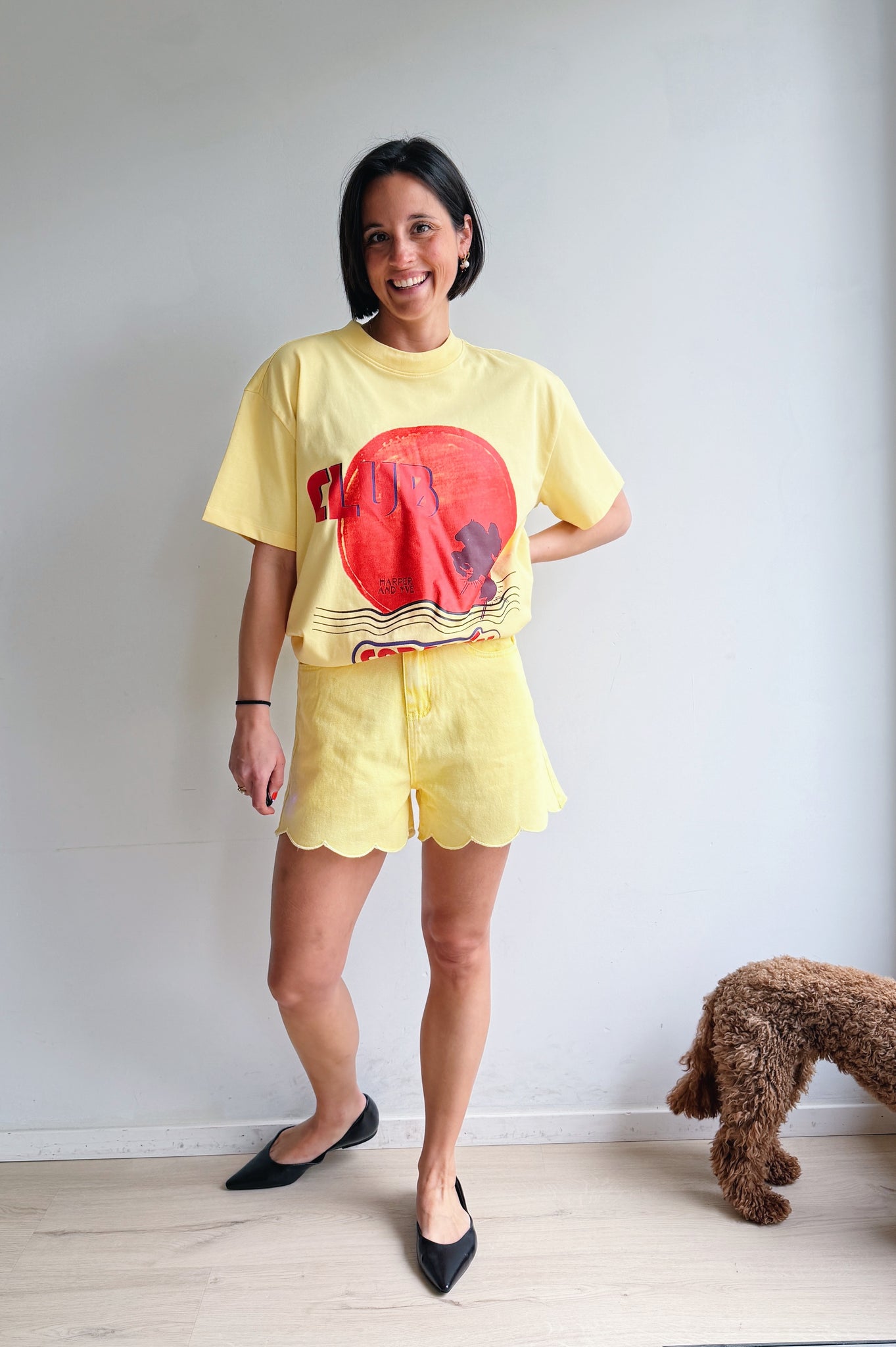 Deze T-shirt is allesbehalve basic. De prachtige gele kleur vormt de perfecte achtergrond voor de opvallende print vooraan, met warme rode tinten en een speelse, zomerse vibe die meteen in het oog springt.