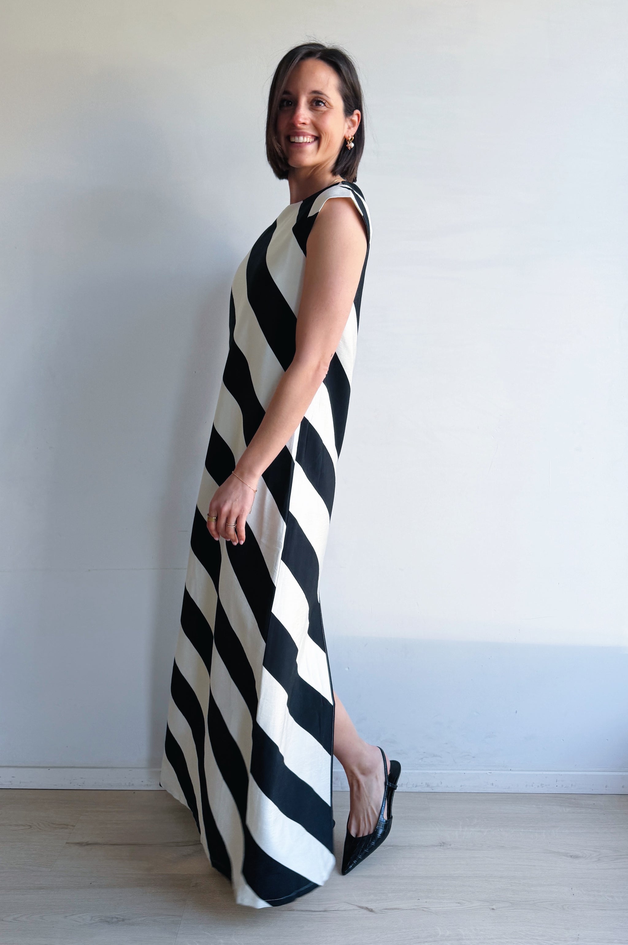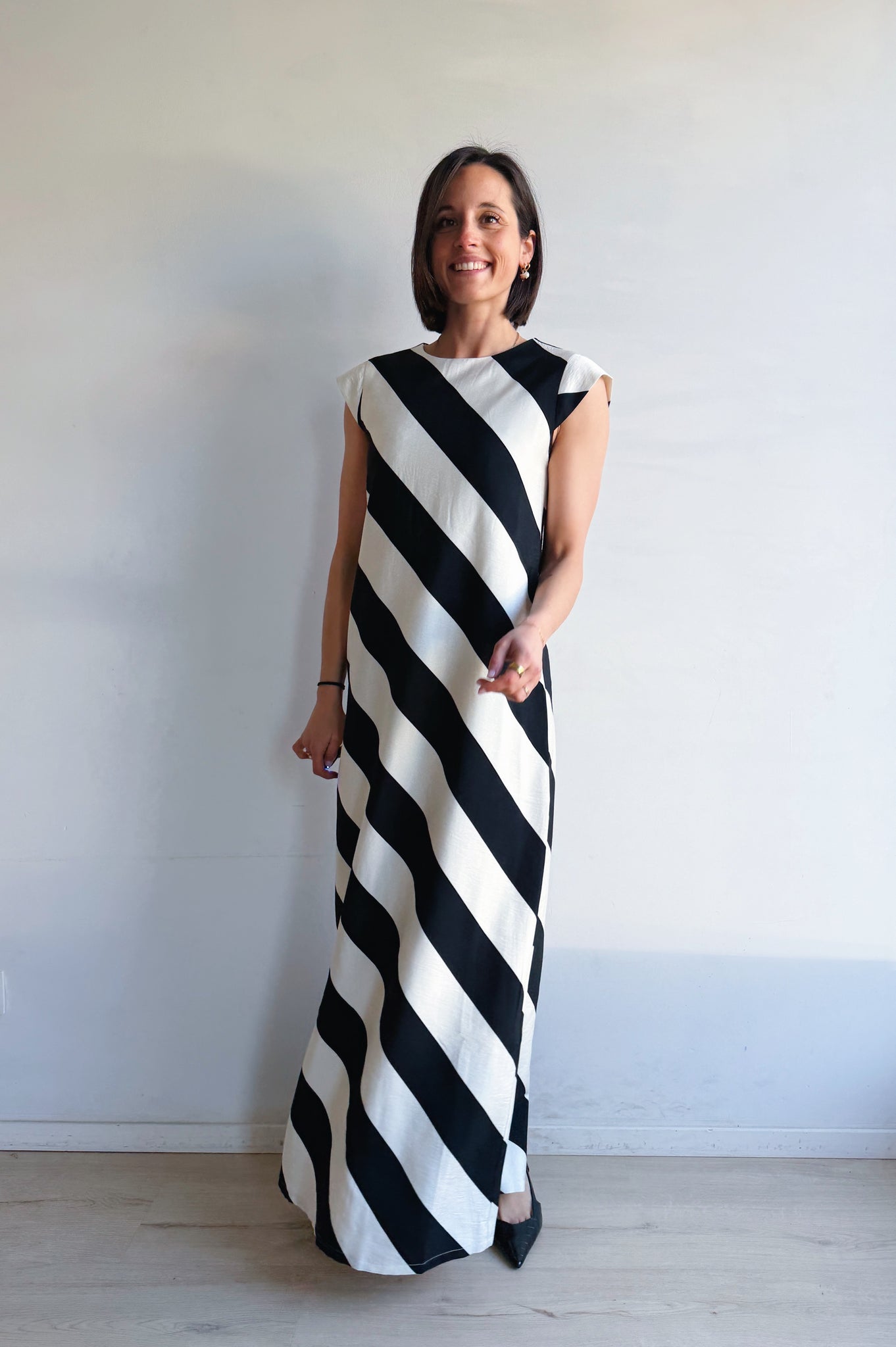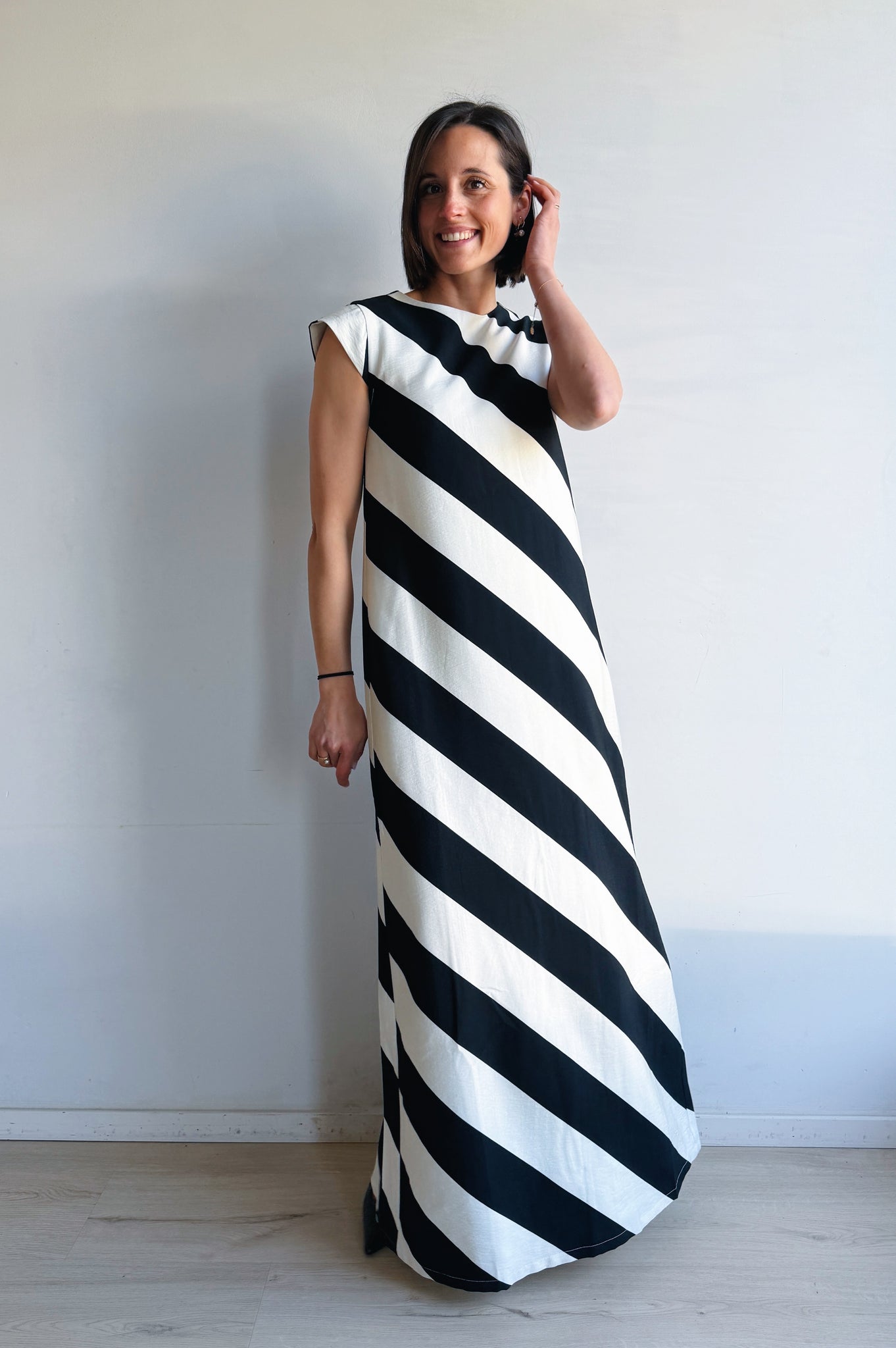 WAAAUW! Deze jurk is een echte statement piece zonder moeite te doen. De krachtige zwart-witte strepen geven een moderne, grafische look die meteen opvalt, terwijl de lange, vloeiende snit zorgt voor elegantie en beweging.