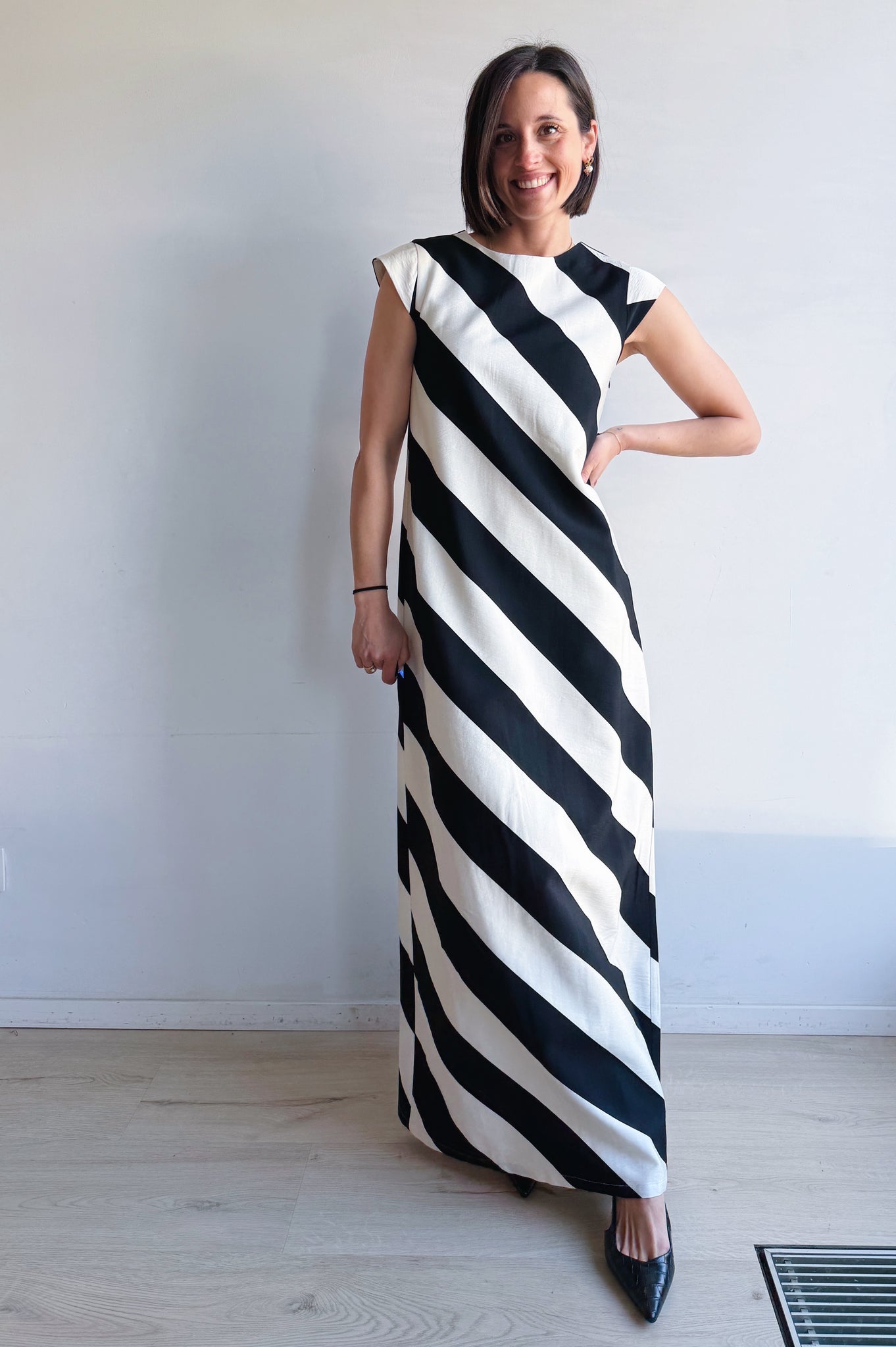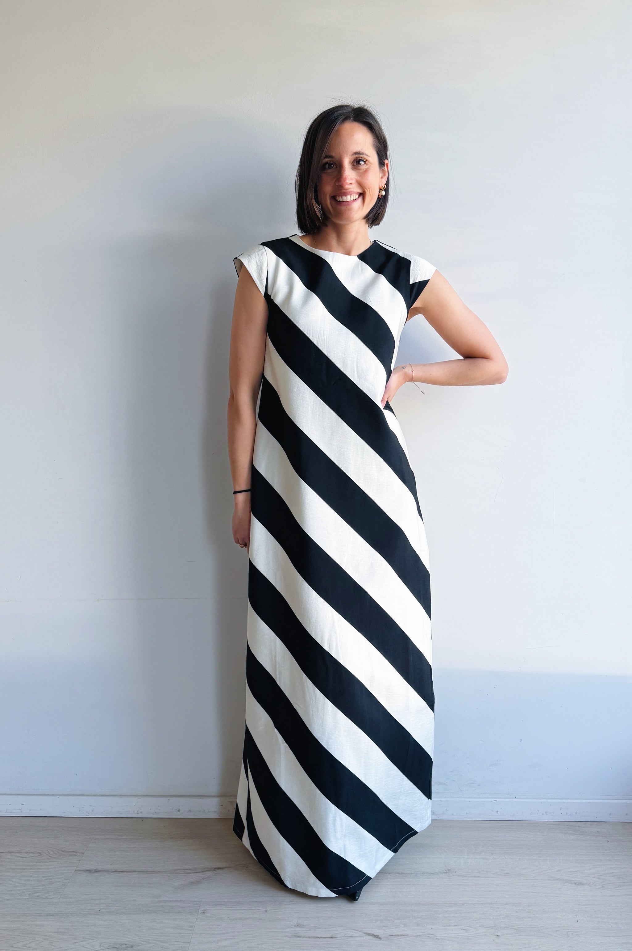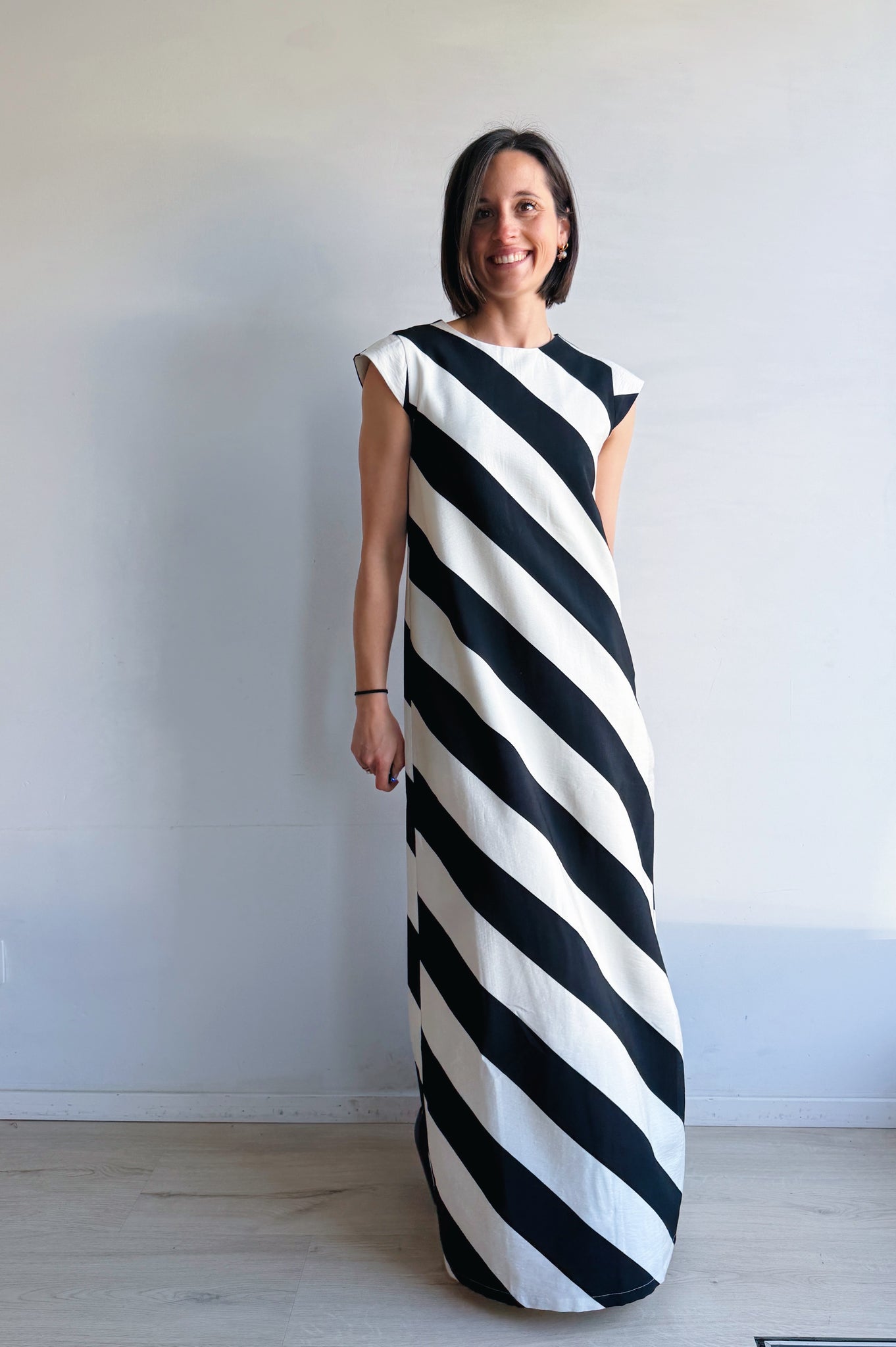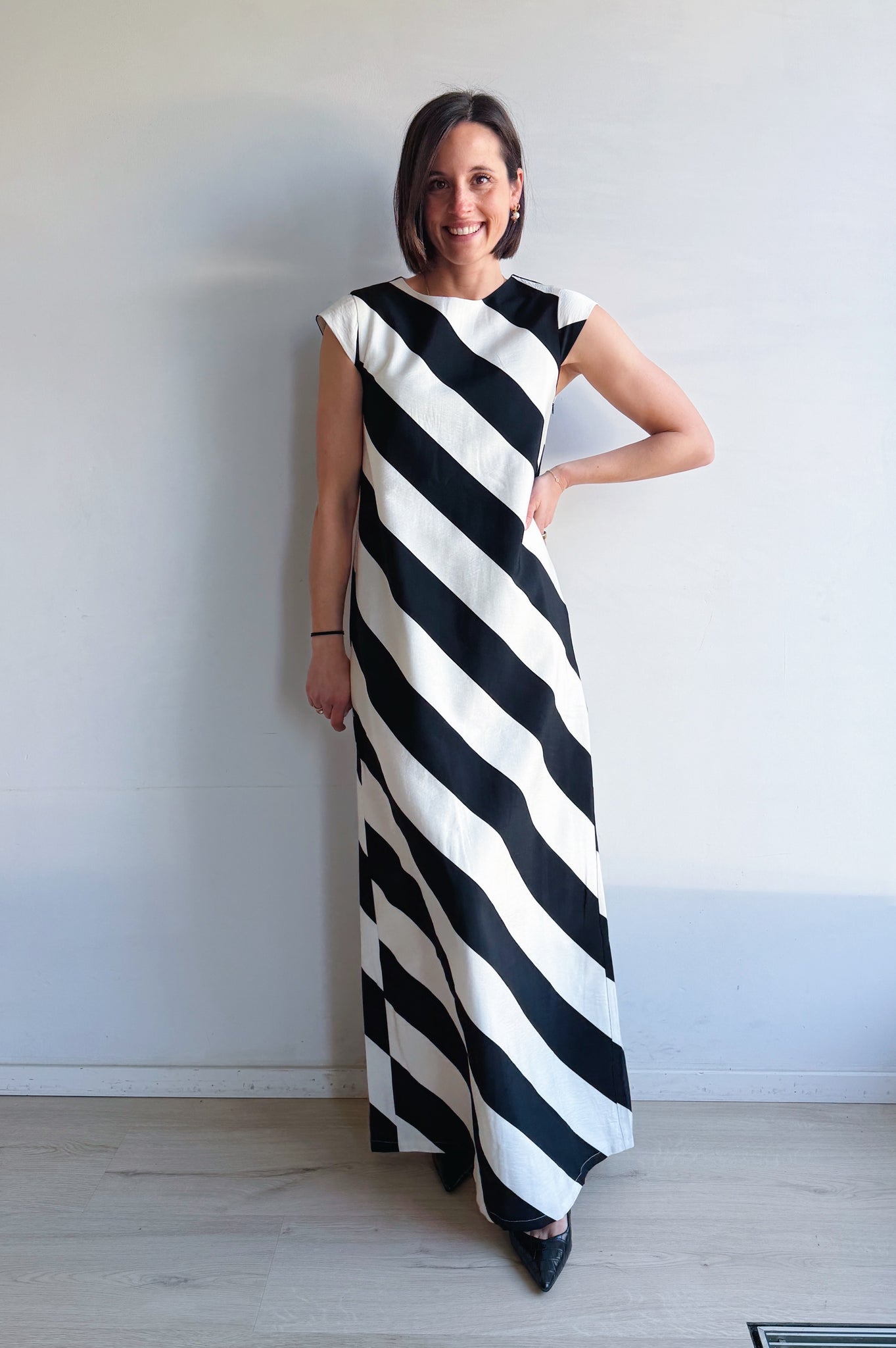 WAAAUW! Deze jurk is een echte statement piece zonder moeite te doen. De krachtige zwart-witte strepen geven een moderne, grafische look die meteen opvalt, terwijl de lange, vloeiende snit zorgt voor elegantie en beweging.