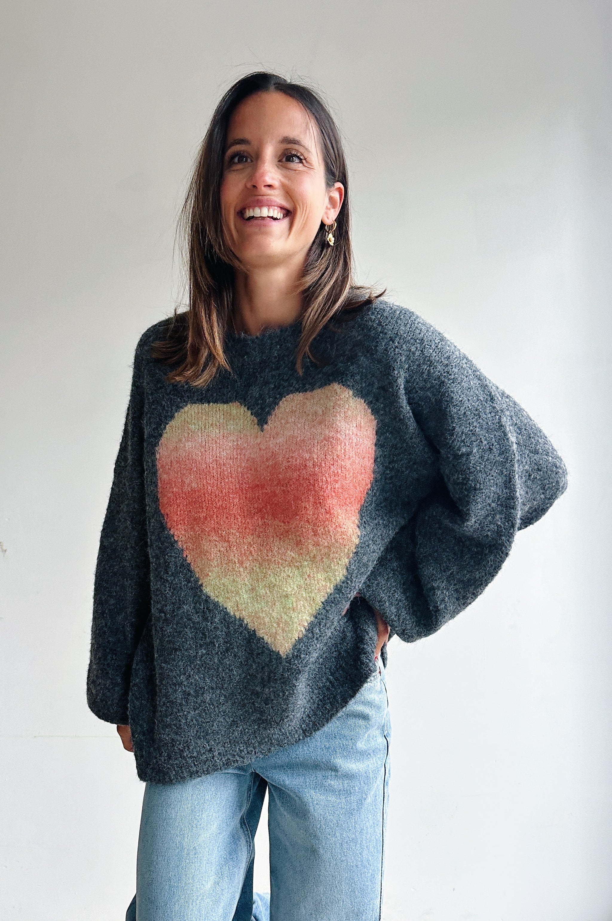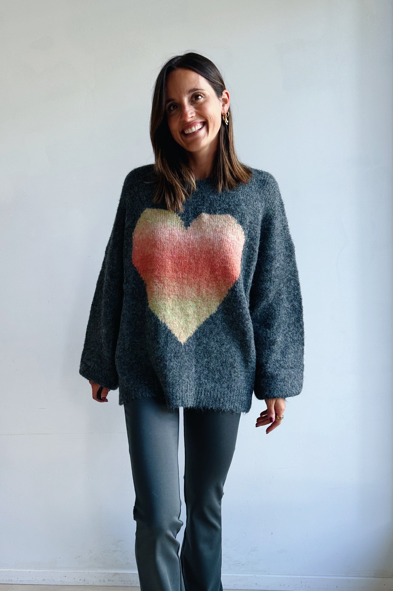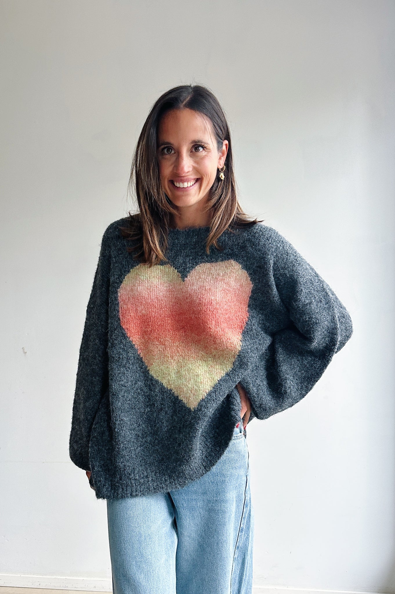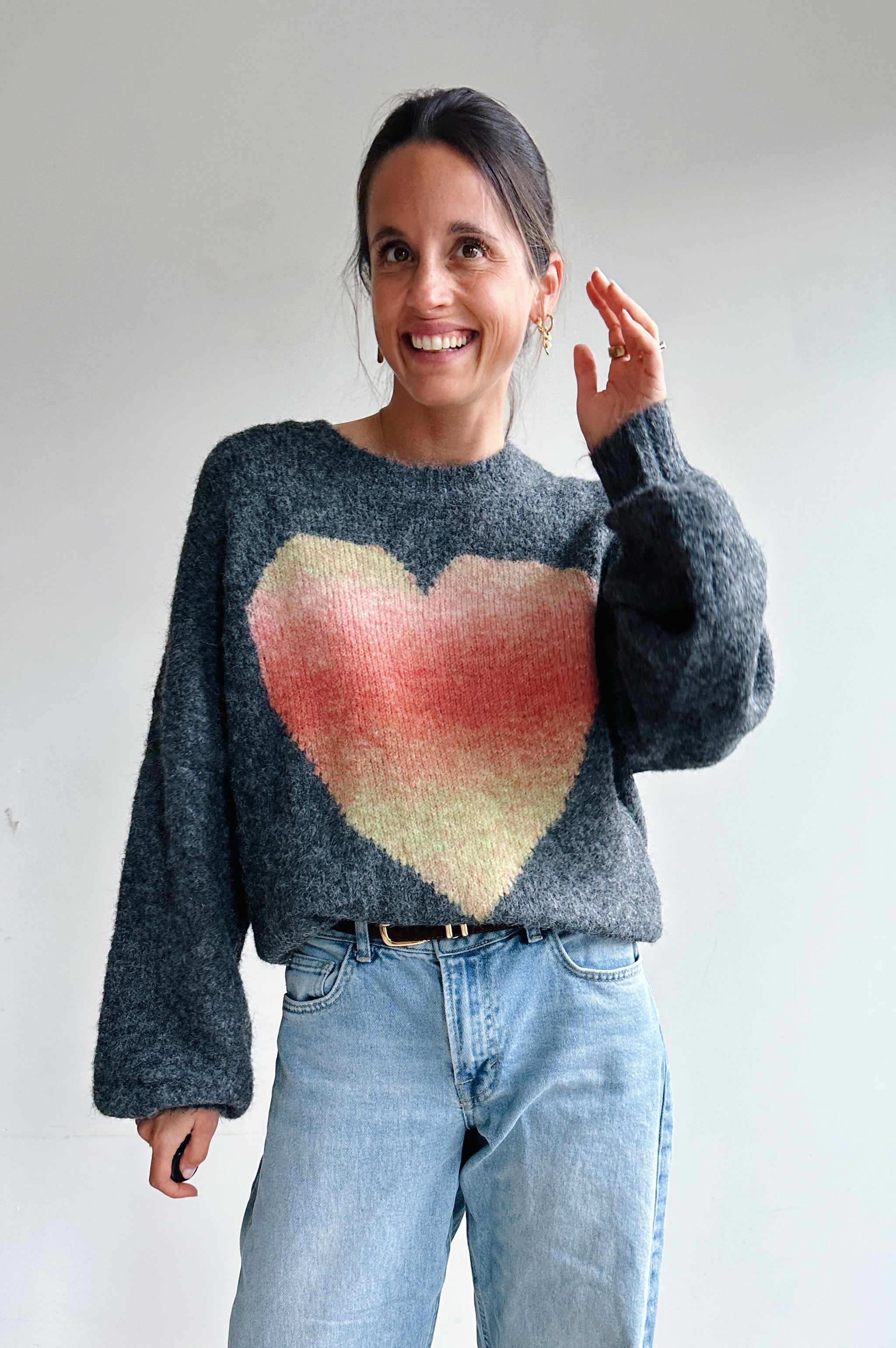 In deze zachte oversized trui ga je écht leven. Hij valt op door het grote hart in zachte, vervagende kleuren. Het losse, comfortabele model met lange mouwen maakt hem ideaal voor cozy dagen, terwijl de speelse print zorgt voor een vrolijke uitstraling. Perfect om te dragen op een jeans of een legging voor een relaxte, maar toch opvallende look.