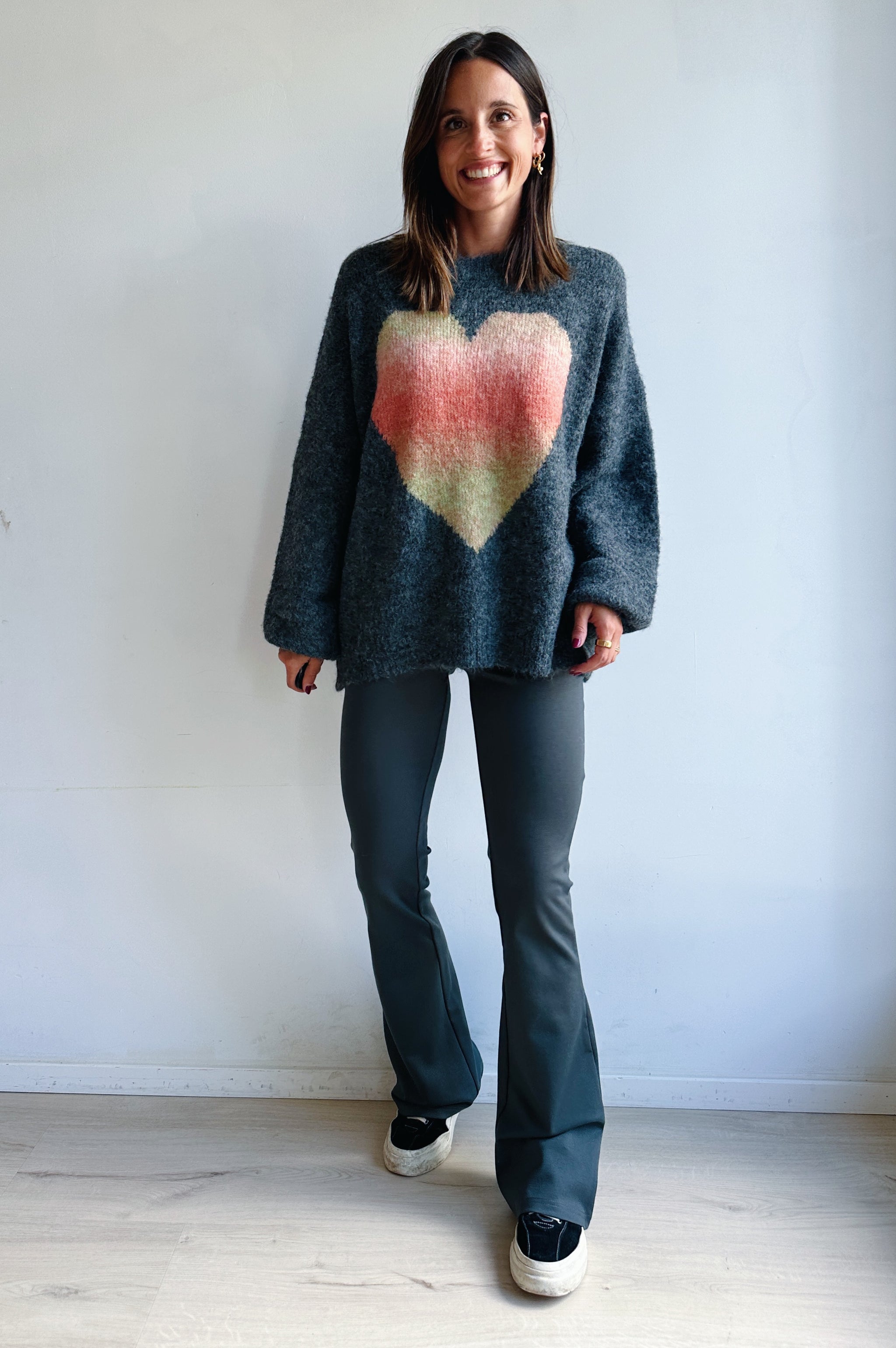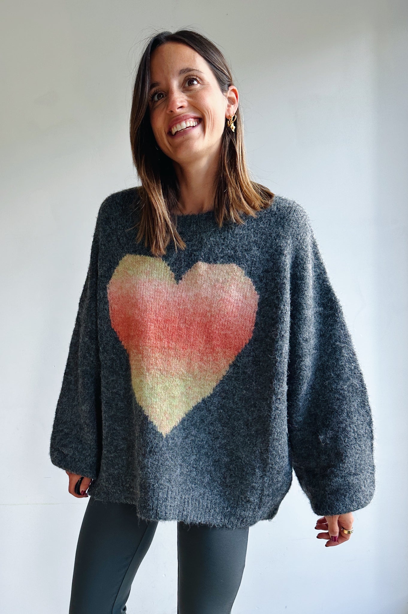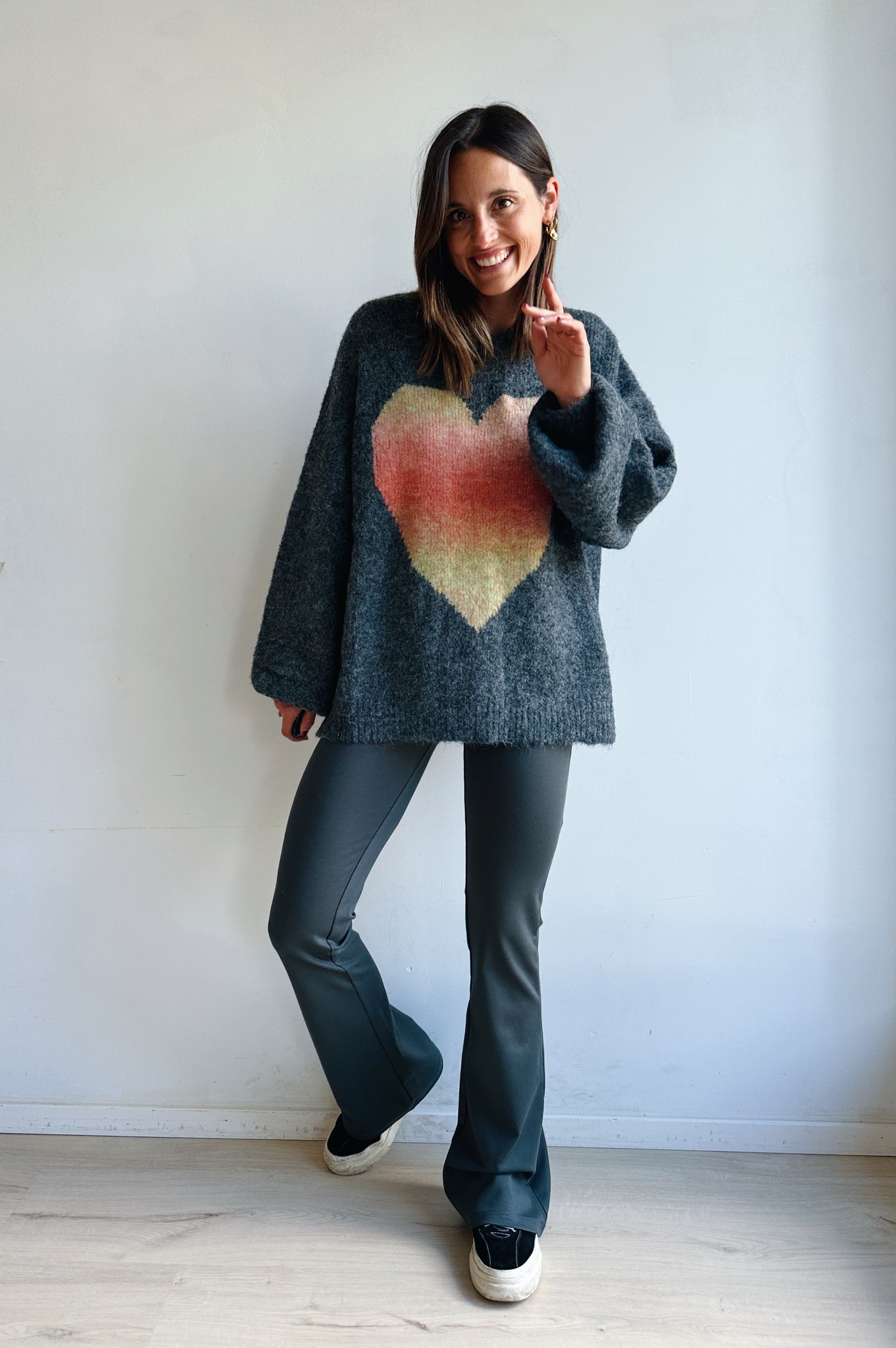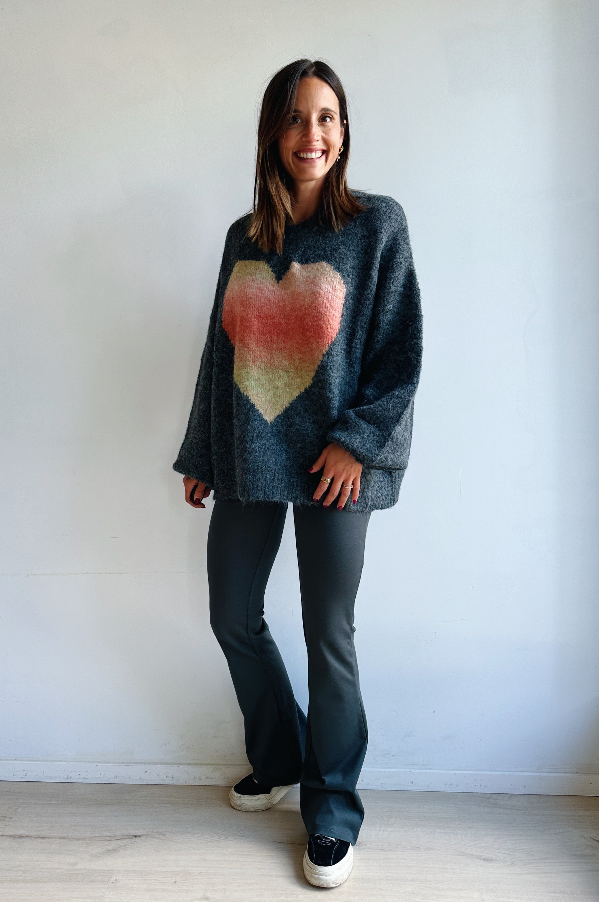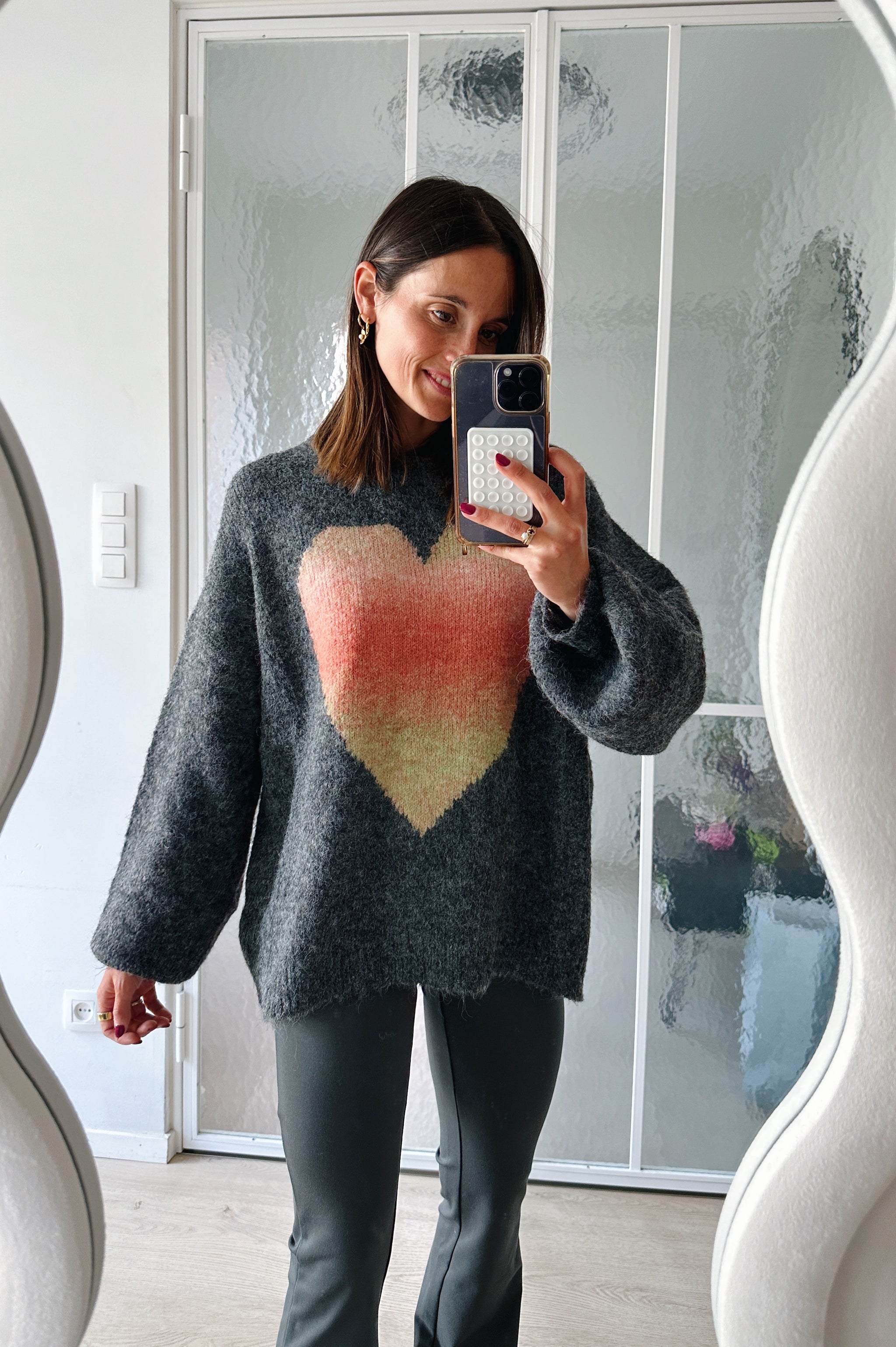 In deze zachte oversized trui ga je écht leven. Hij valt op door het grote hart in zachte, vervagende kleuren. Het losse, comfortabele model met lange mouwen maakt hem ideaal voor cozy dagen, terwijl de speelse print zorgt voor een vrolijke uitstraling. Perfect om te dragen op een jeans of een legging voor een relaxte, maar toch opvallende look.