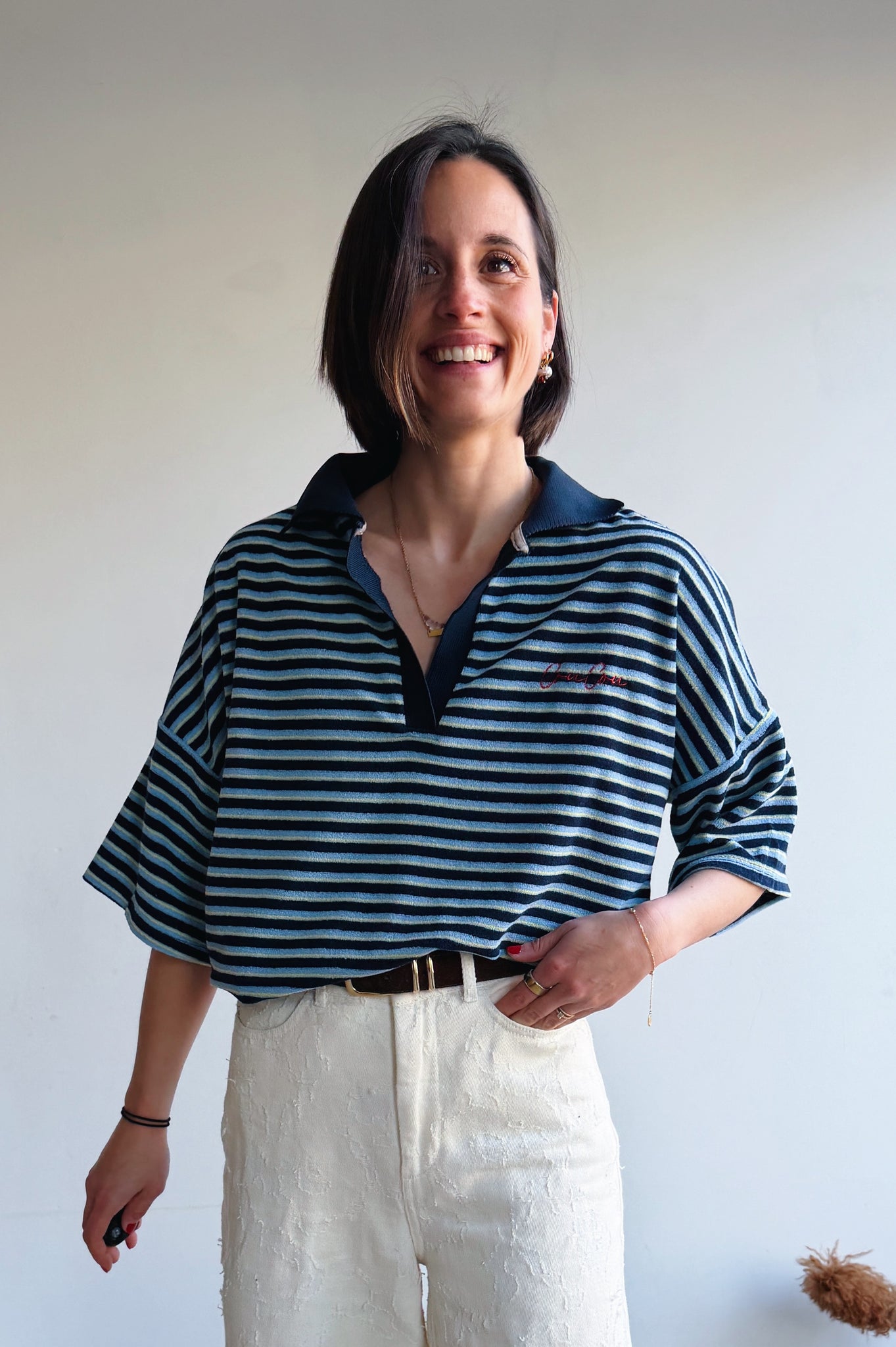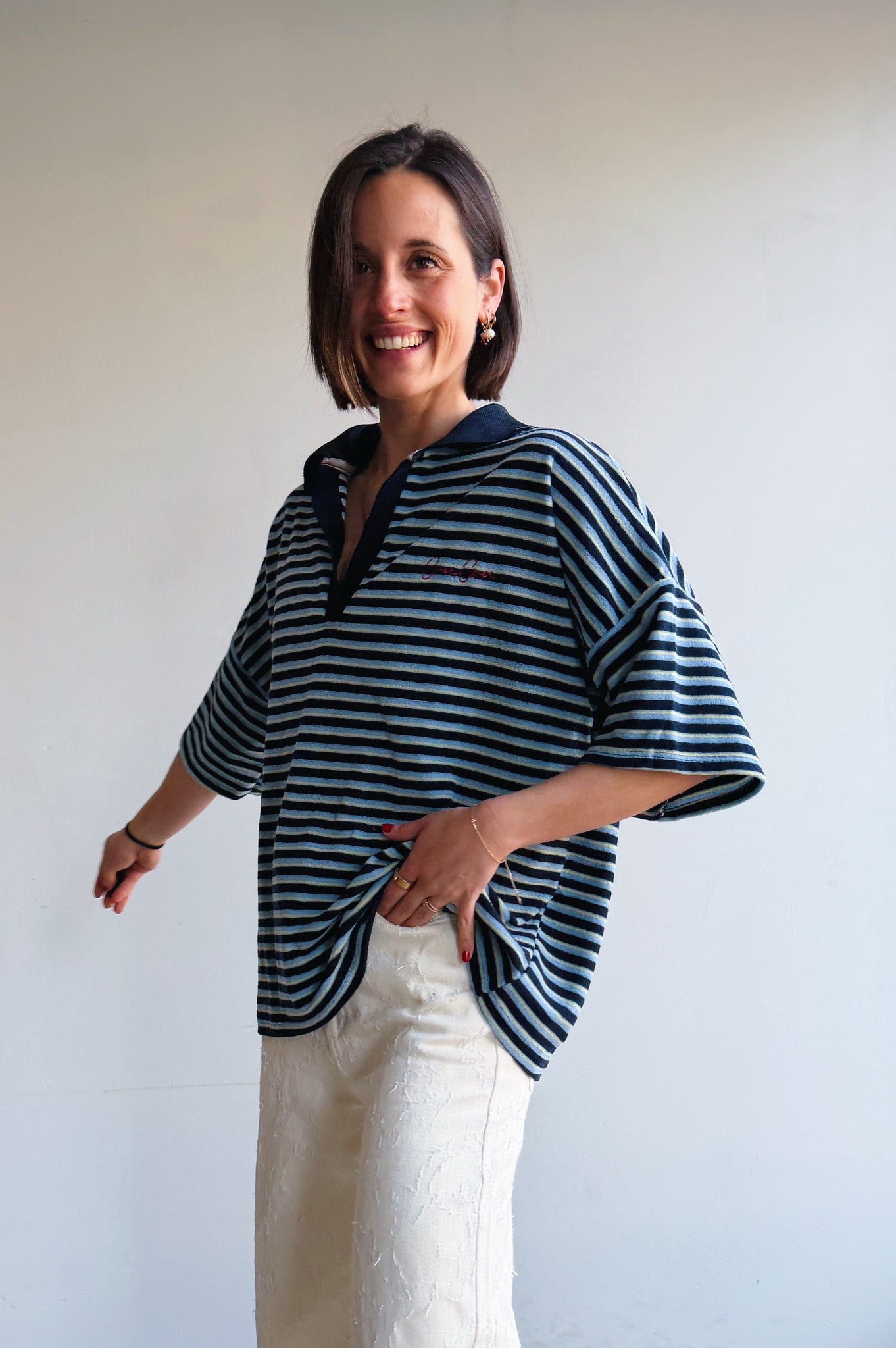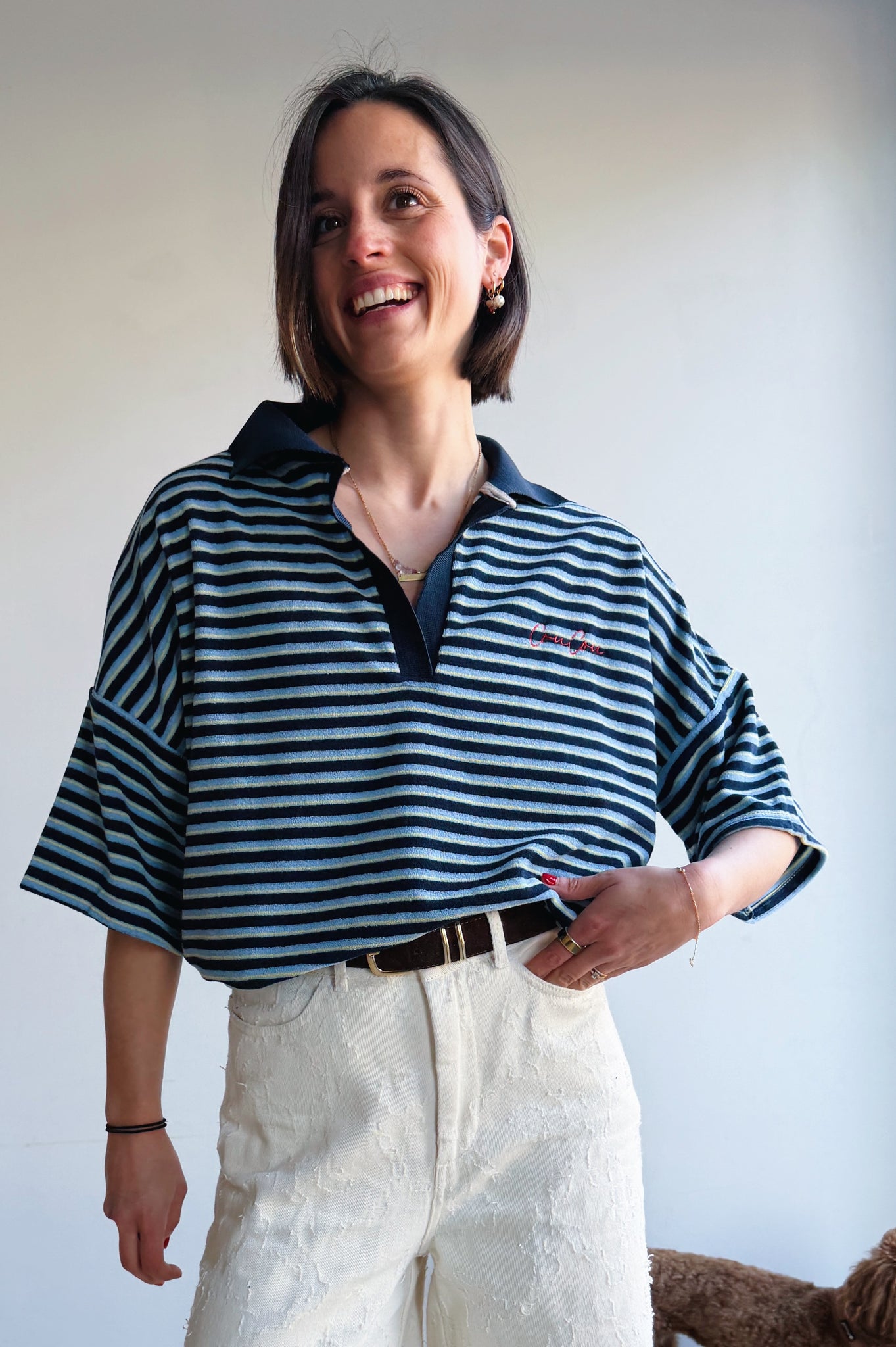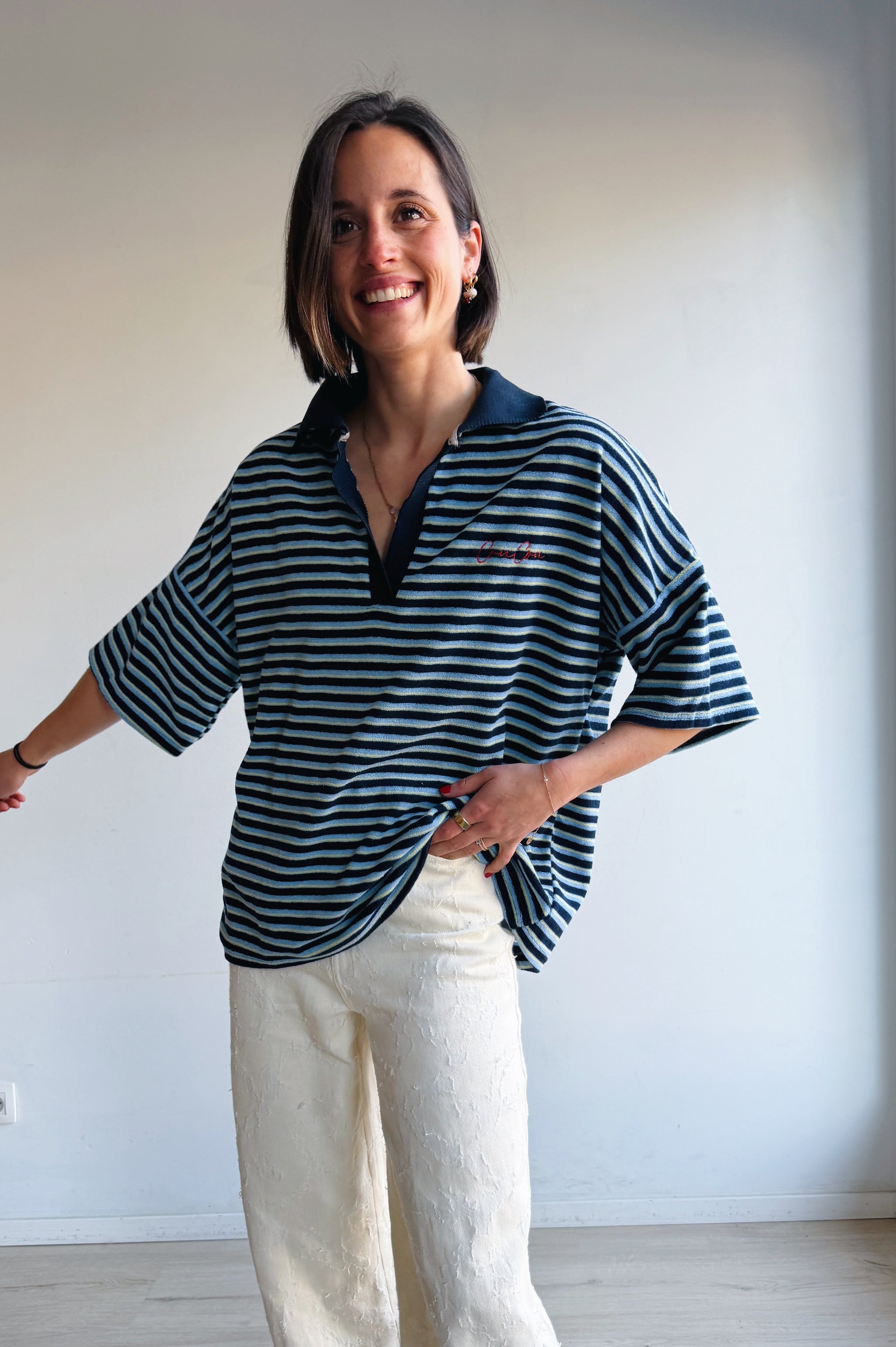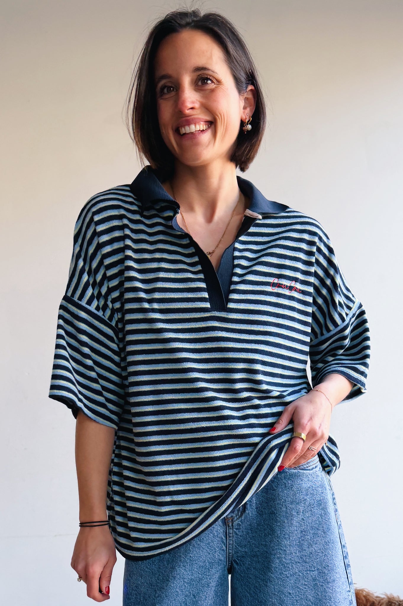 Deze oversized polo in heerlijke badstof combineert een klassieke streep met een moderne, relaxte fit. De donkerblauwe kraag en V-hals geven het geheel een sportieve uitstraling, terwijl het subtiele CouCOU borduursel op de borst zorgt voor een verfijnd detail.