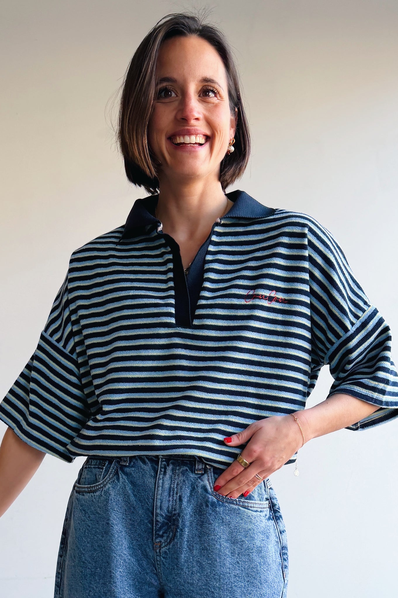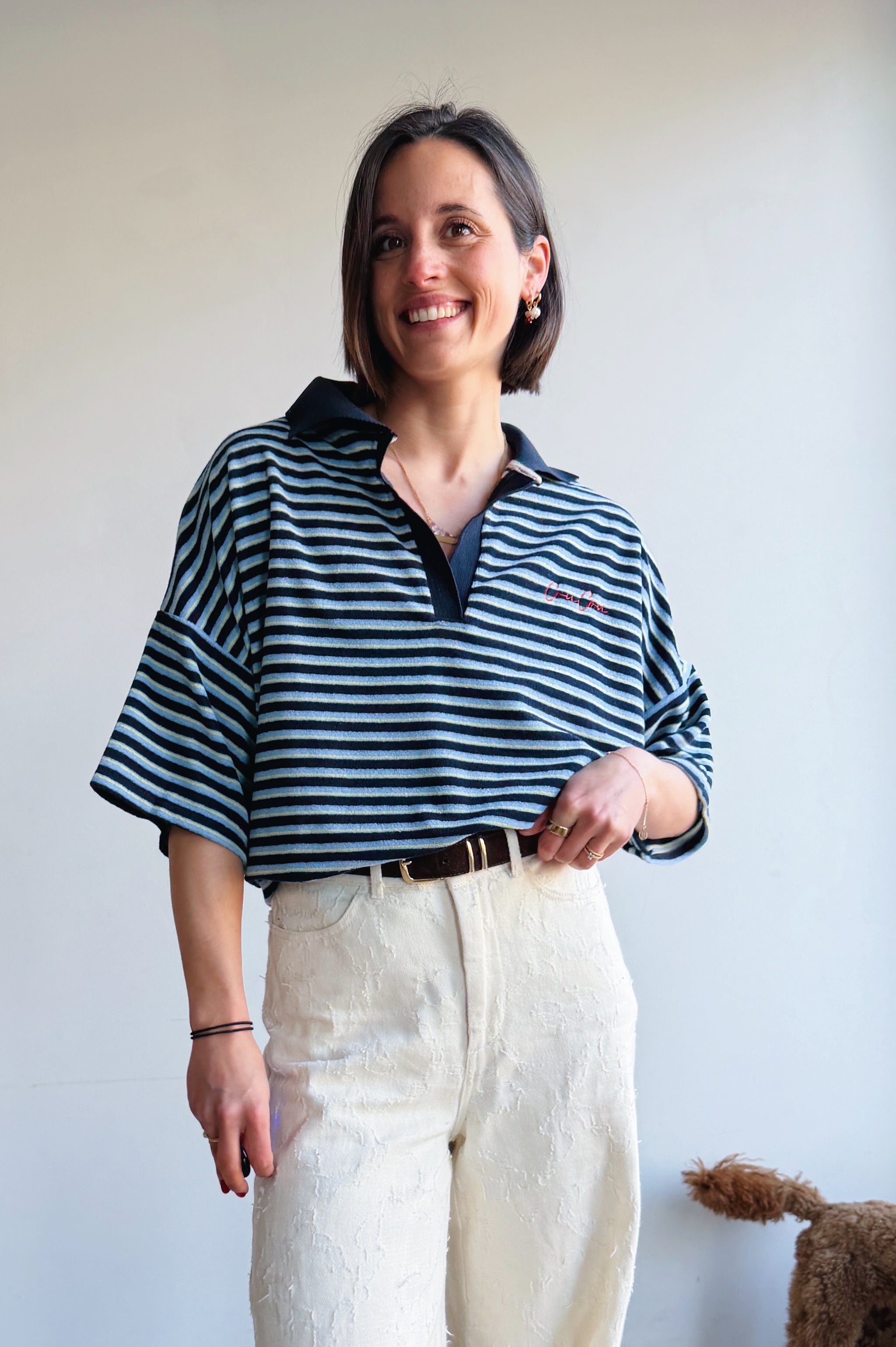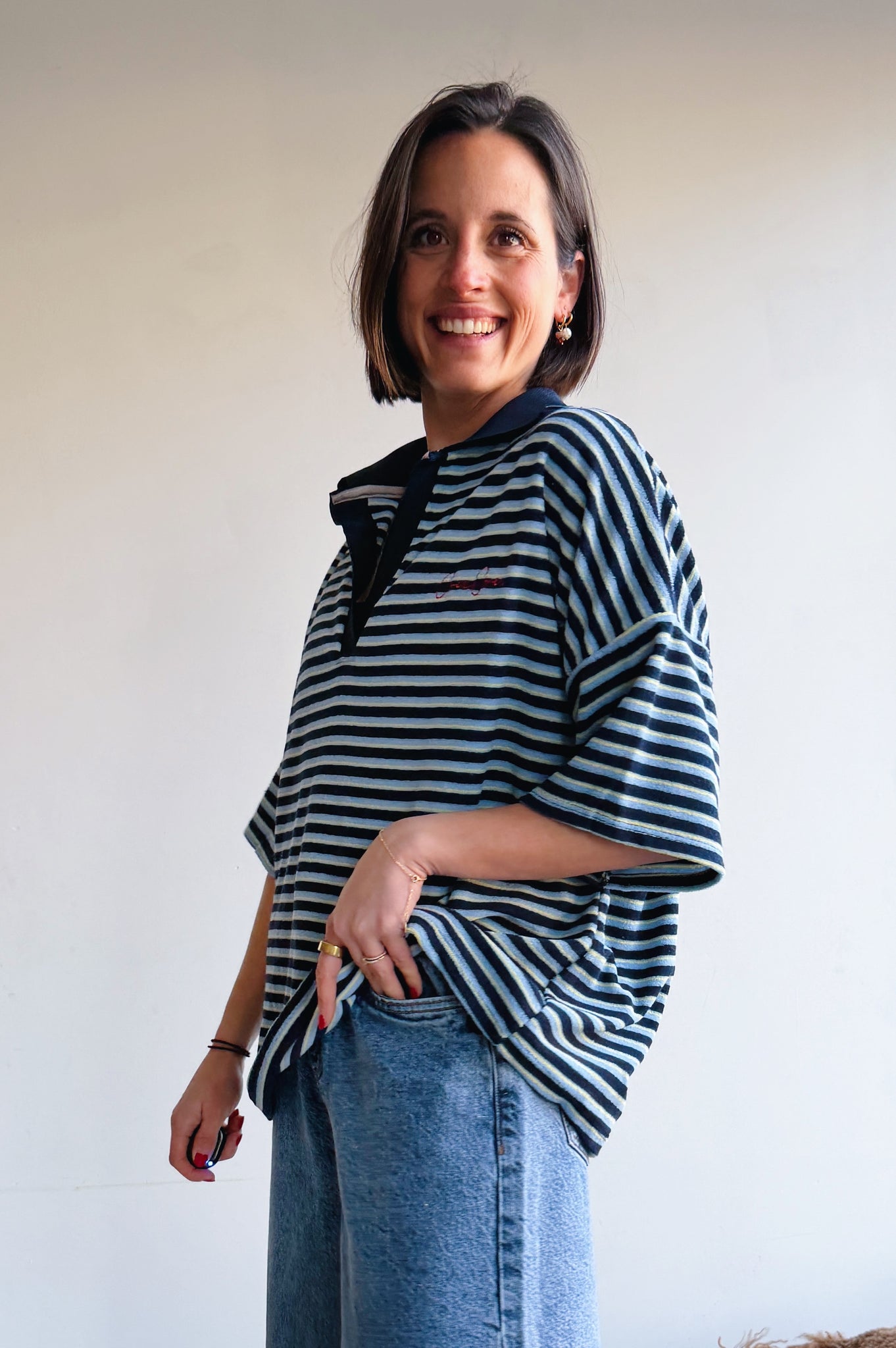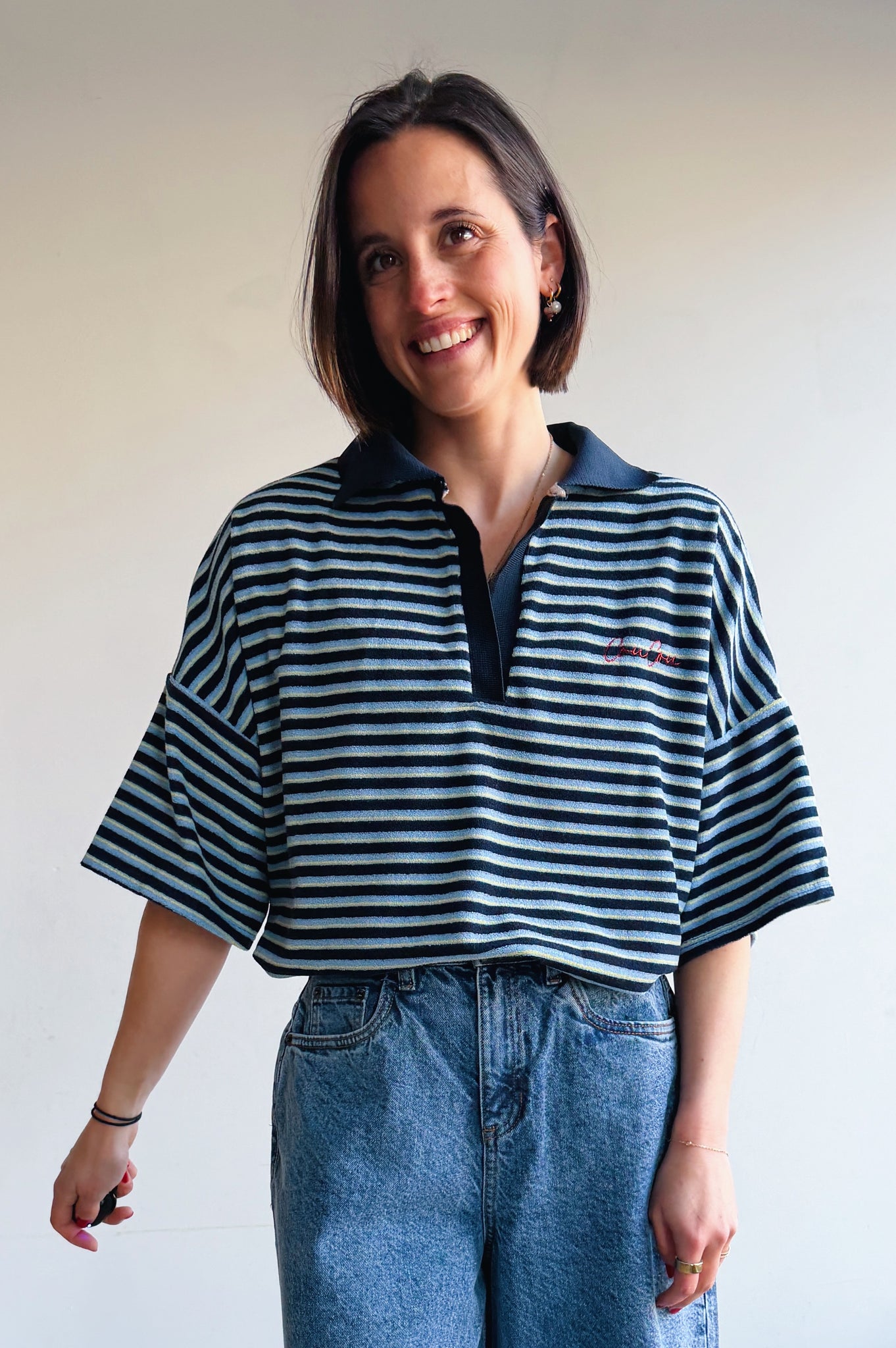 Deze oversized polo in heerlijke badstof combineert een klassieke streep met een moderne, relaxte fit. De donkerblauwe kraag en V-hals geven het geheel een sportieve uitstraling, terwijl het subtiele CouCOU borduursel op de borst zorgt voor een verfijnd detail.
