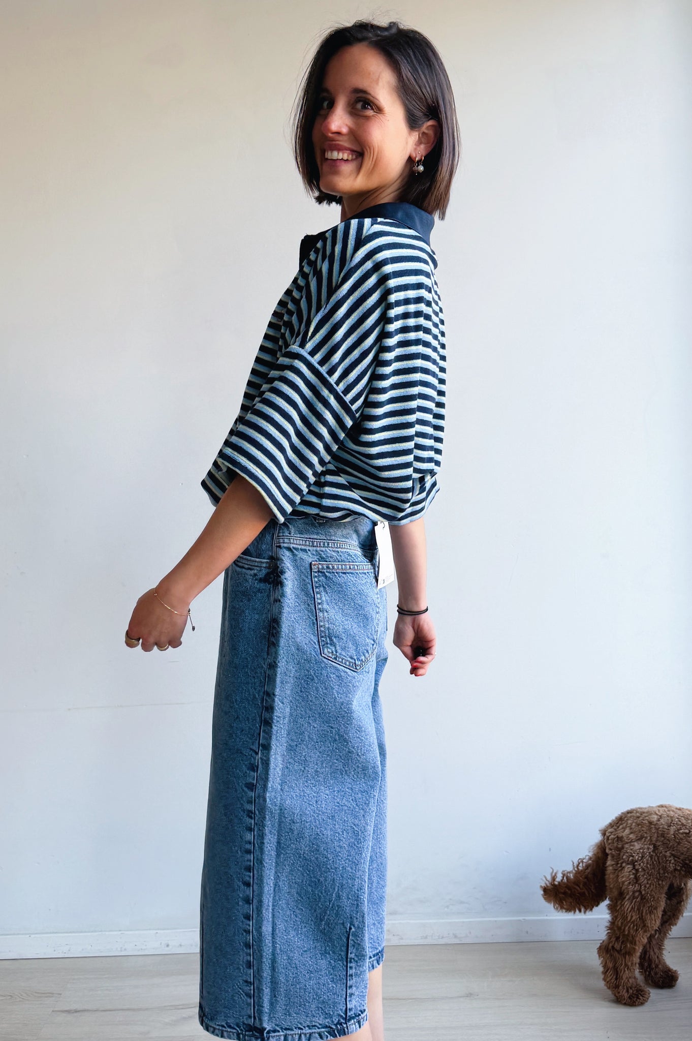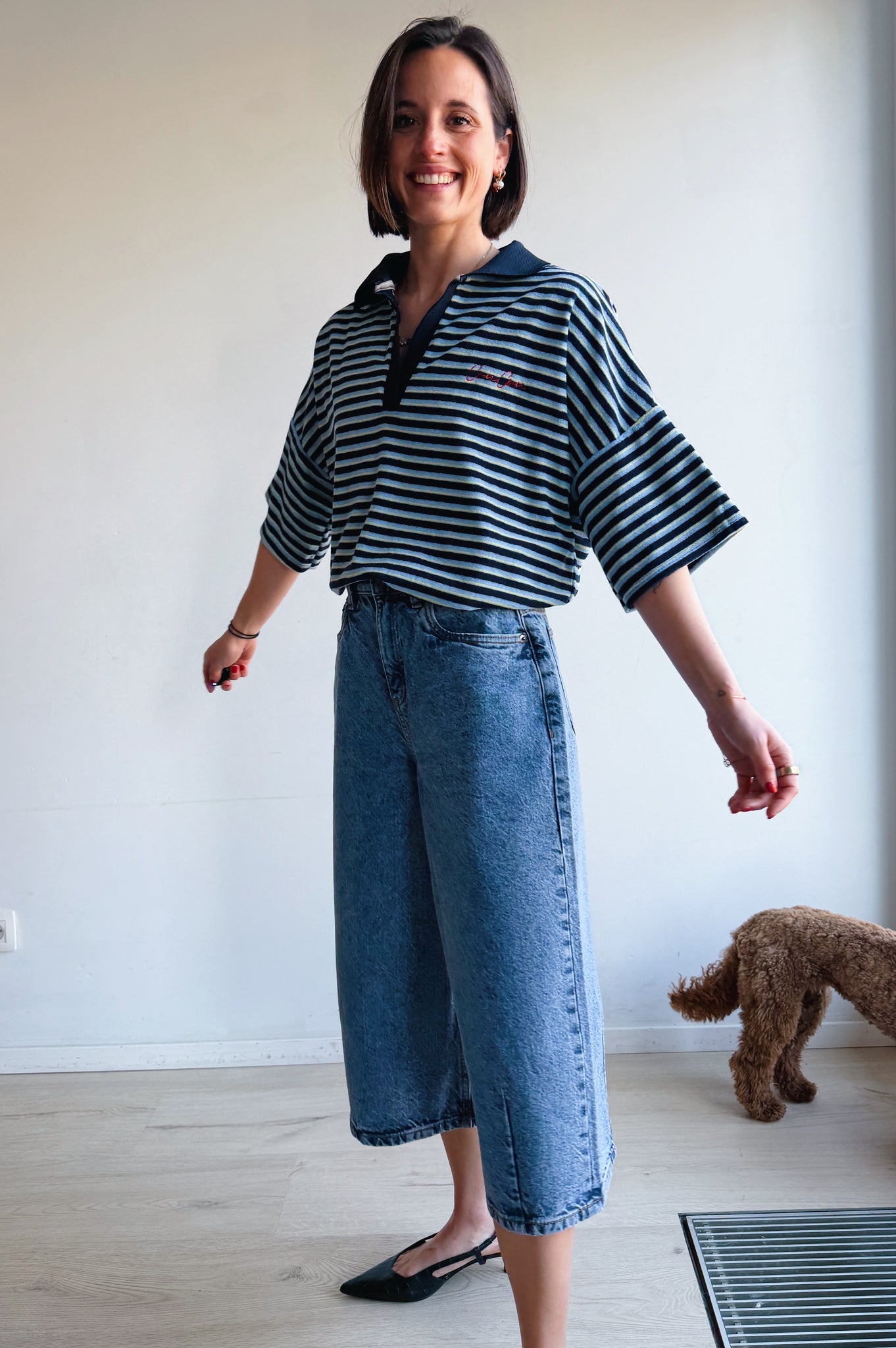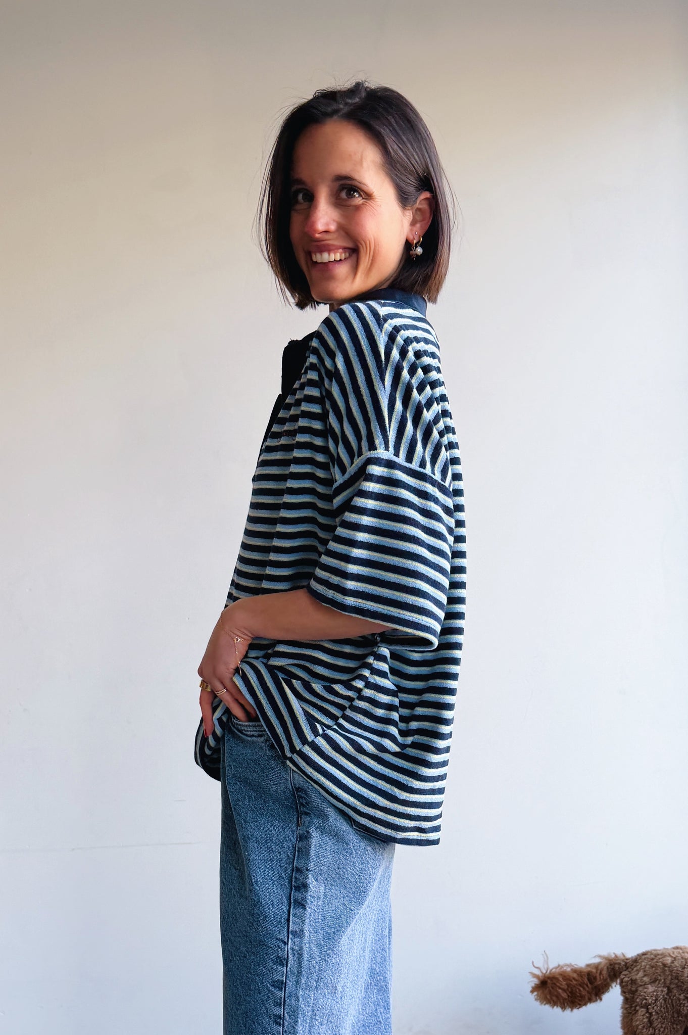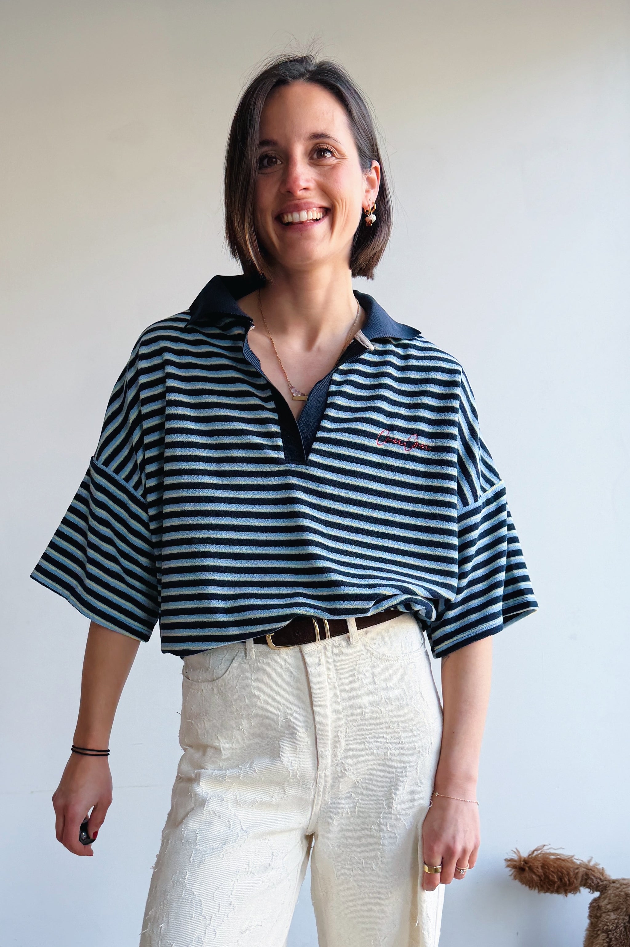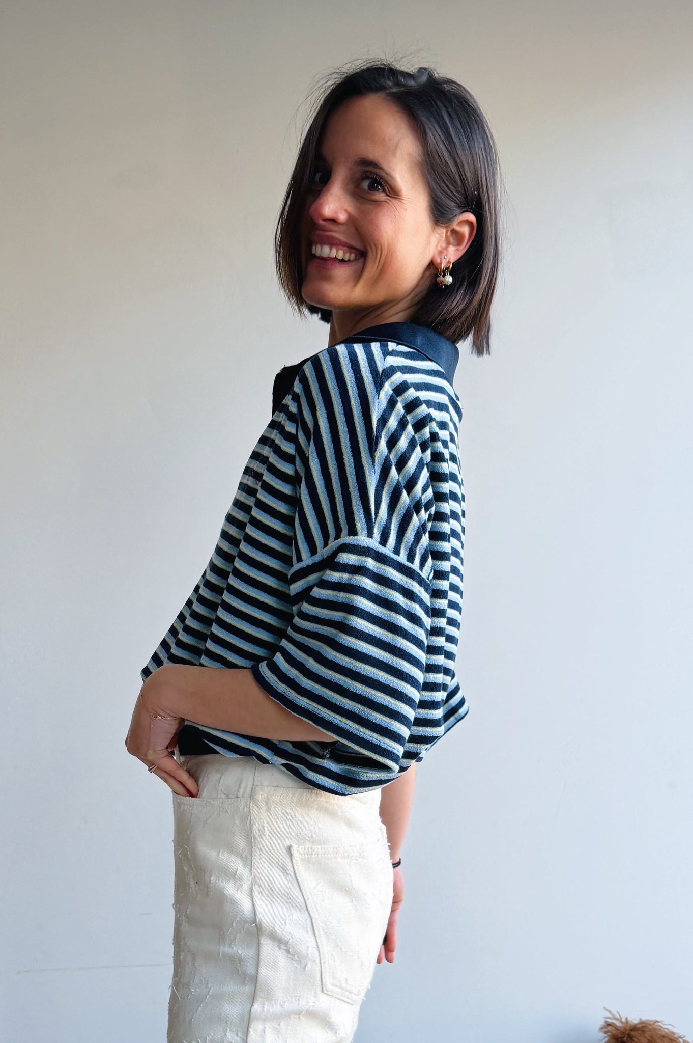 Deze oversized polo in heerlijke badstof combineert een klassieke streep met een moderne, relaxte fit. De donkerblauwe kraag en V-hals geven het geheel een sportieve uitstraling, terwijl het subtiele CouCOU borduursel op de borst zorgt voor een verfijnd detail.