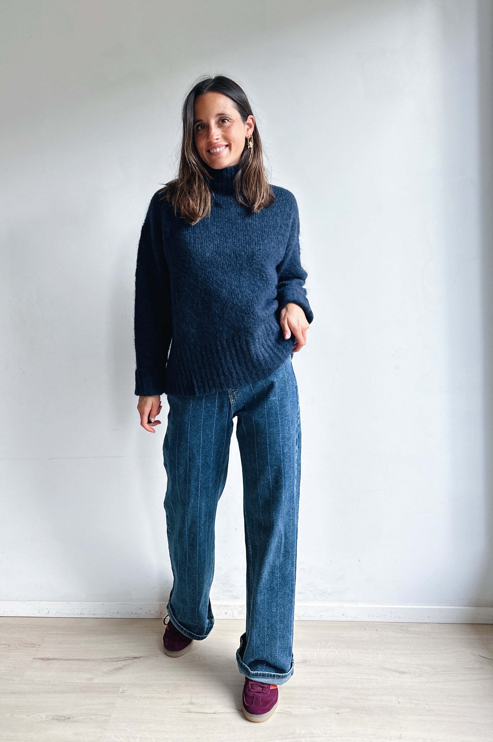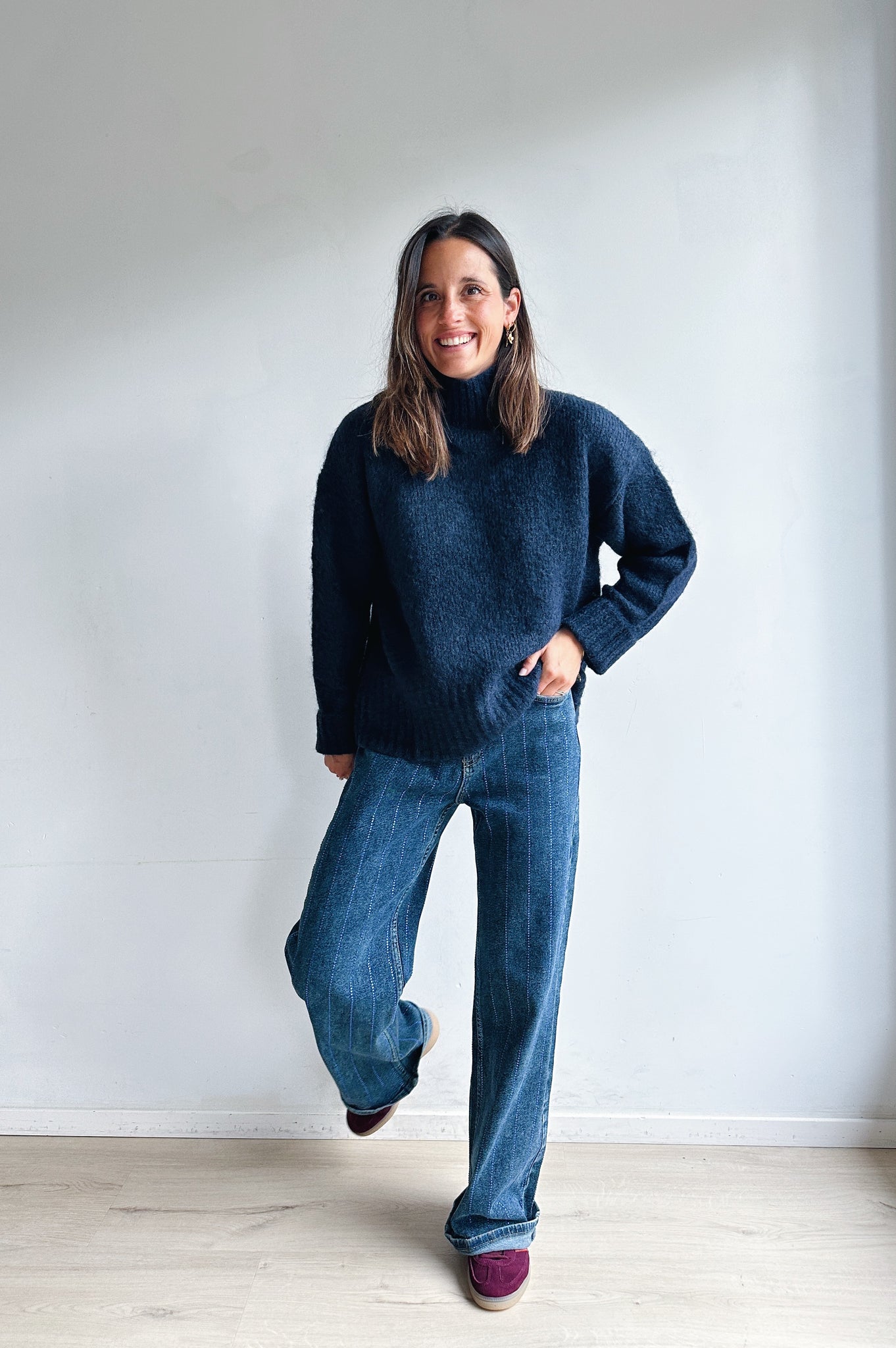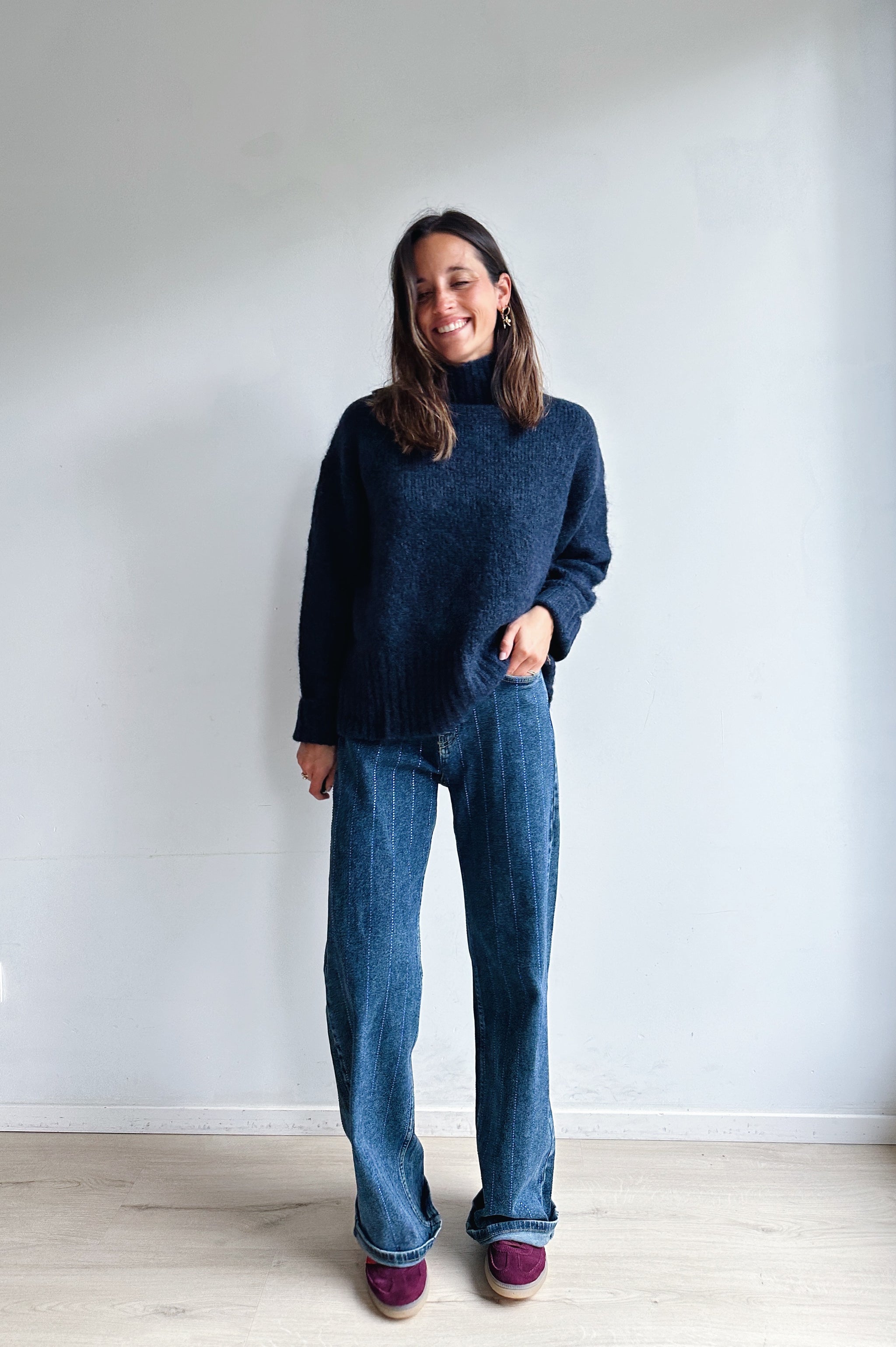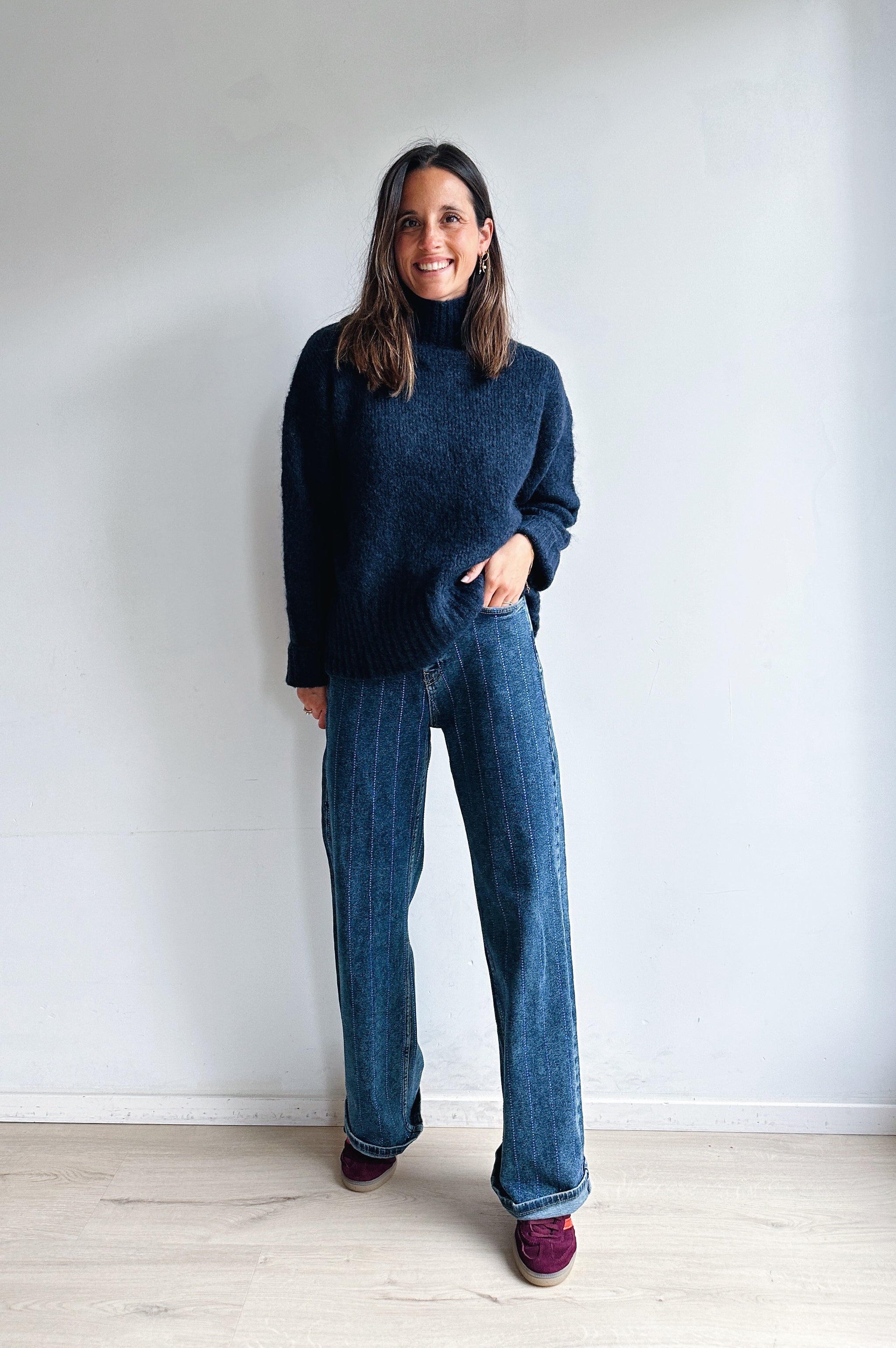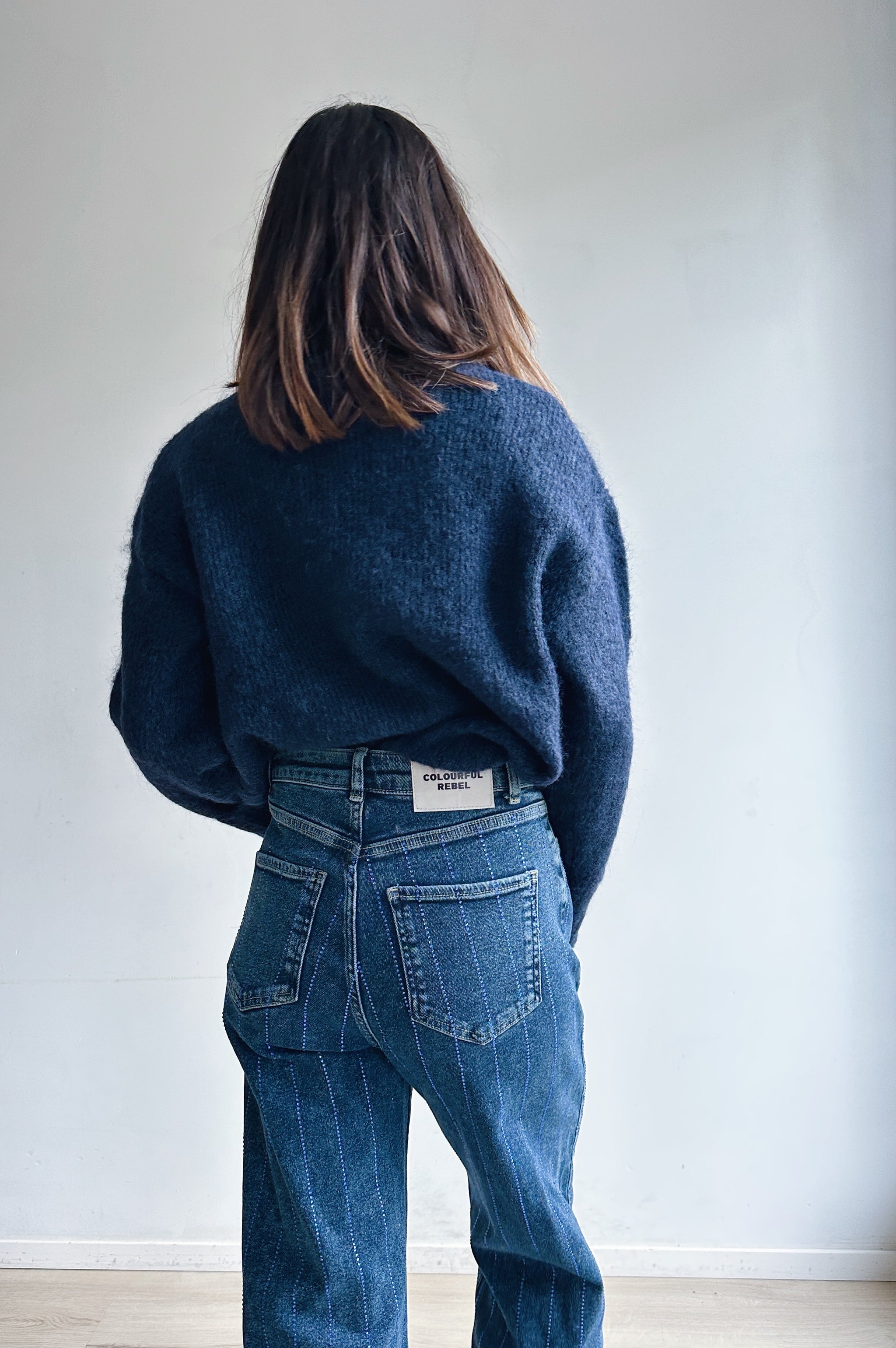 Een klassieke straight highwaist jeans met een sprankelende twist. Deze straight fit jeans heeft subtiele blauwe steentjes glinsteren over de volledige broek en een wat fun toevoegen aan elke outfit. De hoge taille en rechte pijp zorgen voor een tijdloze pasvorm die moeiteloos combineert met truien, blouses of T-shirts. Gemaakt van stevig denim dat comfortabel zit en mooi in vorm blijft — de perfecte balans tussen stoer en speels. Draag