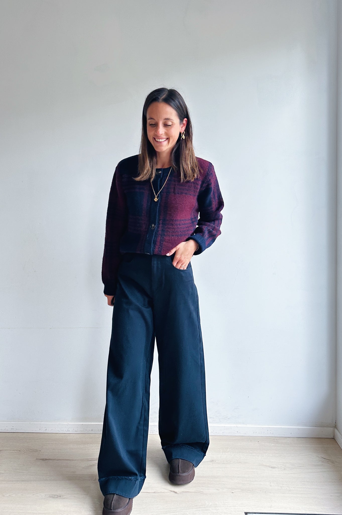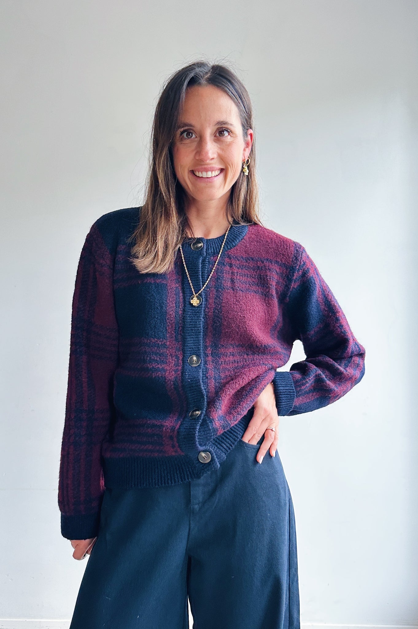 Een prachtig geruite gilet in warme tinten bordeaux en navy blauw. De trui heeft een klassieke ronde hals, grote knopen vooraan en een zachte, gebreide textuur die een cosy maar stijlvolle uitstraling geeft. De geruite print zorgt voor een tijdloze look, terwijl het model mooi balanceert met de losse, marineblauwe broek die je combineert. Kan ook perfect met een jeans gecombineerd worden of op een rokje.