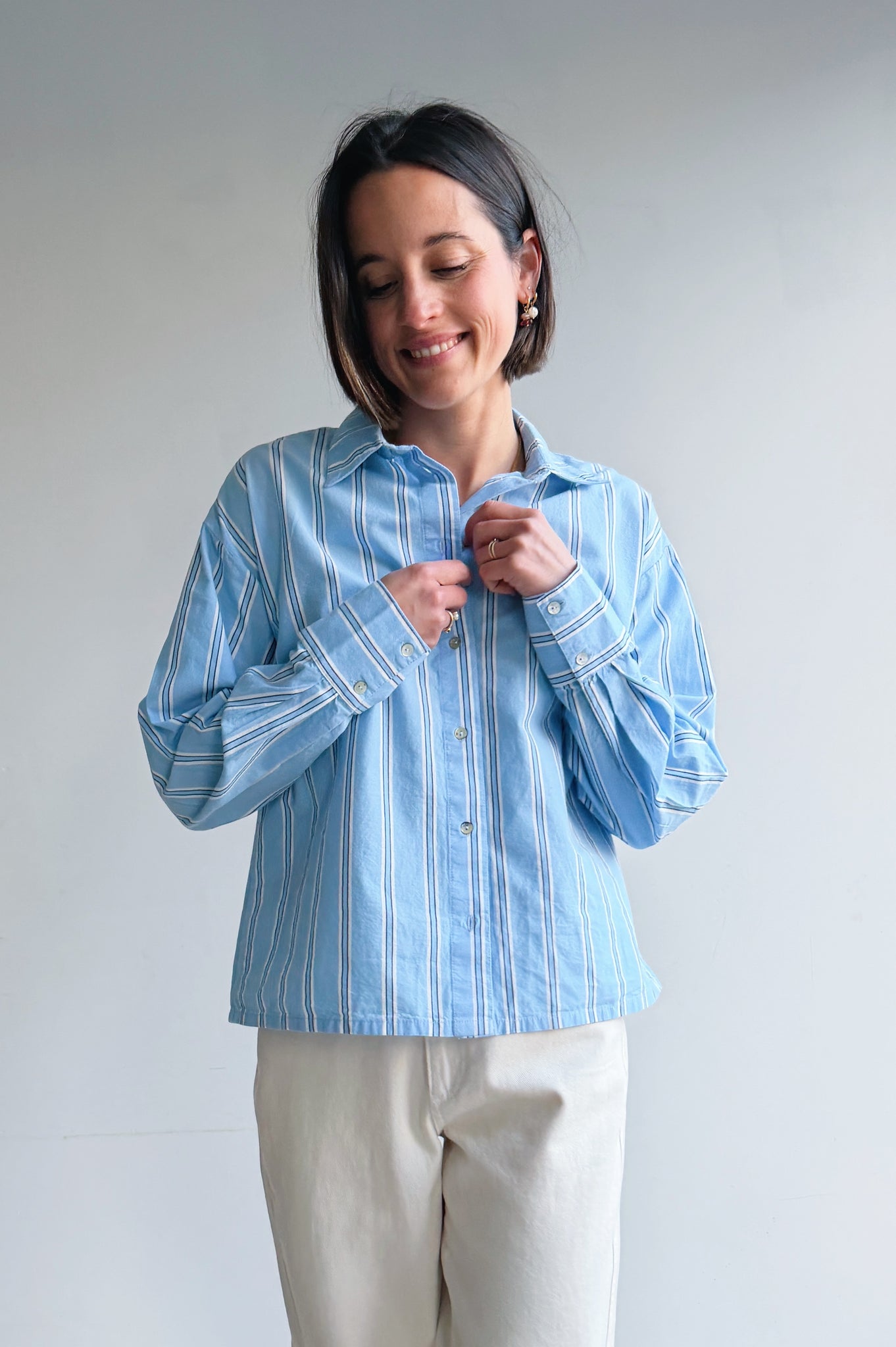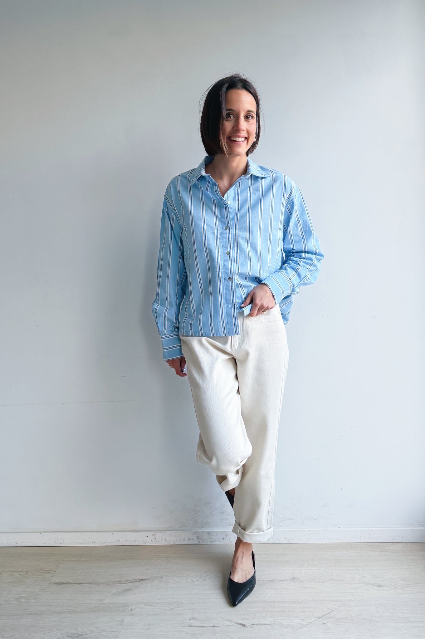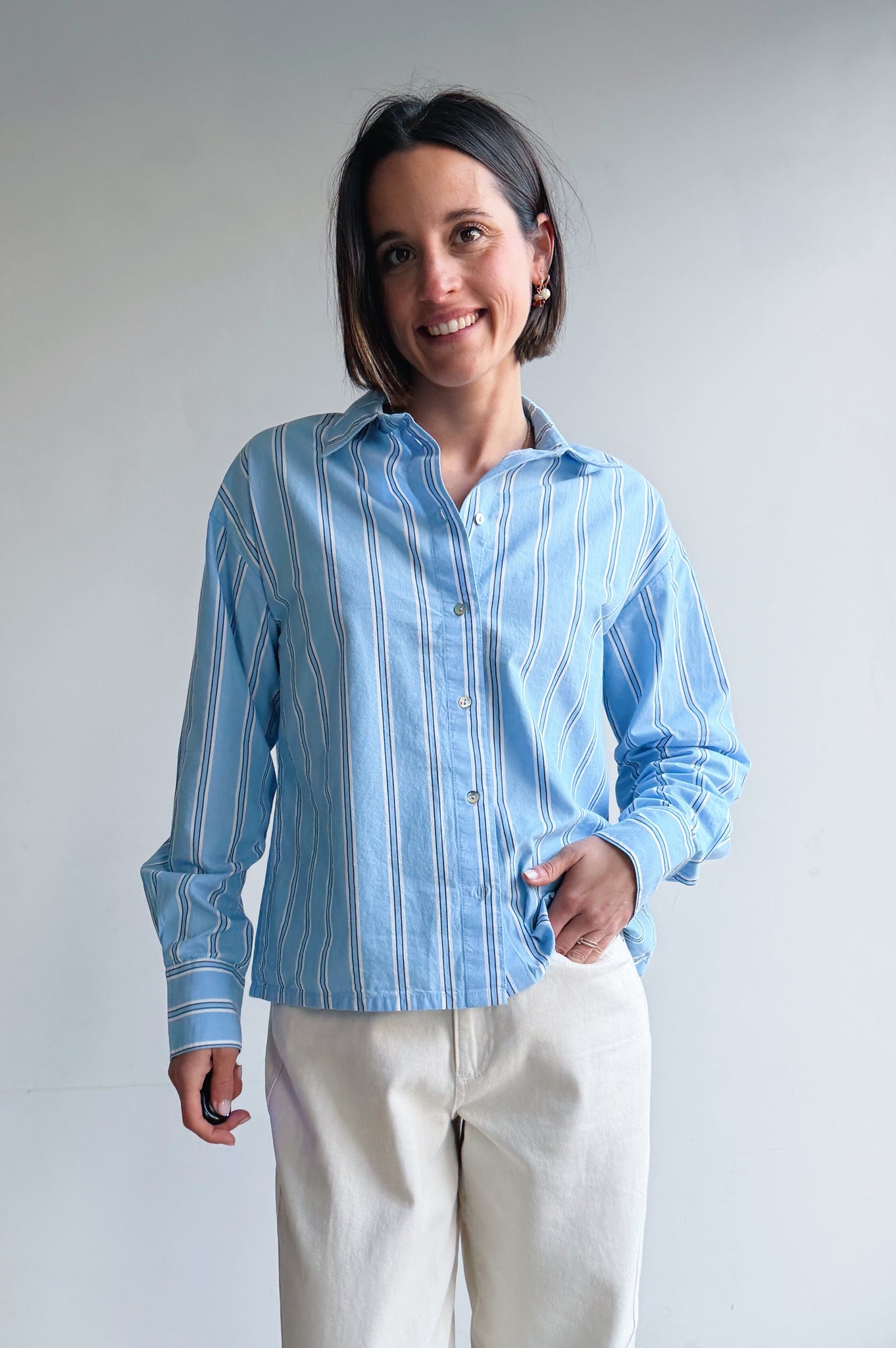 Een frisse en tijdloze blouse met een subtiel gestreept patroon dat meteen een lichte, verzorgde uitstraling geeft. De blouse heeft een ietwat boxy korter model. De soepele katoenen stof draagt comfortabel en valt mooi langs het lichaam, terwijl de klassieke kraag en knoopsluiting zorgen voor een elegante, maar ontspannen look. Perfect om los te dragen voor een casual outfit of ingestopt voor een meer geklede styling. Een veelzijdig item dat je moeiteloos combineert en het hele jaar door kunt dragen.