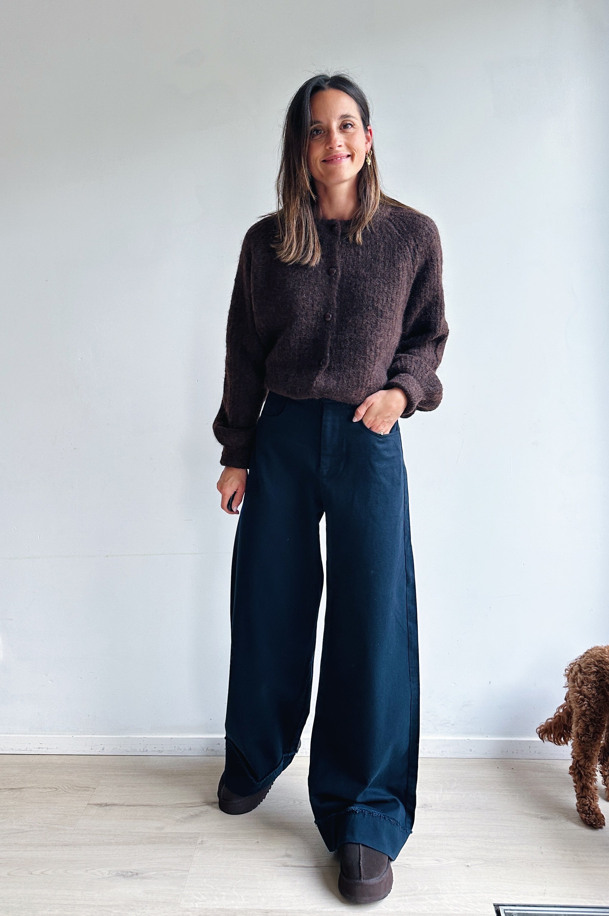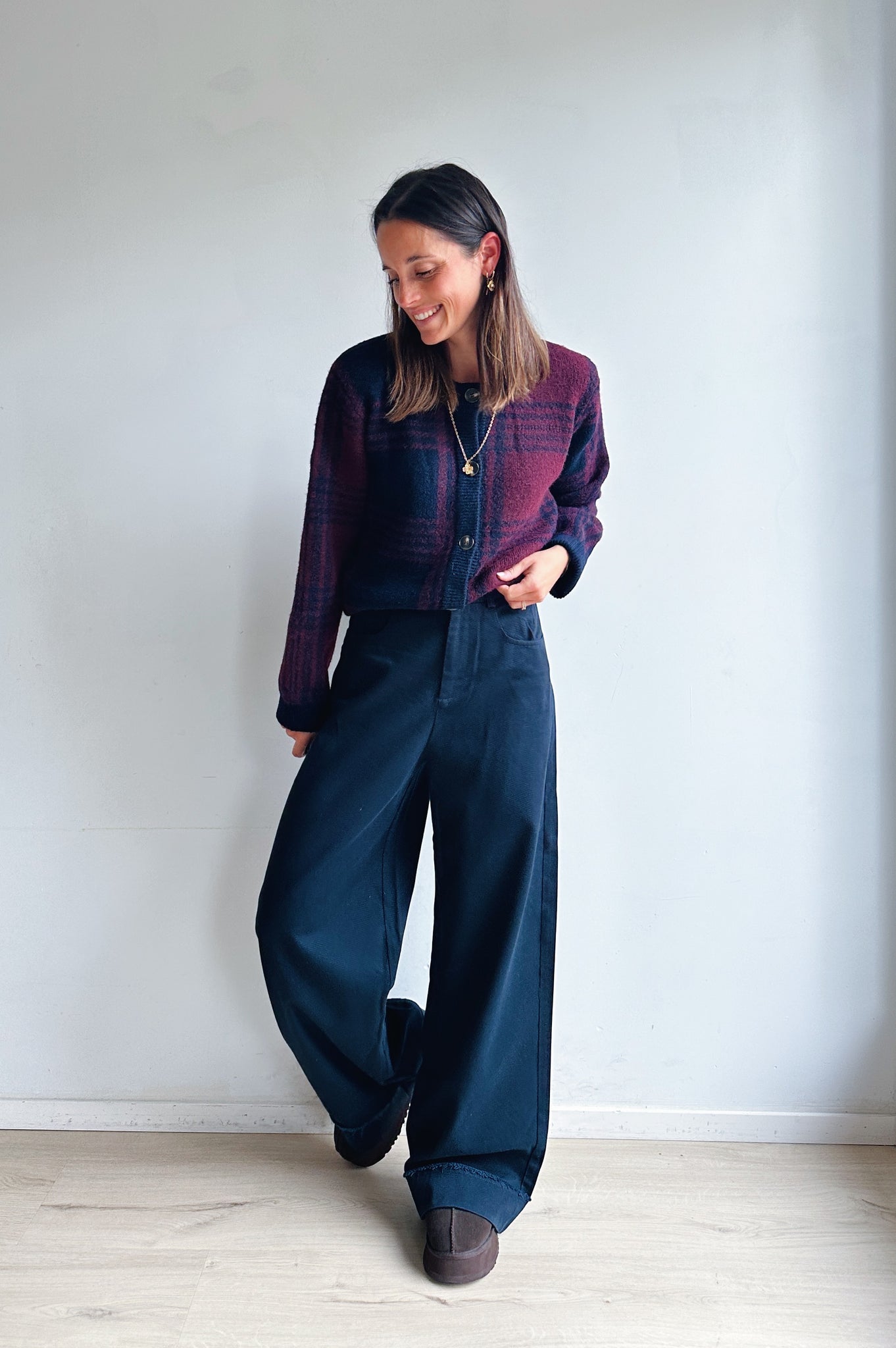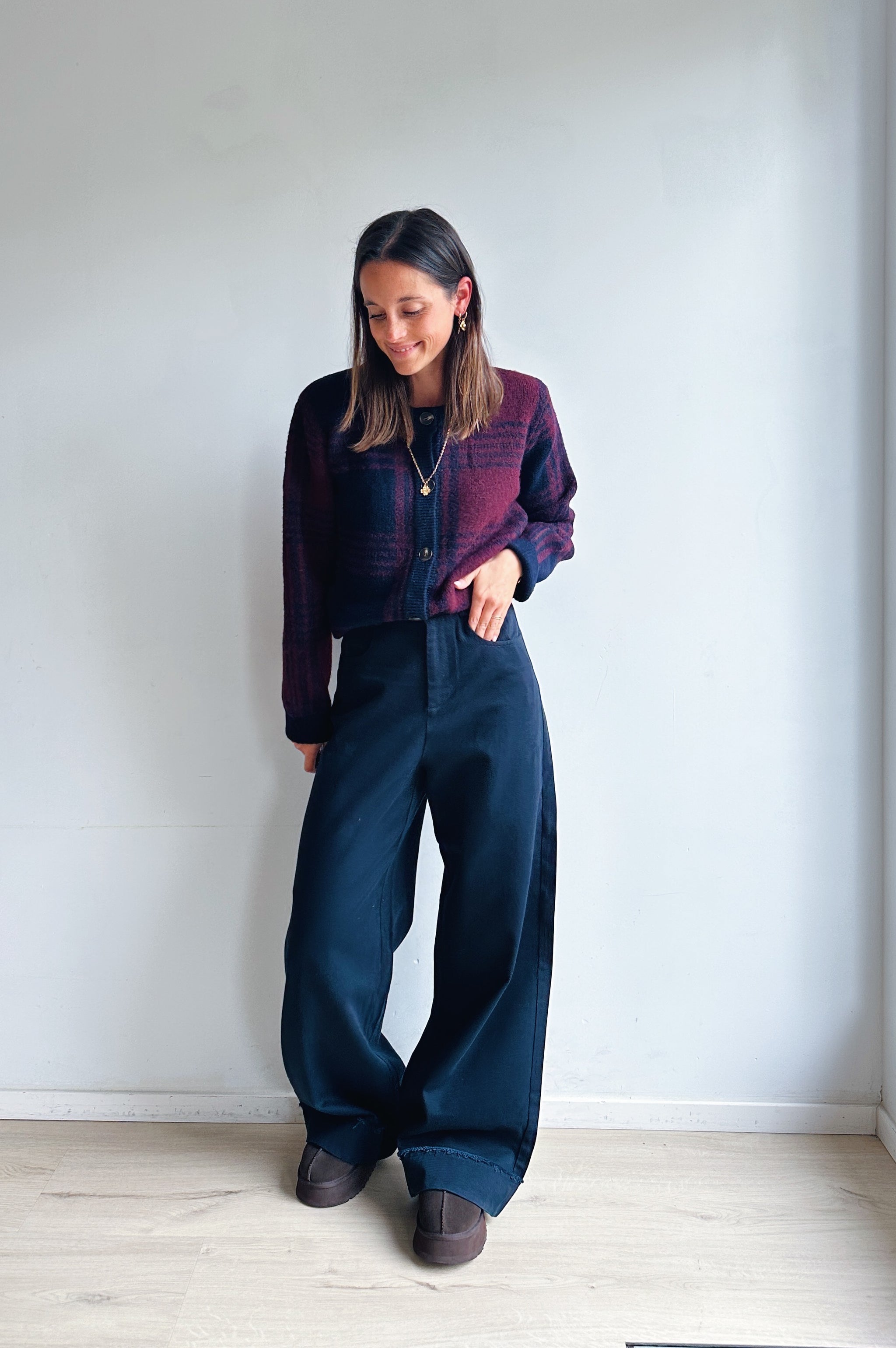 Een tijdloze broek met een moderne twist. Deze marineblauwe broek heeft een elegante, losse pasvorm die soepel om het lichaam valt. Het hoge taillemodel en de wijde pijpen zorgen voor een flatterend silhouet, terwijl de diepe kleur zorgt voor een stijlvolle, veelzijdige look.