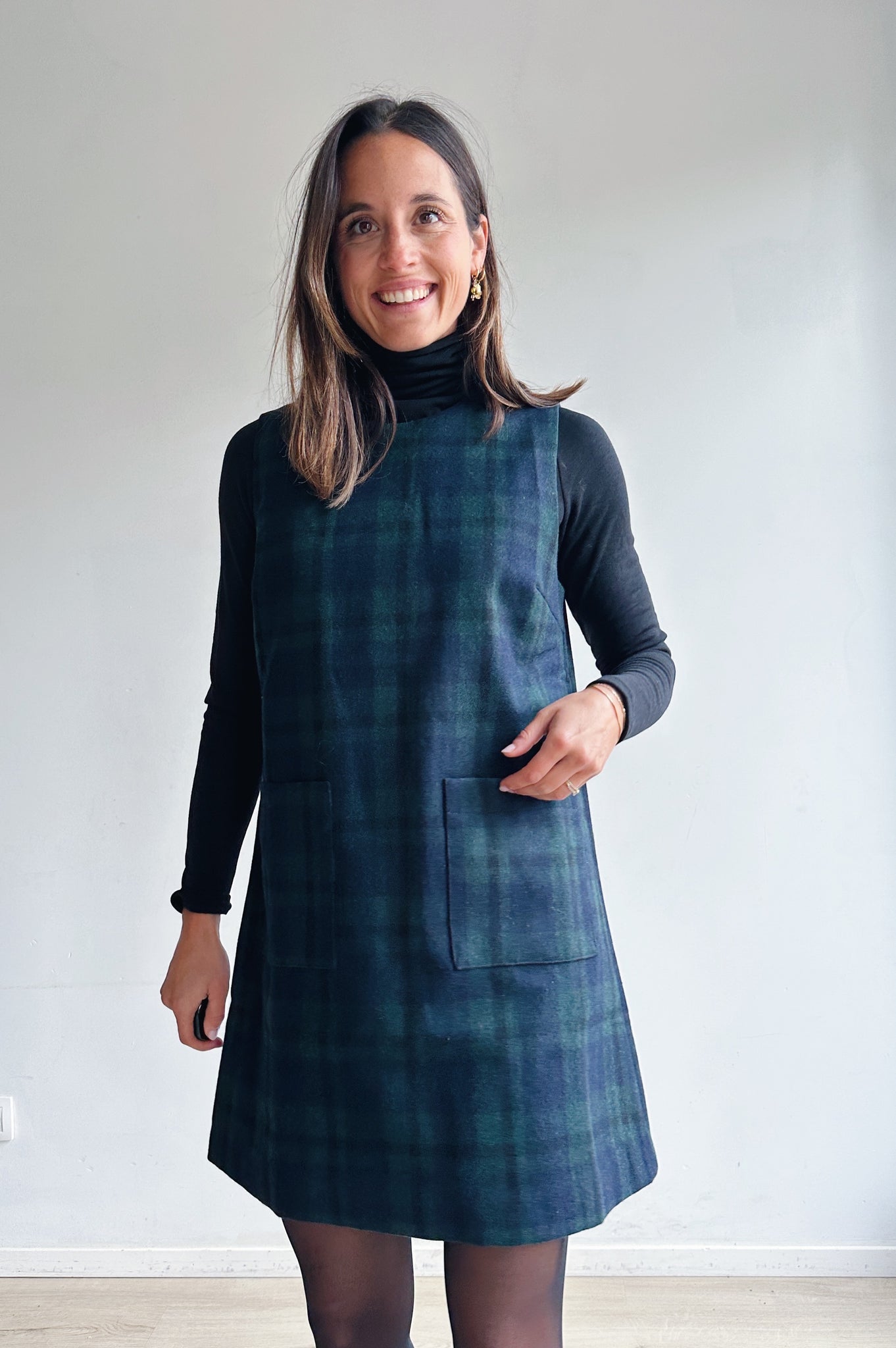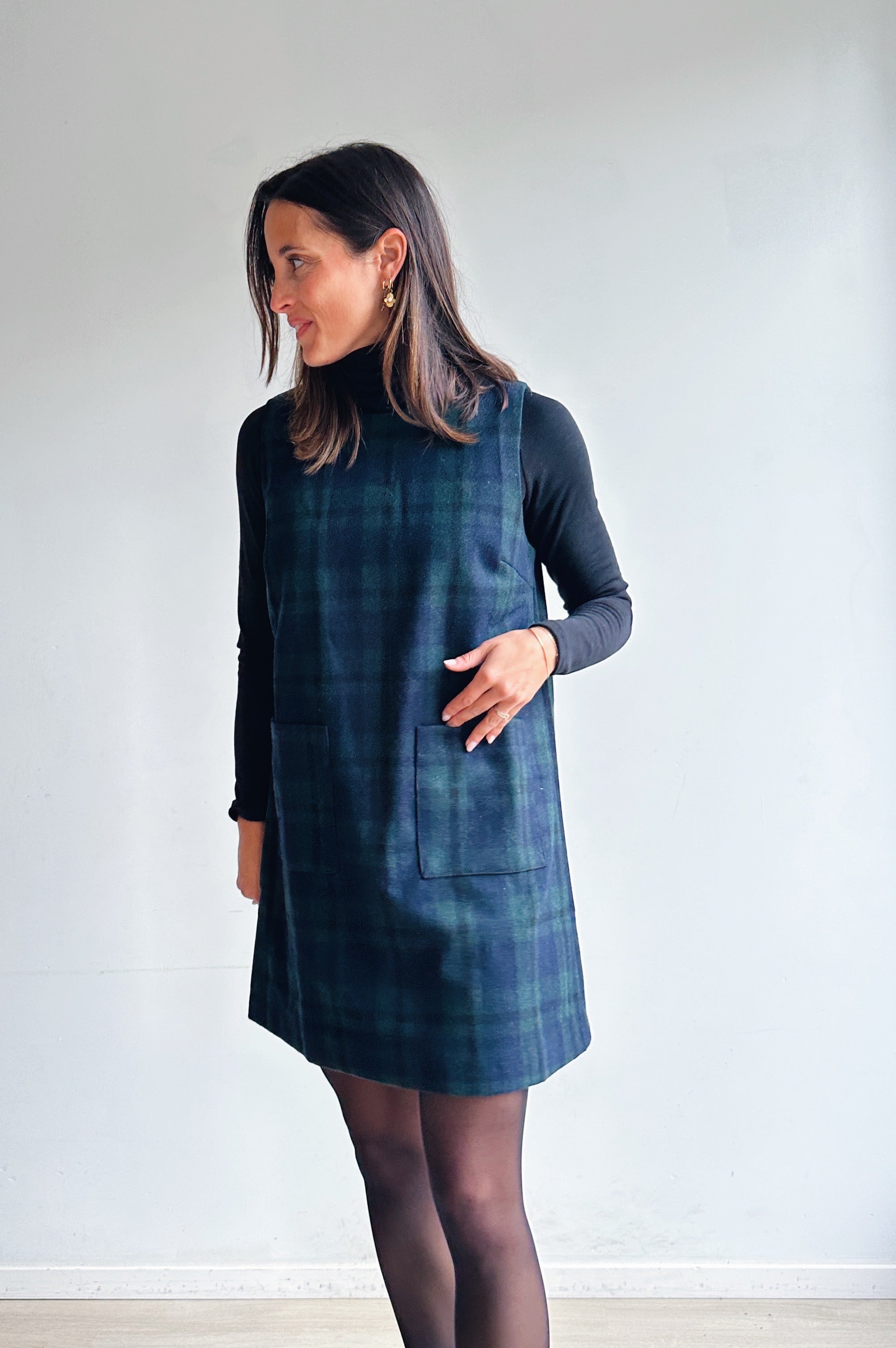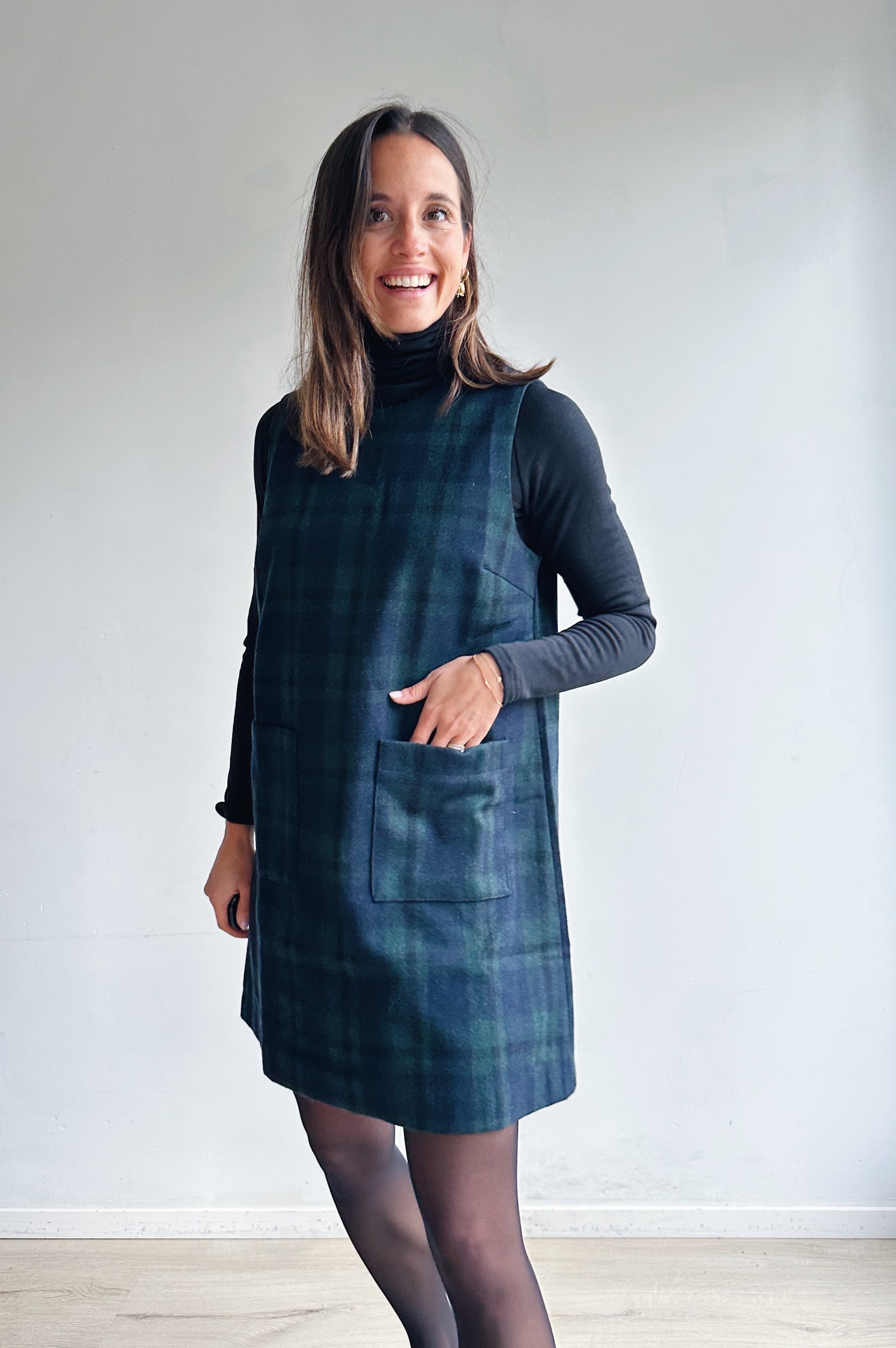 Een ode aan vintage charme, dit kleedje met subtiel ruitmotief combineert eenvoud met elegantie. De zachte stof geeft het een comfortabele pasvorm, terwijl de lichte A-vorm snit zorgt voor een flatterend silhouet. De opgestikte zakken voegen een speels en praktisch detail toe. Draag het met een coltrui en panty’s voor een stijlvolle look op koudere dagen, of combineer met een blouse voor een meer geklede uitstraling.