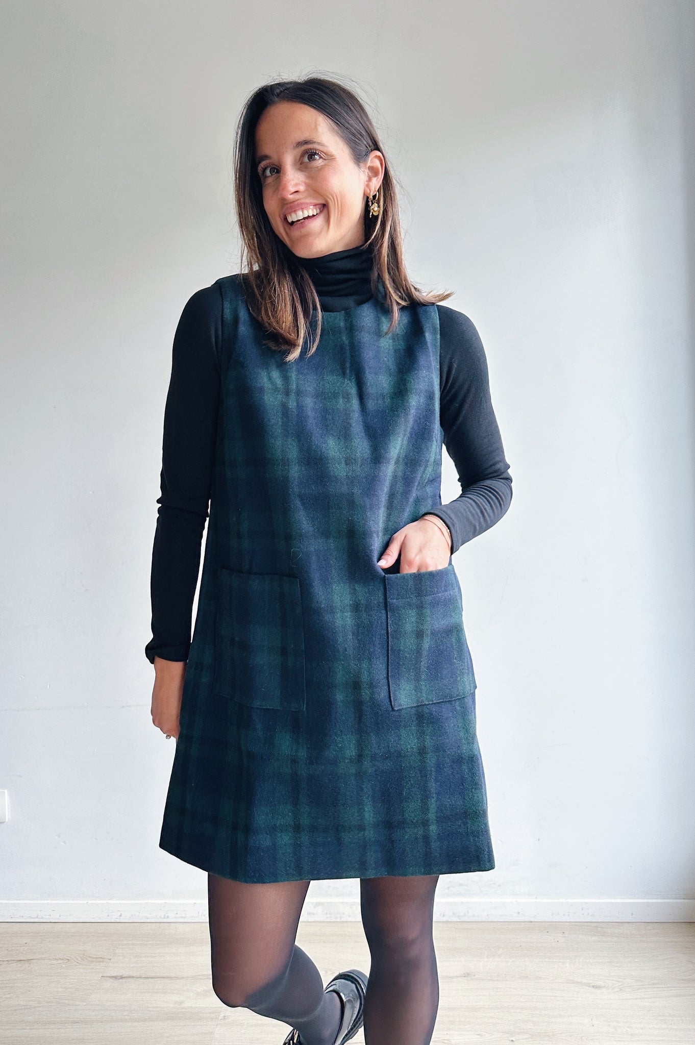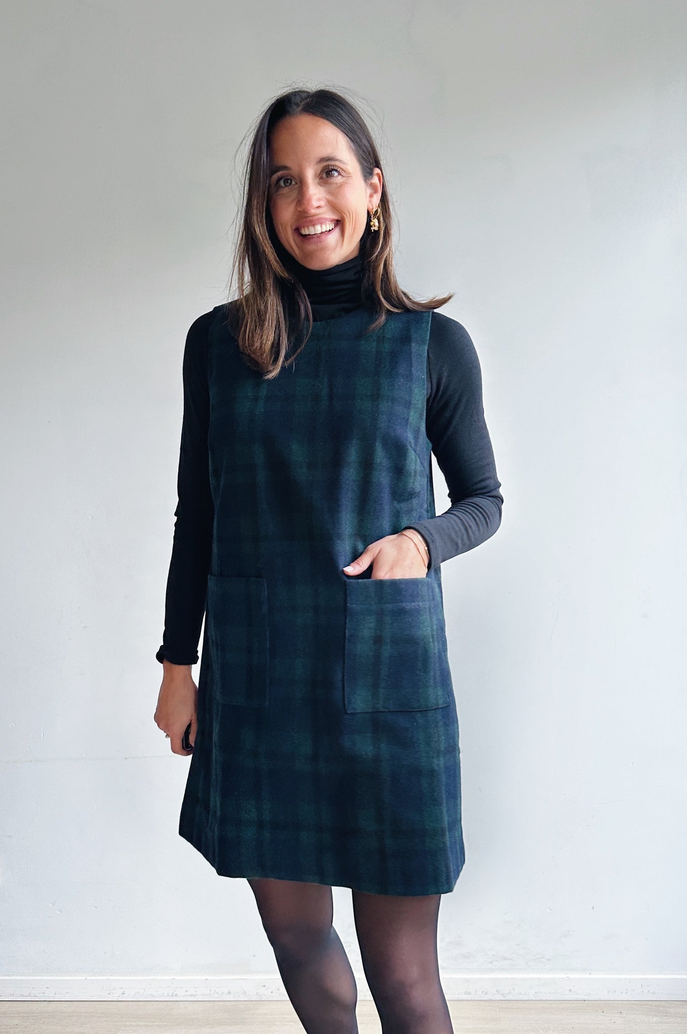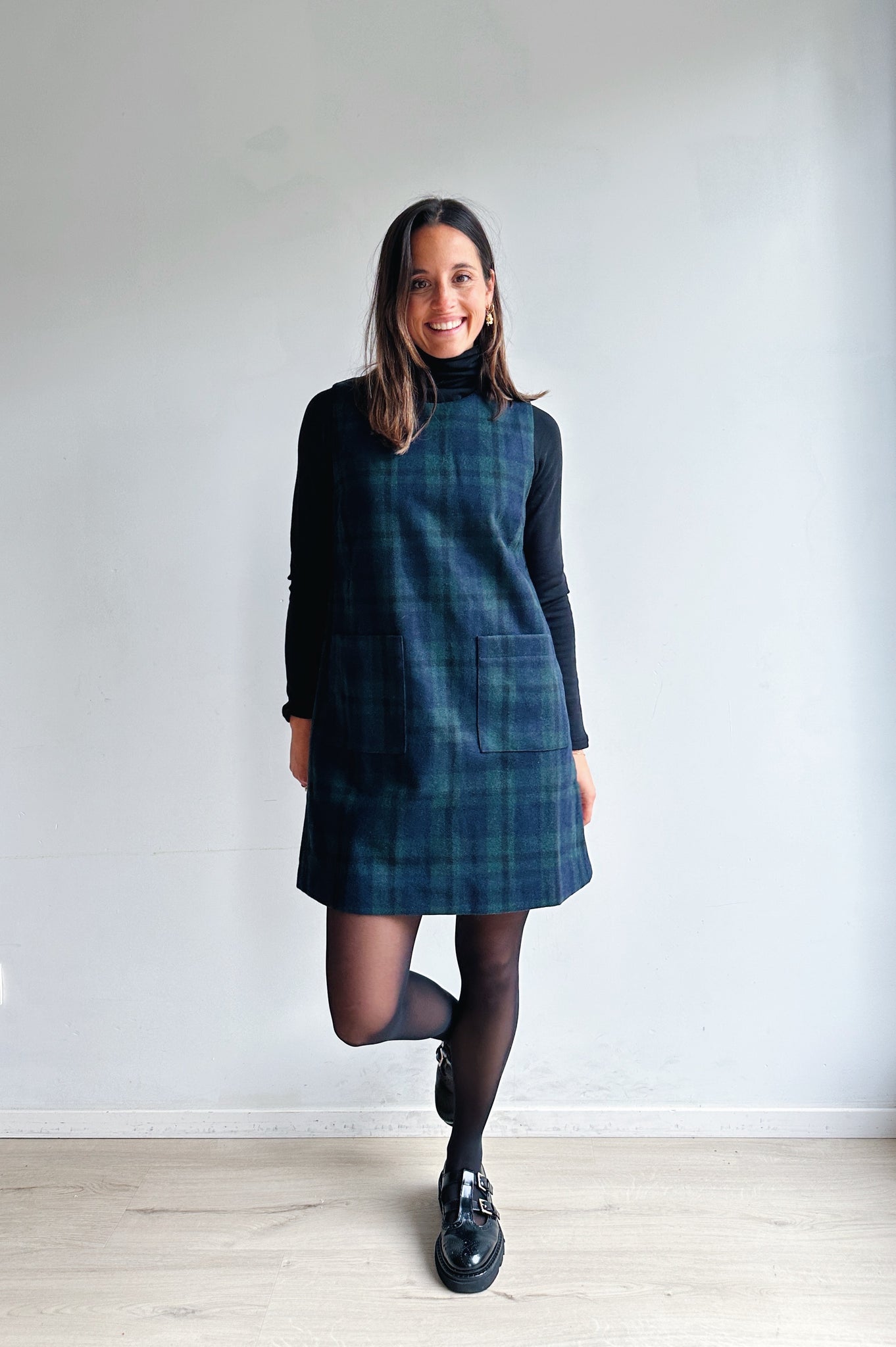 Een ode aan vintage charme, dit kleedje met subtiel ruitmotief combineert eenvoud met elegantie. De zachte stof geeft het een comfortabele pasvorm, terwijl de lichte A-vorm snit zorgt voor een flatterend silhouet. De opgestikte zakken voegen een speels en praktisch detail toe. Draag het met een coltrui en panty’s voor een stijlvolle look op koudere dagen, of combineer met een blouse voor een meer geklede uitstraling.