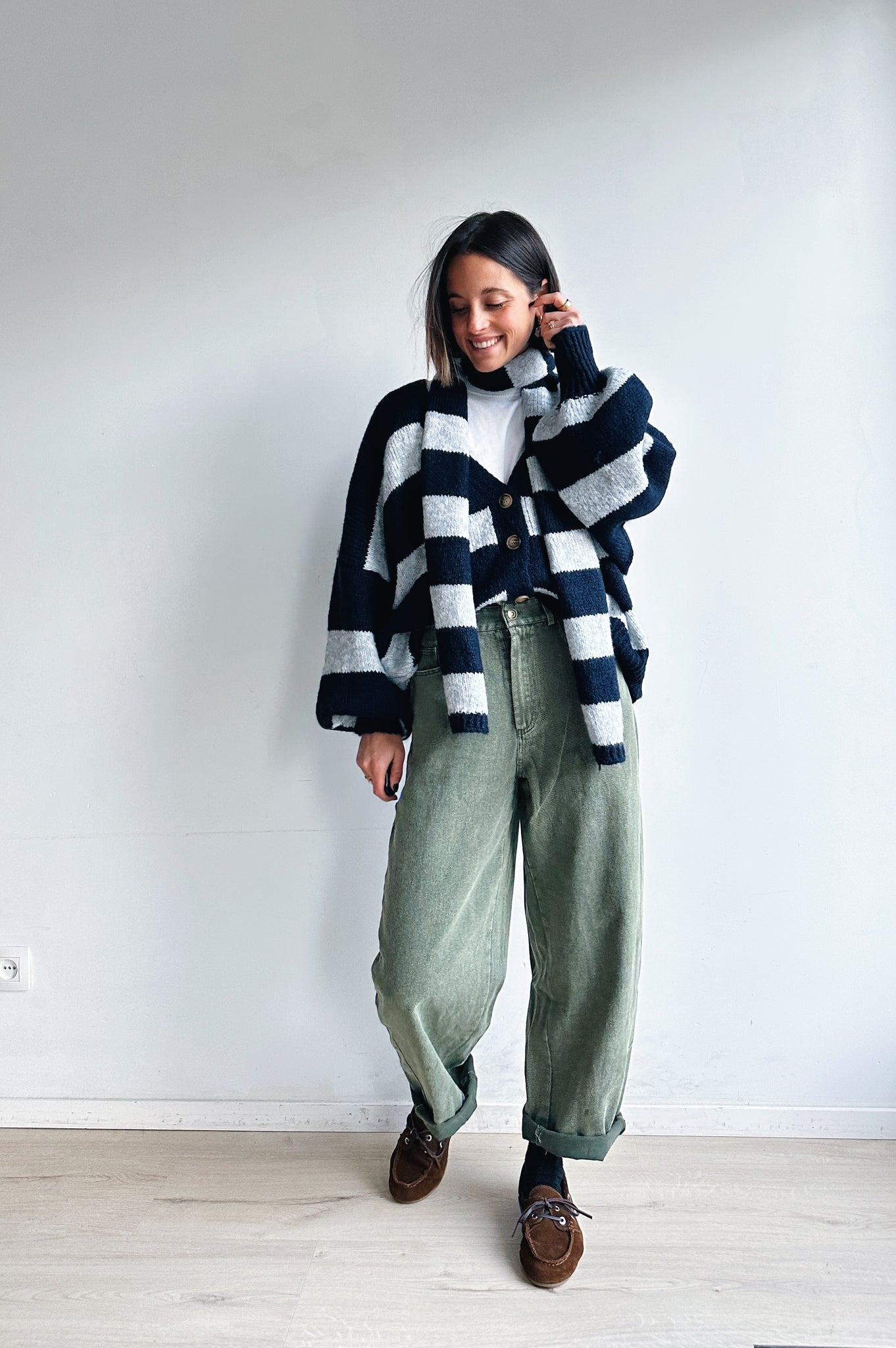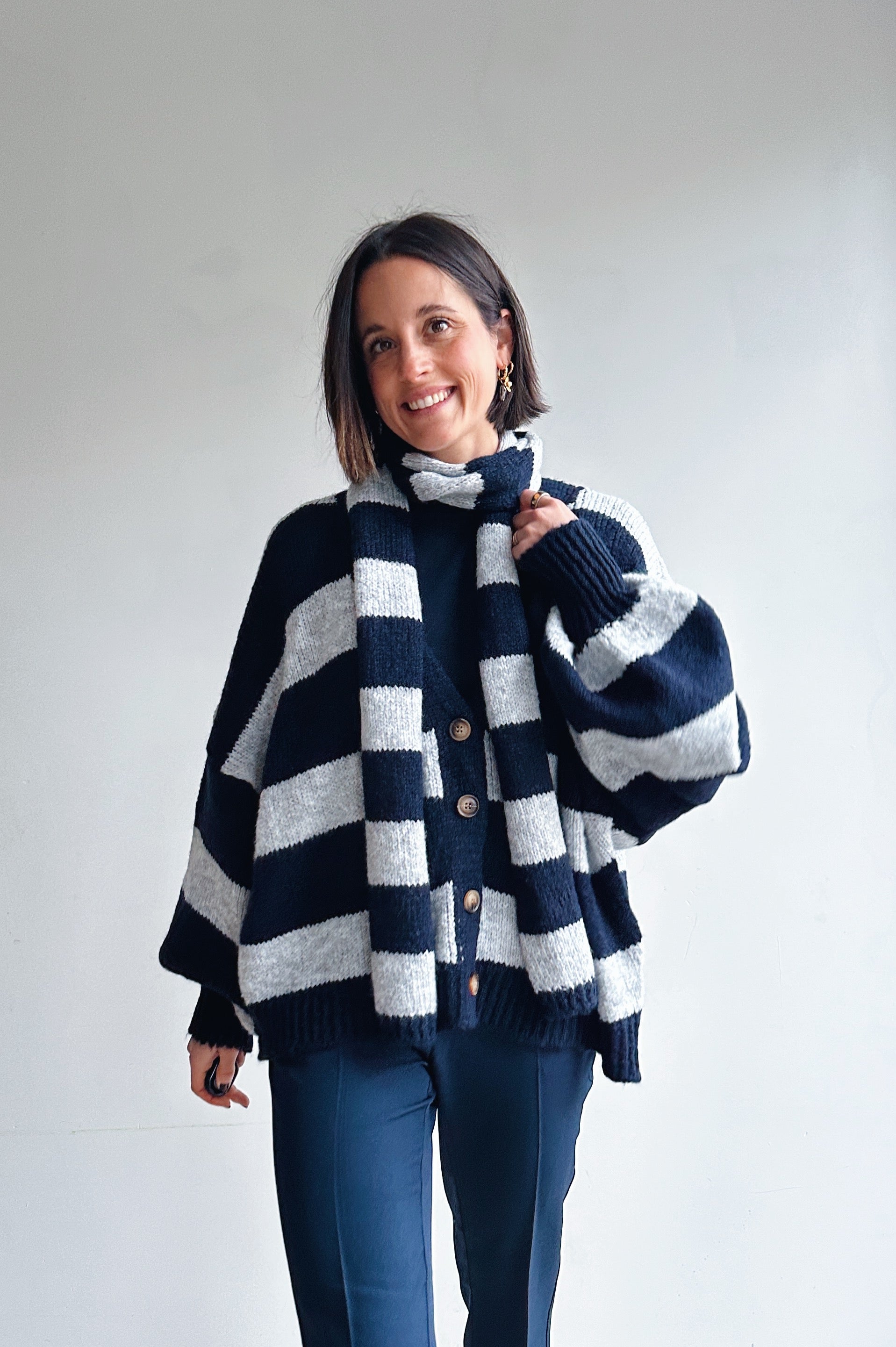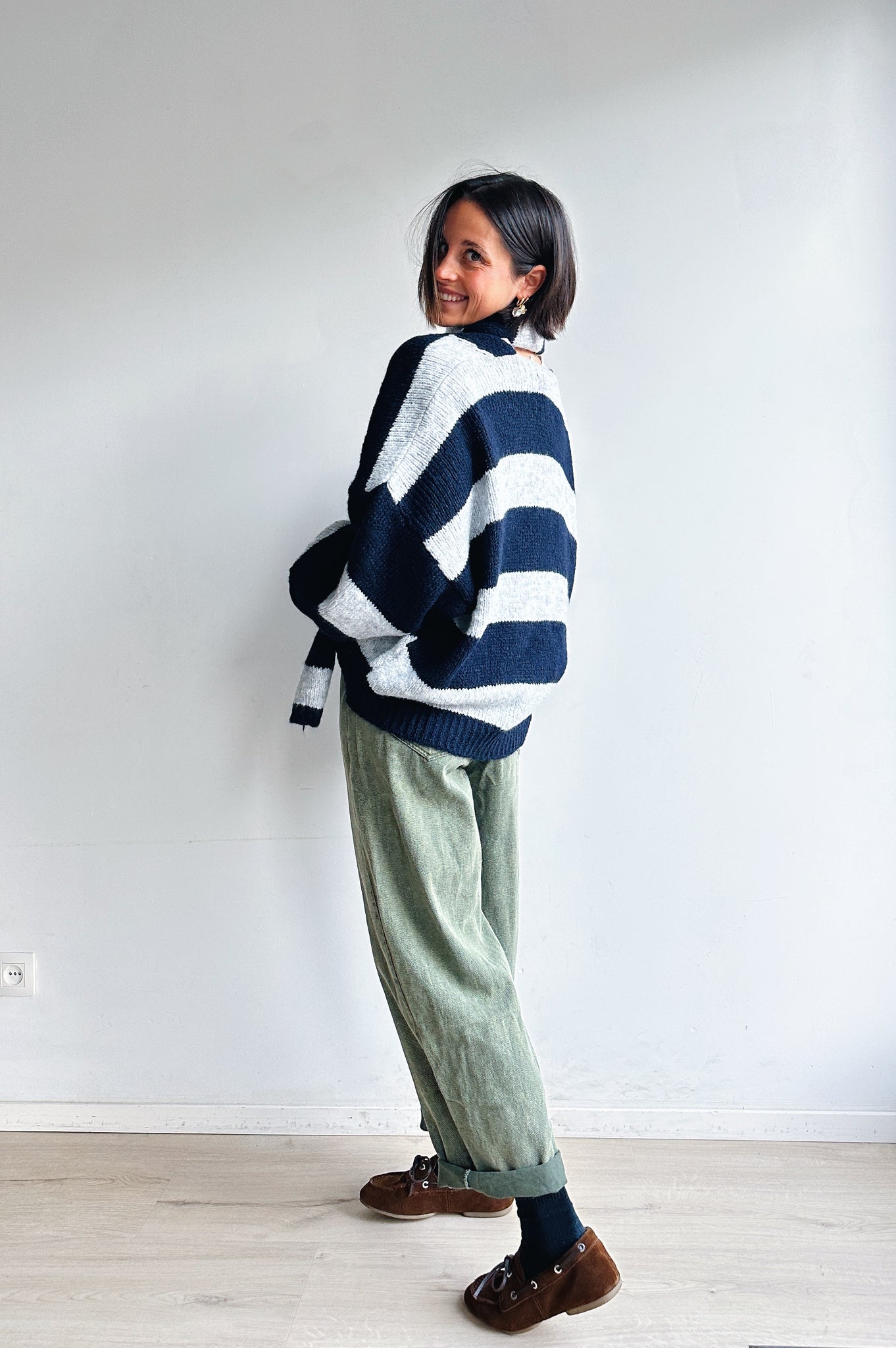 Geef je outfit een moeiteloos stijlvolle twist met deze heerlijk zachte, grofgebreide gestreepte trui. De brede navy–grijze strepen geven een speelse, tijdloze look, terwijl de oversized pasvorm zorgt voor ultiem comfort. De dropped shoulders en extra wijde mouwen maken deze zalige gilet perfect voor relaxte dagen, maar ook ideaal om te combineren in een gelaagde outfit.